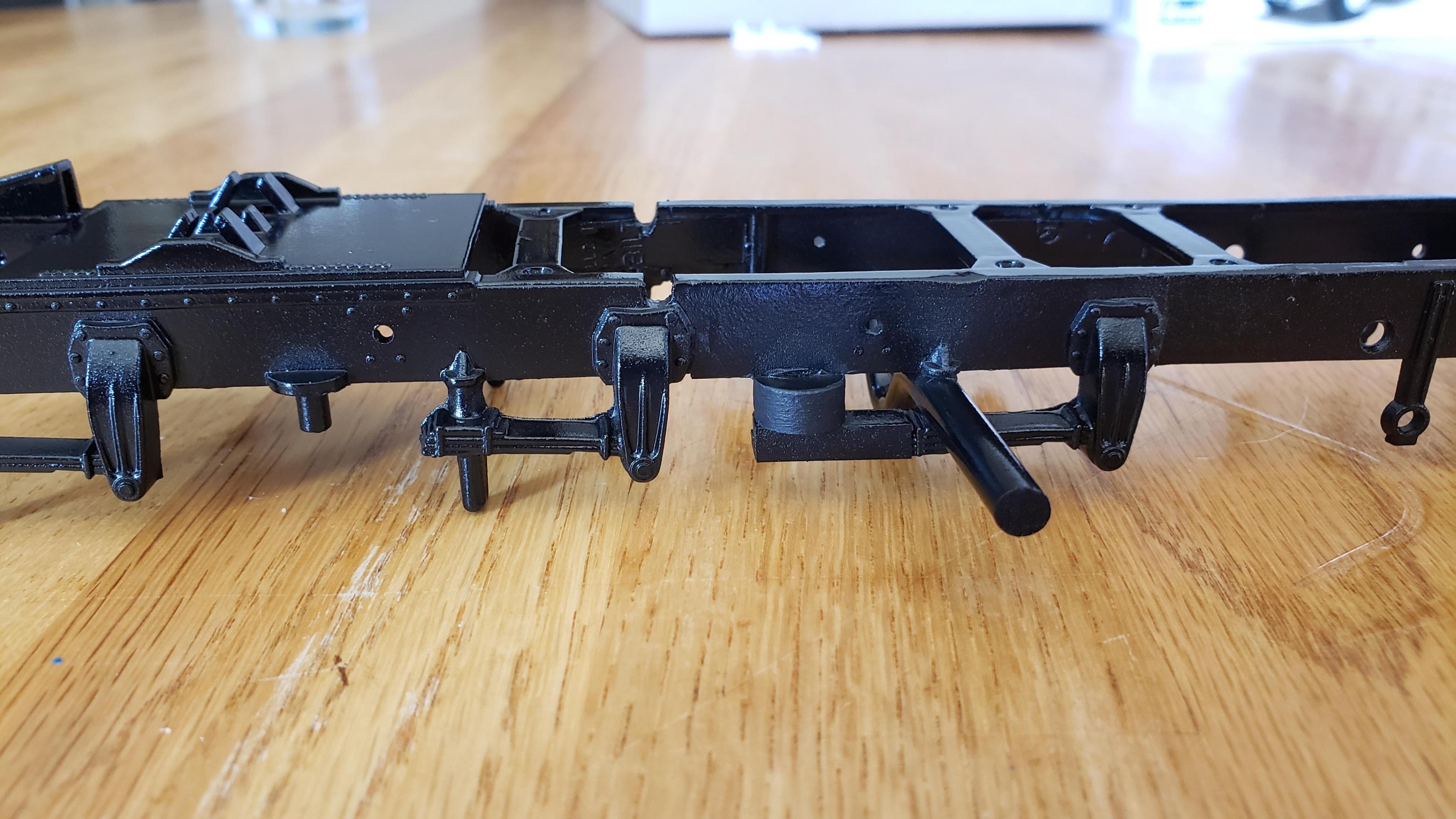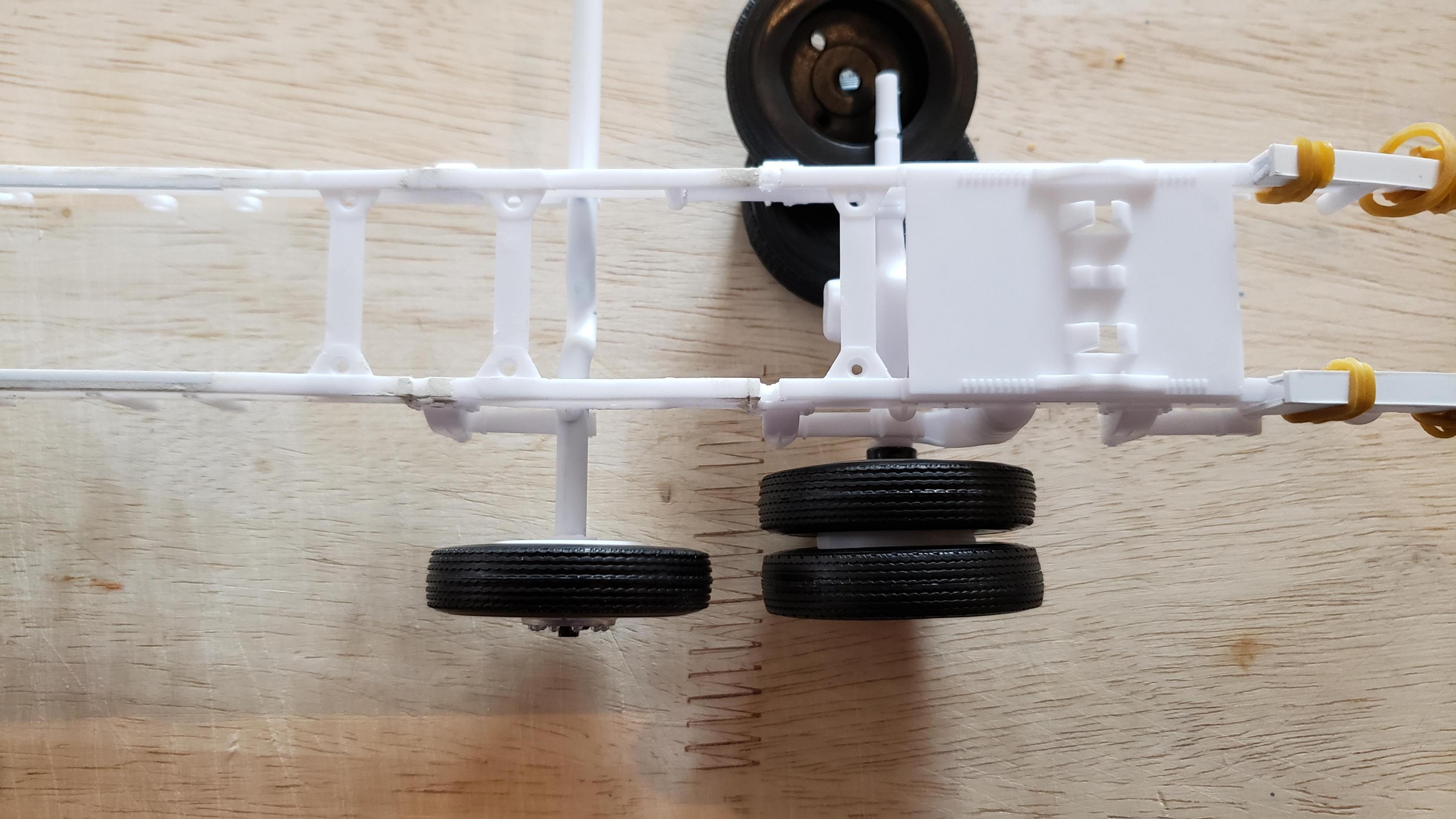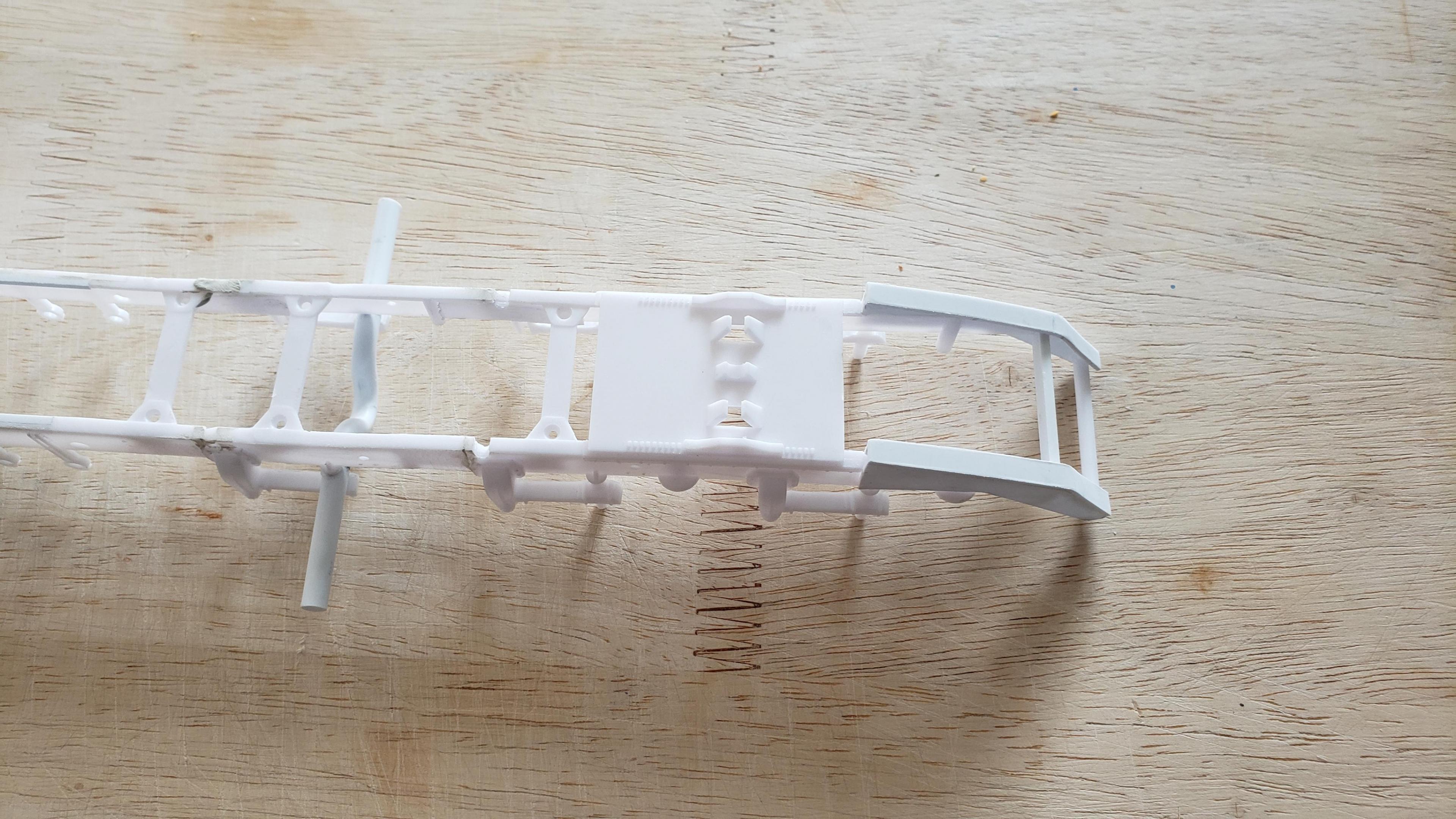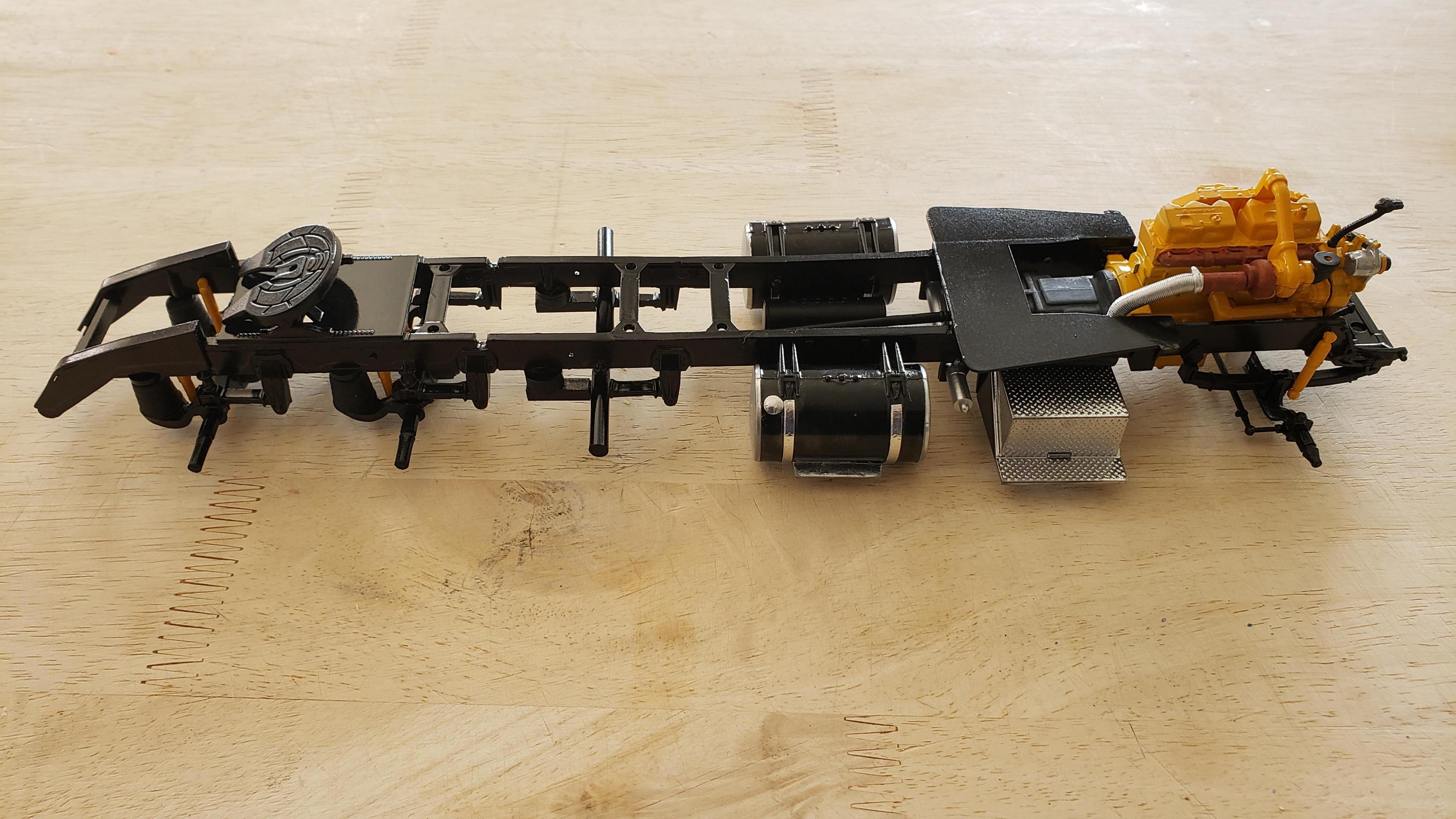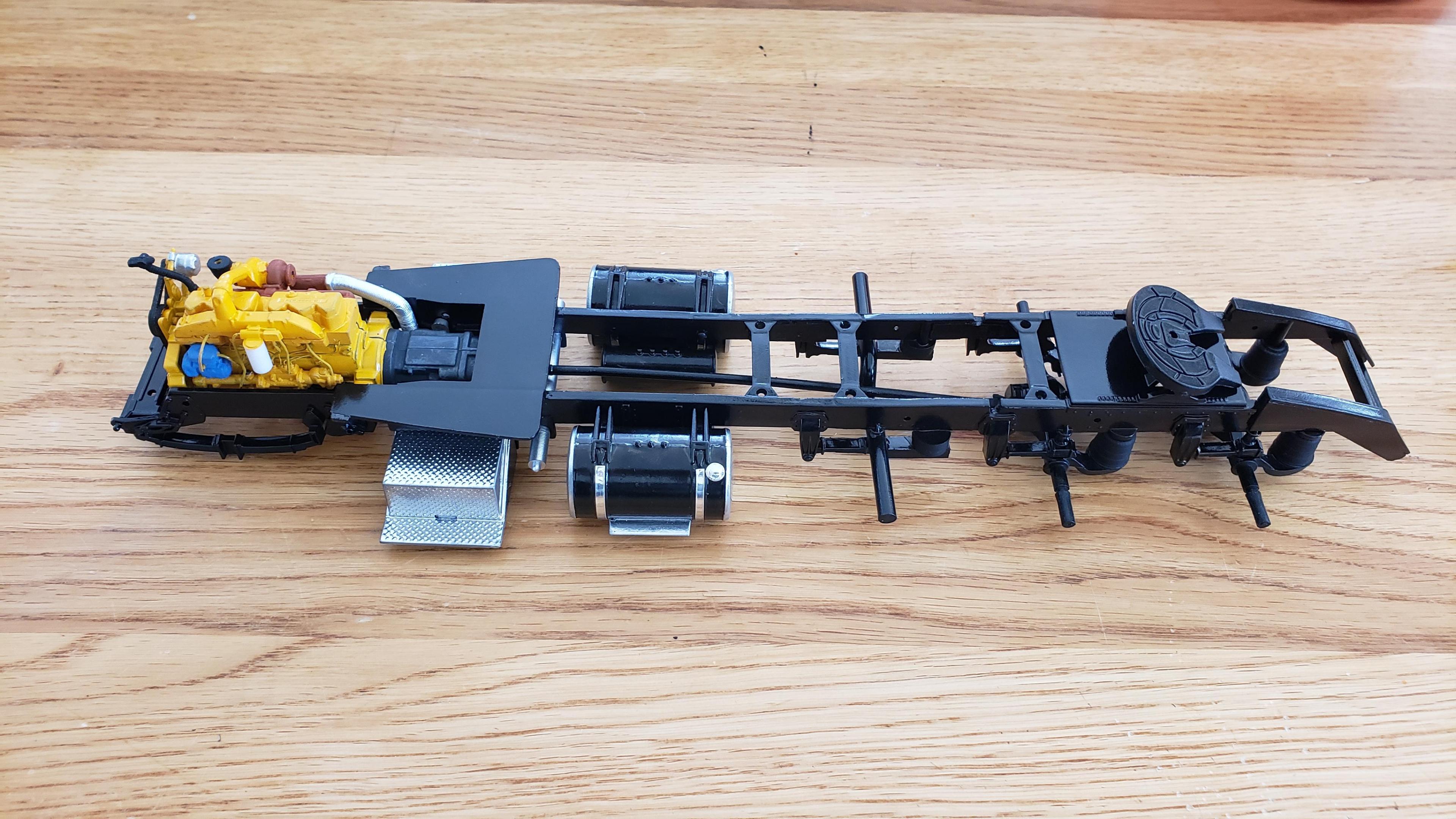 I got a bunch more work done this weekend. First I fixed the engine front cover which had a paint malfunction. I got back to work on the frame. I made some cozad ramps for picking up double drop trailers. First I made the side plates Mounted them on the frame Then put the ramps on And some crossmembers The frame is too narrow where the sleeper was molded on, so I added strips to bring it to the correct width, as well as add some strength I also got the lift axle built. I made it from 3/16 rod And here's what I wound up doing with the suspension for it. Not perfect, but it will suffice Then I worked on the interior. I cut the bunk off I made a filler section from sheet, and scribed the pattern on it. And a little bit of detail work And a couple more bits I made a pogo stick from sprue, and a deck plate from sheet And some various other random parts I had a lot of fun this weekend, and made a lot of progress. Thanks for looking! -