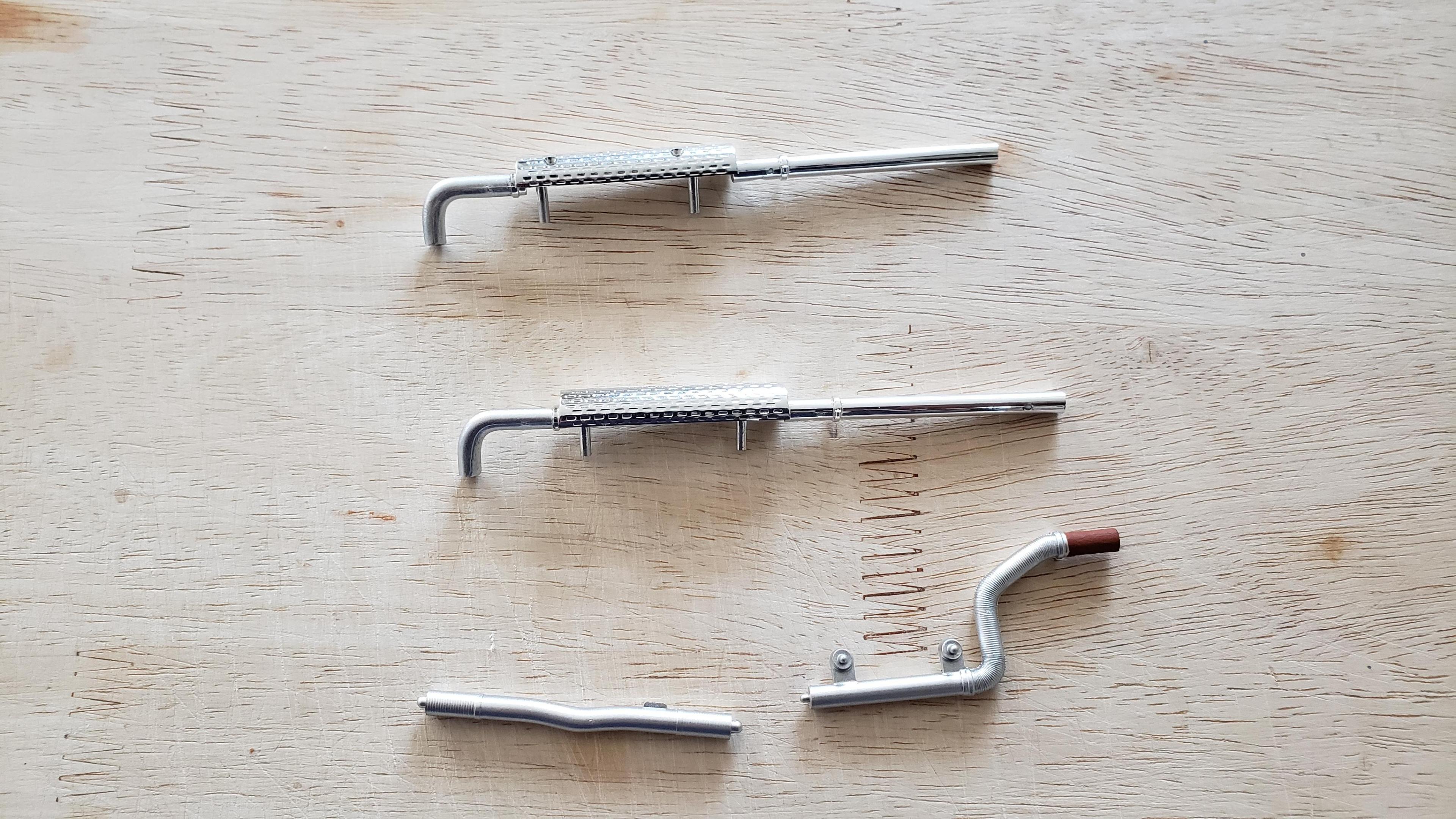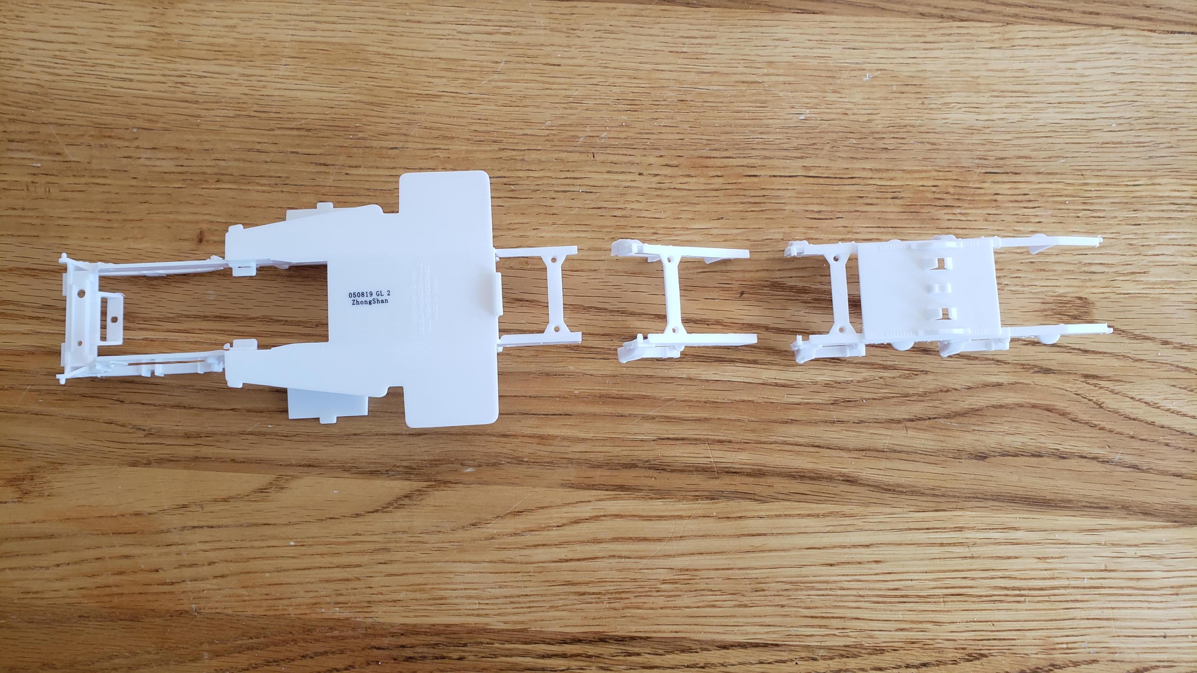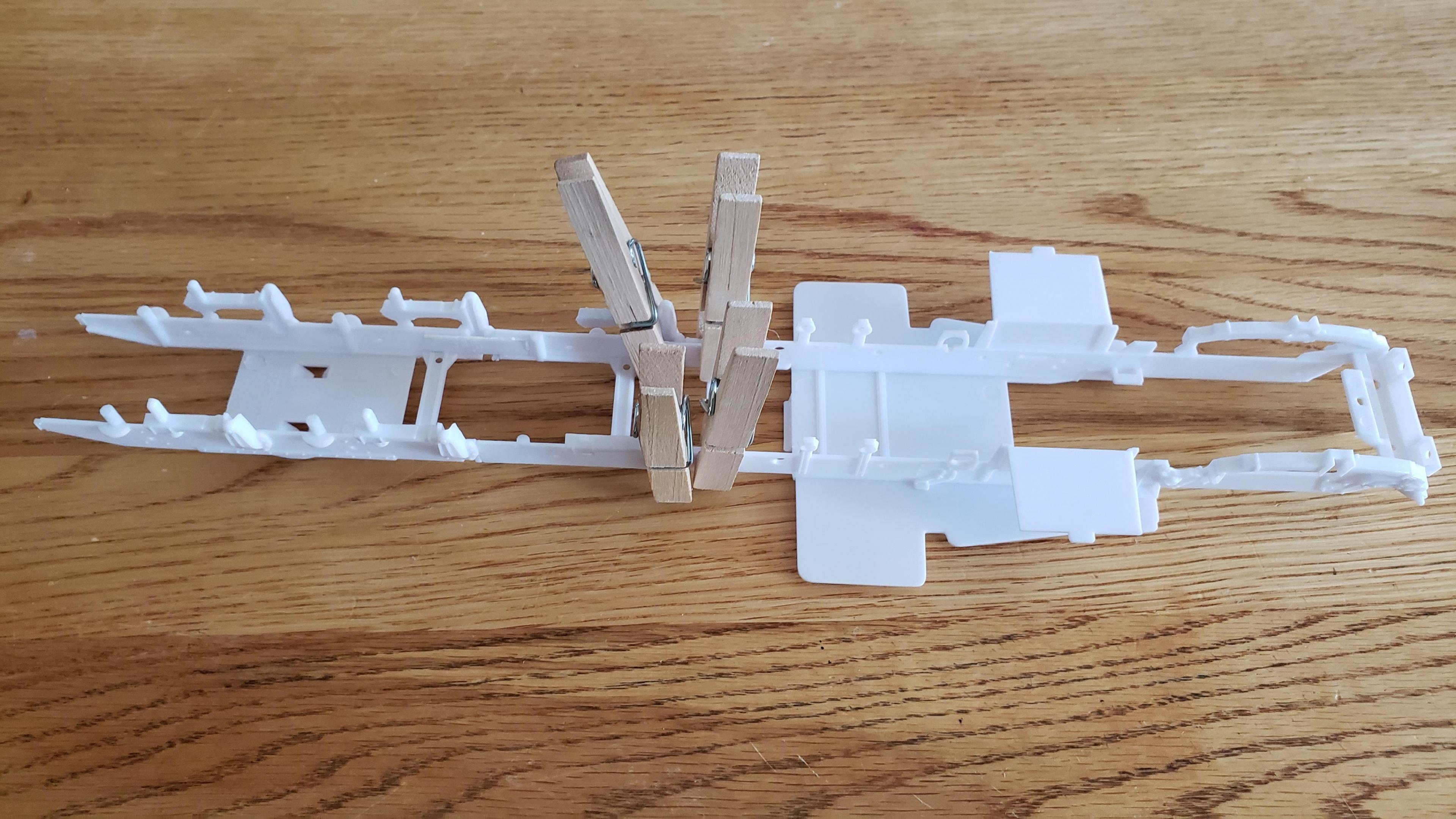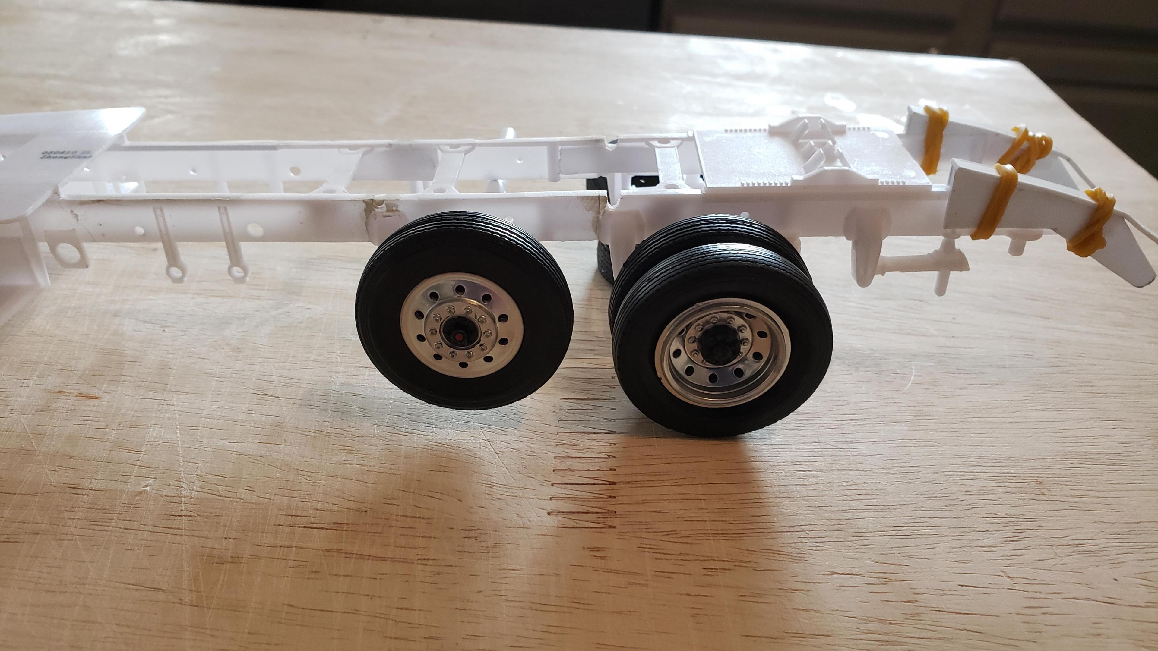 Well, with the kids at the in-laws, and my wife at work, I got quite a lot done this weekend! Sorry, this is a long, pic-heavy post! I started with stripping some chrome, and painting wheels and steps. I know about the tire warpage with these kits, but I'm going to try them anyways. If they're terrible, I'll get some from Jamie. I also worked on the engine, and plumbed it up. The air compressor came out a little dark, but I'll live with it. I used the article from Car Modeller magazine as a guide, I'm not sure if it's 100% accurate. I thought it gave the engine a little something extra anyways. I got to work on the frame. I started with 2 I cut the first one at the front of the first spring mount Then I cut a section out of the other frame. I'm not going fully accurate with the lift axle. Just going to use the springs to mount an axle from scratch Then I removed the 5th wheel plate from the extra section Then I attached everything with strips inside the frame for bracing At this point, I decided that I did indeed want to build it as a day cab, so I went ahead and removed the sleeper floor I also needed to lengthen the drive shaft. I didn't get a shot of it finished, but it's long enough now Then I got to work on the cab. First I cut the sleeper off Then I made a rear panel Cut out a window Installed it A little bit of putty Then shot some primer It looks like the window and the left side of the cab need some dressing up, but I'm pretty happy with how it came out so far. I added a strip on the inside to support the rear of the cab on the floor And this is how she sits. I had a lot of fun, and I'm happy with all the work I finished. Thanks for looking!