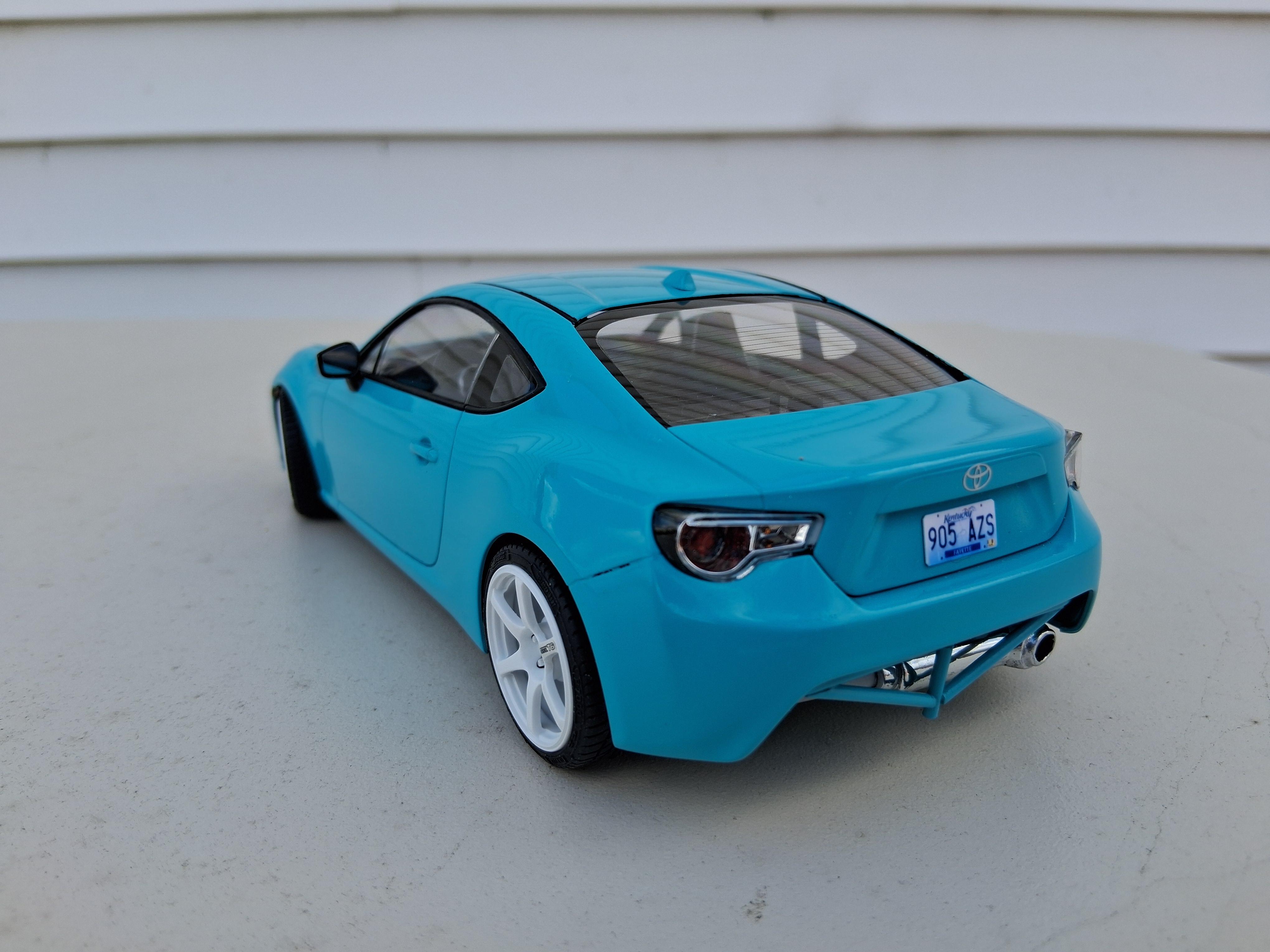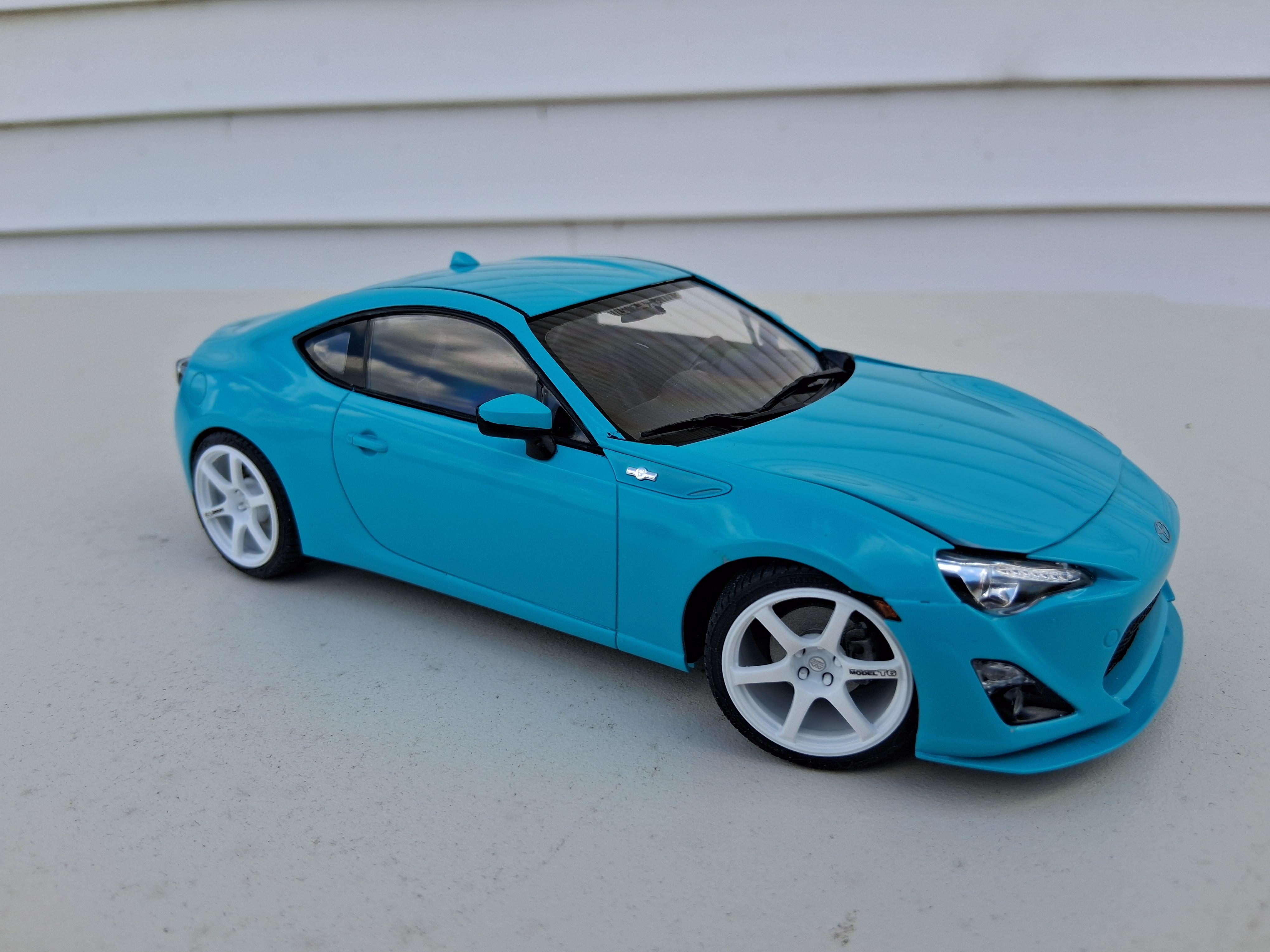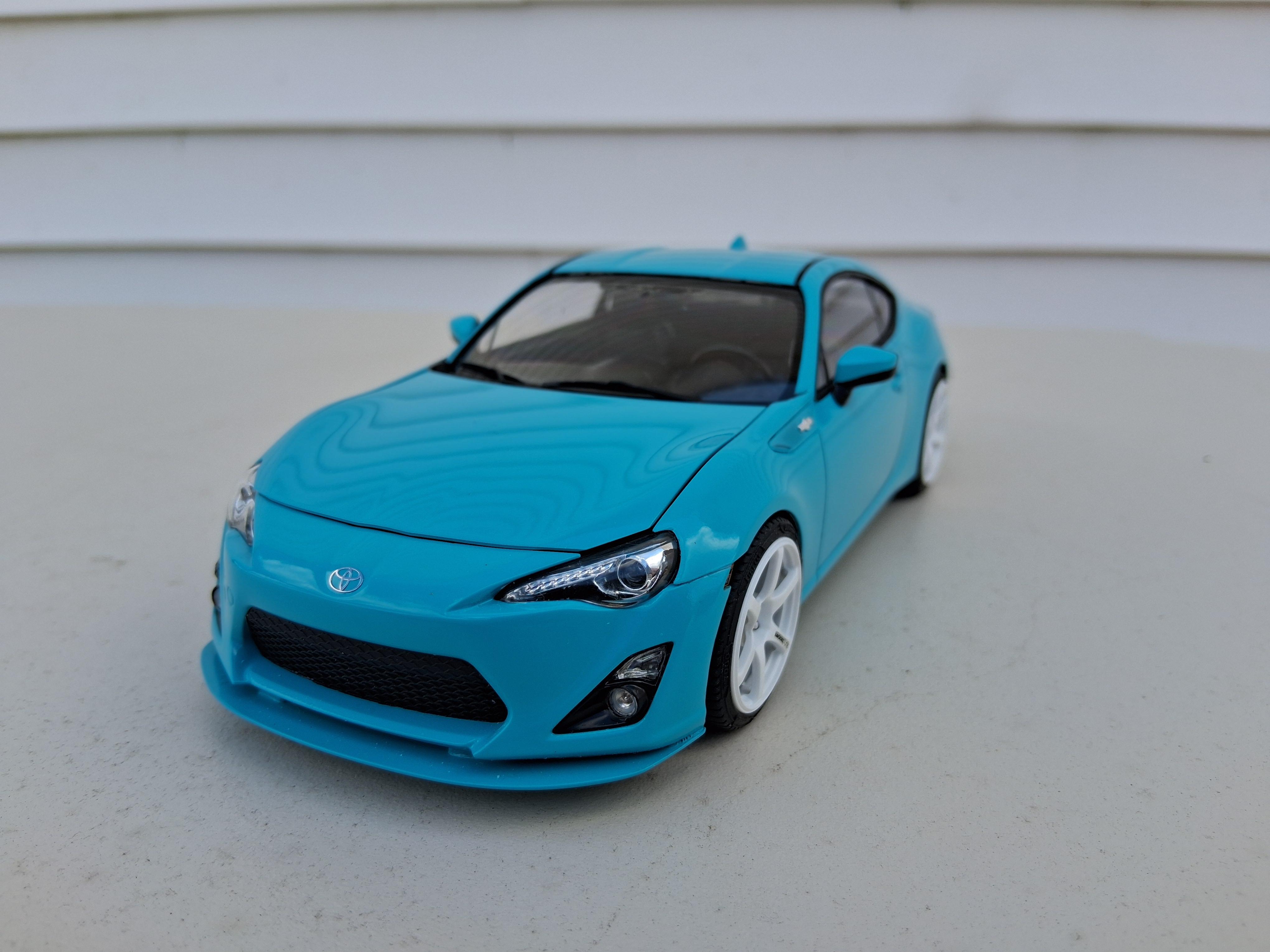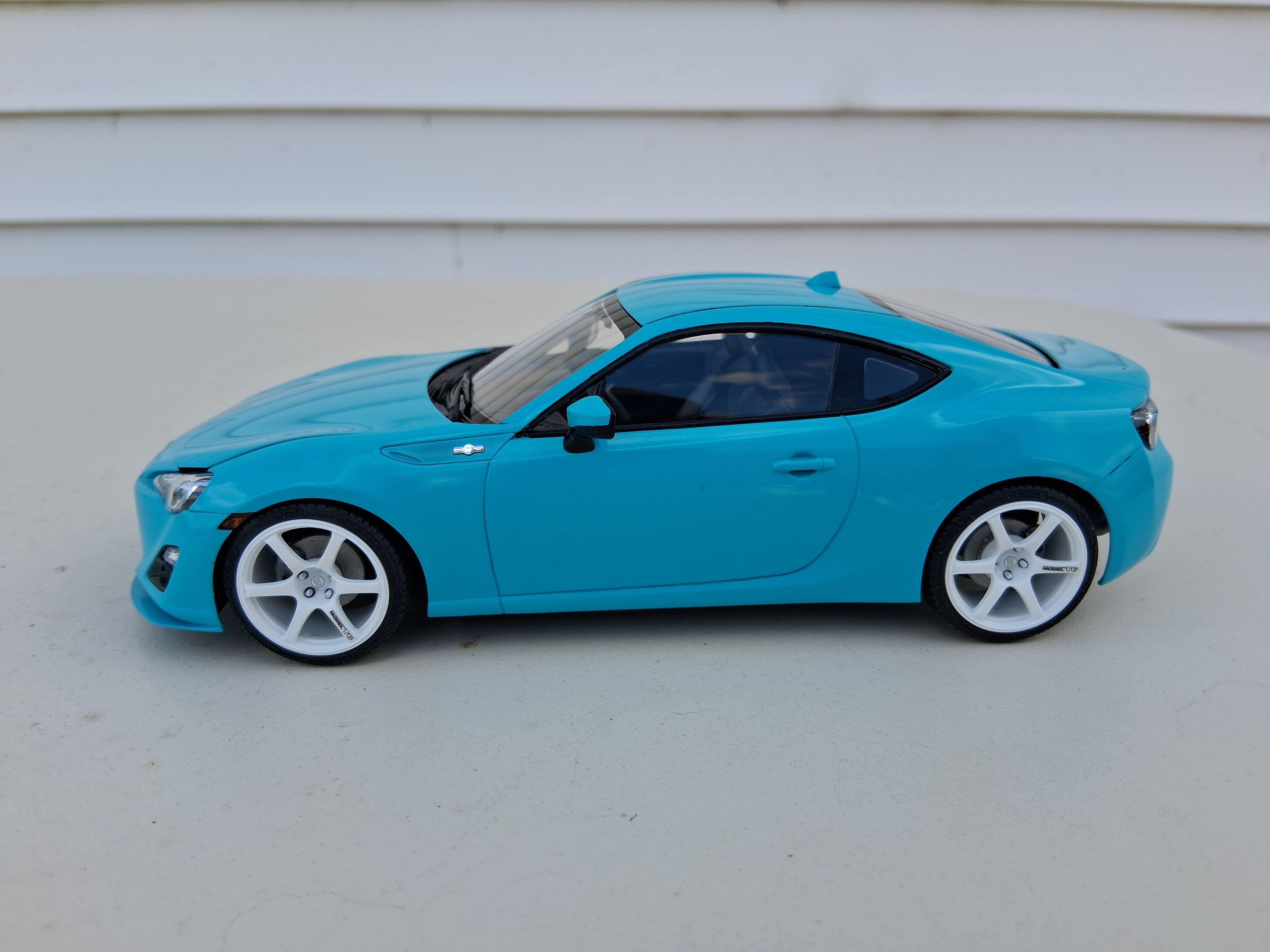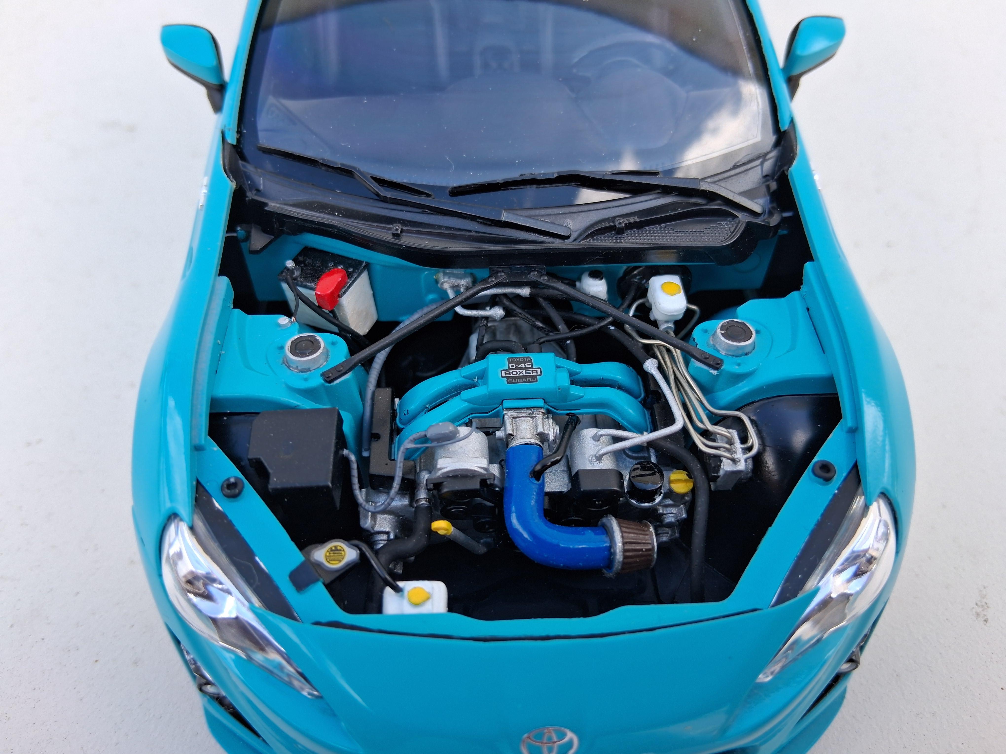 I bought this from ebay a couple weeks ago. It was listed as "new in bags". Not quite. I didnt study the pics well enough. Someone primered the body parts and sprayed a parts tree black. The bumpers were attached and a couple of glue fingerprints had been primered over. Easy fix, but a little annoying. Oh well. After realigning the bumpers and sanding everything smooth, I painted it Tamiya coral blue over Mr Hobby gray primer. I scratchbuilt several engine bay parts, like the ABS module, overflow tank, Perrin style intake pipe, AC lines, and clutch master. I converted it to left hand drive using parts from an Aoshima BRZ. The dash, firewall, and cowl fit pretty close as is, but the Aoshima console didn't. I ended up cutting both kits consoles apart and playing with pieces until it fit and covered the hole in the tub. I also made a muffler, bash bar, and used Aoshima 19" Advan T61 wheels.