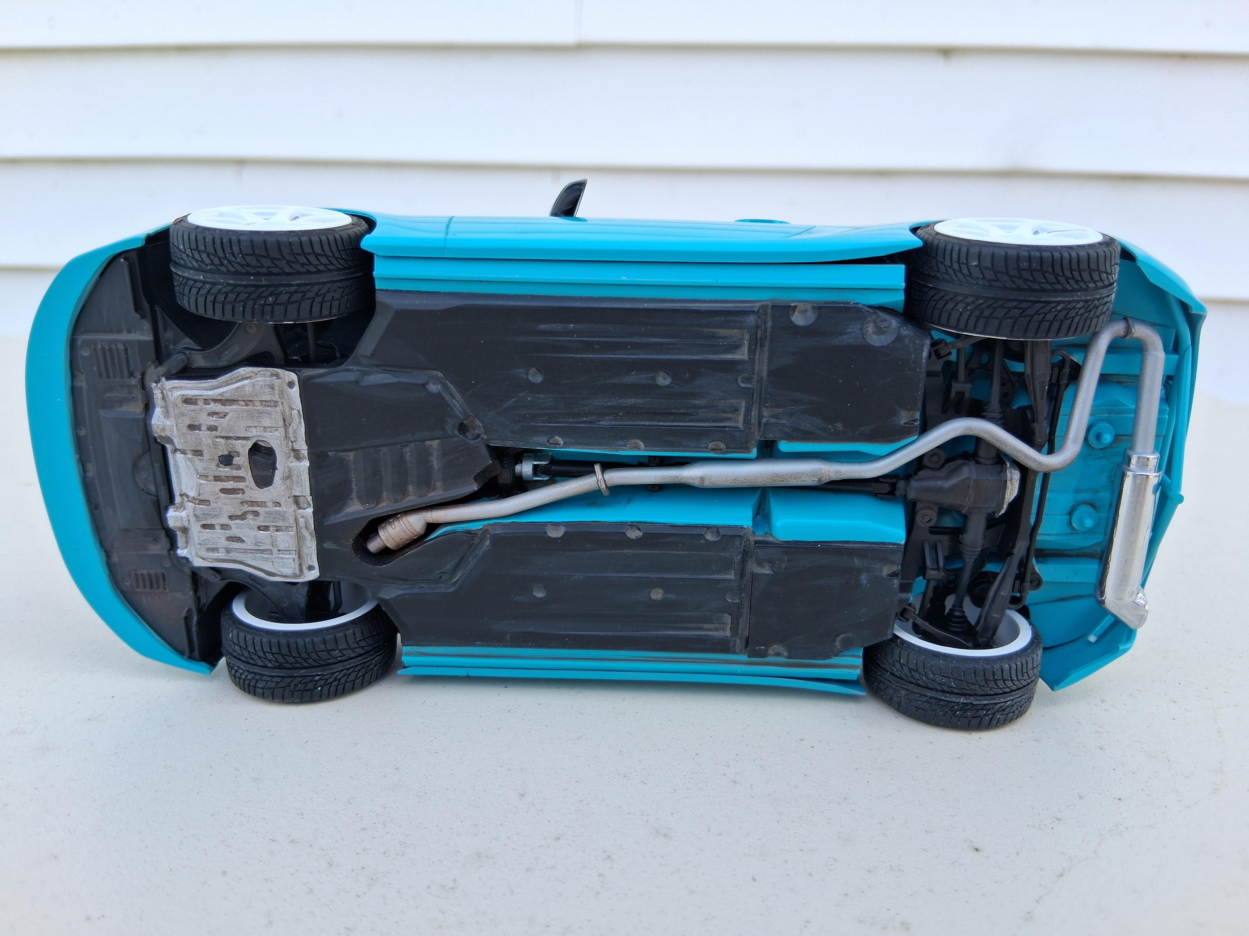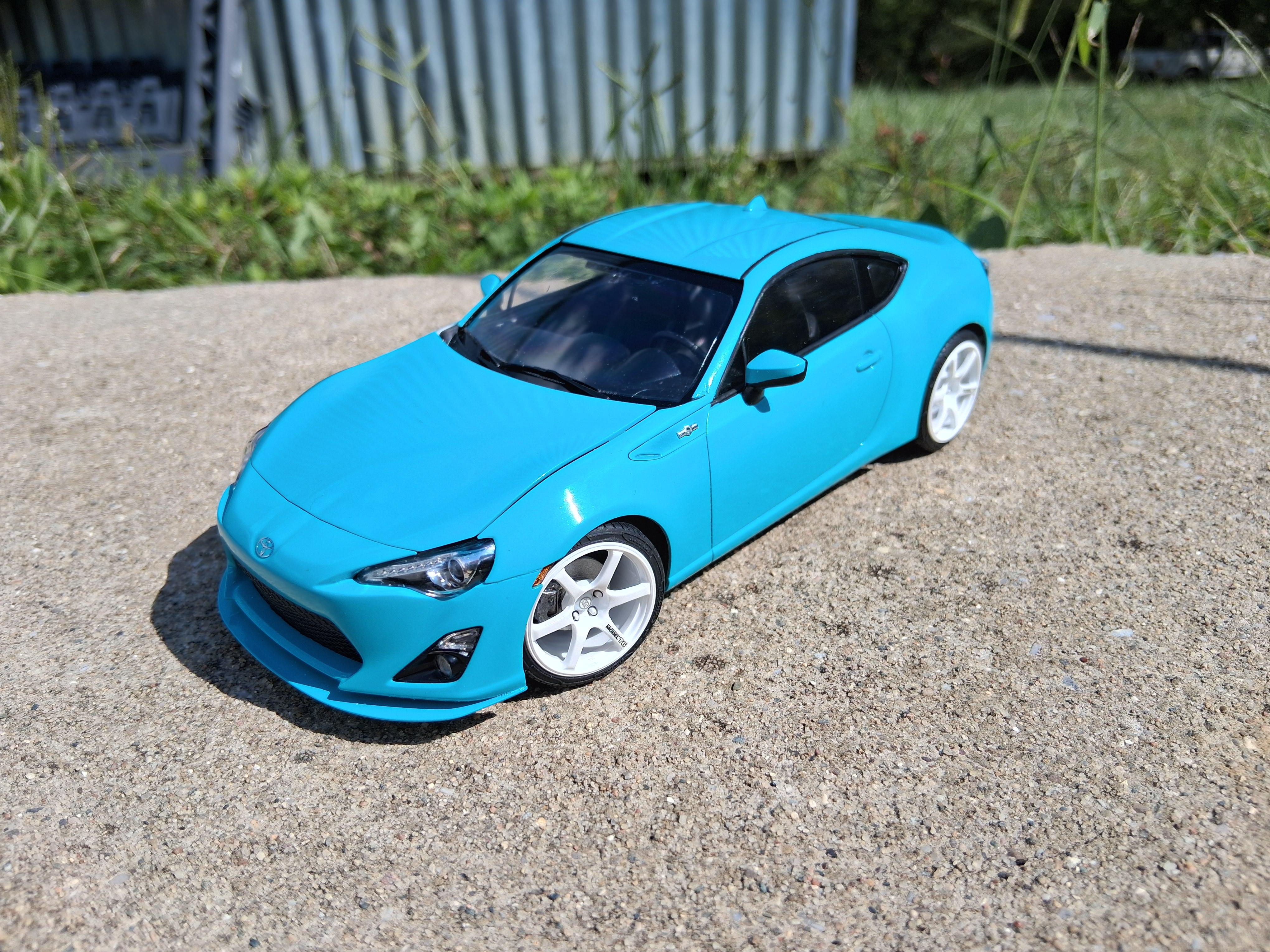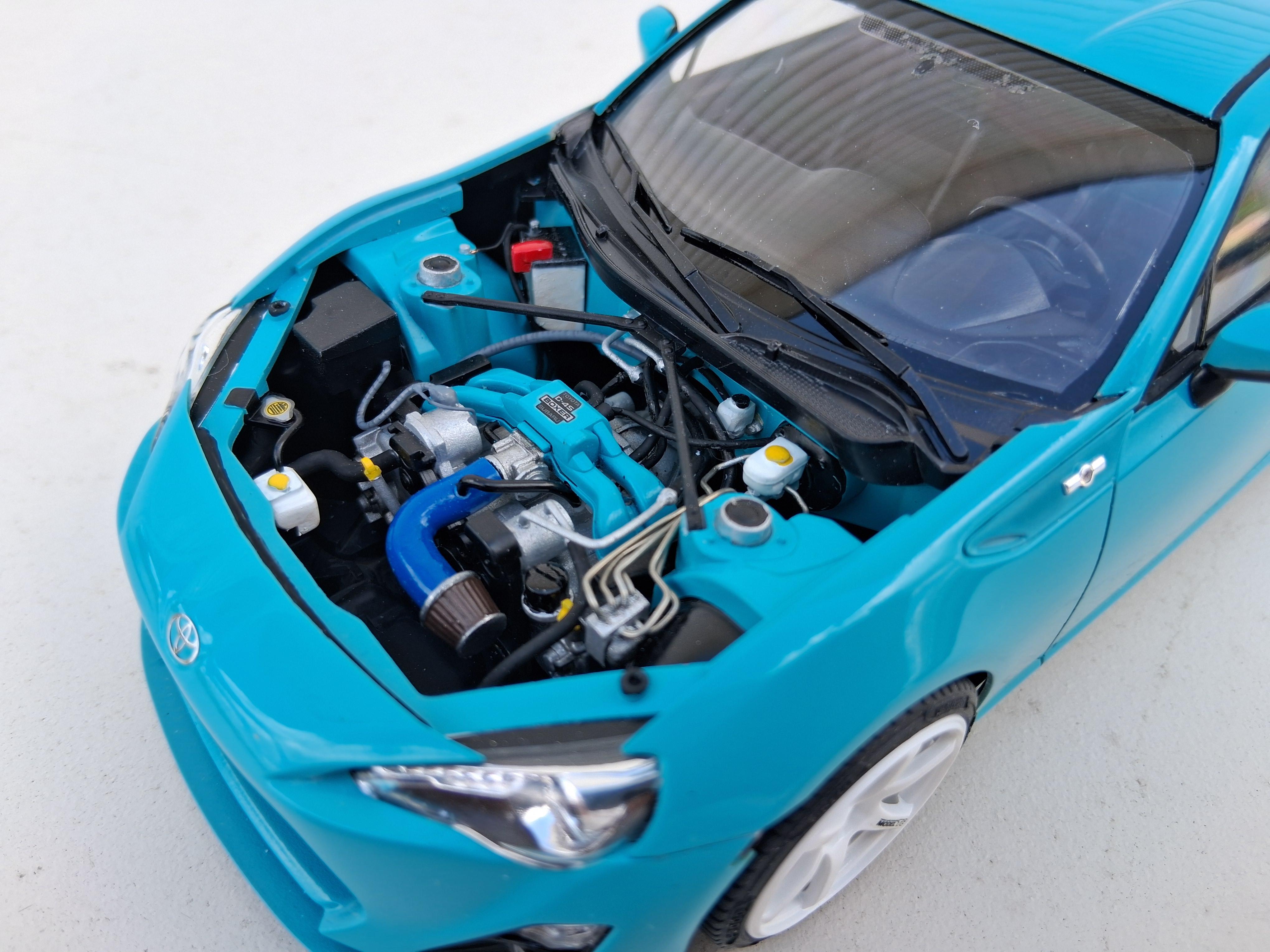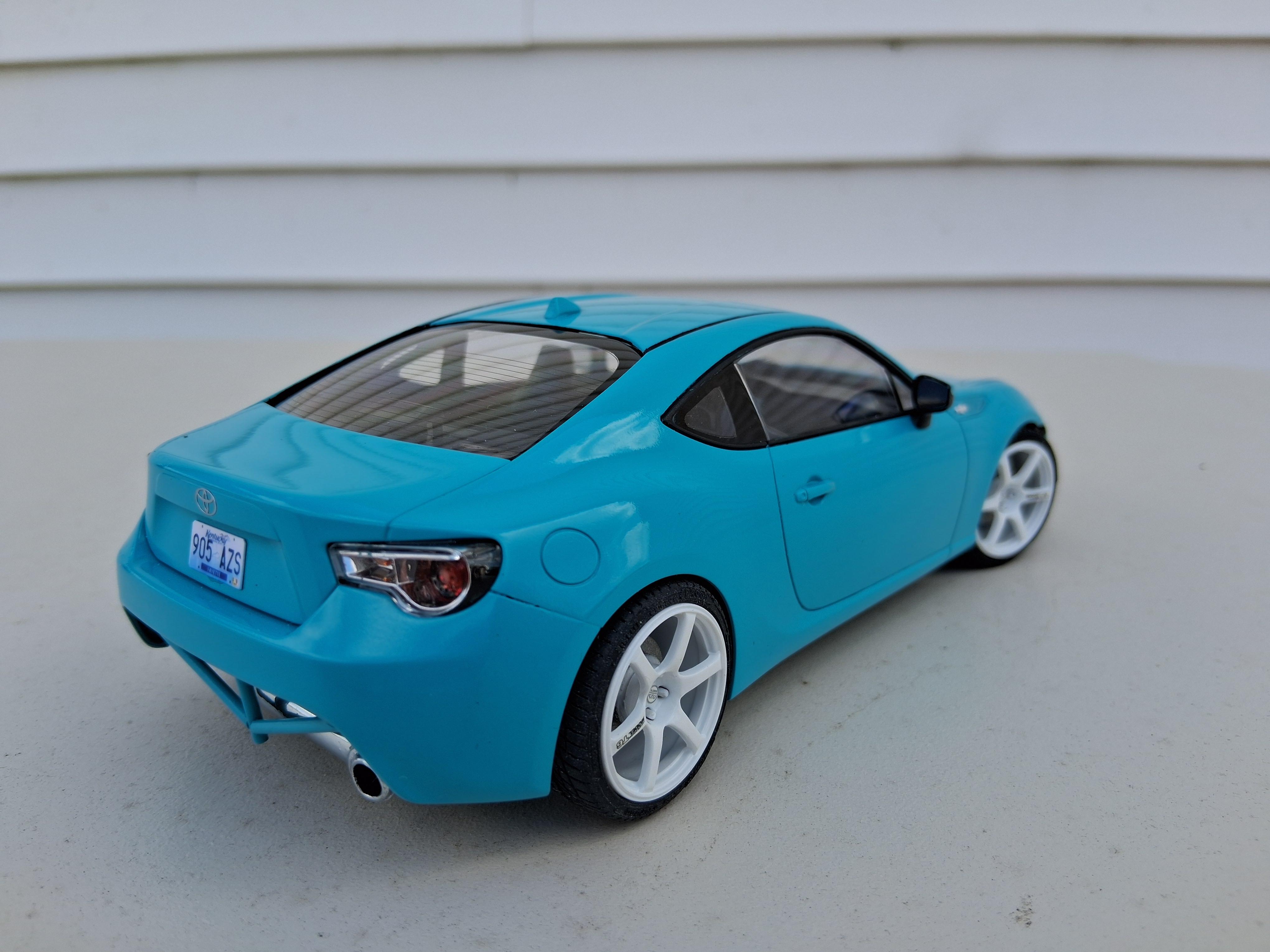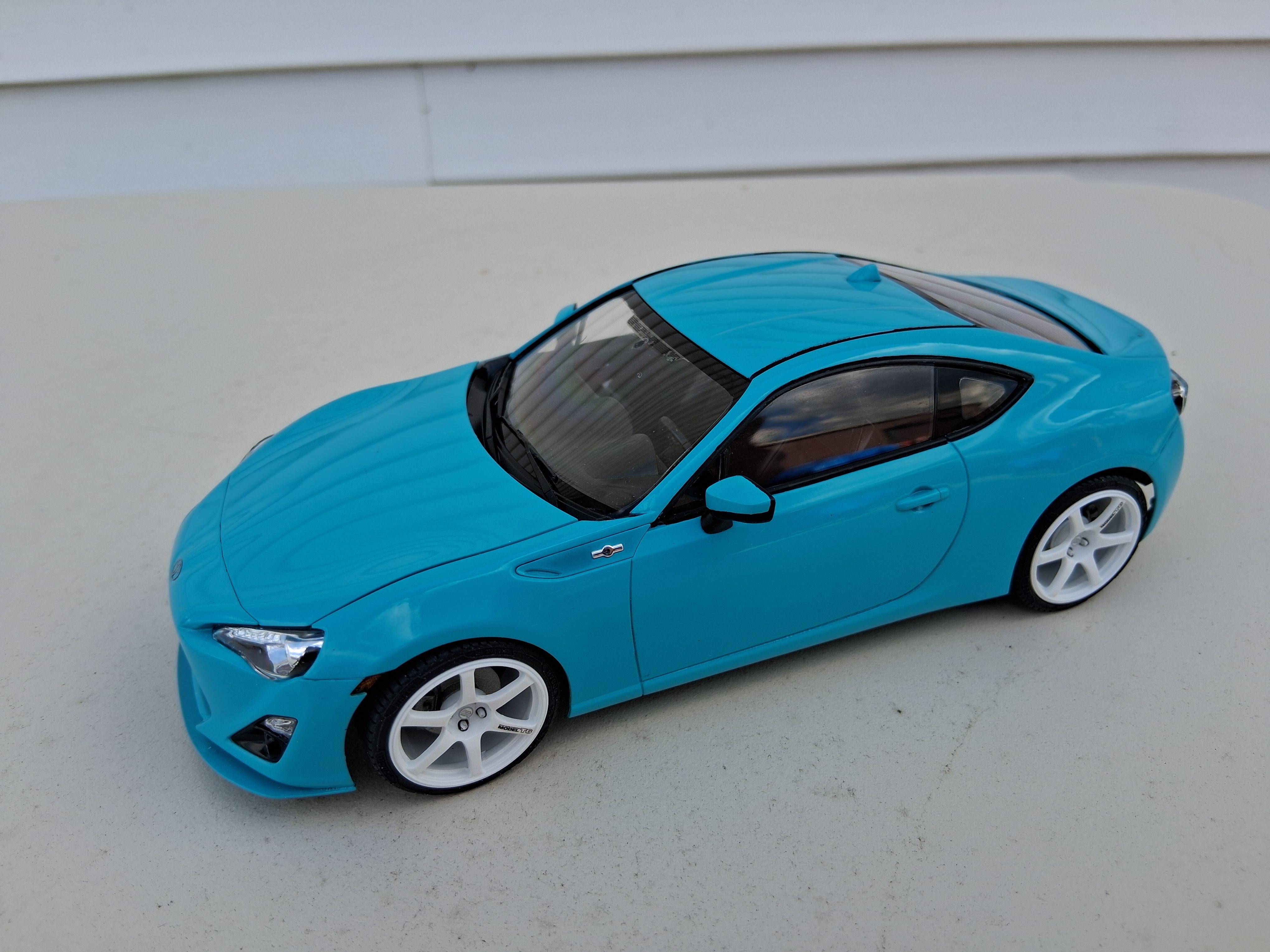 I bought this from ebay a couple weeks ago. It was listed as "new in bags". Not quite. I didnt study the pics well enough. Someone primered the body parts and sprayed a parts tree black. The bumpers were attached and a couple of glue fingerprints had been primered over. Easy fix, but a little annoying. Oh well. After realigning the bumpers and sanding everything smooth, I painted it Tamiya coral blue over Mr Hobby gray primer. I scratchbuilt several engine bay parts, like the ABS module, overflow tank, Perrin style intake pipe, AC lines, and clutch master. I converted it to left hand drive using parts from an Aoshima BRZ. The dash, firewall, and cowl fit pretty close as is, but the Aoshima console didn't. I ended up cutting both kits consoles apart and playing with pieces until it fit and covered the hole in the tub. I also made a muffler, bash bar, and used Aoshima 19" Advan T61 wheels.