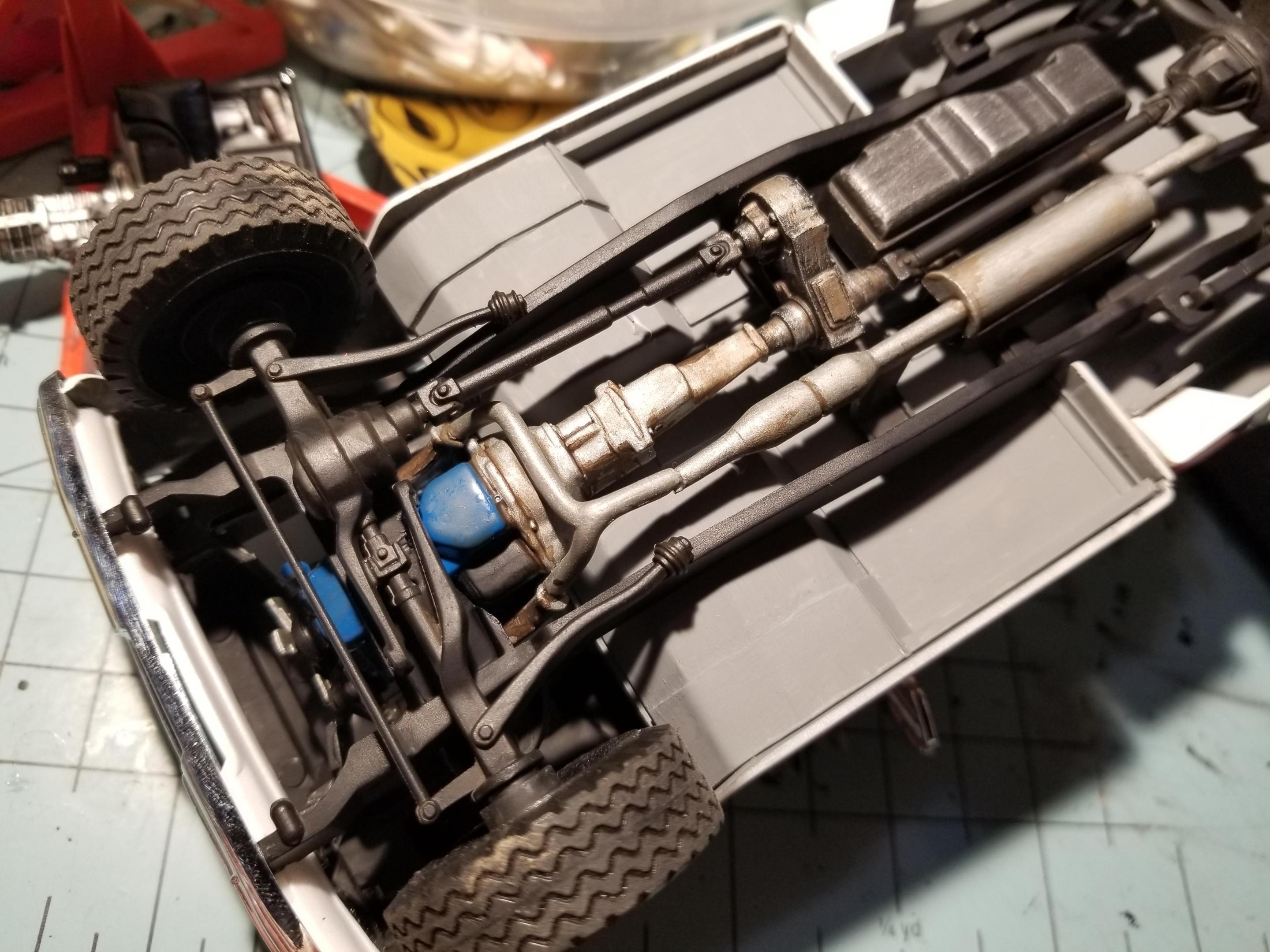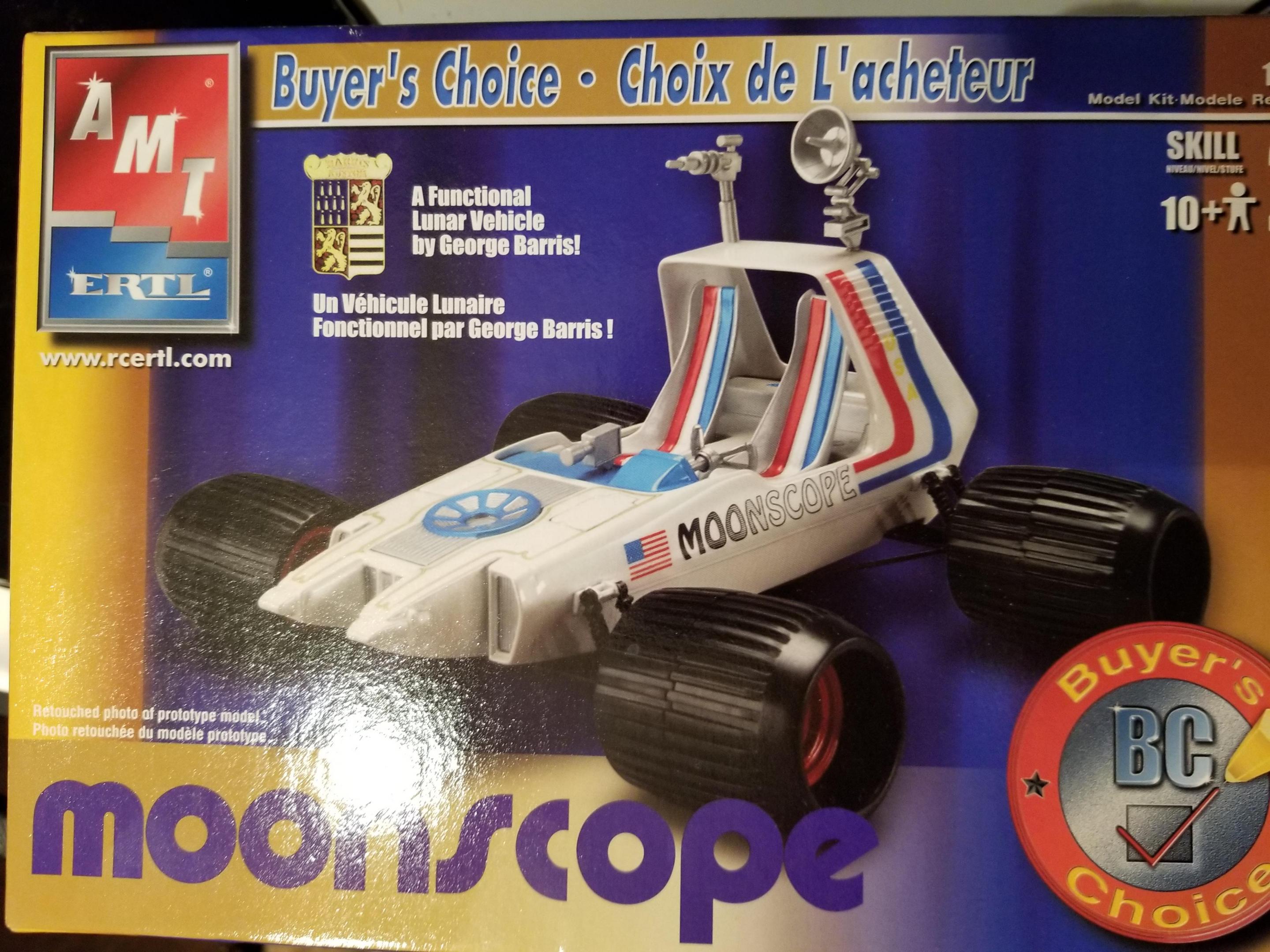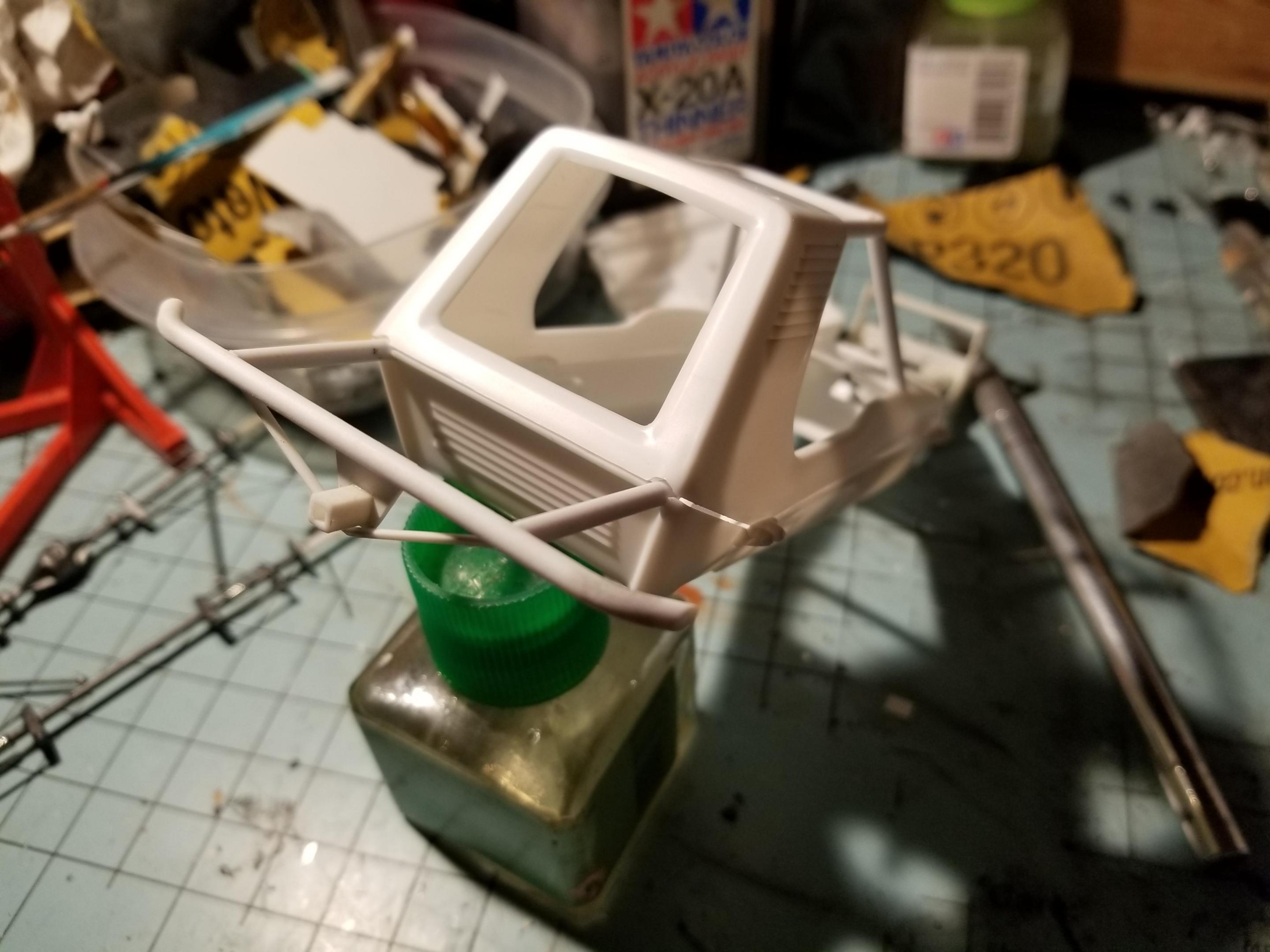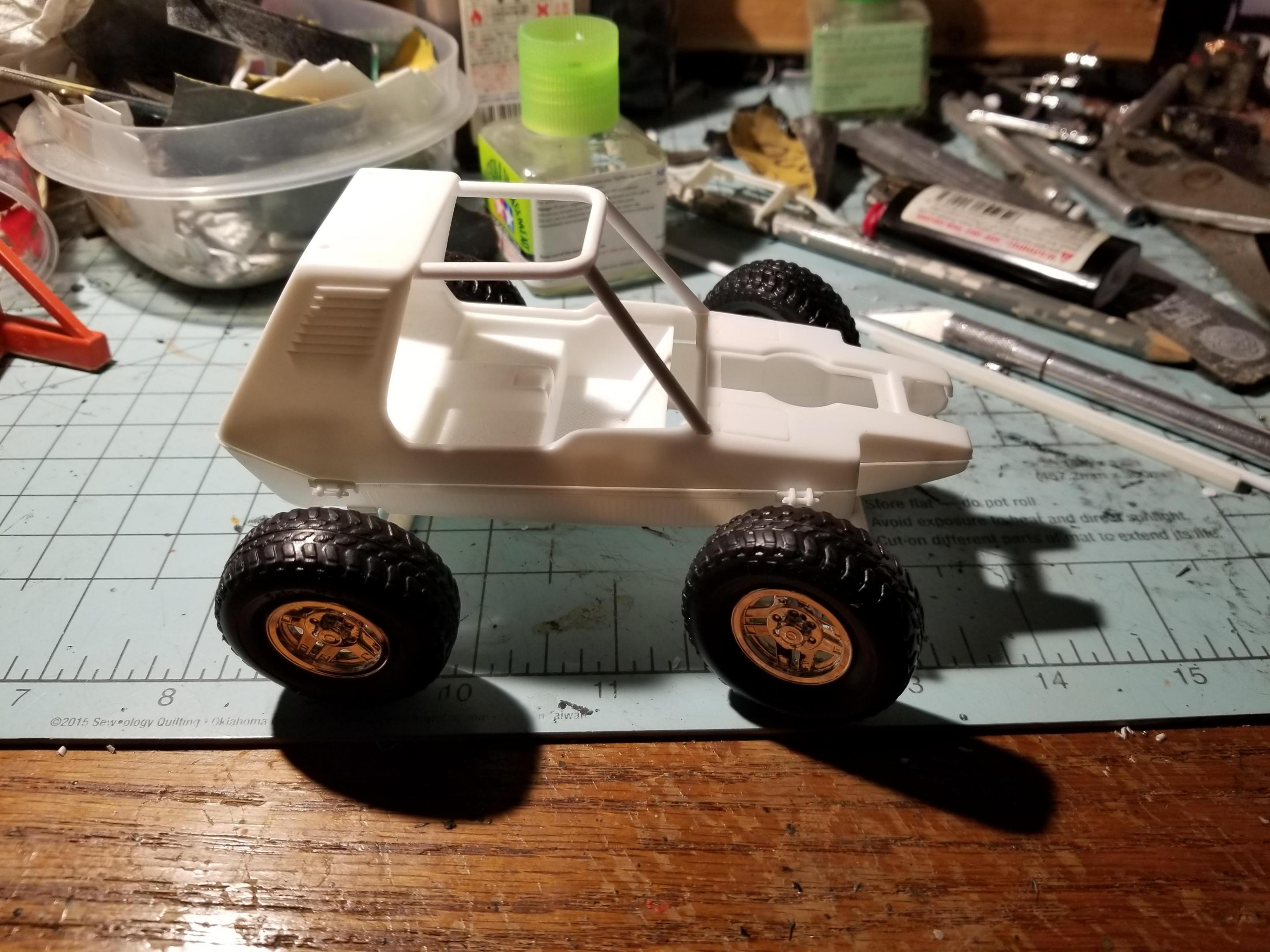First time on the bench since hot weather arrived. Hard to paint with the humidity we've been having. Anyway, I found this kit for $10 at a small shop. Instead of building it as shown on the box, I'm going a different way. What if rednecks colonized the moon? Their buggies would be a lot more colorful than NASA's. I began by building a simple roll bar around the passenger compartment, then the rear bumper (with a 2" receiver hitch) The front is a parts box grill guard that will have a winch. Wheels are 1/20 Toyota 4wd pickup items. I haven't decided on paint. I'm leaning towards something bright and outlandish, but dirty and weathered sounds good, too.