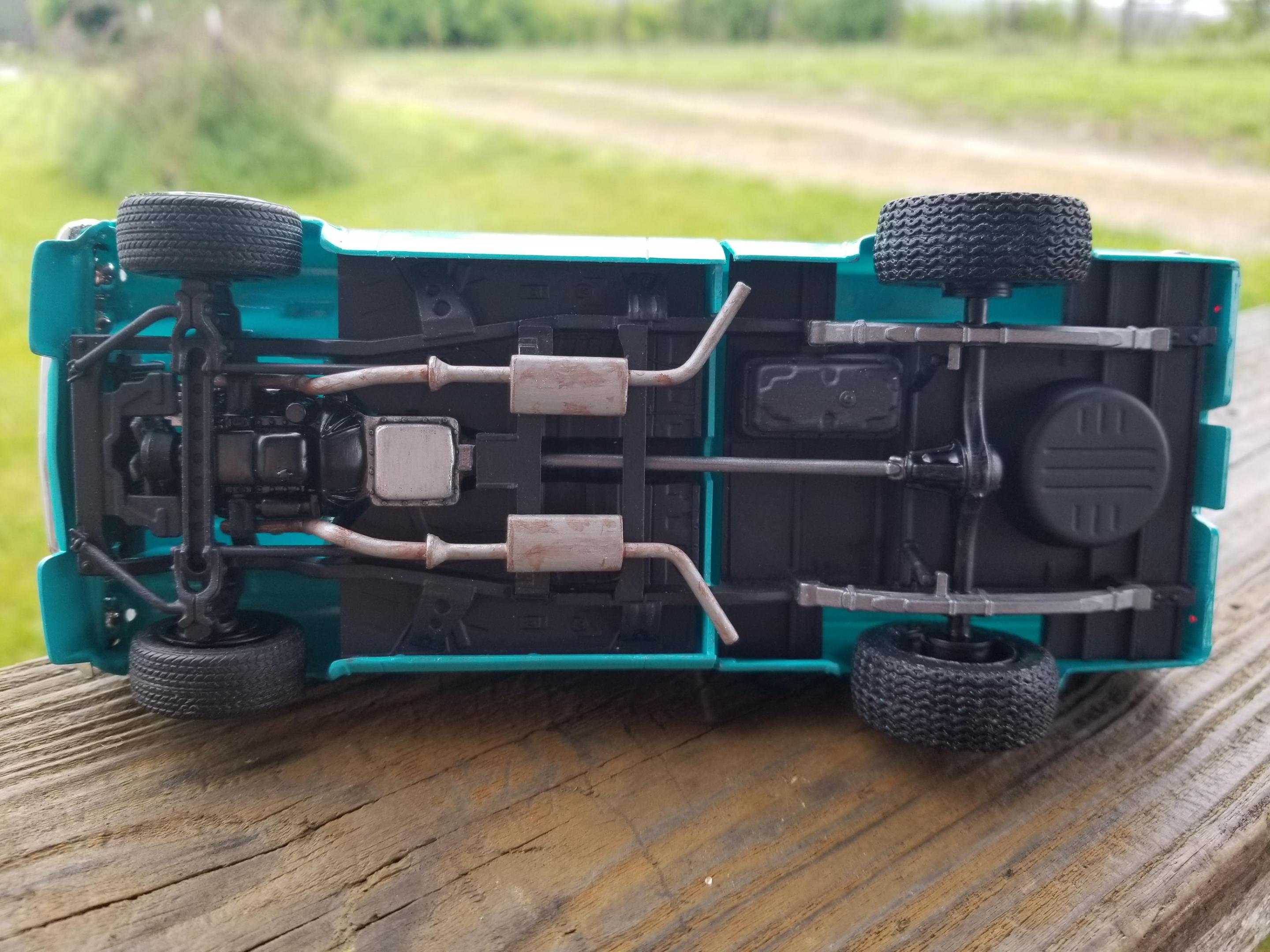I'm calling this one done. No point in doing too much detailing given the wonky plastic. If Revell can fix the styrene issue, I'd gladly buy more, as I like old pickups. The kit didnt supply a master cylinder or radiator hose, so I sourced one from the parts box. I also omitted the goofy rear bumper. Since I swapped the V8 out for a 4.3/auto, I modified a parts box console and shifter, and even though it cant be seen, I ground off the manual pedals and replaced them with a wide one for the brake. The dash isnt complete, as the areas on either side of the steering column just wasn't there, so out of the box, there's no ignition, wipers, or light switch. Again I added that, along with the tray under the glove box even though they're hard to see.