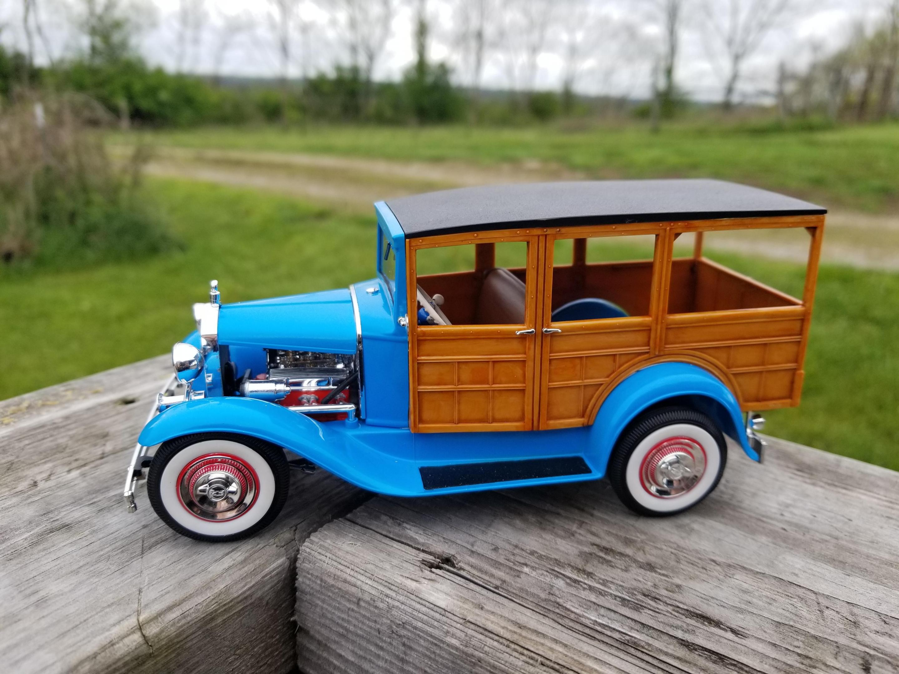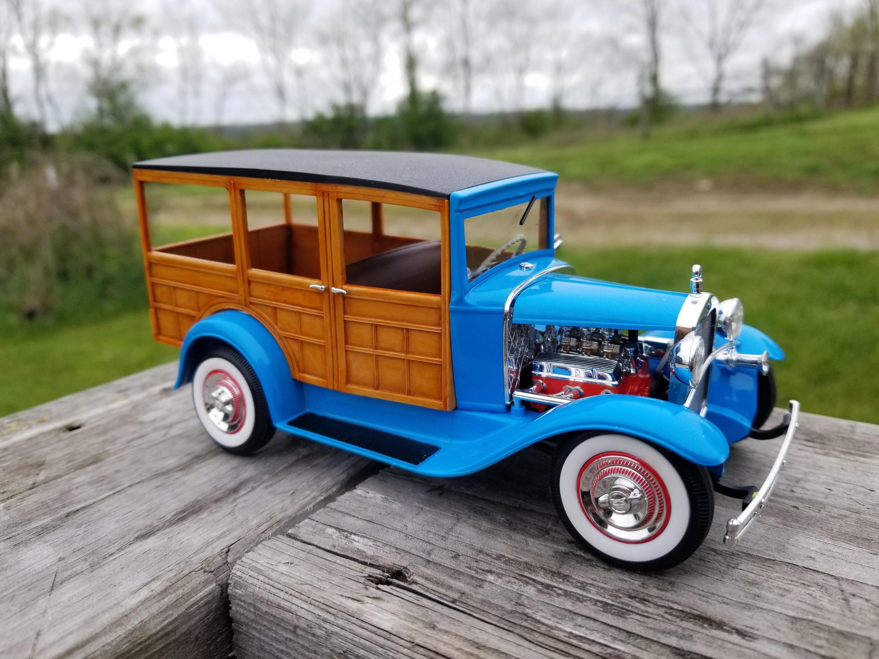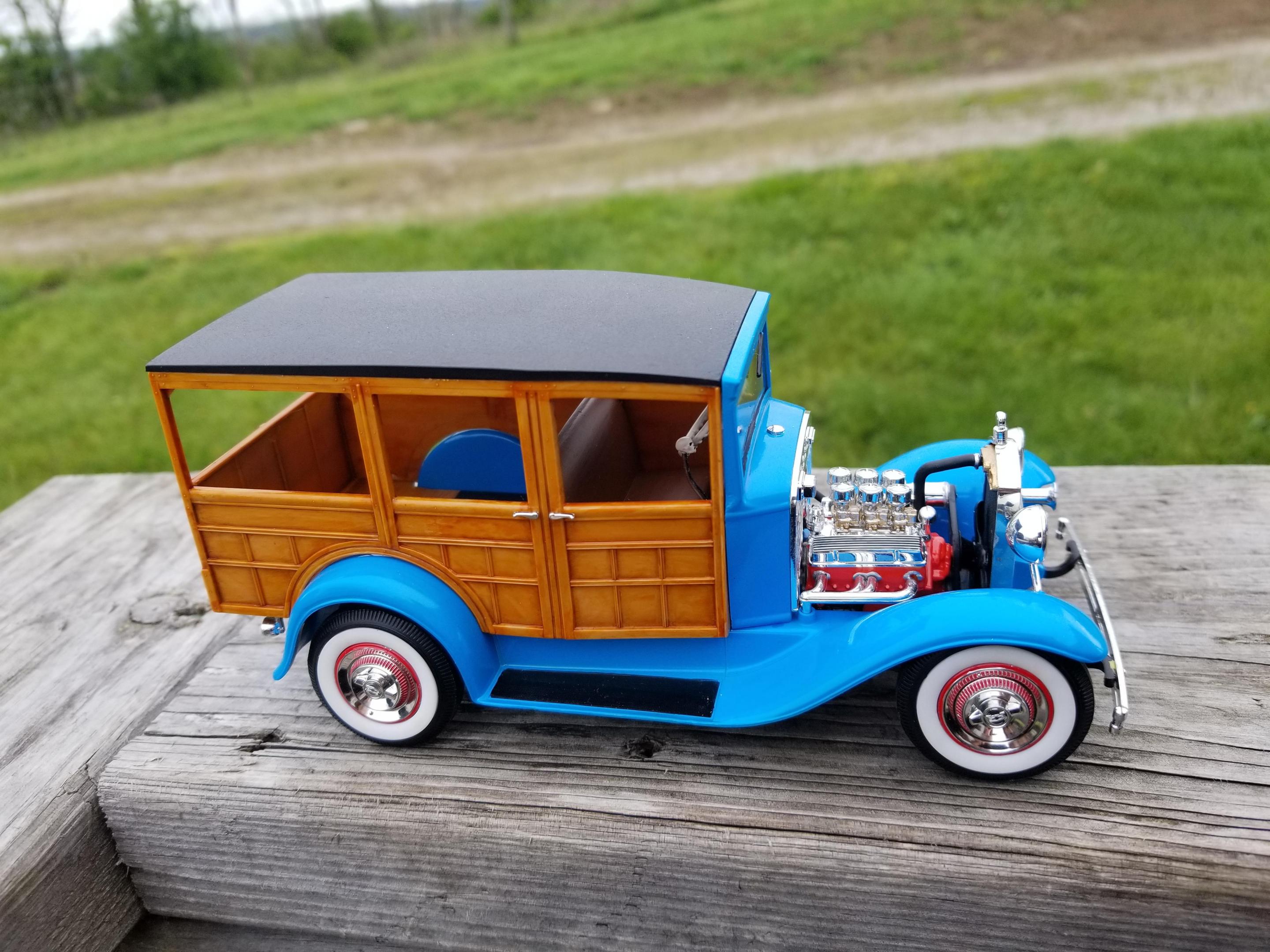 Not sure if this is considered a car or truck...I'm sure the mods will take care of it if I'm wrong. This is an old build given to me in pieces by my older brother. He built it in the late 80s. Being in the Navy, he moved a lot. It got broken somewhere along the way. He gave it to me around 00 or 01 and I tossed it in the closet and forgot about it. Then, a year or so later I won an ebay auction for a lot of kits that had either been started or parted out. One of the incomplete kits happened to be an older issue of my brother's build. I stripped off the Testors light blue paint and repainted it with the closest Tamiya shade I could find. The wood was molded in tan, so I just brushed tamiya clear orange over it which turned out pretty well. I had to replace his wire wheels because I broke one trying to clean them up. I ended with 53 Corvette hubcaps and tires. All of the chrome and the engine came from the donor kit. It's been 10 years since finishing, so I cant recall everything that I replaced, but for the most part I used his kit.