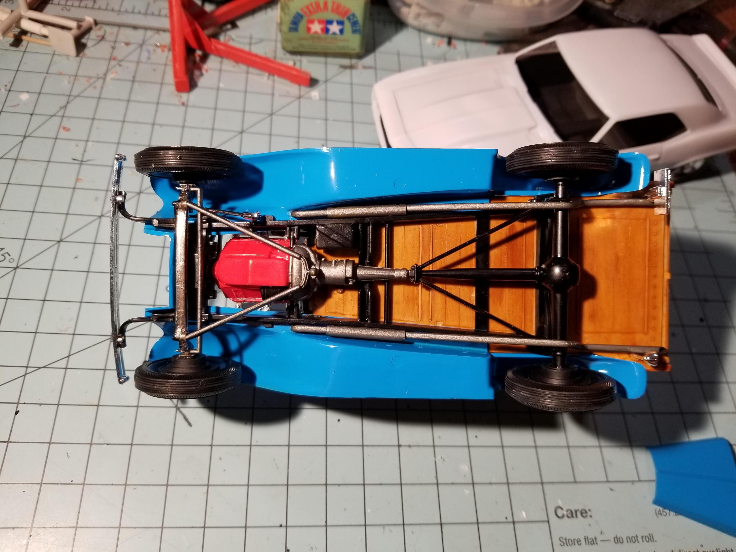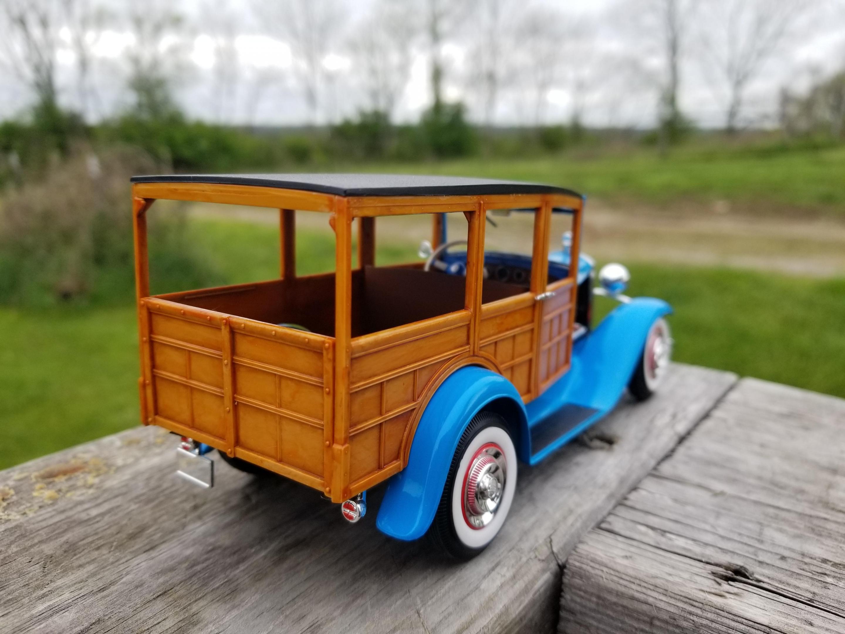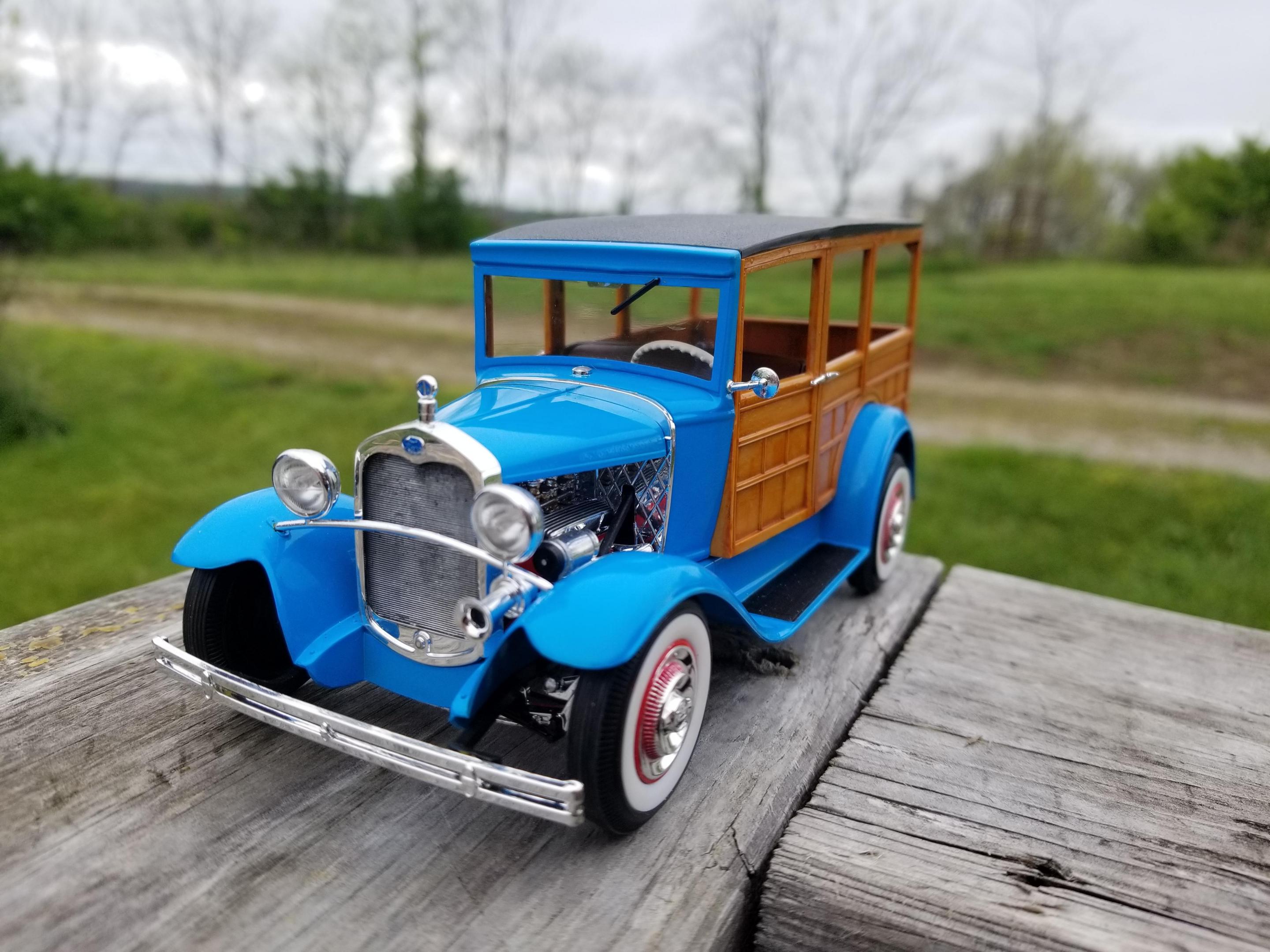 Not sure if this is considered a car or truck...I'm sure the mods will take care of it if I'm wrong. This is an old build given to me in pieces by my older brother. He built it in the late 80s. Being in the Navy, he moved a lot. It got broken somewhere along the way. He gave it to me around 00 or 01 and I tossed it in the closet and forgot about it. Then, a year or so later I won an ebay auction for a lot of kits that had either been started or parted out. One of the incomplete kits happened to be an older issue of my brother's build. I stripped off the Testors light blue paint and repainted it with the closest Tamiya shade I could find. The wood was molded in tan, so I just brushed tamiya clear orange over it which turned out pretty well. I had to replace his wire wheels because I broke one trying to clean them up. I ended with 53 Corvette hubcaps and tires. All of the chrome and the engine came from the donor kit. It's been 10 years since finishing, so I cant recall everything that I replaced, but for the most part I used his kit.