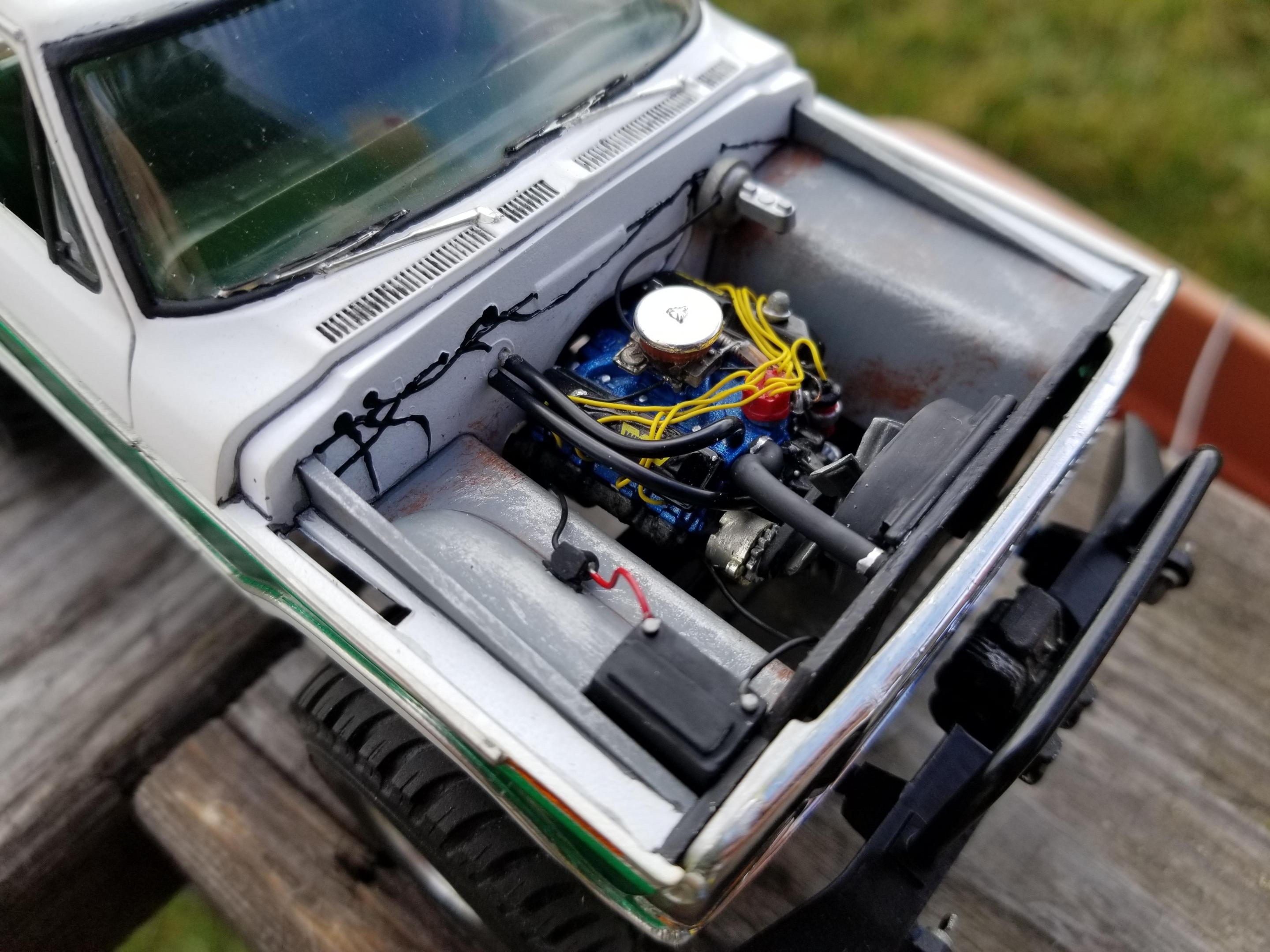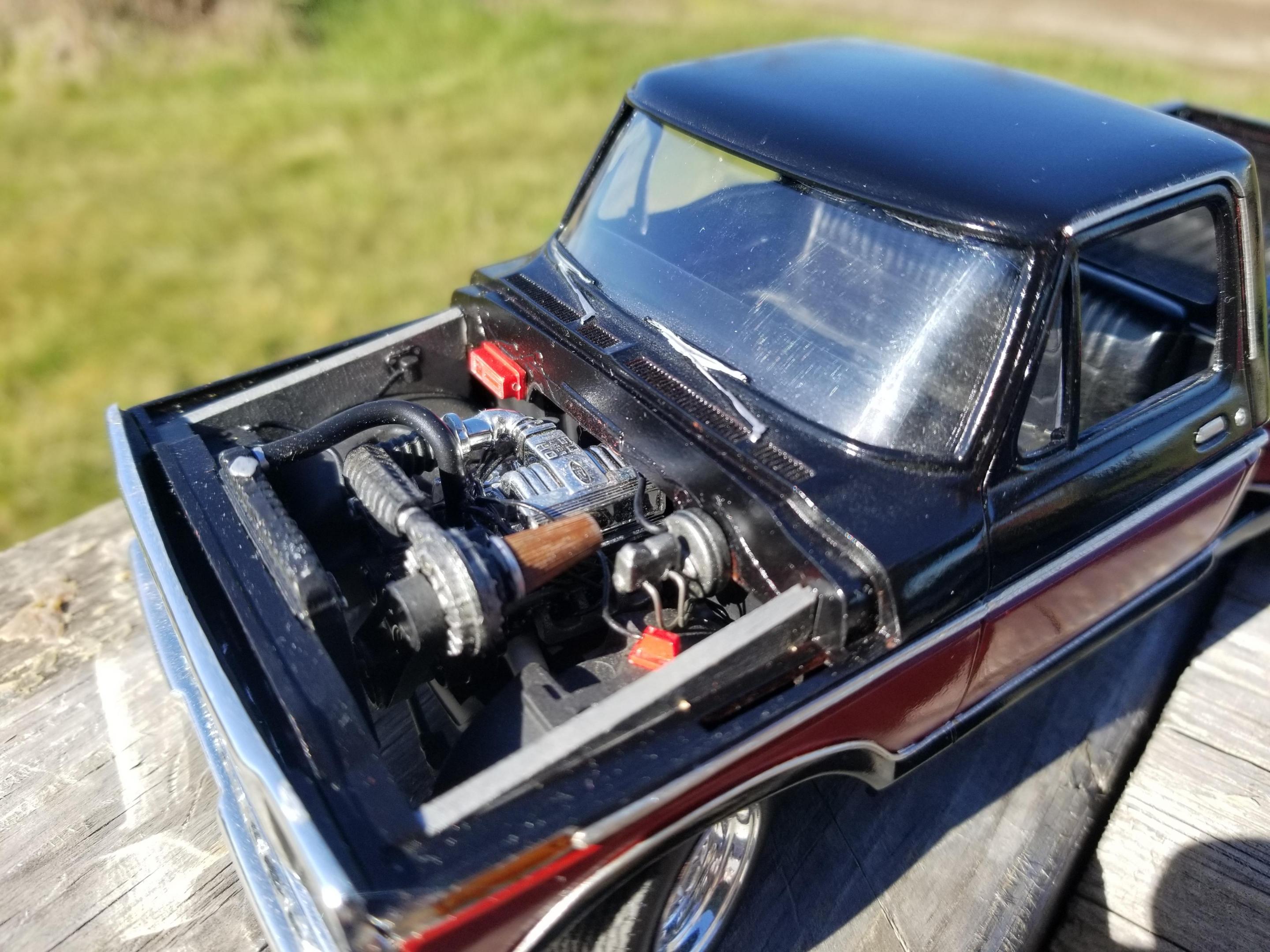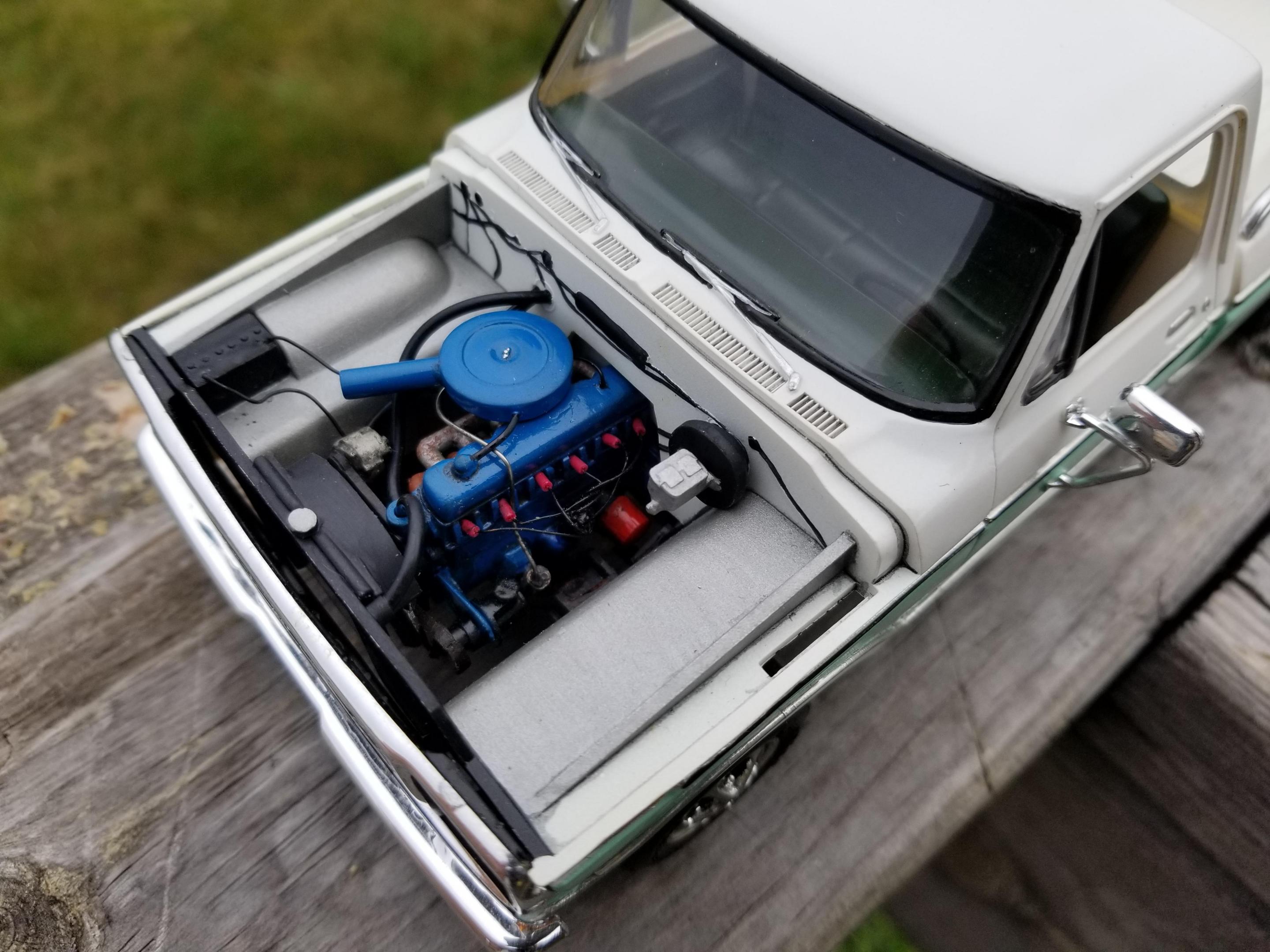 This is a replica of my dad's old truck. I changed the camper special wheelbase to get a regular 8 ft bed. Converted to round headlights and 77-up gas door. The hubcaps are Moebius, but the 300 six isnt. The block, head, intake, exhaust, and valve cover are scratchbuilt. Everything else is parts box items modified. The trans is from the revell 32 Ford kit.
