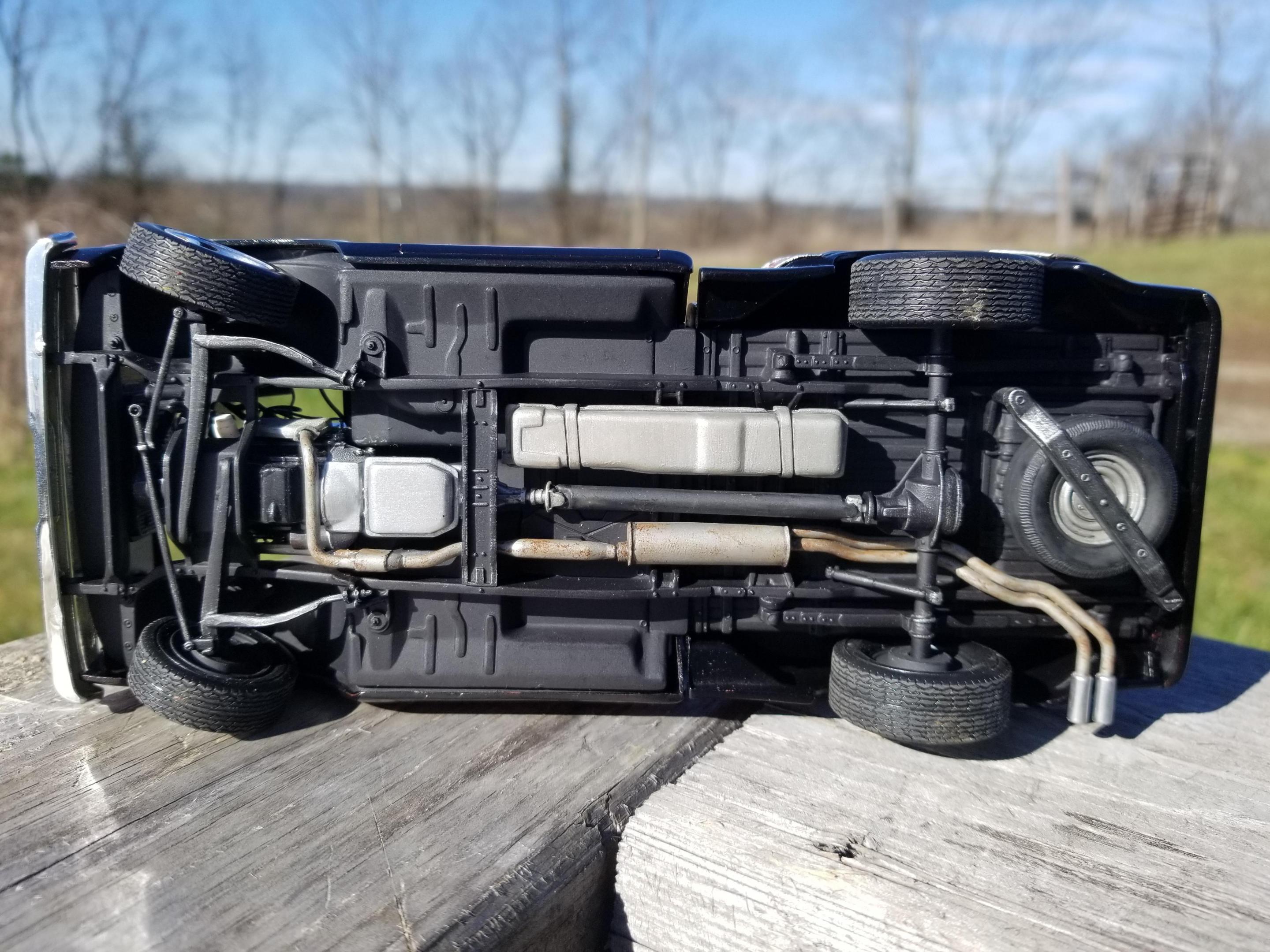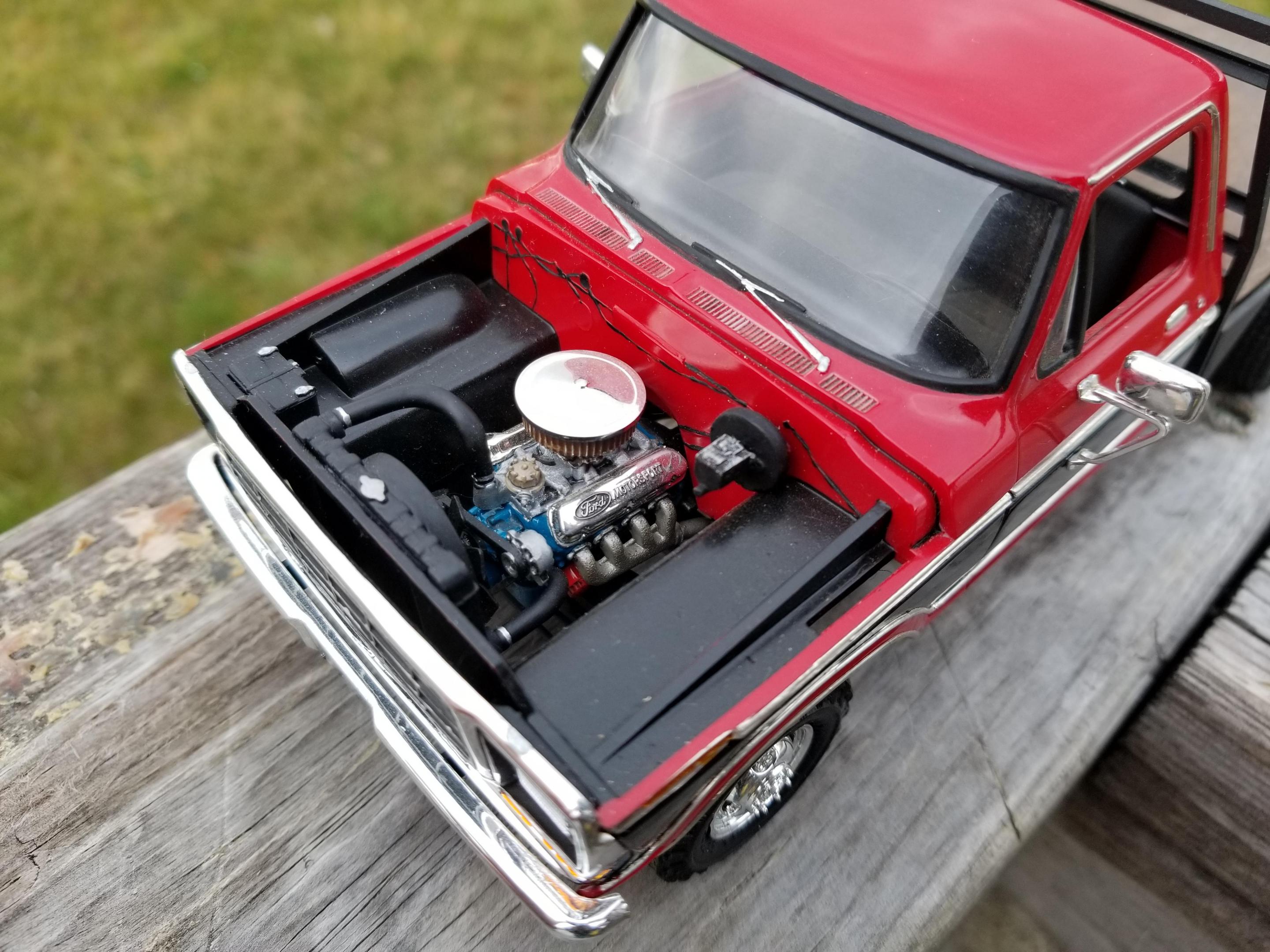 I built this from the Firestone Ford kit when I first got back into building about 5 years ago. I shortened and molded in the bed, making a closed-cab Bronco of sorts. A coworker gave me a box of trashed built-ups a few years ago. There were several monogram high rollers in there, so I used a set of wheels from one. The engine is a 390/4spd from the Amt 66 Fairlane, that I built around 01/02, and got broken during a move. The bumpers and D rings are all scratch built.