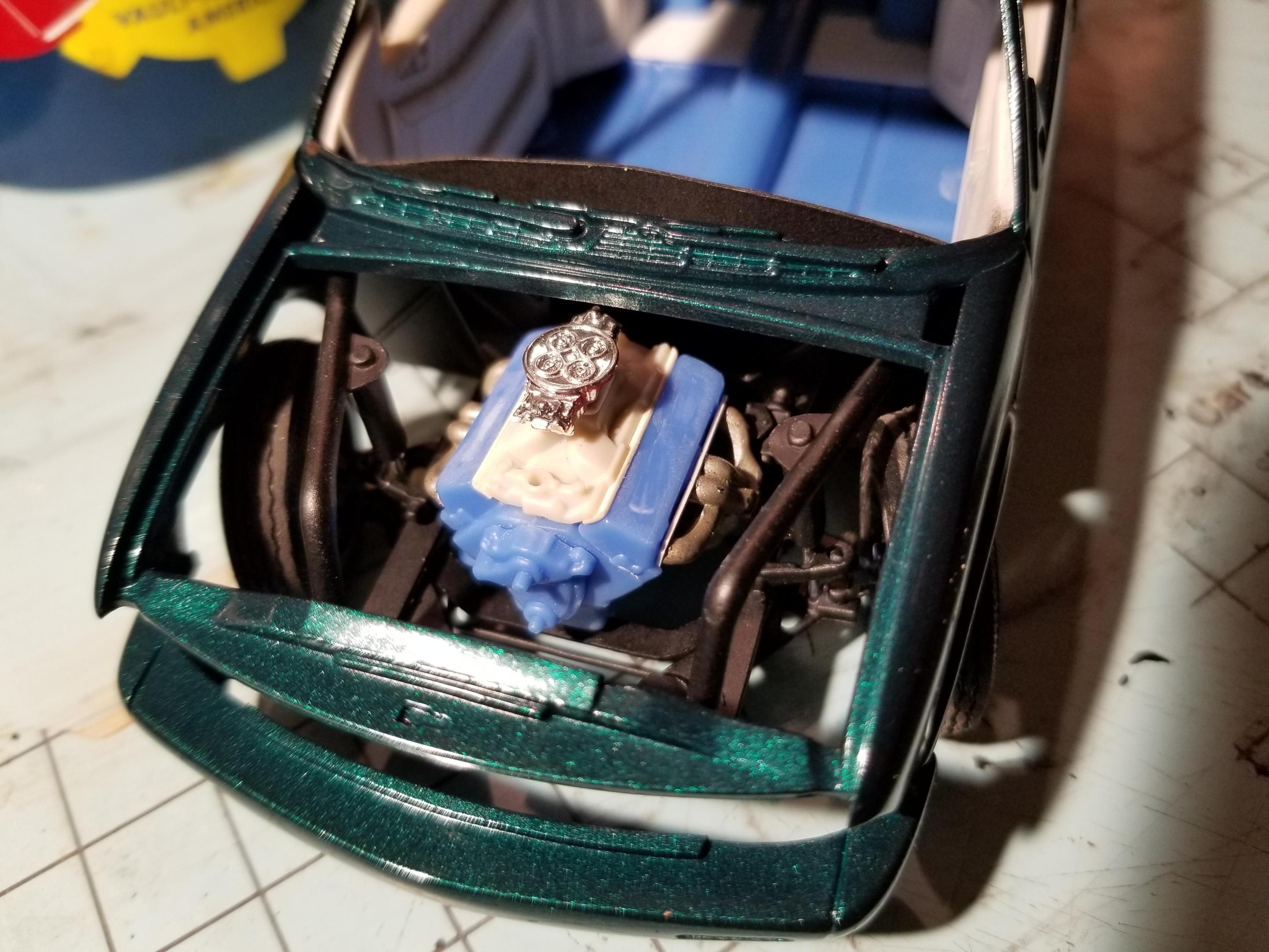 Pro Street BlazerRbray47 replied to Rbray47's topic in WIP: Model Trucks: Pickups, Vans, SUVs, Light Commercial Back at this one (after it sat about a year and a half) Now it's green. Hopefully I can clear it tomorrow while I'm still off work. Also did some engine fitting. I went ahead and used the engine from the Nova kit, modified to tuck under the hood and firewall.