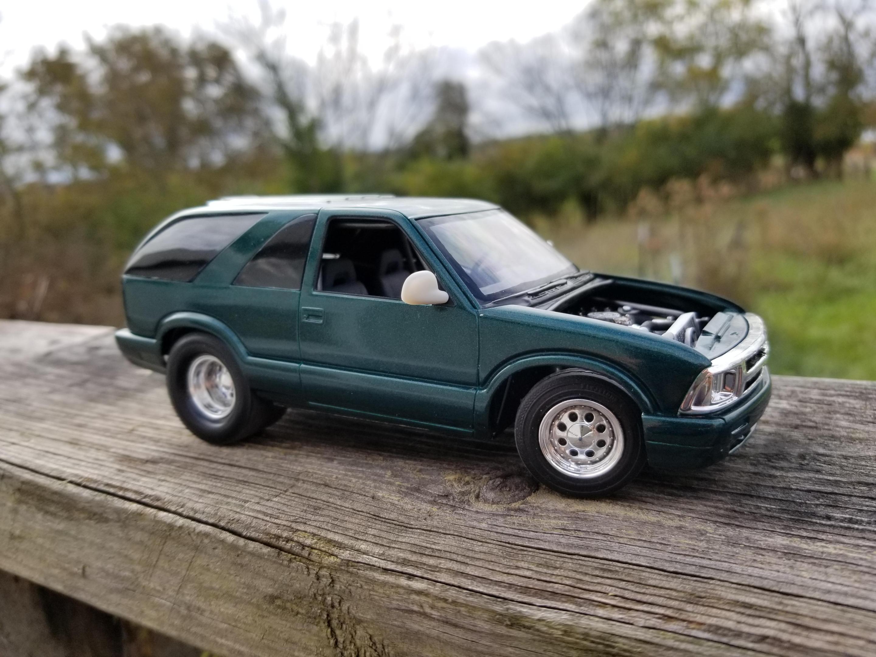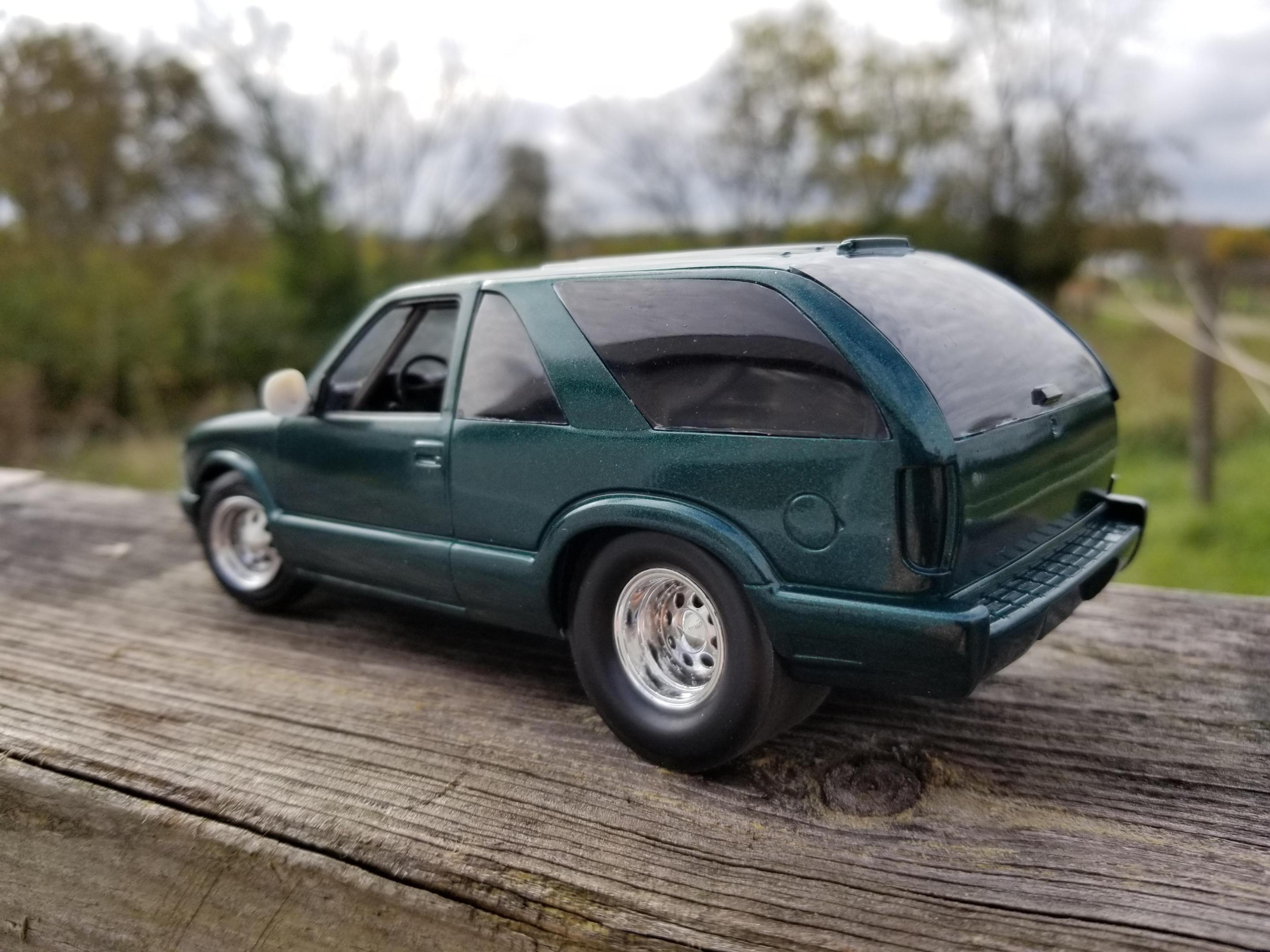 Pro Street BlazerRbray47 replied to Rbray47's topic in WIP: Model Trucks: Pickups, Vans, SUVs, Light Commercial Still plugging away at it. I think I made the exhaust a little too fat, but that's ok (I used sprue, so my options were limited) Also, I can't seem to remember where I put my Tamiya masking tape, so I tried to freehand the frosted areas of the windows (after a drink or two) Didn't turn out too well, so I blacked them out.