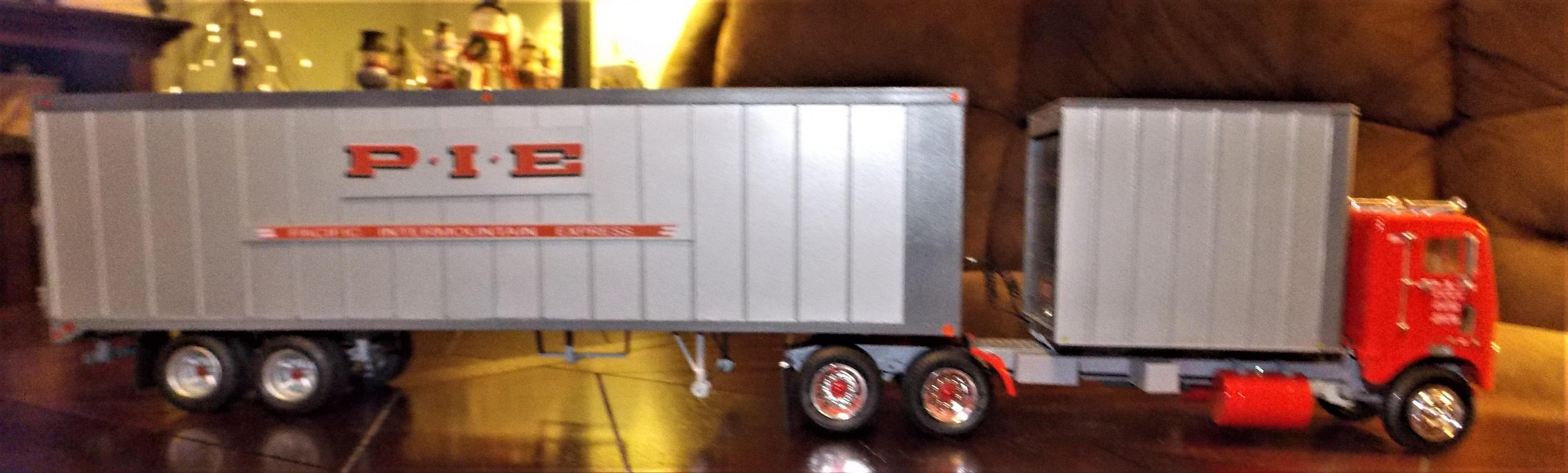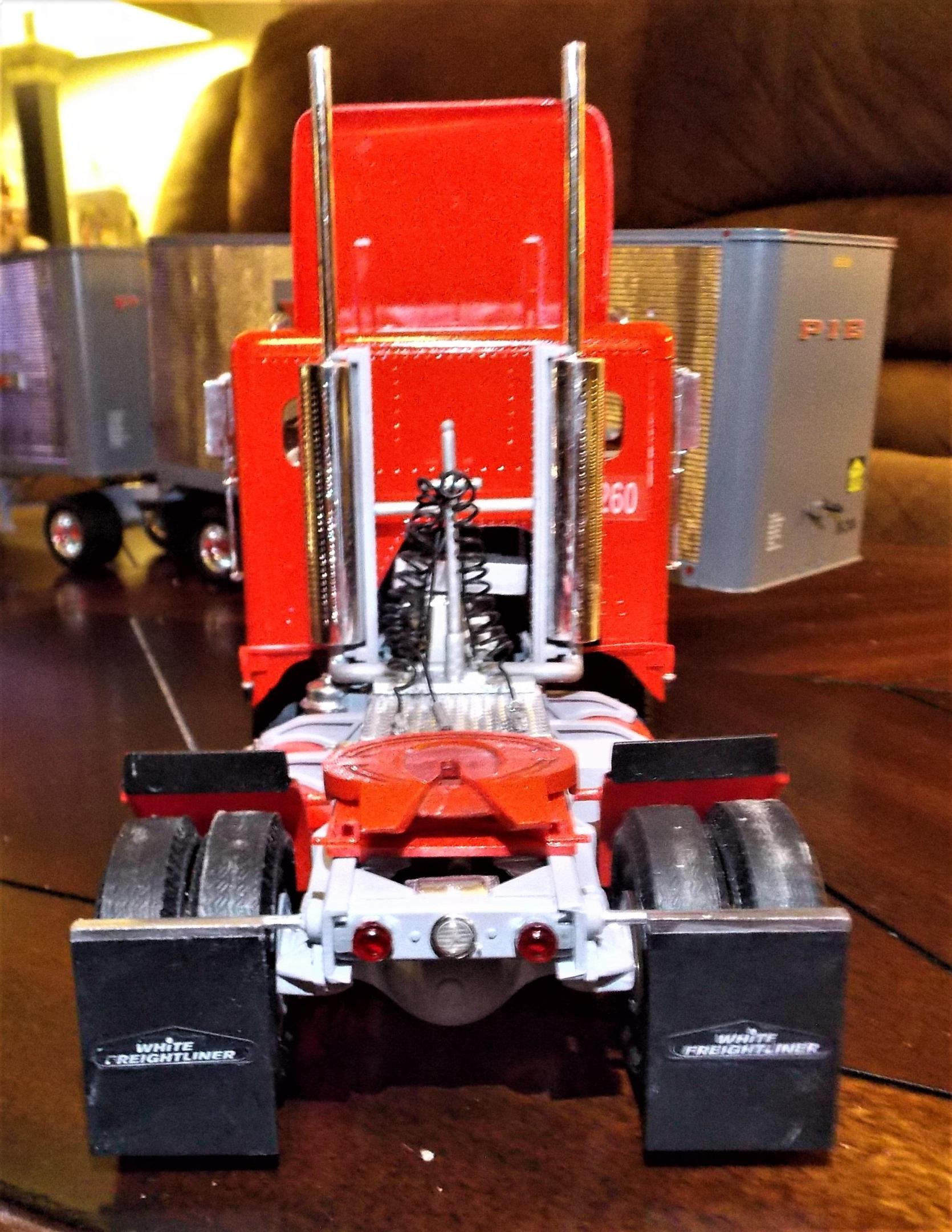 First post! Highlights Freightliner SD Daycab: Box stock with scratch-built air deflector, Single headlight conversion, air and electrical hook-ups added Peterbilt SD Daycab: cab and chassis shortened, scratch-built air deflector, Single headlight conversion, air and electrical hook-ups added Triple trailers - 2 trailers converted to corrugated sides, 1 trailer box stock, air and electrical hook-ups added. Nothing like waiting until the last second (2 years in a row) but I did enjoy it. Thanks Rog?