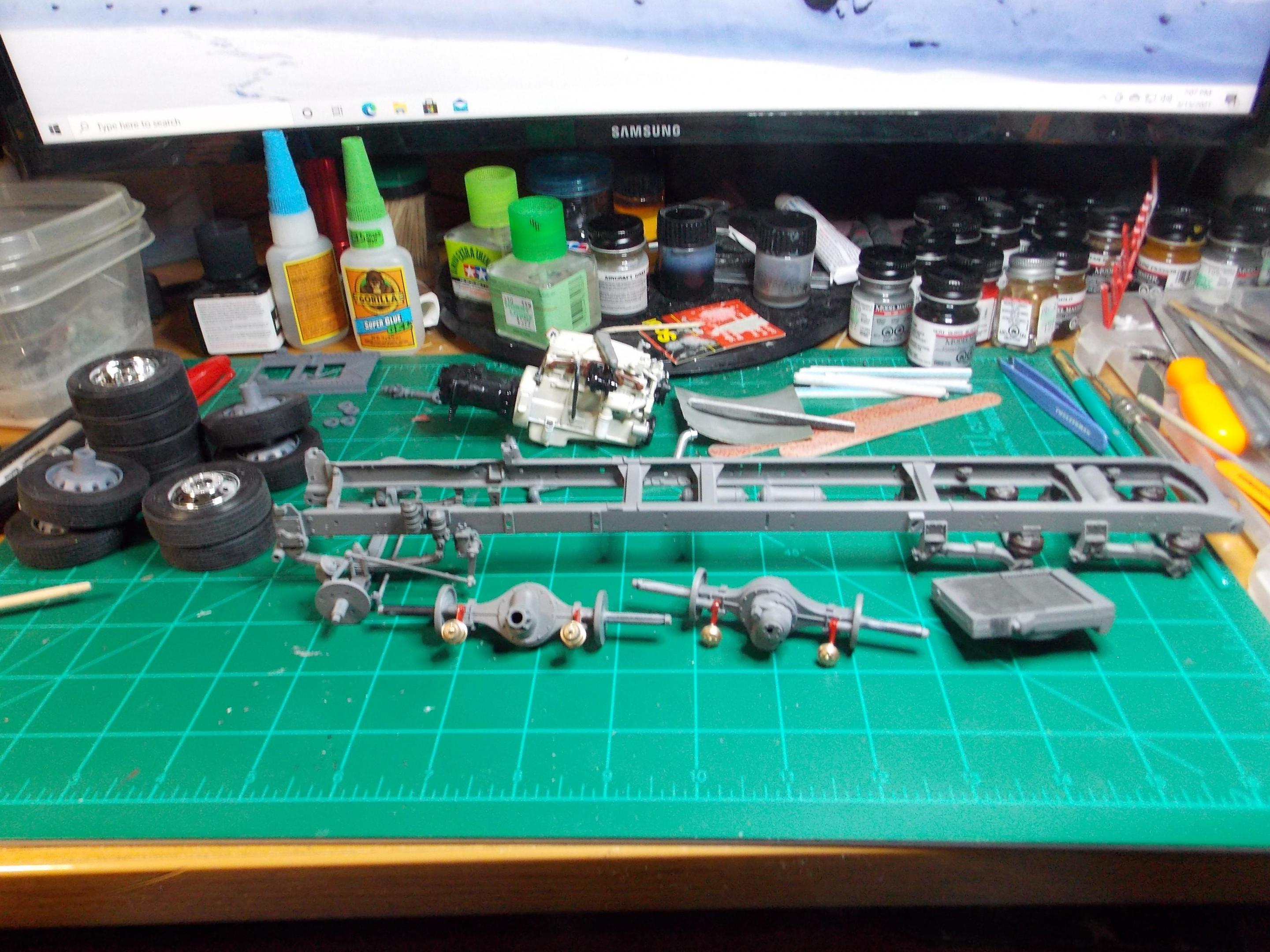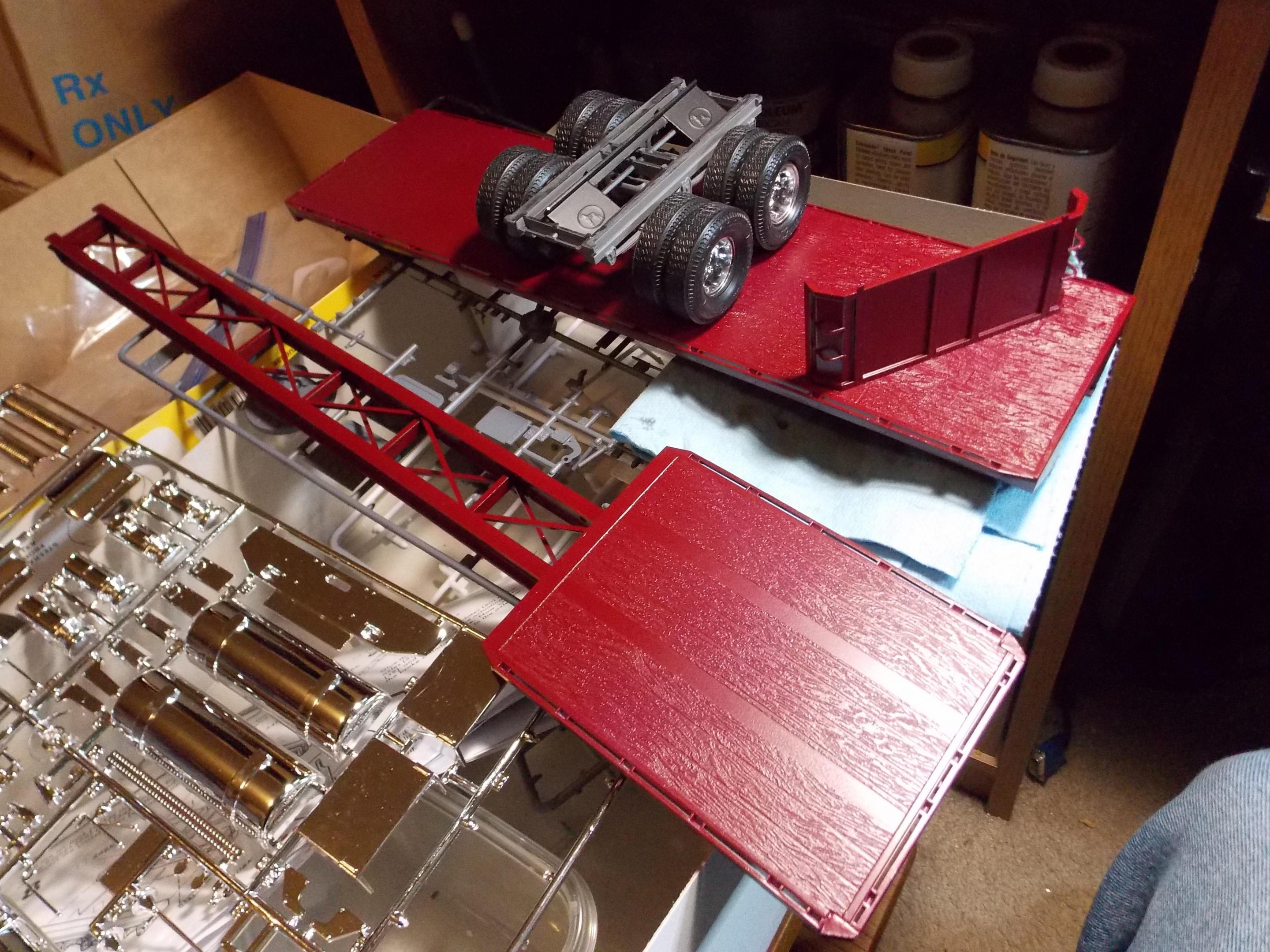 Update: A couple of fairly warm and dry days has really helped. I have the frame, suspension pieces and interior parts in primer and color. I didn't realize until today that the gray paint I bought was matte, will probably hit them with some satin or semi-gloss clear. I have the major cab pieces in primer, just need to work the seams a little. I ran out of primer so painting is done until I can stock up. I also got started with clean-up and sub assemblies on the trailer. I need to get some items ordered paint, parts, decals etc. That's all for now. Thanks Rog?