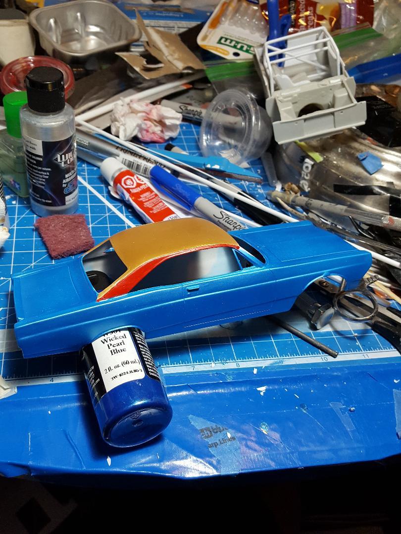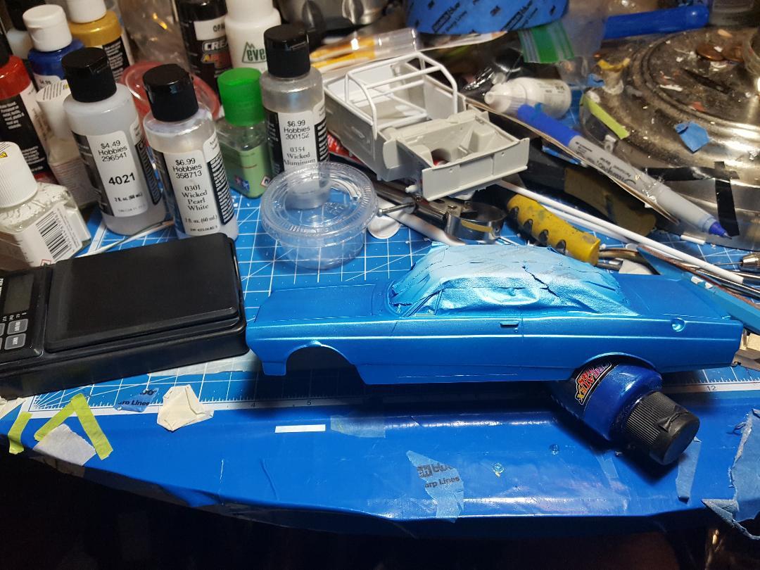 Thanks, David. I finally got the blue parts of the body painted yesterday afternoon. I mixed 1-gram Createx wicked pearl blue with 1-gram wicked aluminum to get some sparkles in it and 24 grams of wicked pearl white. It takes a lot of white to lighten the shade of that blue but I think I got it pretty close. I saved some of the mixed paint for touch ups. I will shoot the whole body with Tamiya clear and polish it if need be and then after the decals I will future over the decals to make them peel proof with age.