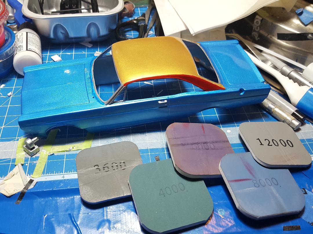 Got the upper surfaces polished. Pretty happy with it. You can see the reflection of the desk lamp in the hood and the trunk. The gold is a hint better looking too and the decals should adhere better as well. I painted a bunch of black stuff with a spray can I found in the garage. I believe it got the job done. I still need to polish the sides of the model. I'm using polishing pads dry because they tend to come apart when you wet them. I start with 3200 grit and work my way up to 12000.