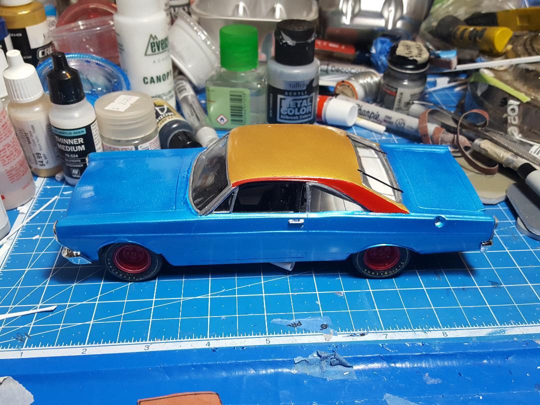 She's sitting on 4 wheels and tires, and the grille/front bumper and rear bumper are installed. All that is left is the exhaust, hood and trunk pins, headlight and park light covers windshield reinforcement brackets and rear bumper flairs to keep the rear bumper from turning into a parachute. I may not do the flairs if they have a chance of ruining the paint on the rear fenders. The only other thing is the grille screen that this car had but I think it will diminish the look of the whole model. The grille is a very good-looking grille. I blacked it out for more realism. Hate a real toyish chromey looking grille. After all that stuff I can do a final check of the body for cleanliness and apply the decals and then what use to be called future to seal my own decals that have a tendency to peel off with age if not sealed. Can't wait to get her done. Started on it July 30th, so that's about 3 and a half months.