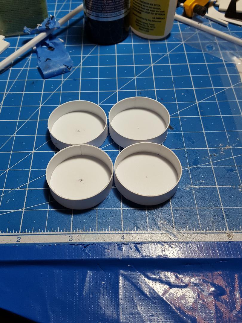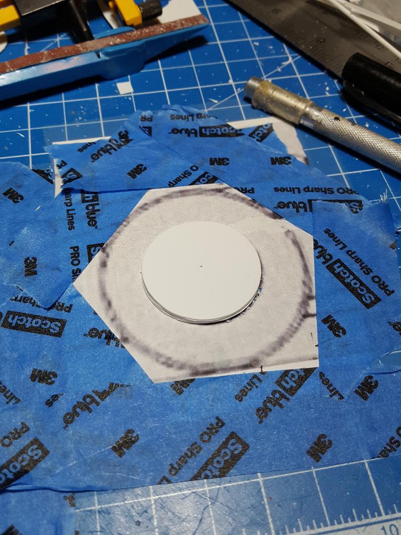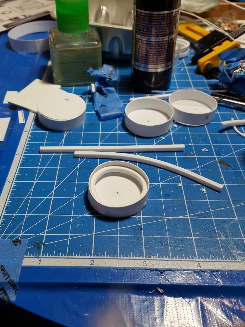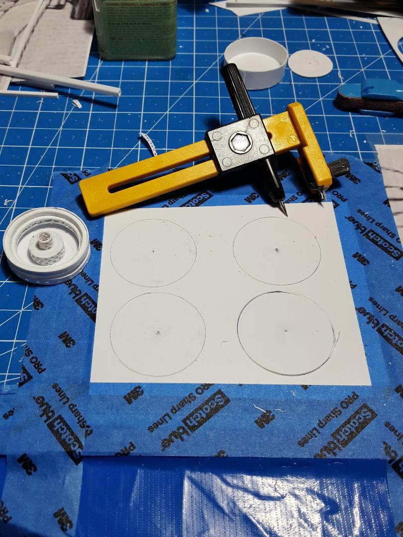 Well, I bought like 3 different bottles of CA glue and a can of accelerant if I deem it necessary. I started completely over by cutting out 4 new discs to make wheels with. I did them differently this time taping the plastic down tight for the cutting compass to have a solid base for cutting. I now have 4 really round discs instead of the oblong ones I got when I started. Like I said I will not drill any holes this time but make really thin ridges for the spokes to land on and receive the ca glue. I'm hoping this process will work out better because the drilled holes were not going to work at all. I think I have better dimensions too for the places the spokes originate and end up so I'm hoping for better results this time. If not I will forget this idea and start on a kit model. The mess of a wheel in the images below was the failed attempt and you can see that it wasn't going to work at all. -