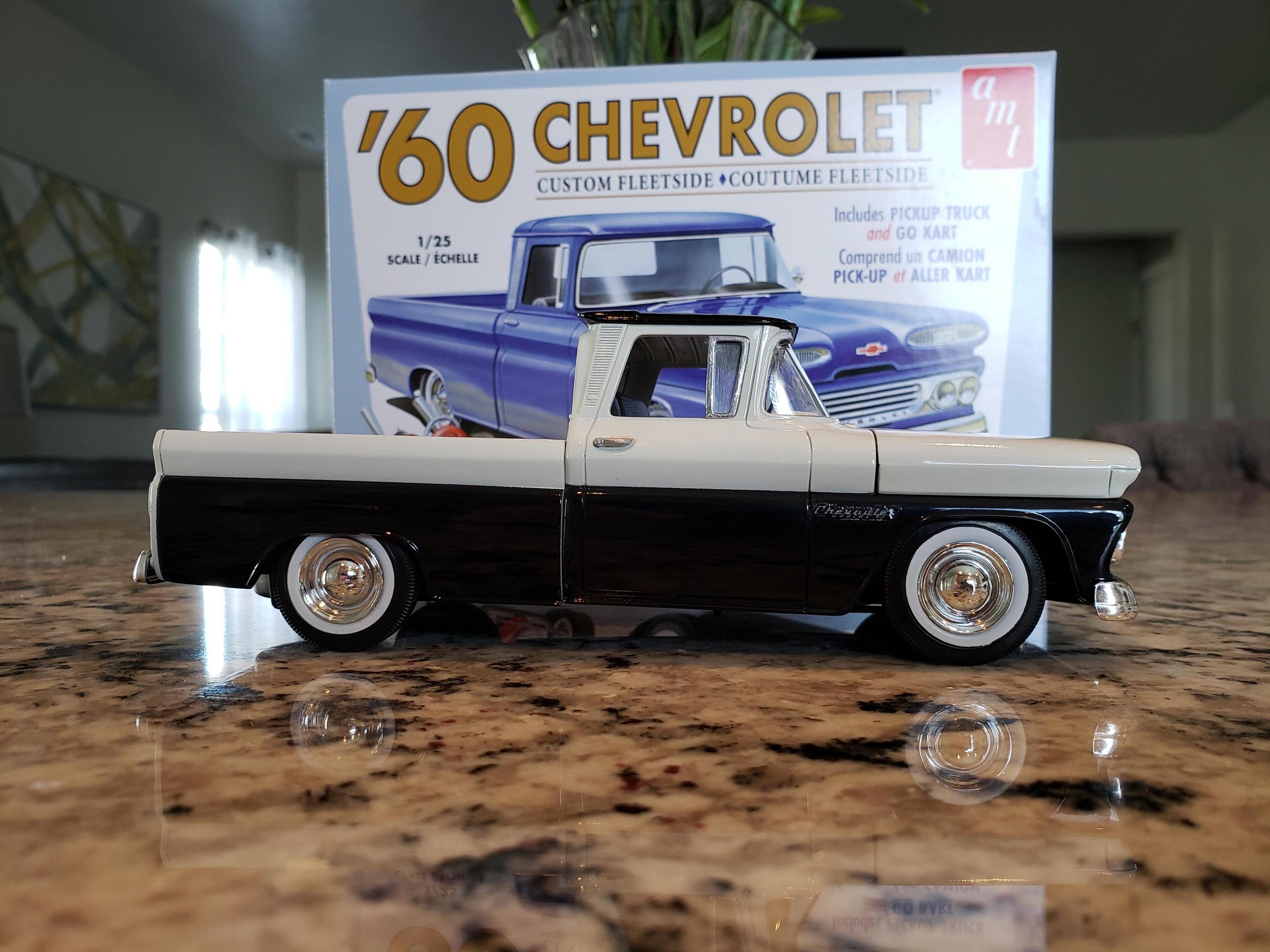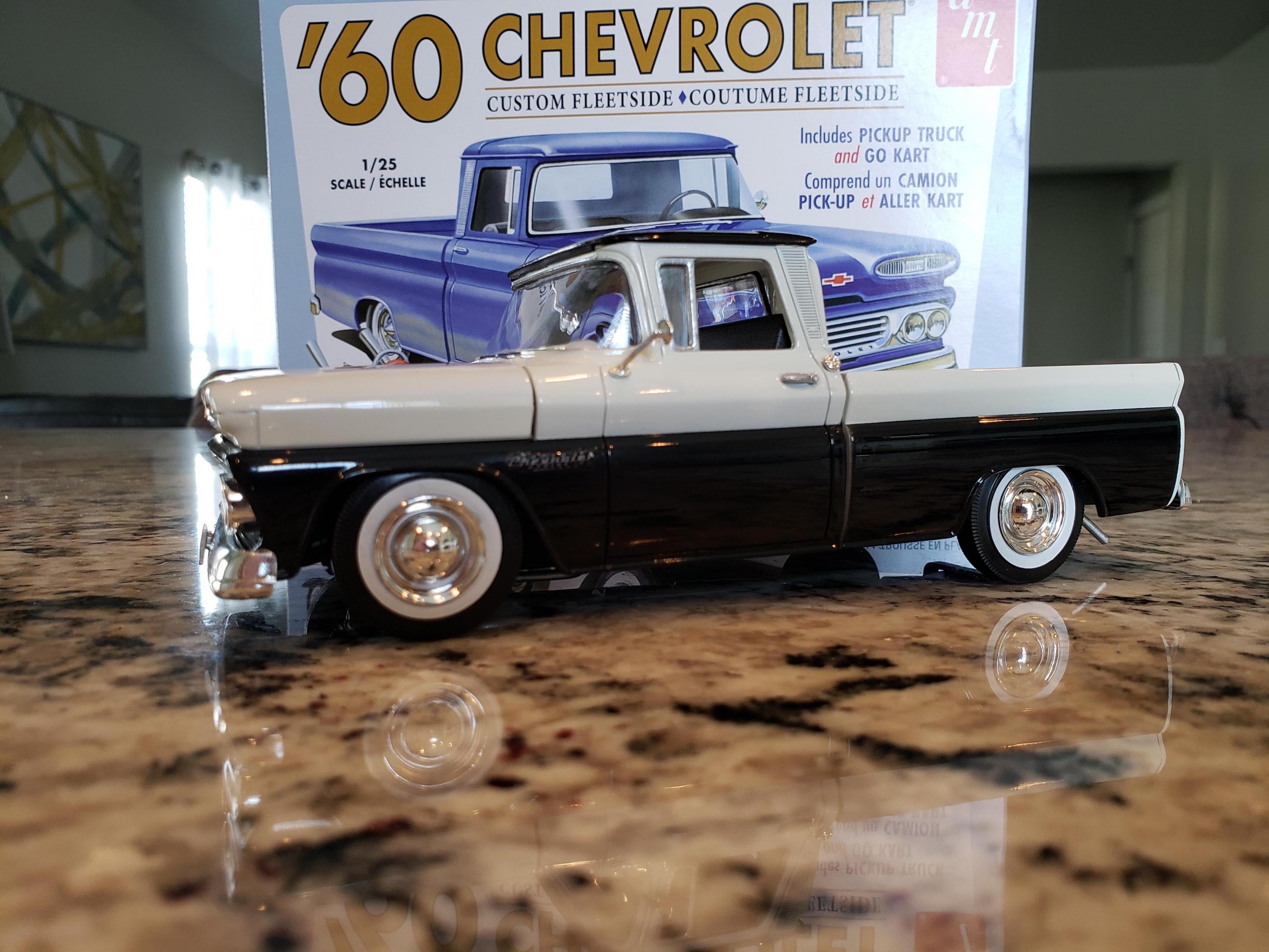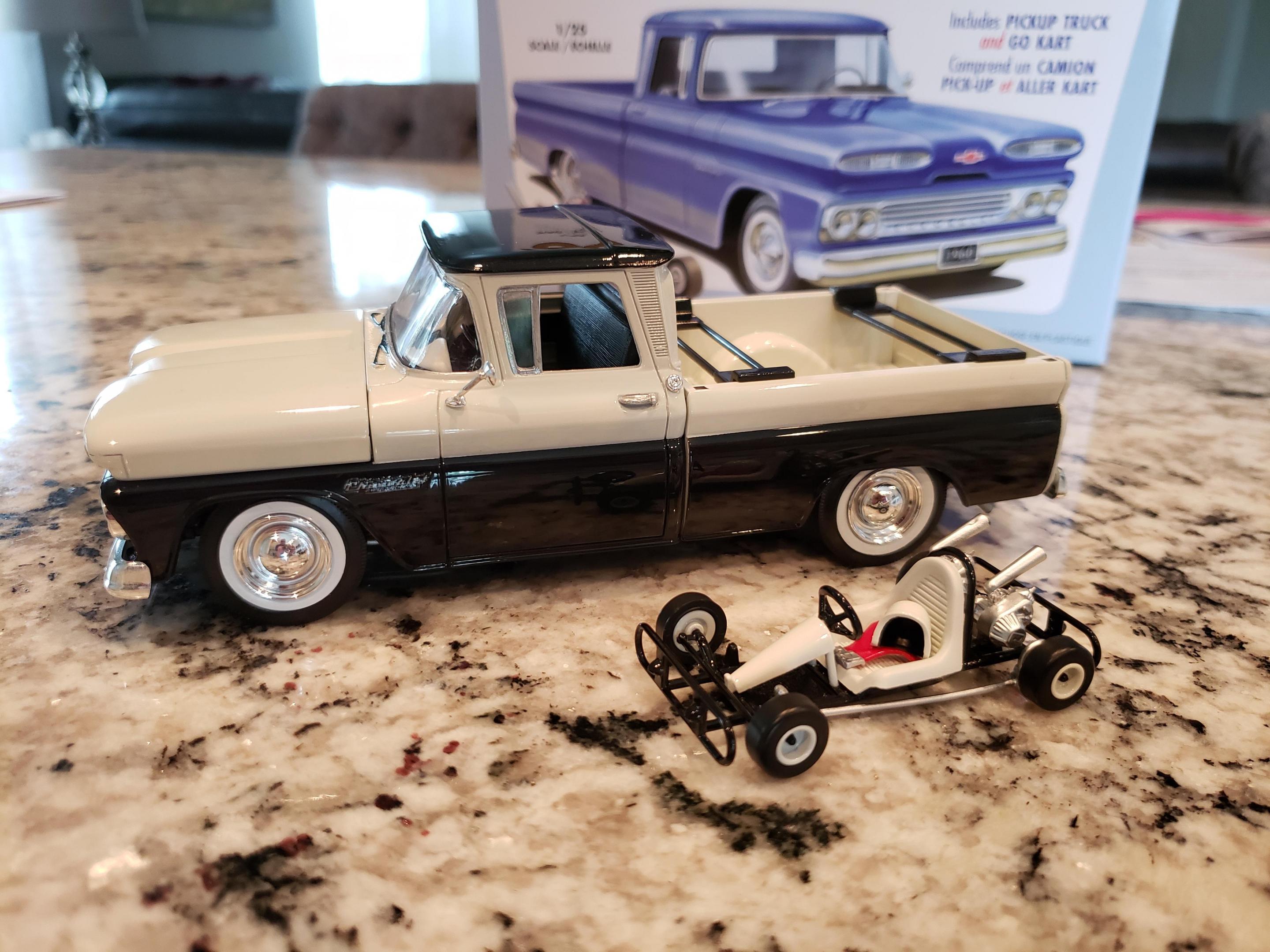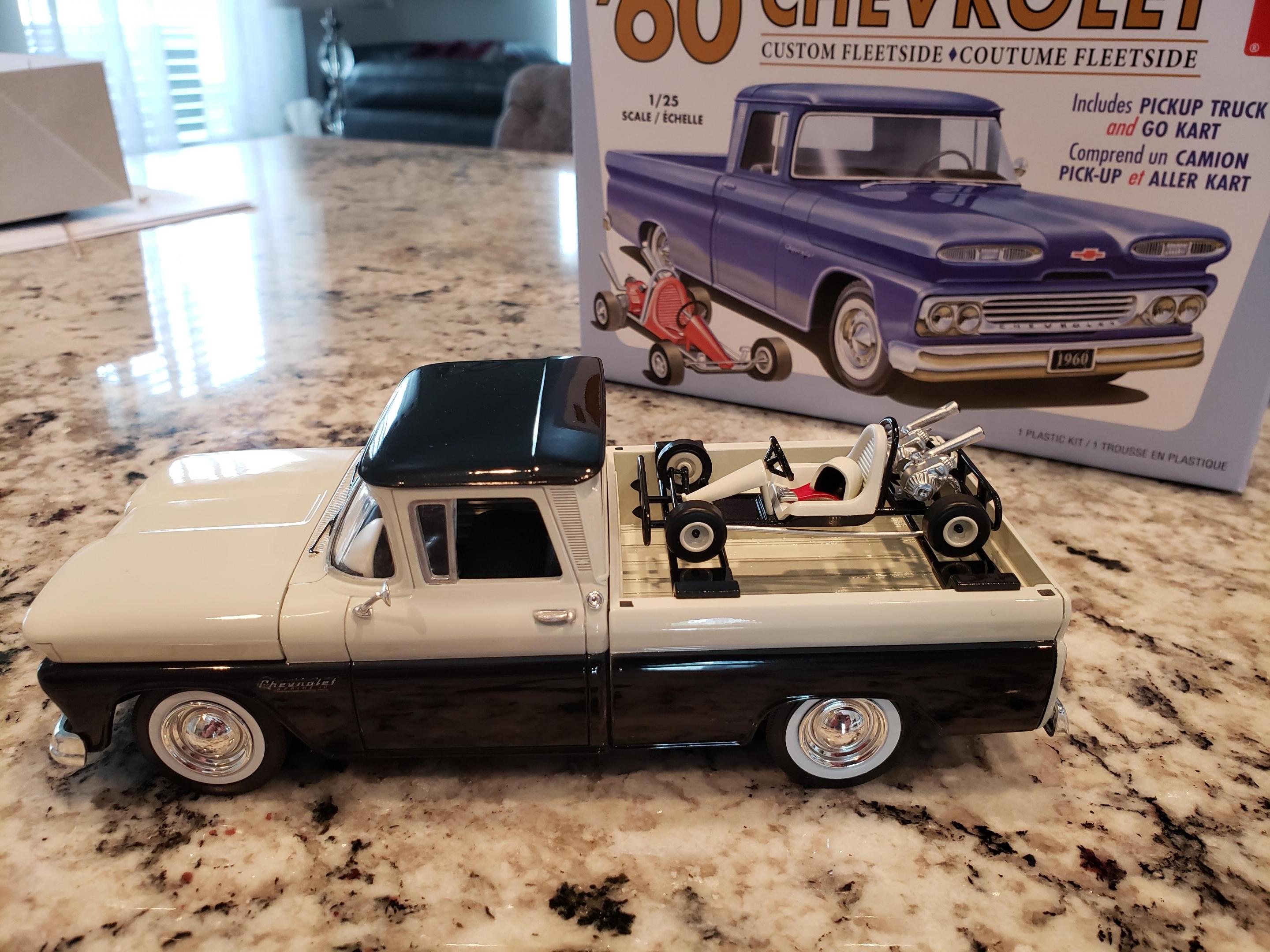 Greetings, Just finished this AMT 1960 Chevrolet Custom Fleetside kit. The kit is very nice and it builds easy. I decided to lower the truck slightly since it sat way to high. I replaced the wheels with different style and put white wall tires. I removed the chains in the rear that hold the tailgate for a little bit of a smoother look. I painted the truck and the go cart two tone using Splash Paint paints and their 2k clear. I was going to spend more time on detailing the engine and the bed but got burnt out and decided to finish it the way it is. Thank you for looking and please feel free to leave comments and suggestions.