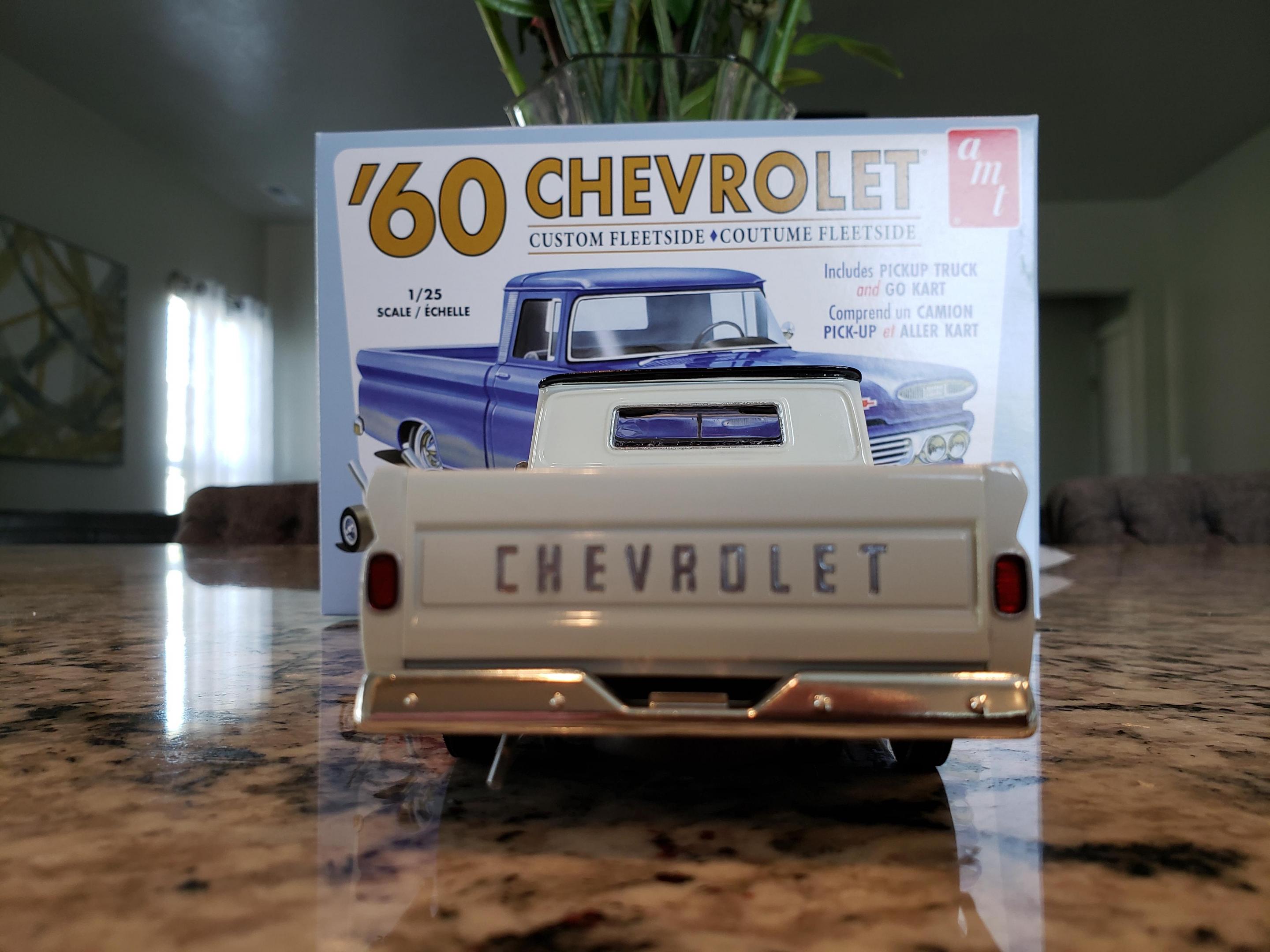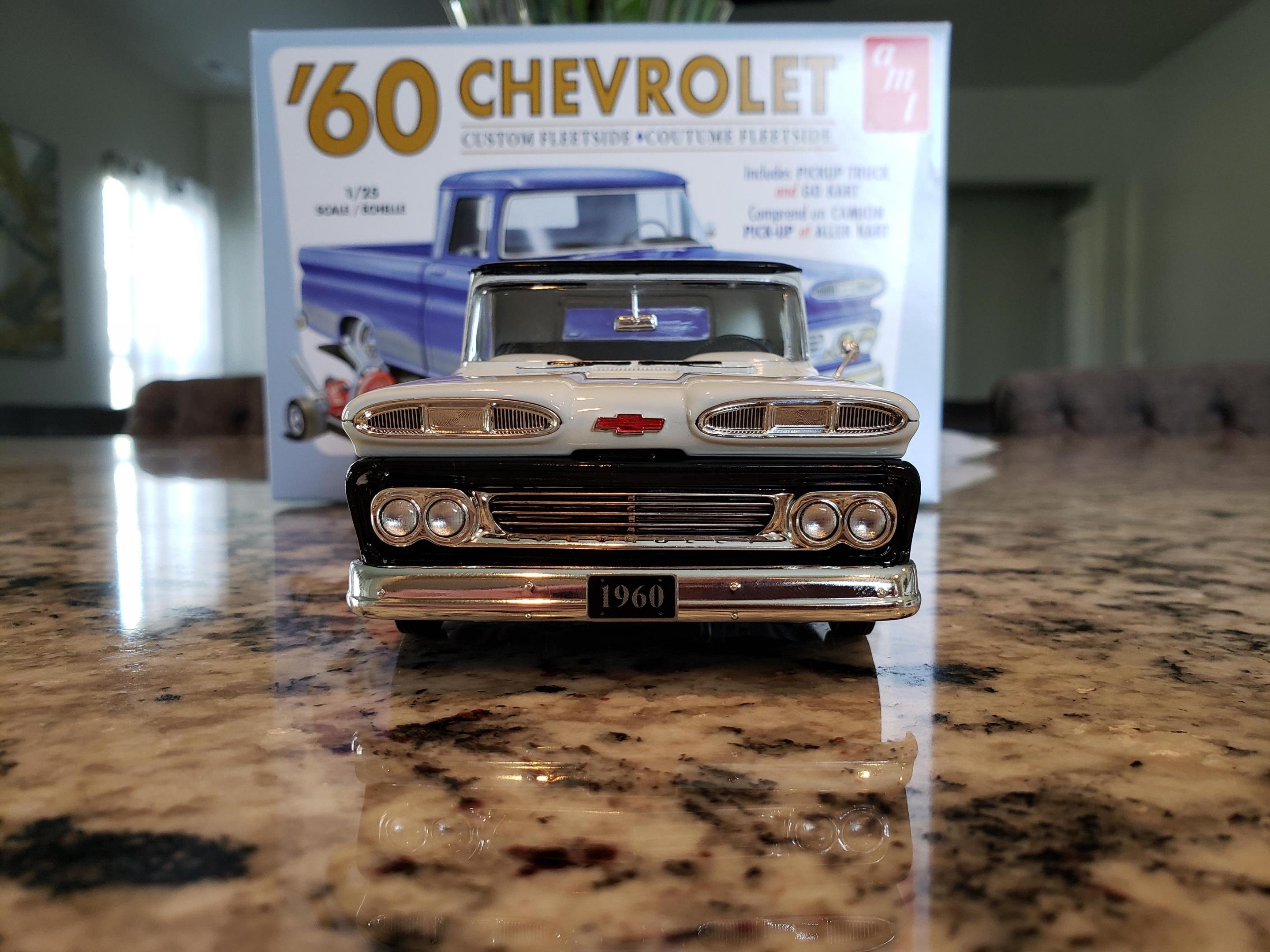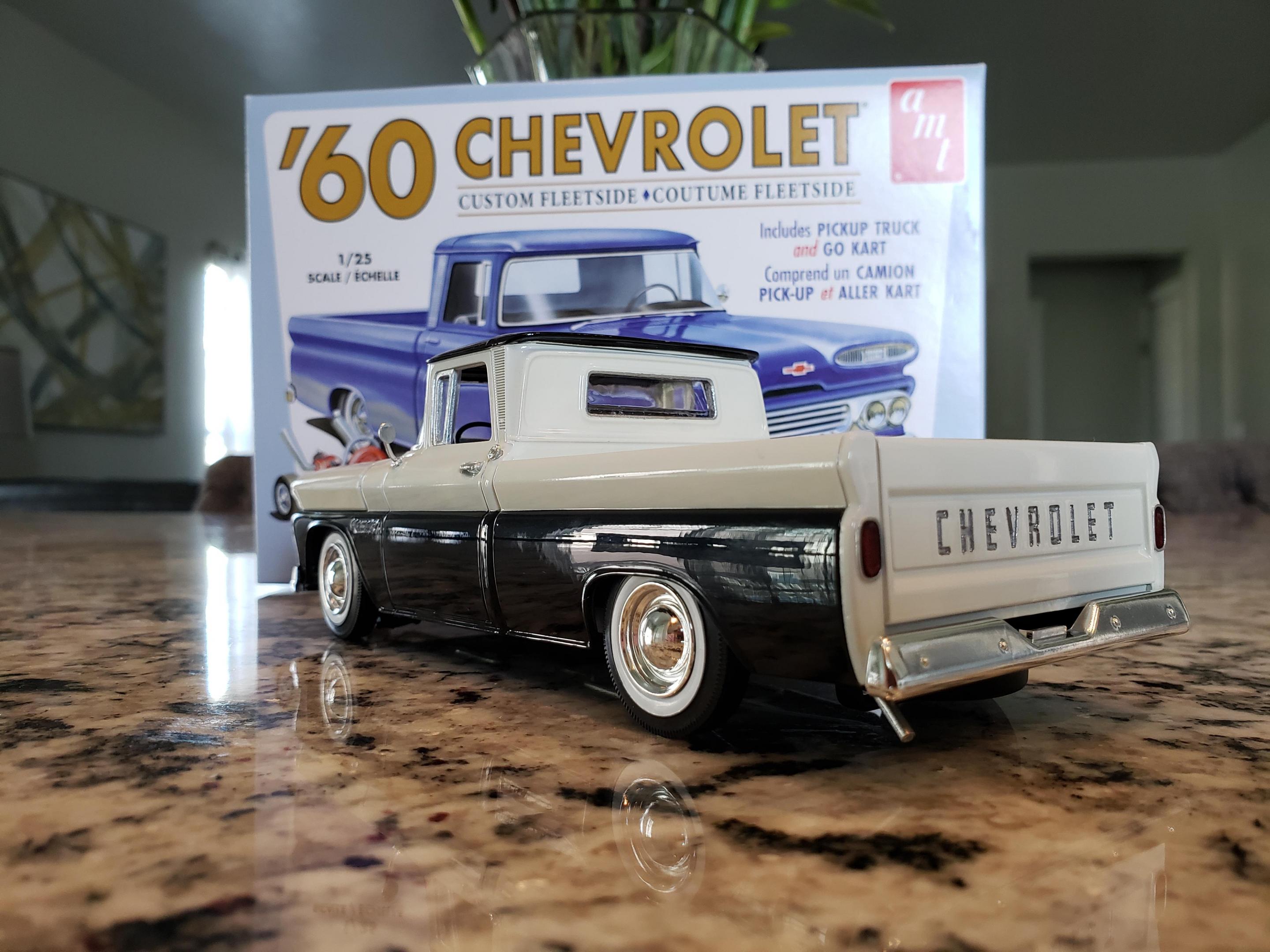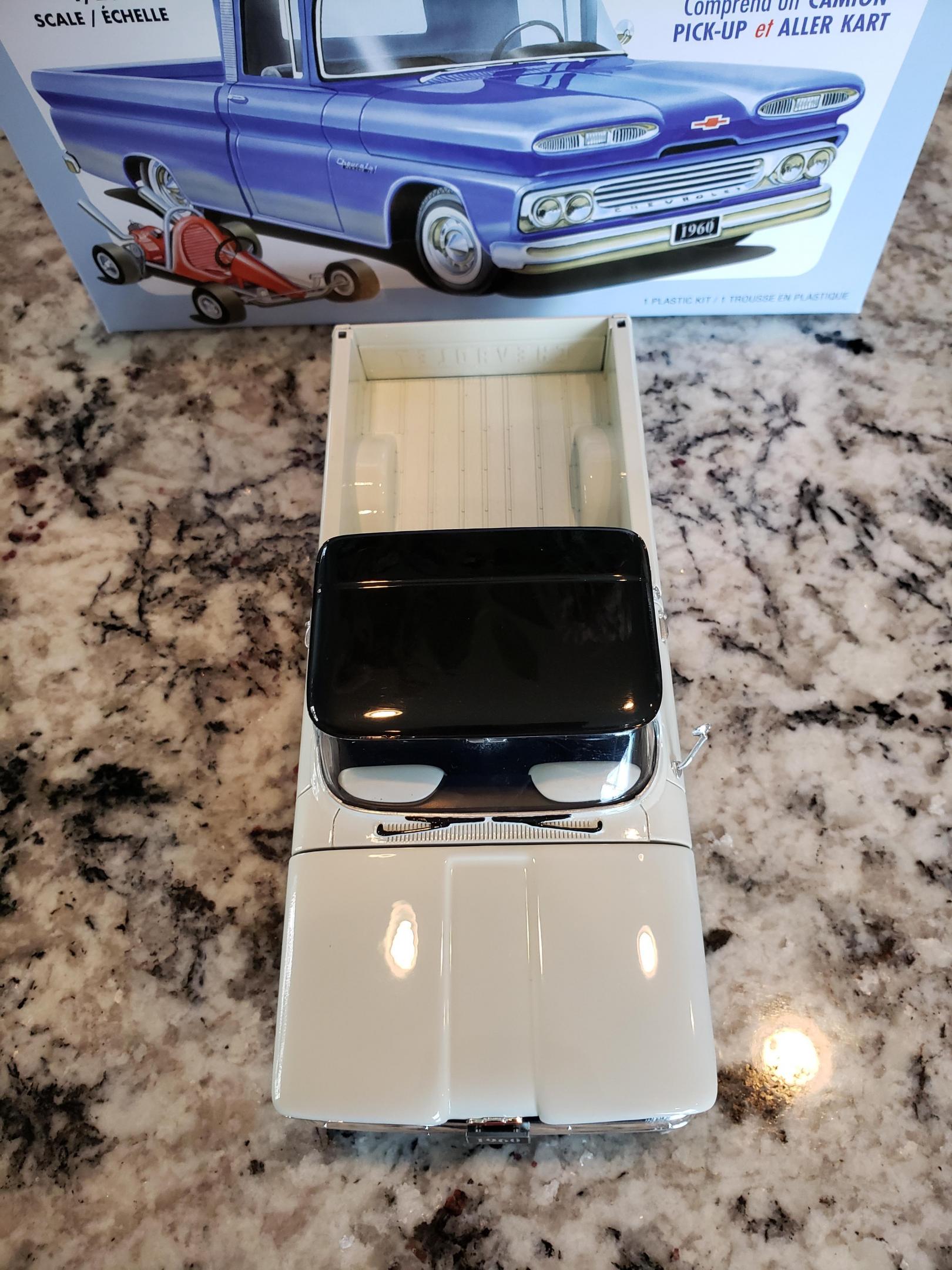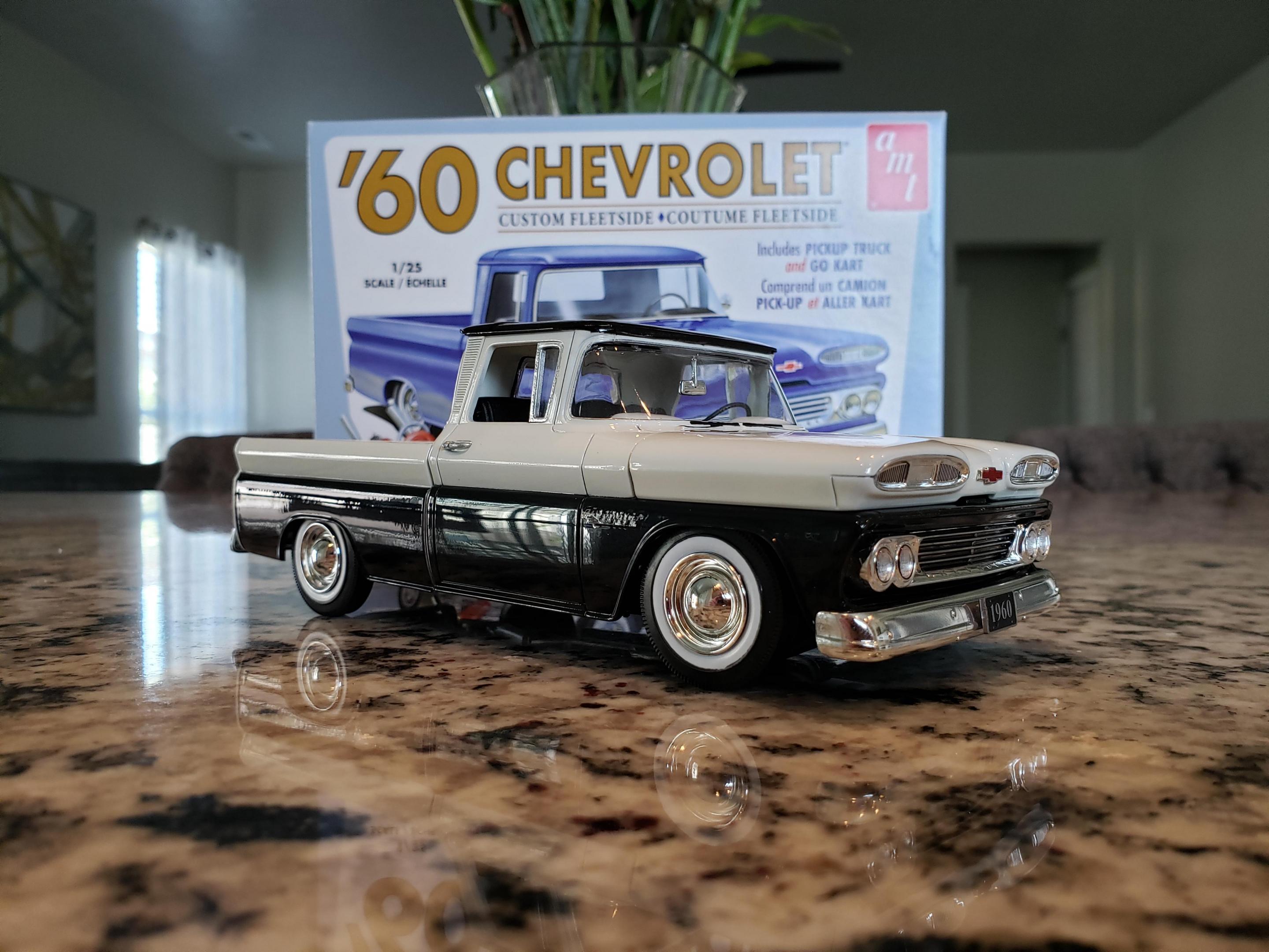 Greetings, Just finished this AMT 1960 Chevrolet Custom Fleetside kit. The kit is very nice and it builds easy. I decided to lower the truck slightly since it sat way to high. I replaced the wheels with different style and put white wall tires. I removed the chains in the rear that hold the tailgate for a little bit of a smoother look. I painted the truck and the go cart two tone using Splash Paint paints and their 2k clear. I was going to spend more time on detailing the engine and the bed but got burnt out and decided to finish it the way it is. Thank you for looking and please feel free to leave comments and suggestions.