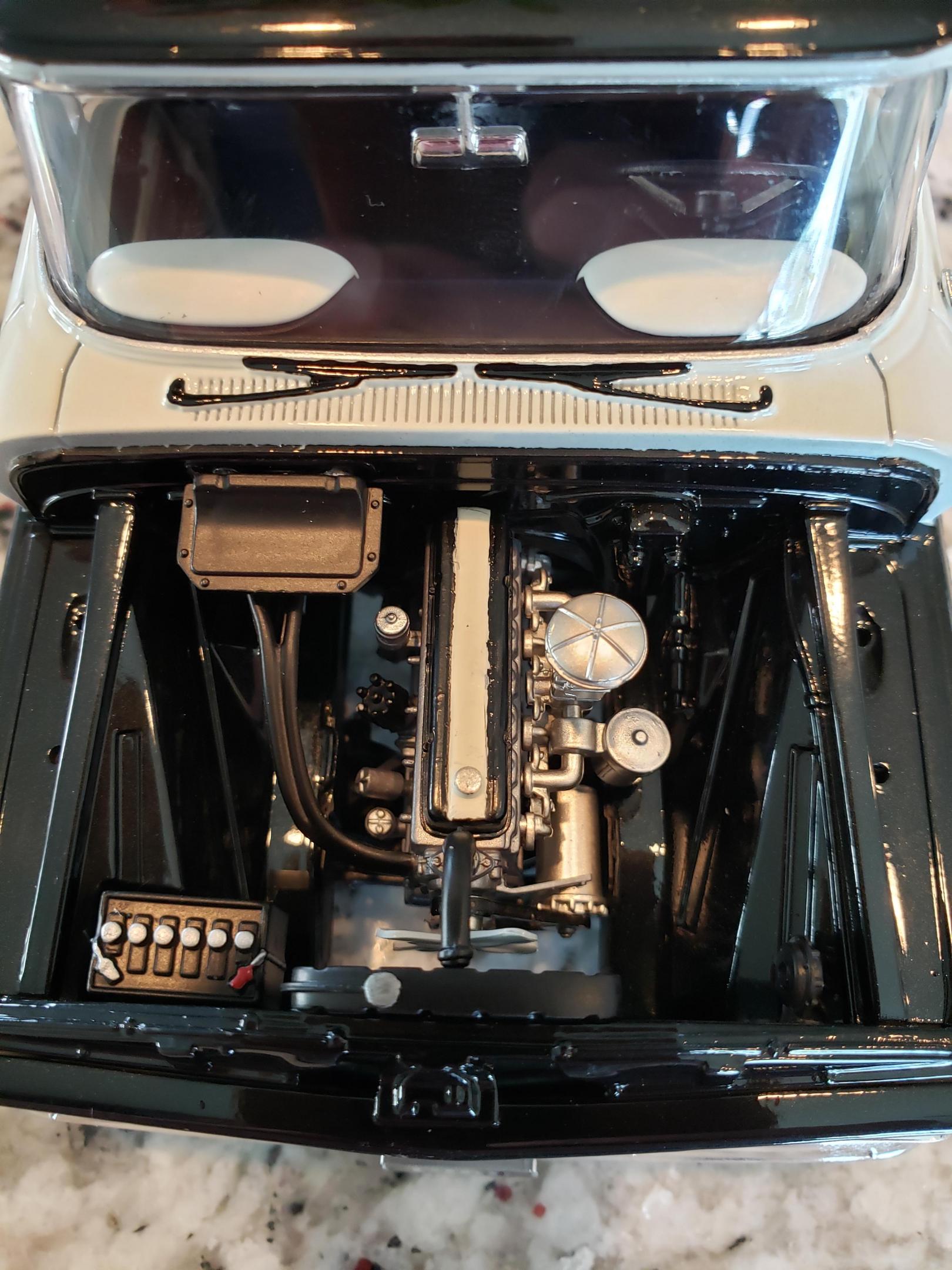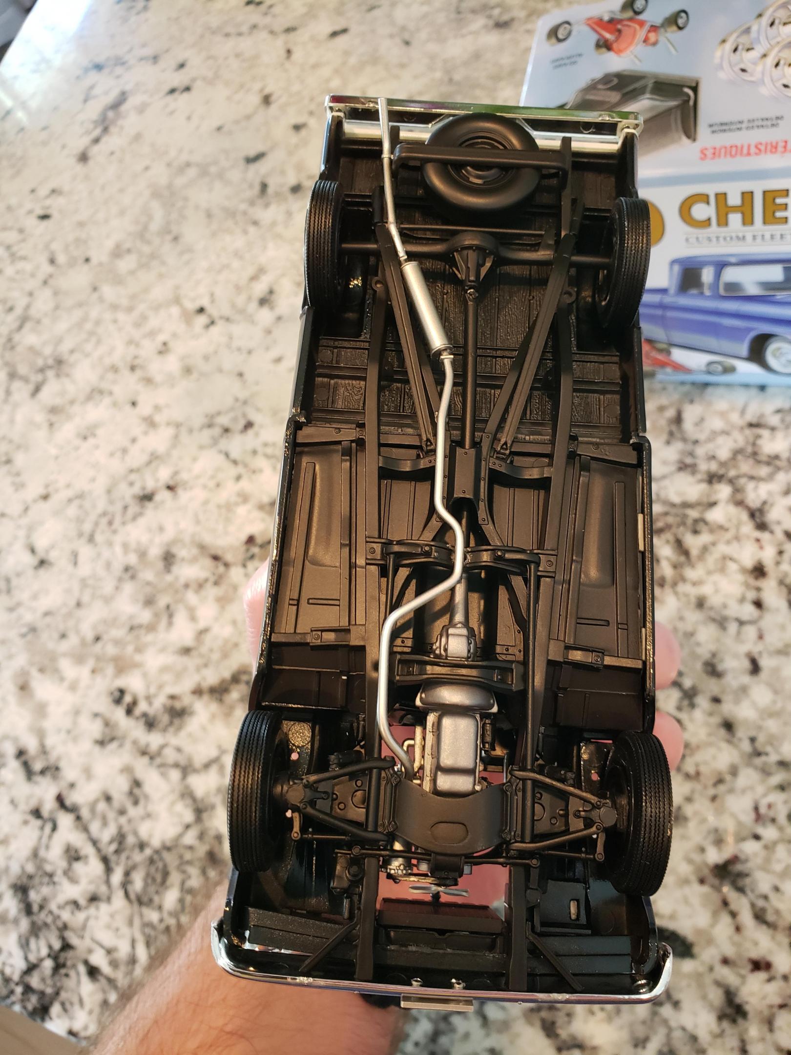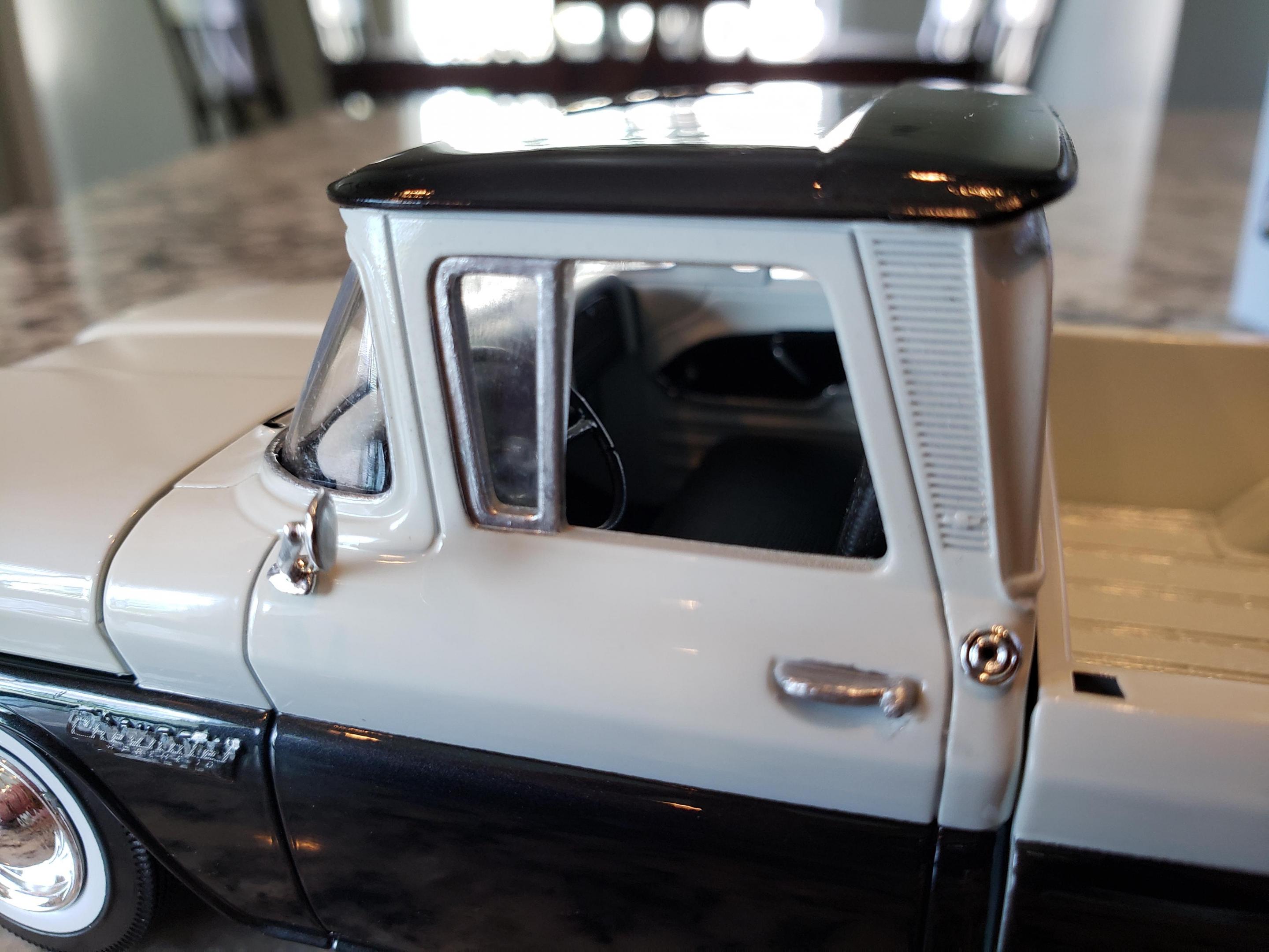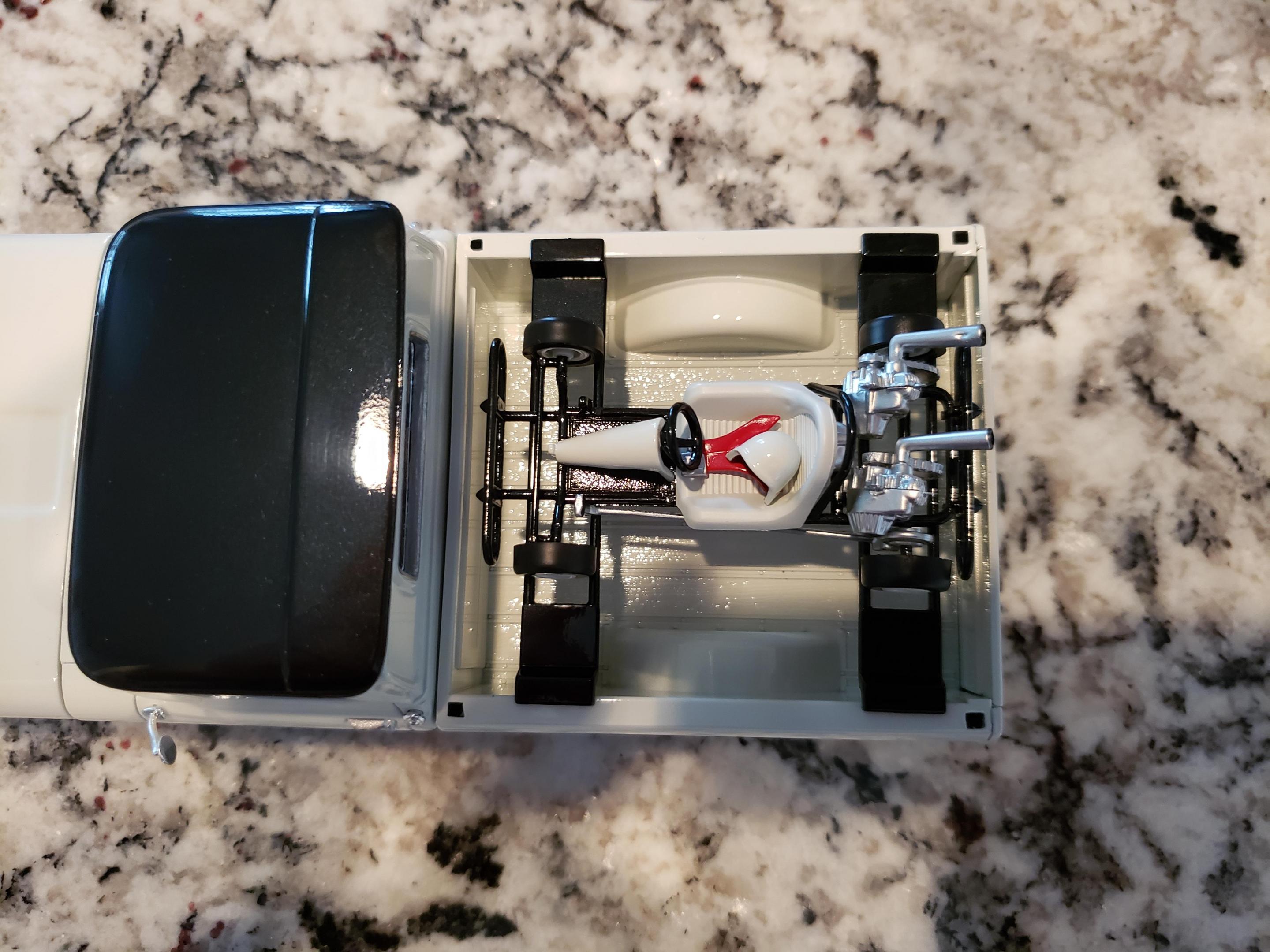 Greetings, Just finished this AMT 1960 Chevrolet Custom Fleetside kit. The kit is very nice and it builds easy. I decided to lower the truck slightly since it sat way to high. I replaced the wheels with different style and put white wall tires. I removed the chains in the rear that hold the tailgate for a little bit of a smoother look. I painted the truck and the go cart two tone using Splash Paint paints and their 2k clear. I was going to spend more time on detailing the engine and the bed but got burnt out and decided to finish it the way it is. Thank you for looking and please feel free to leave comments and suggestions.