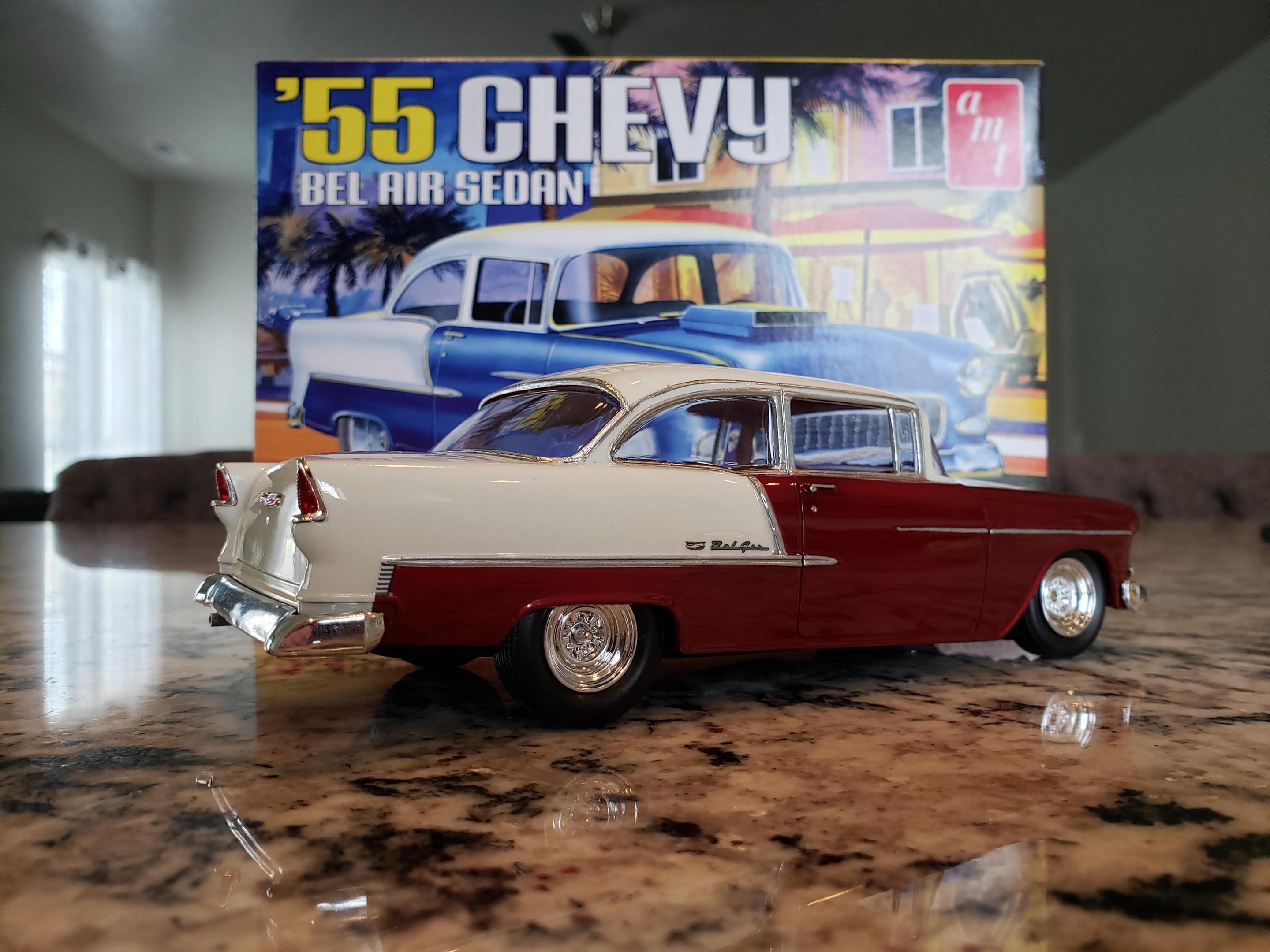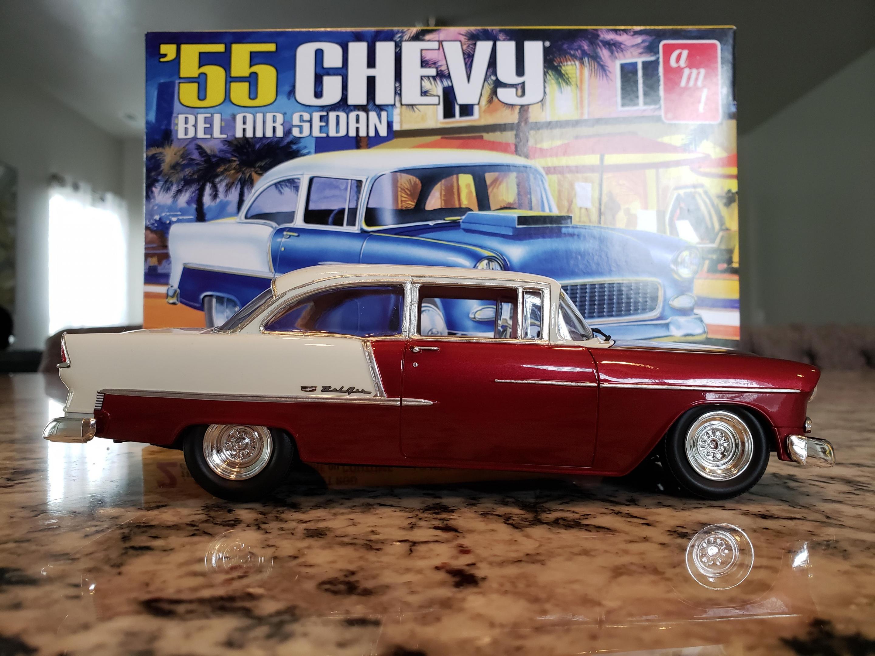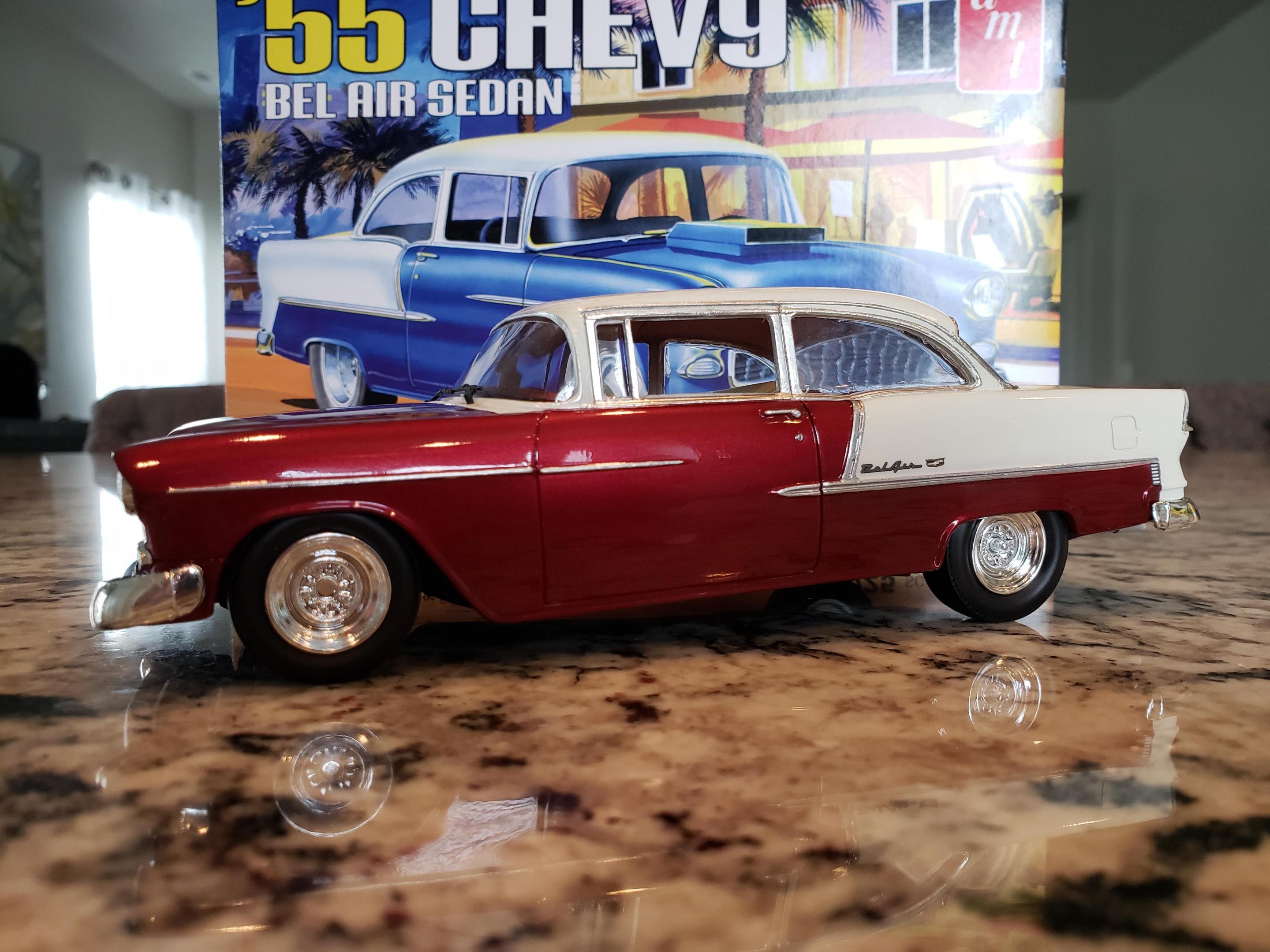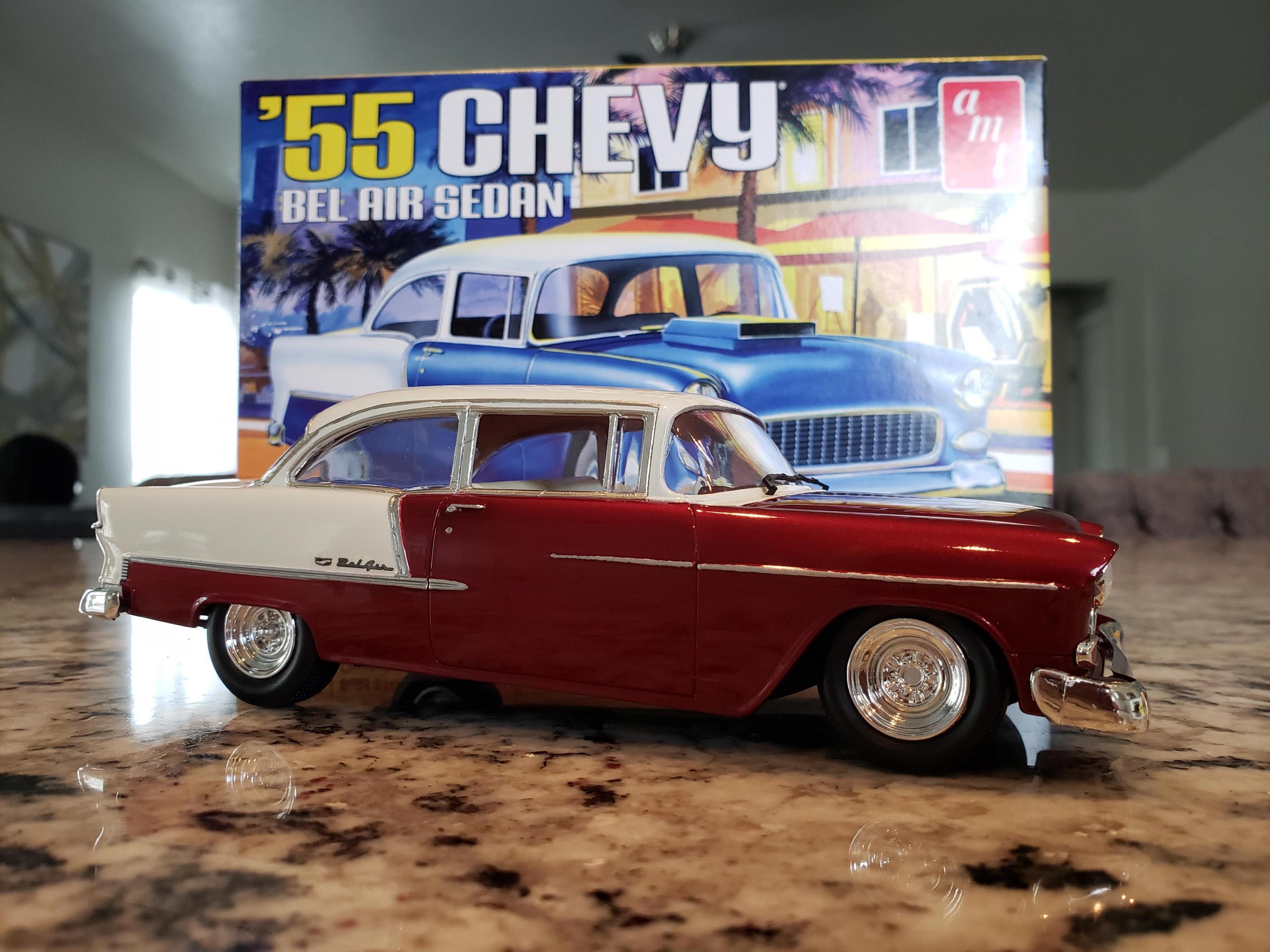 Greetings friends, I just finished this AMT 55 Chevy Bel Air build. The kit is very nice and it went together very easy. The kit is almost built stock out of box but of course I couldn't do that without modifying it slightly to fit my style and my personality. I shaved off the built in wipers and replaced them with others I had. I replaced the wheels with different ones and yes I know I didn't weather them a bit but I will. The car was painted two tone using Splash Paint Octane Red and India Ivory followed by their 2k clear. The paint turned out ok but I still struggle with using Molotow pens and the chrome foil for window trim and other chrome accents but am working on it. The only other piece I replaced from being stock was the exhaust tip. I made my own. Please feel free to leave me comments and criticism is always welcomed. Thanks for looking!