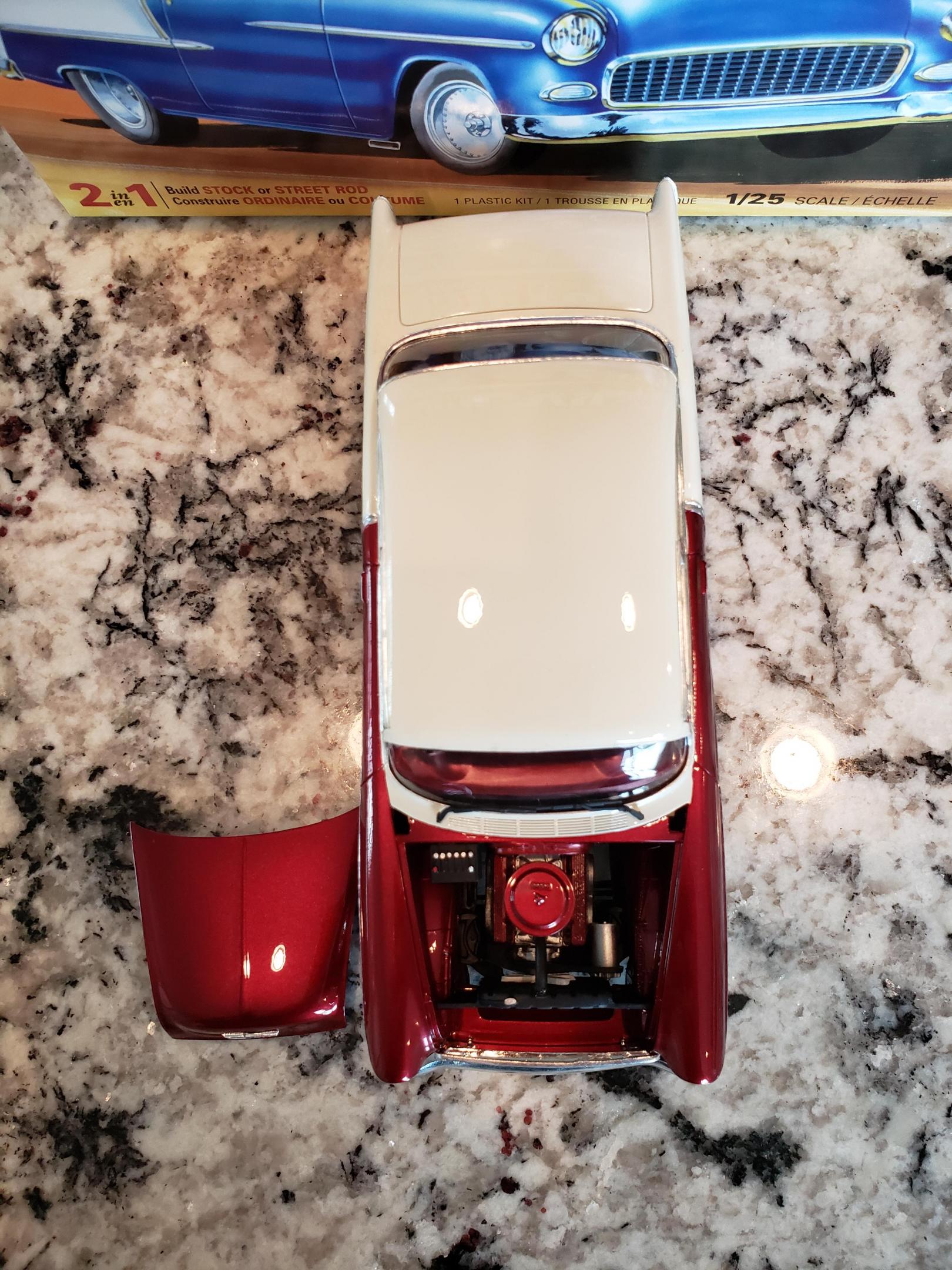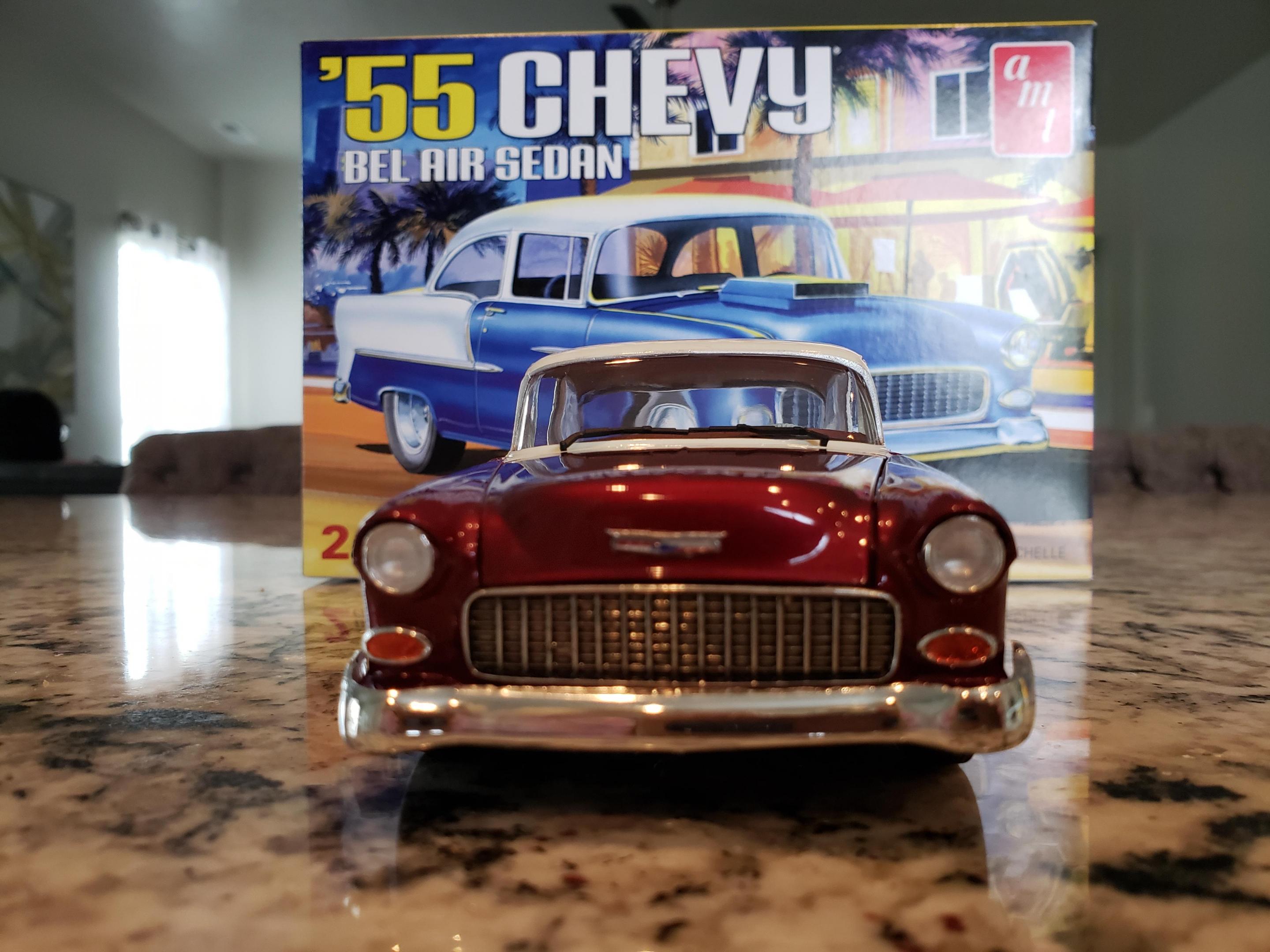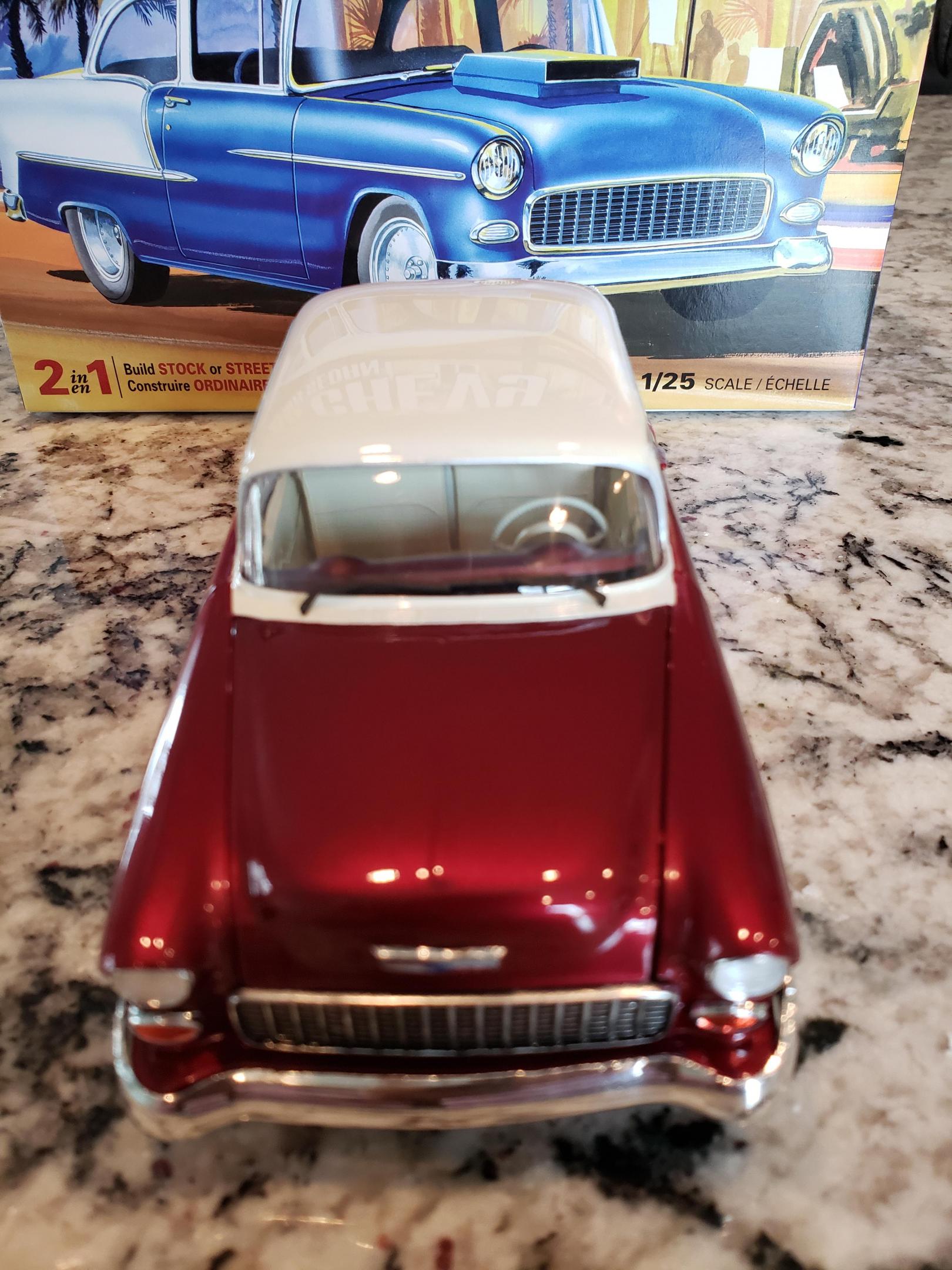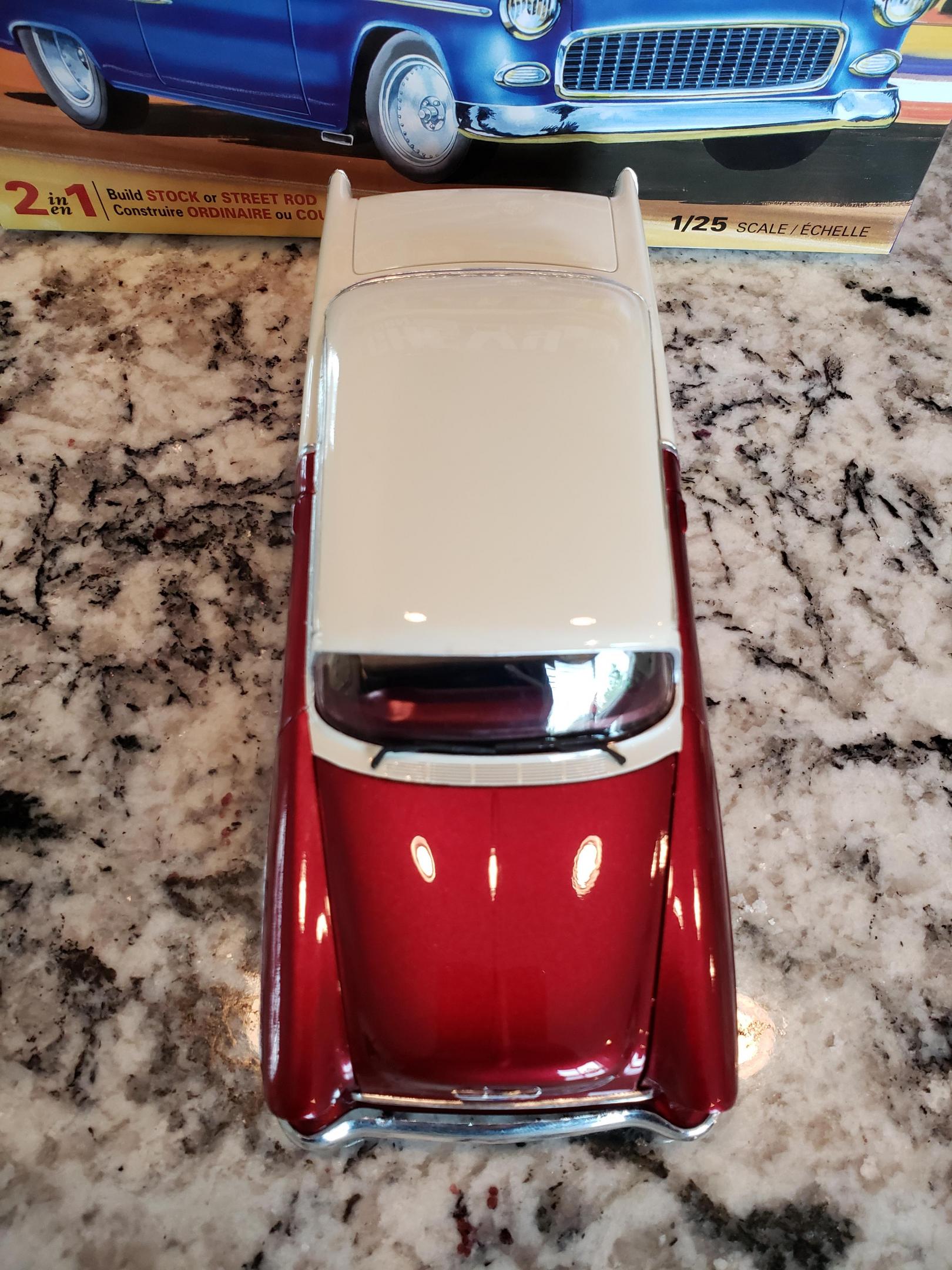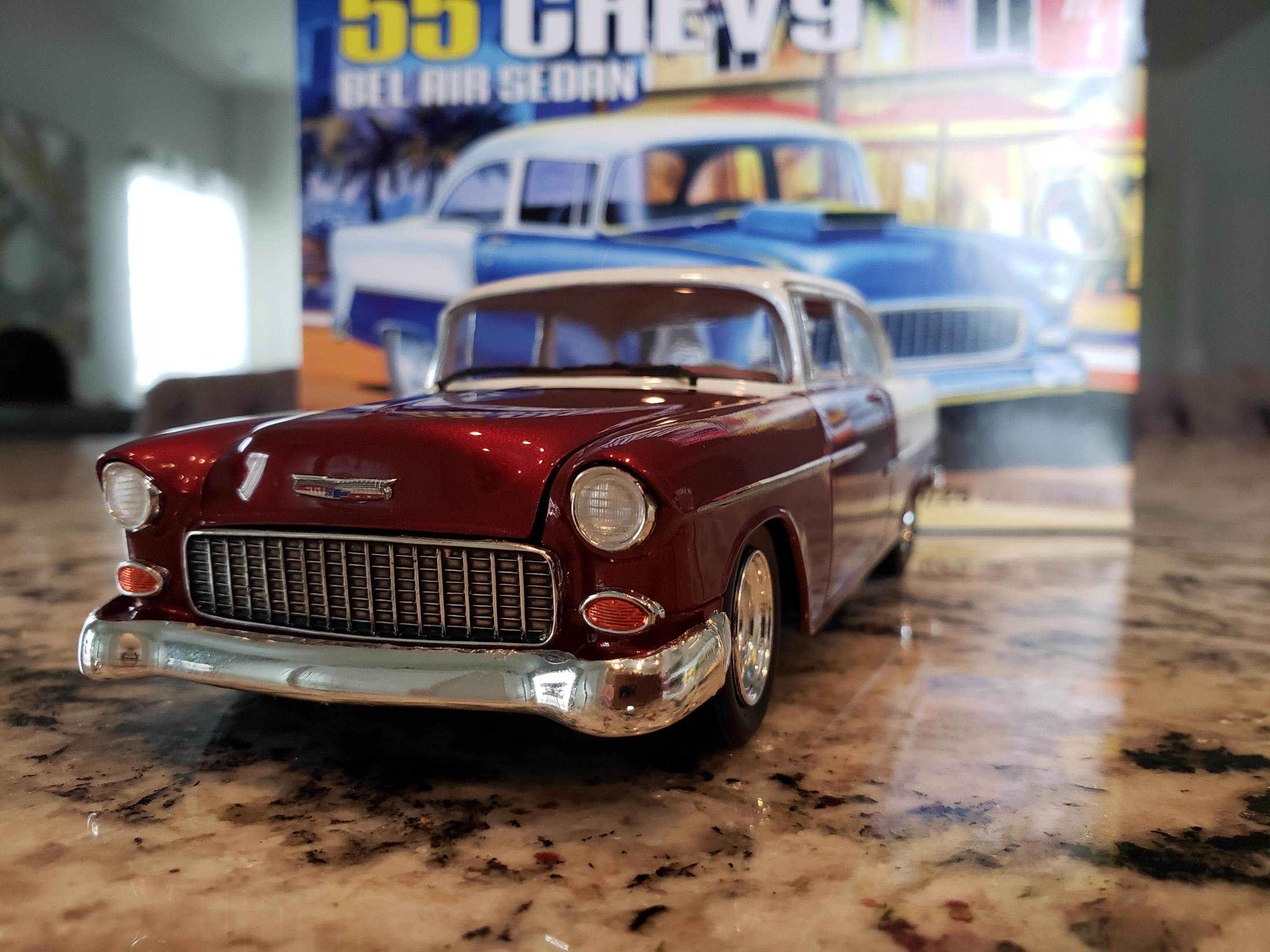 Greetings friends, I just finished this AMT 55 Chevy Bel Air build. The kit is very nice and it went together very easy. The kit is almost built stock out of box but of course I couldn't do that without modifying it slightly to fit my style and my personality. I shaved off the built in wipers and replaced them with others I had. I replaced the wheels with different ones and yes I know I didn't weather them a bit but I will. The car was painted two tone using Splash Paint Octane Red and India Ivory followed by their 2k clear. The paint turned out ok but I still struggle with using Molotow pens and the chrome foil for window trim and other chrome accents but am working on it. The only other piece I replaced from being stock was the exhaust tip. I made my own. Please feel free to leave me comments and criticism is always welcomed. Thanks for looking!