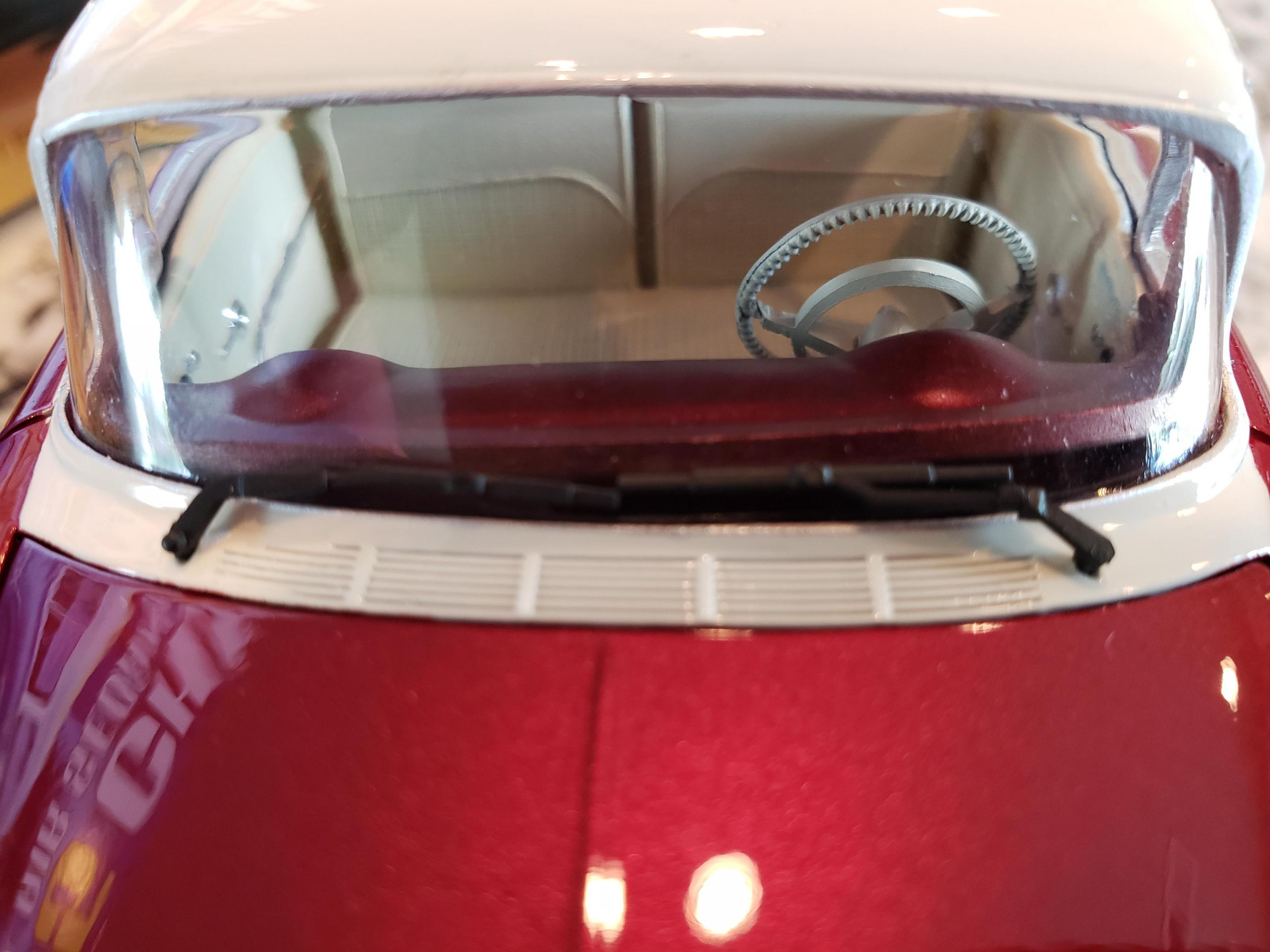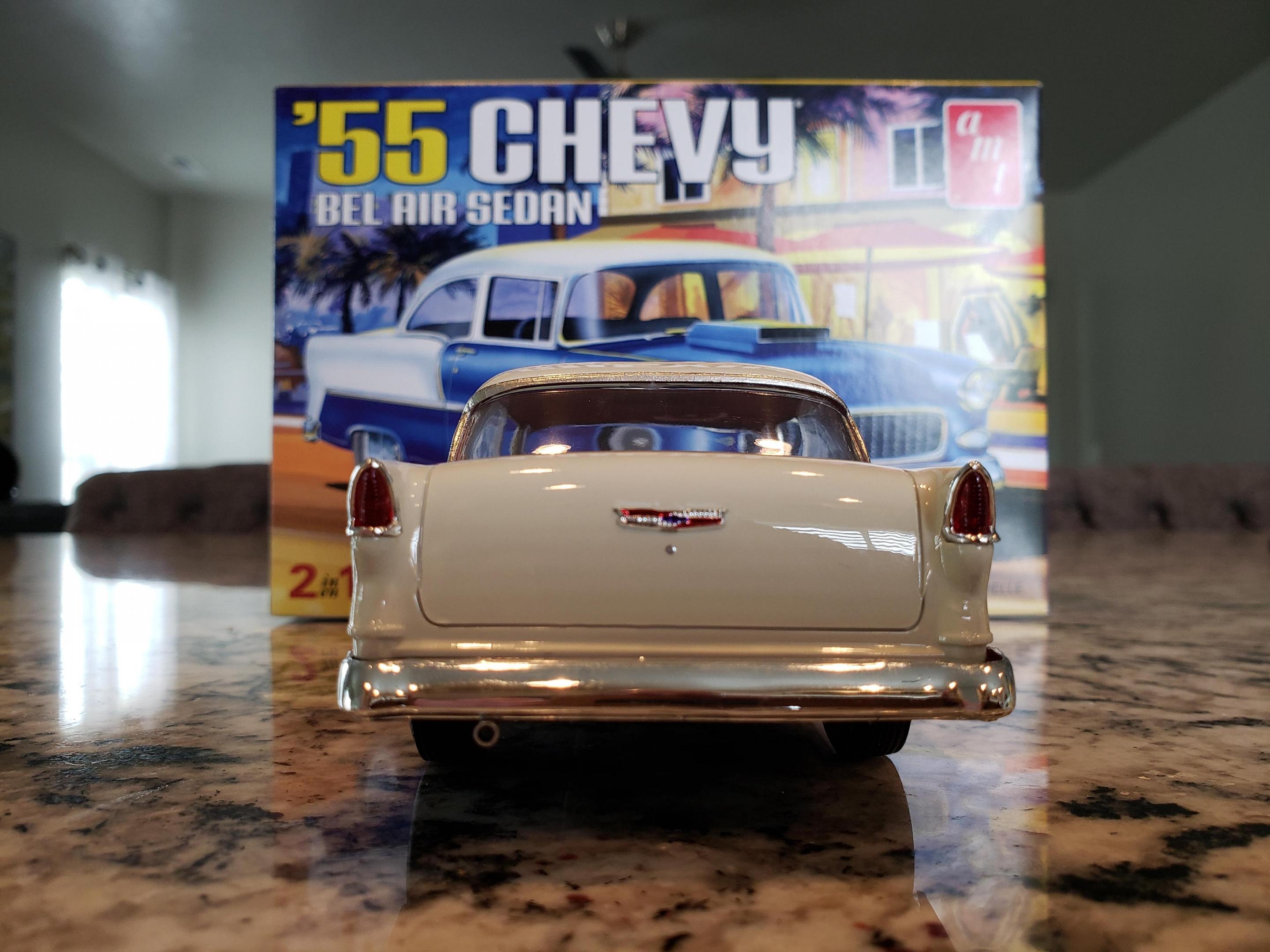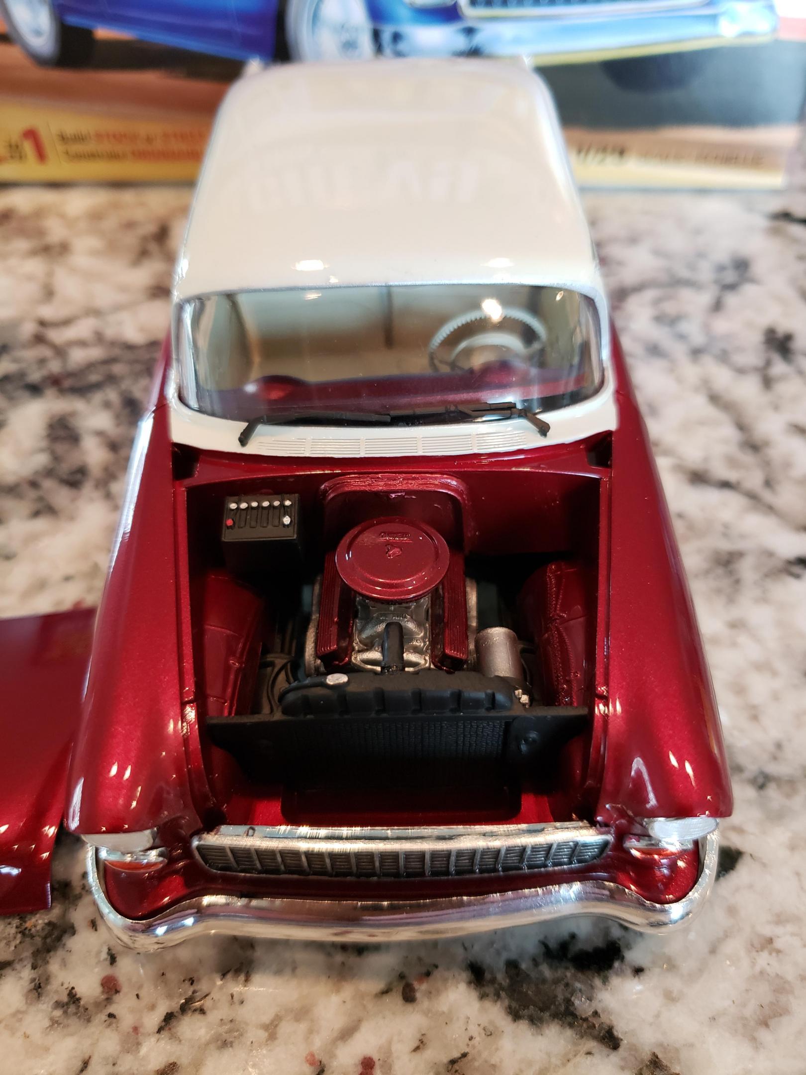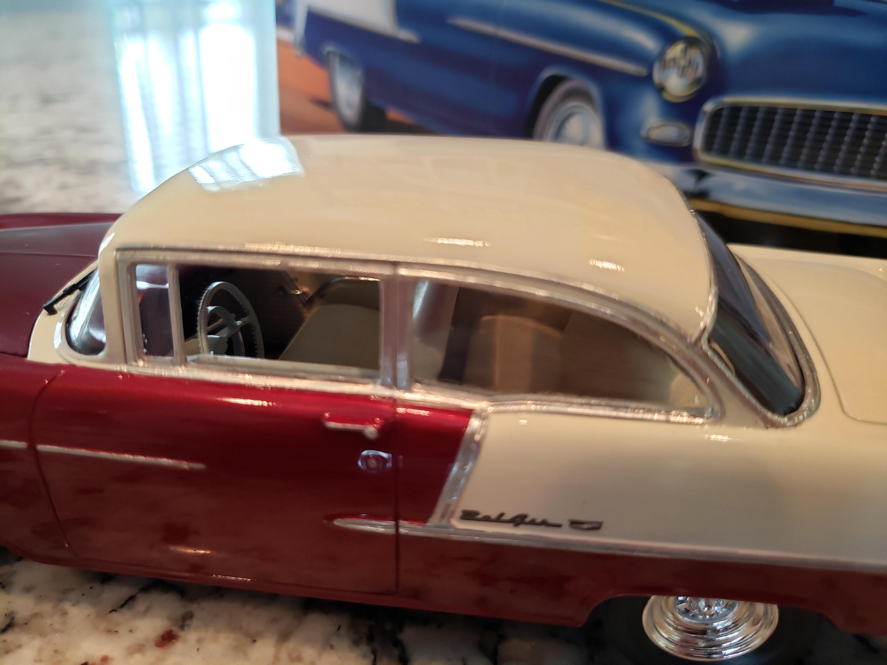 Greetings friends, I just finished this AMT 55 Chevy Bel Air build. The kit is very nice and it went together very easy. The kit is almost built stock out of box but of course I couldn't do that without modifying it slightly to fit my style and my personality. I shaved off the built in wipers and replaced them with others I had. I replaced the wheels with different ones and yes I know I didn't weather them a bit but I will. The car was painted two tone using Splash Paint Octane Red and India Ivory followed by their 2k clear. The paint turned out ok but I still struggle with using Molotow pens and the chrome foil for window trim and other chrome accents but am working on it. The only other piece I replaced from being stock was the exhaust tip. I made my own. Please feel free to leave me comments and criticism is always welcomed. Thanks for looking!