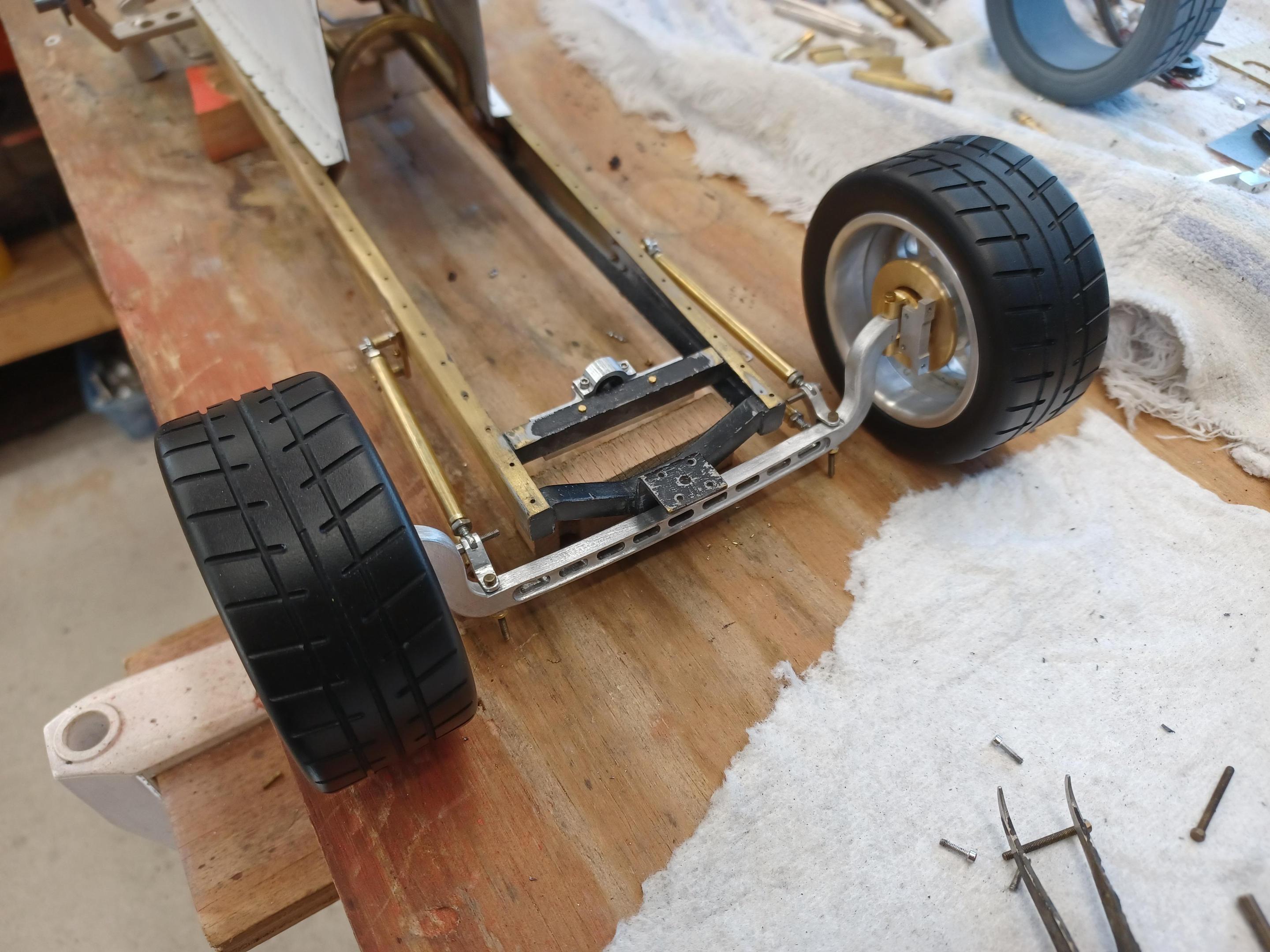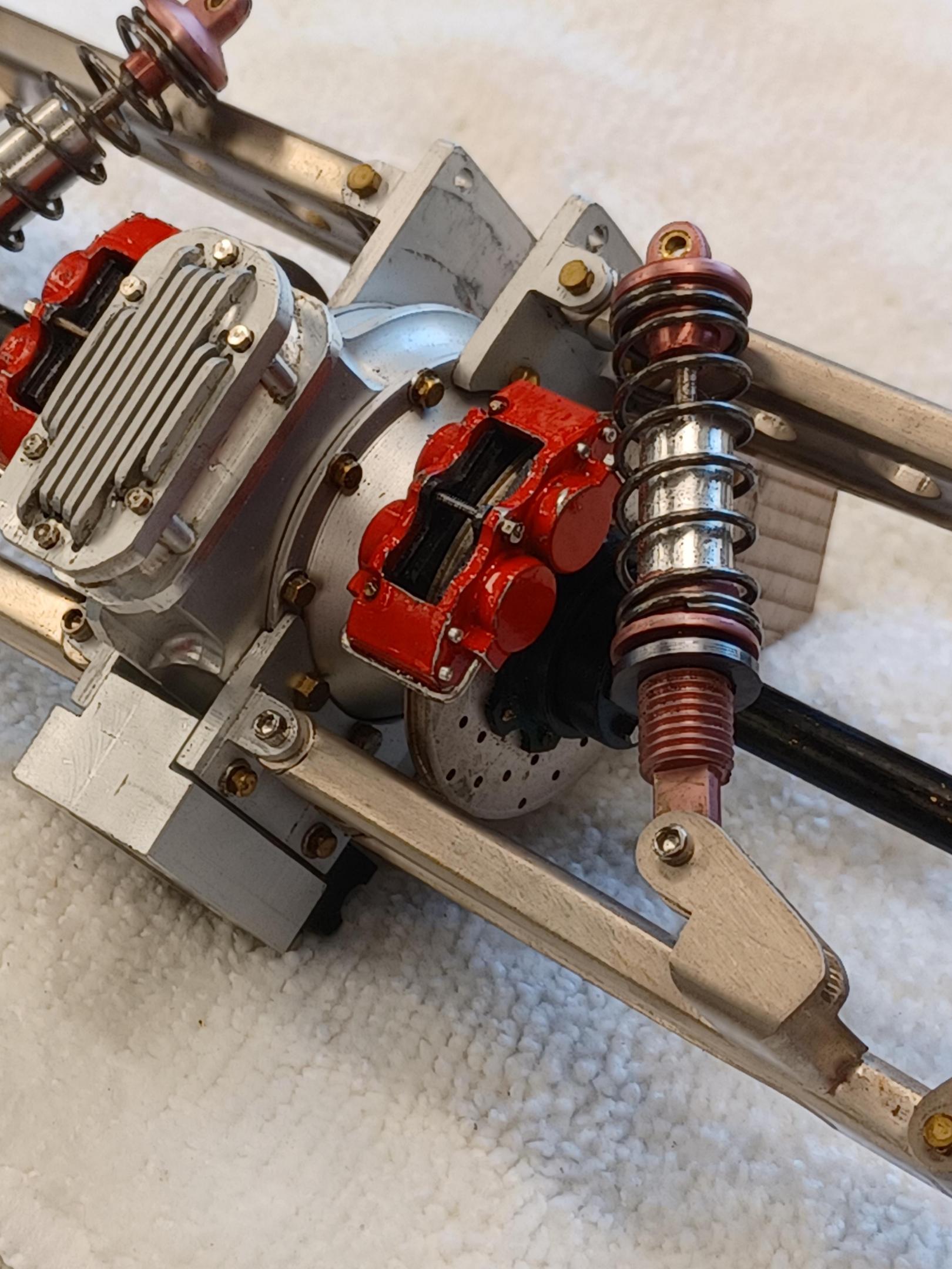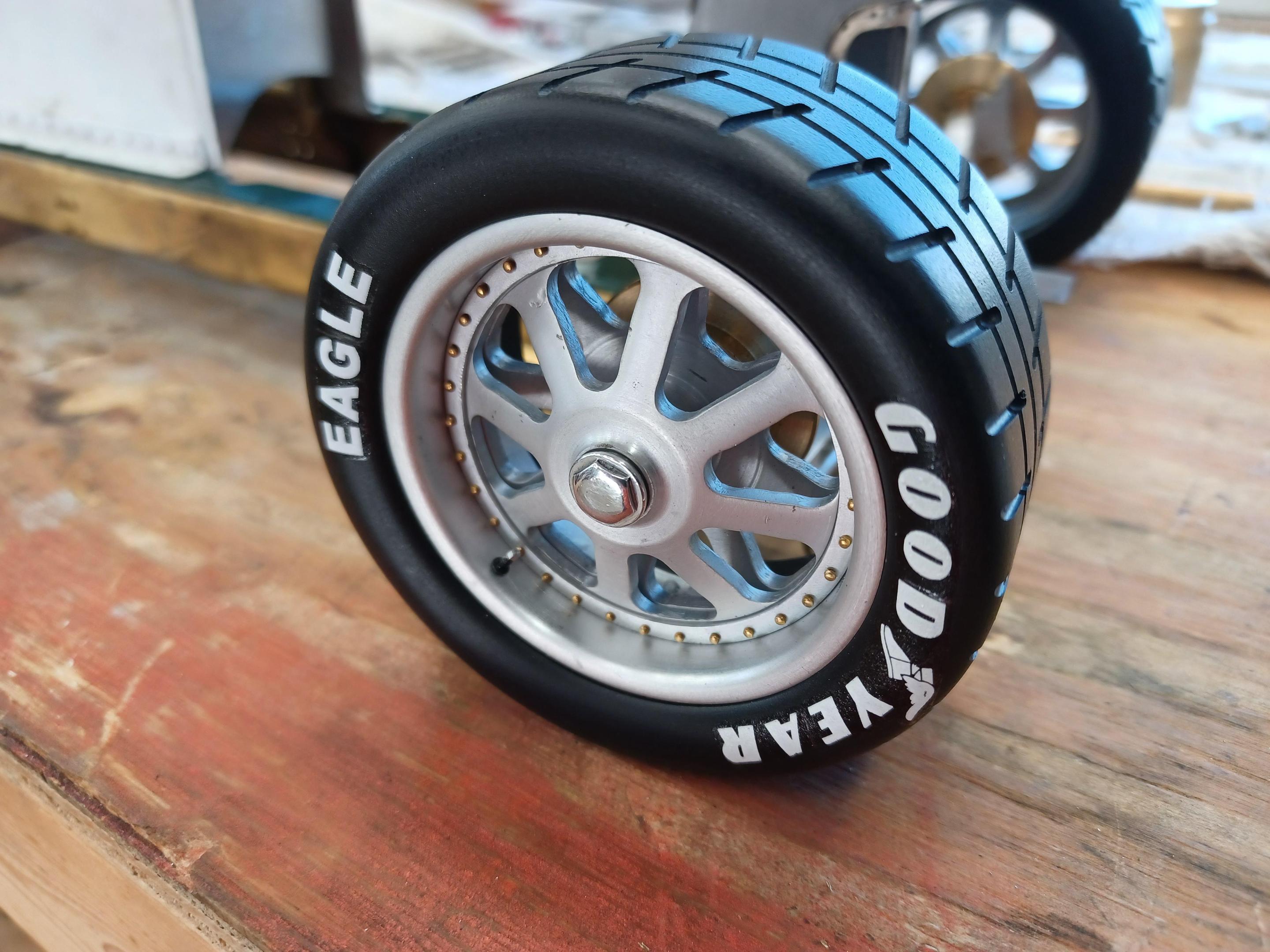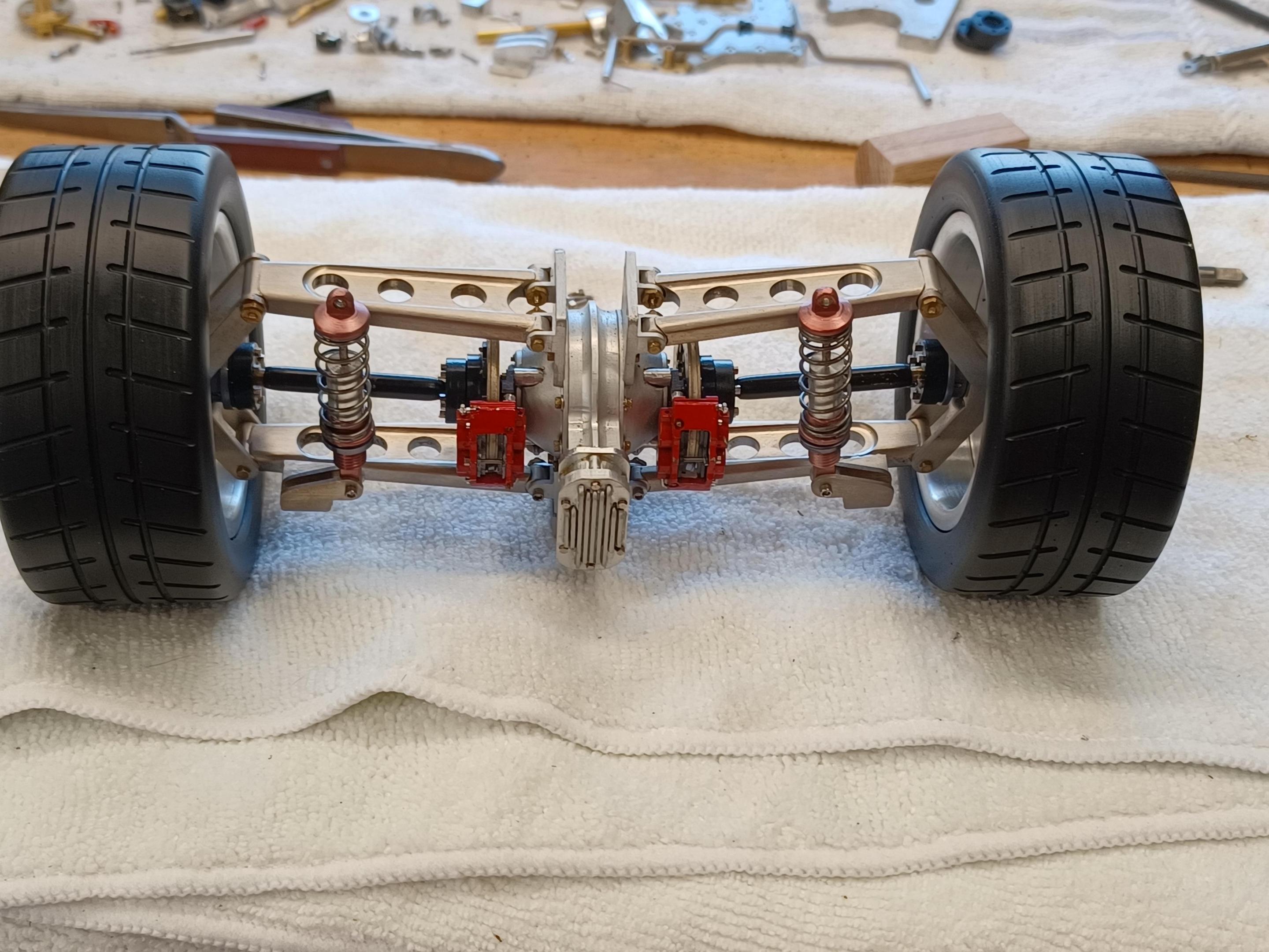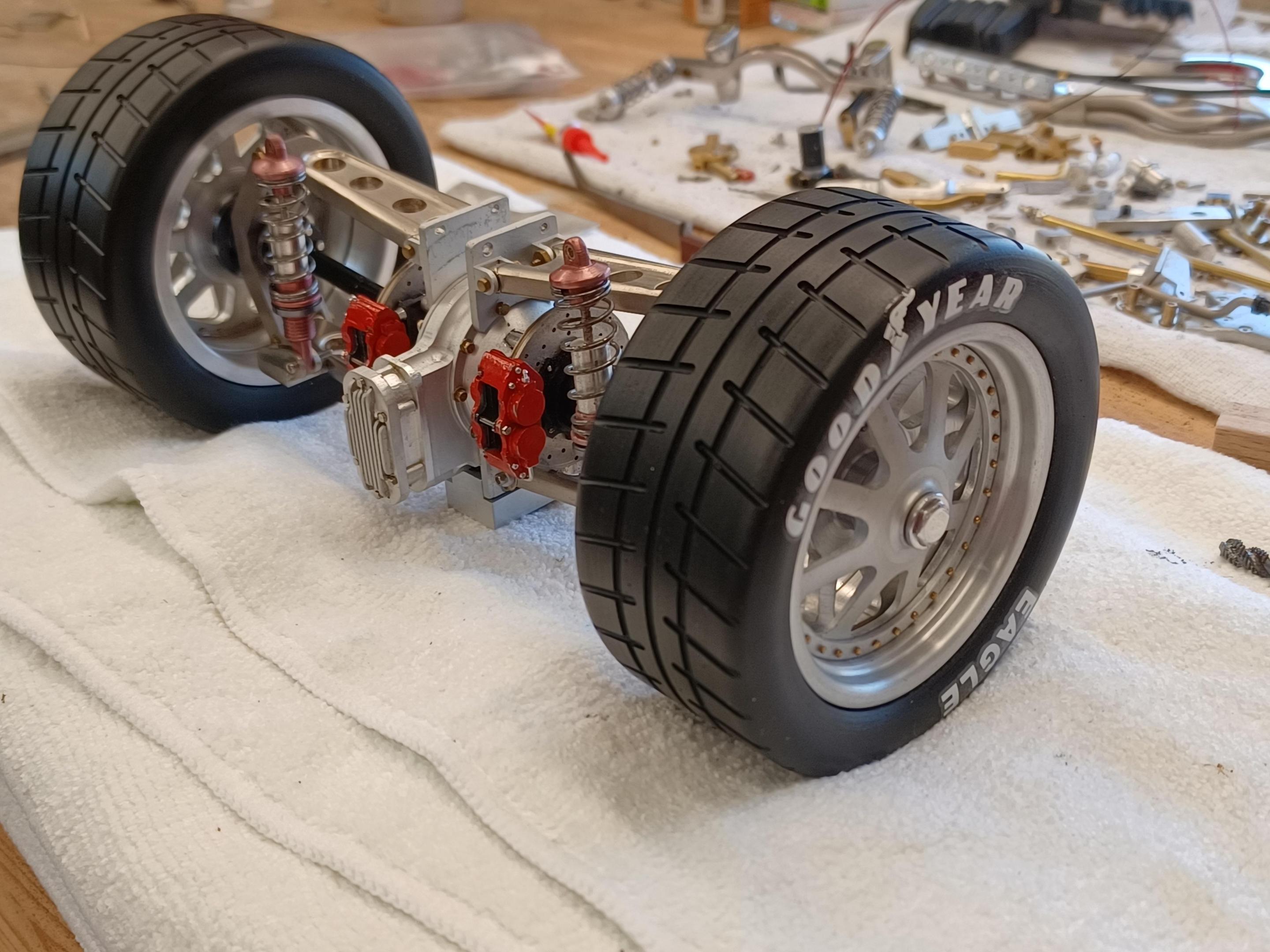 i have finished the tires and wheels. i think they look pretty good. i am working on the steering and i have to finish the front rotors. i cast the tires over size and machined them to size. i used ziploc disposable bowls to make the rough casting.i got a good start on the front end . got the 4 bars end mounts made and now the coilovers and steering. i have to remove the crossmember in the front. hope you all have a nice holiday.
