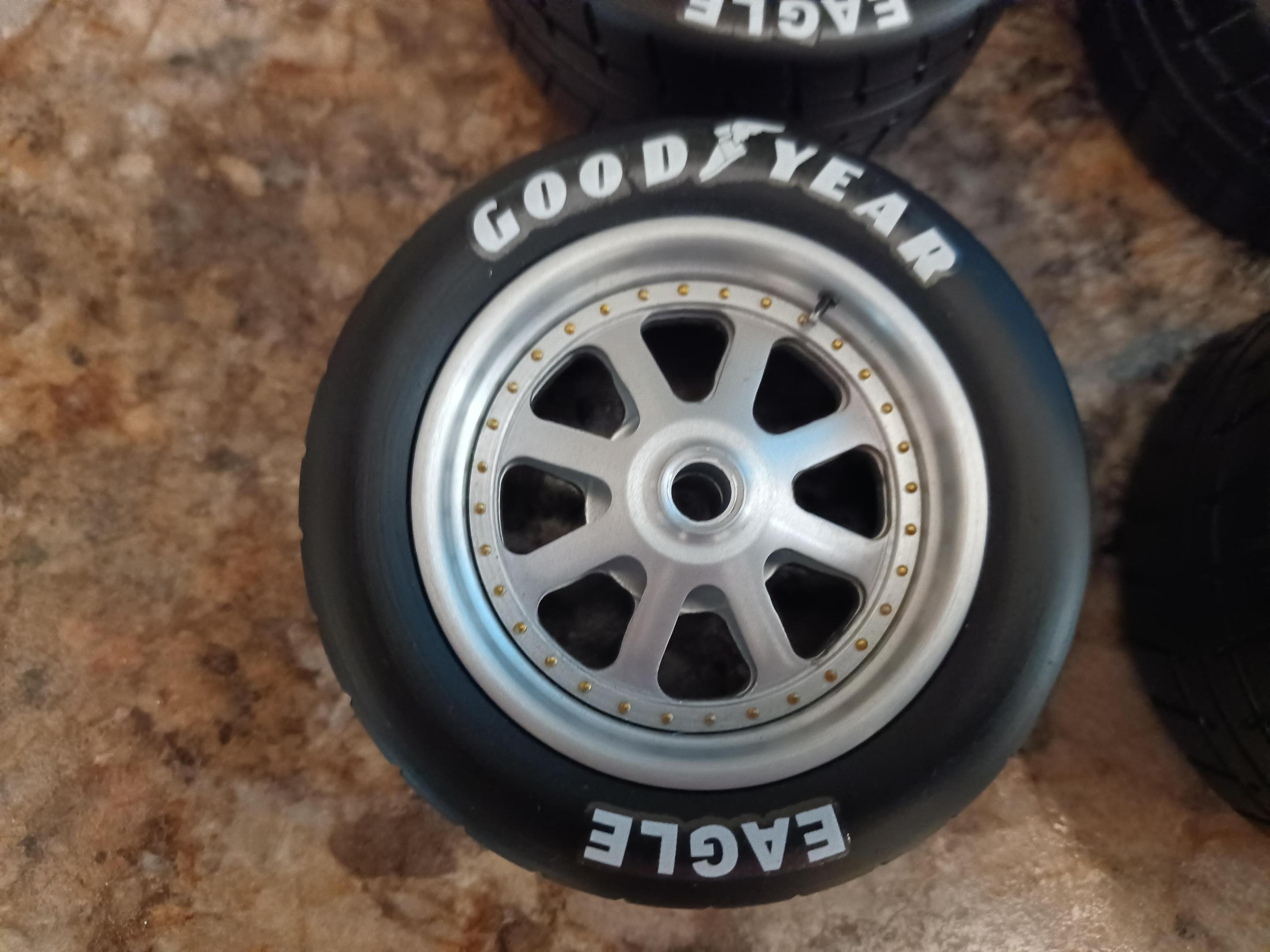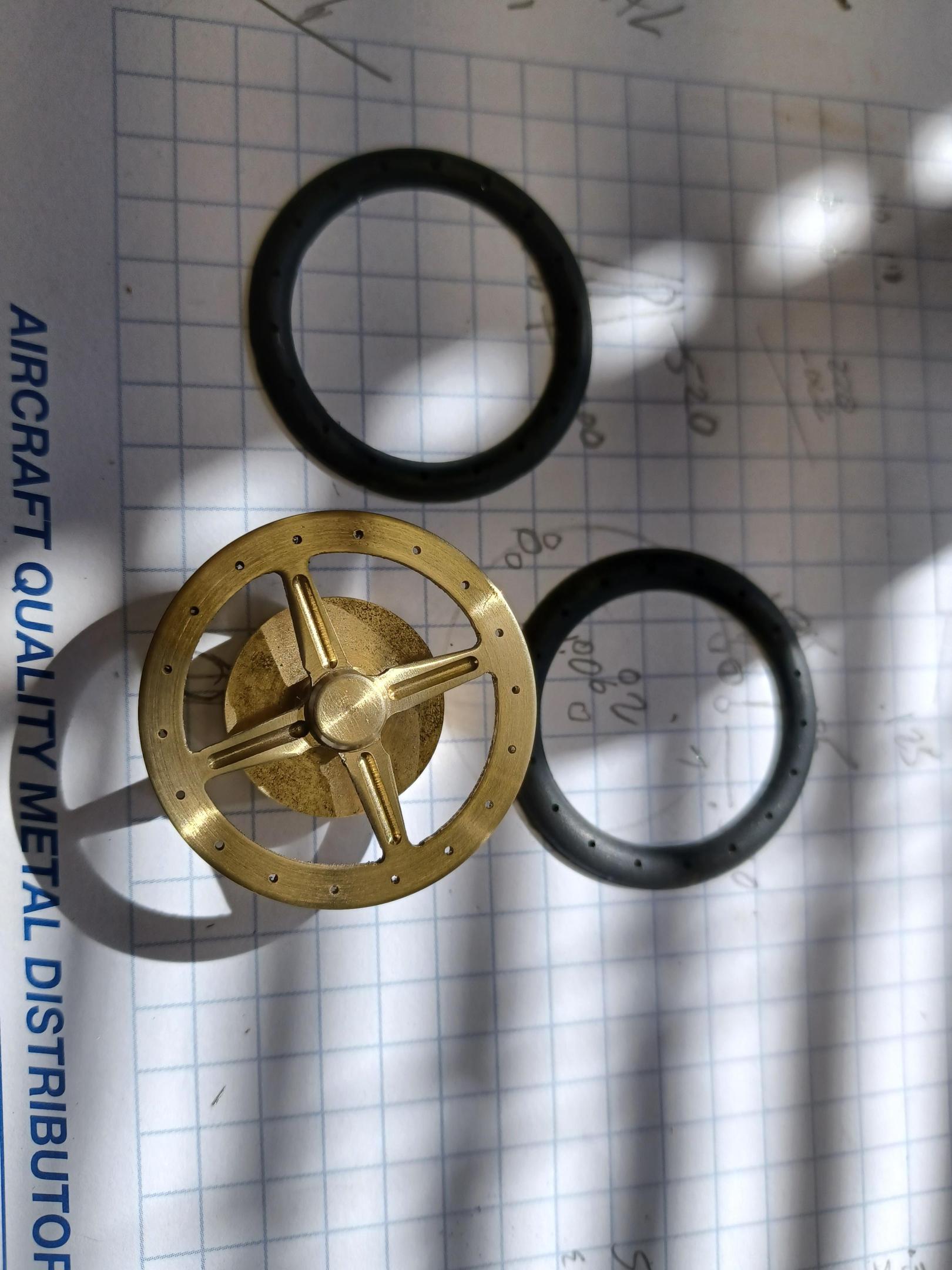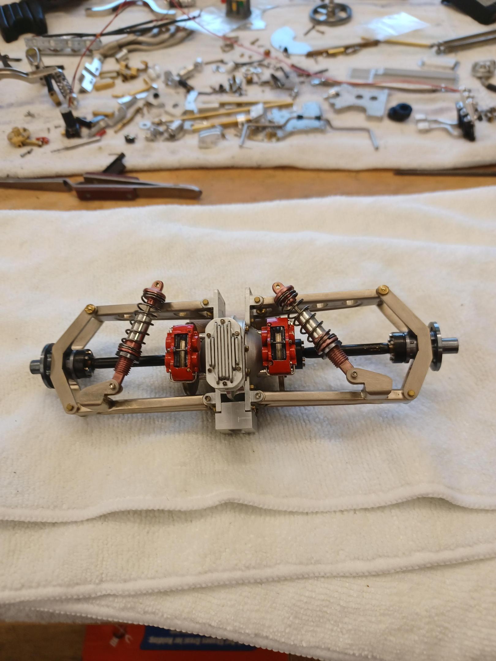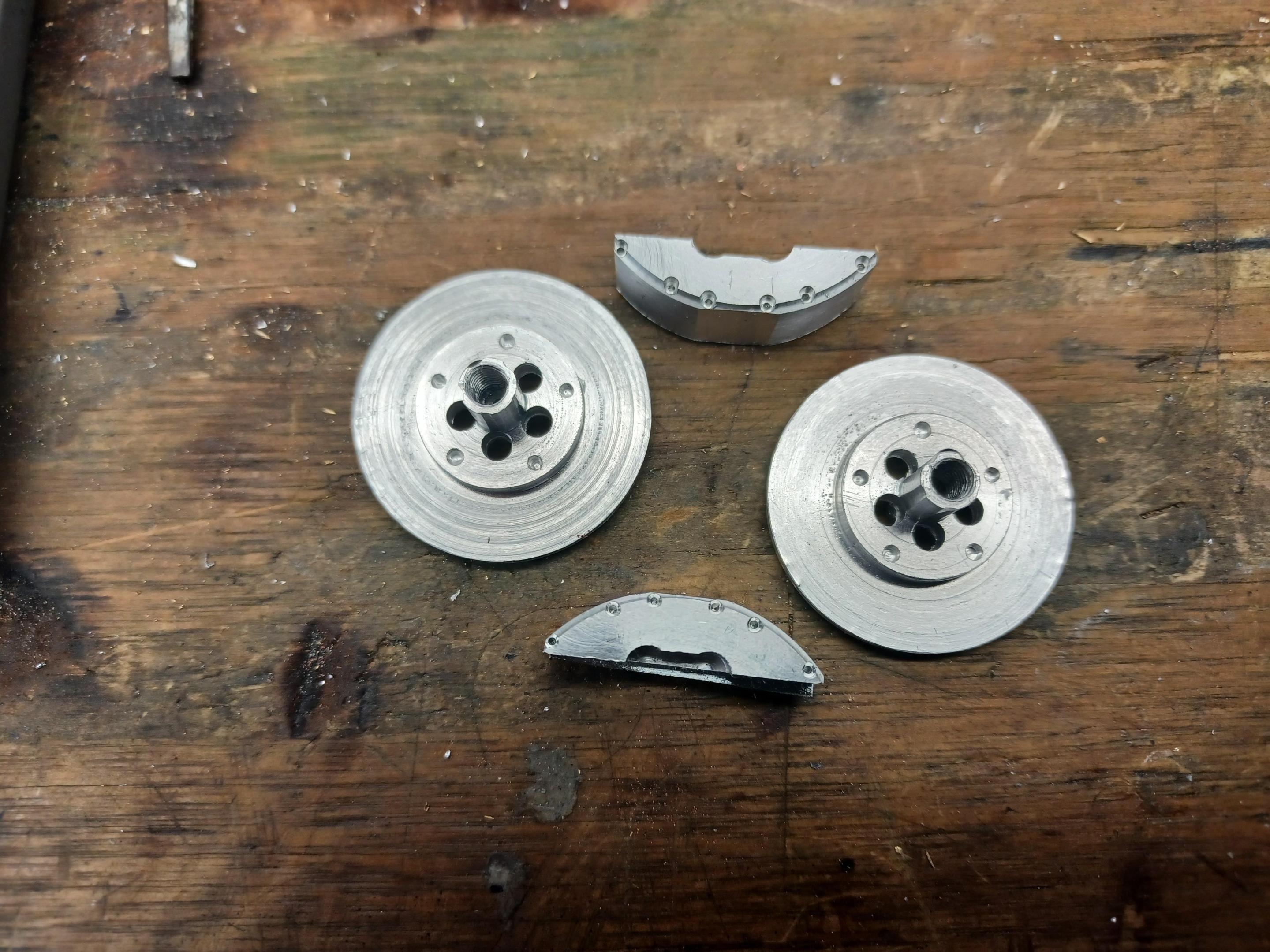 i have finished the tires and wheels. i think they look pretty good. i am working on the steering and i have to finish the front rotors. i cast the tires over size and machined them to size. i used ziploc disposable bowls to make the rough casting.i got a good start on the front end . got the 4 bars end mounts made and now the coilovers and steering. i have to remove the crossmember in the front. hope you all have a nice holiday.