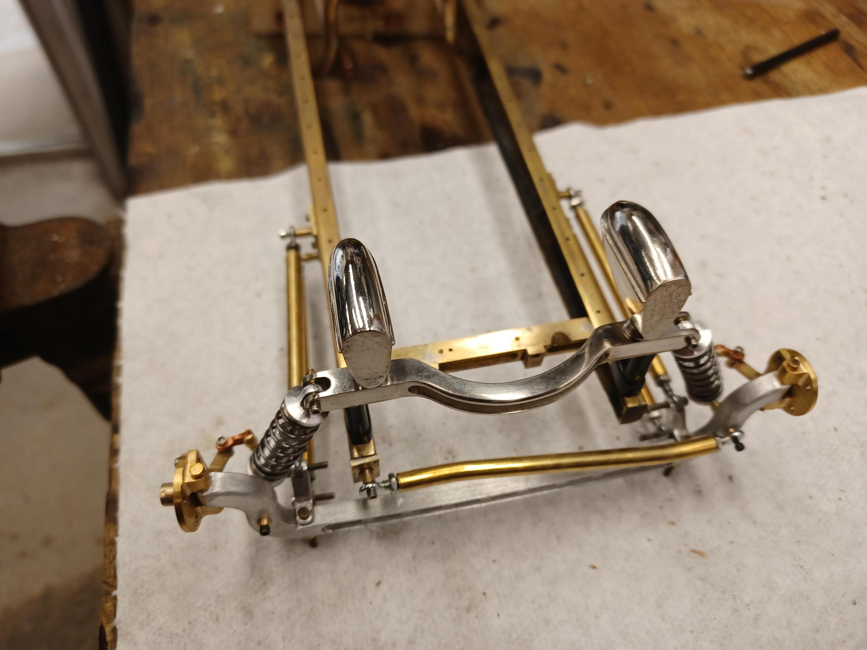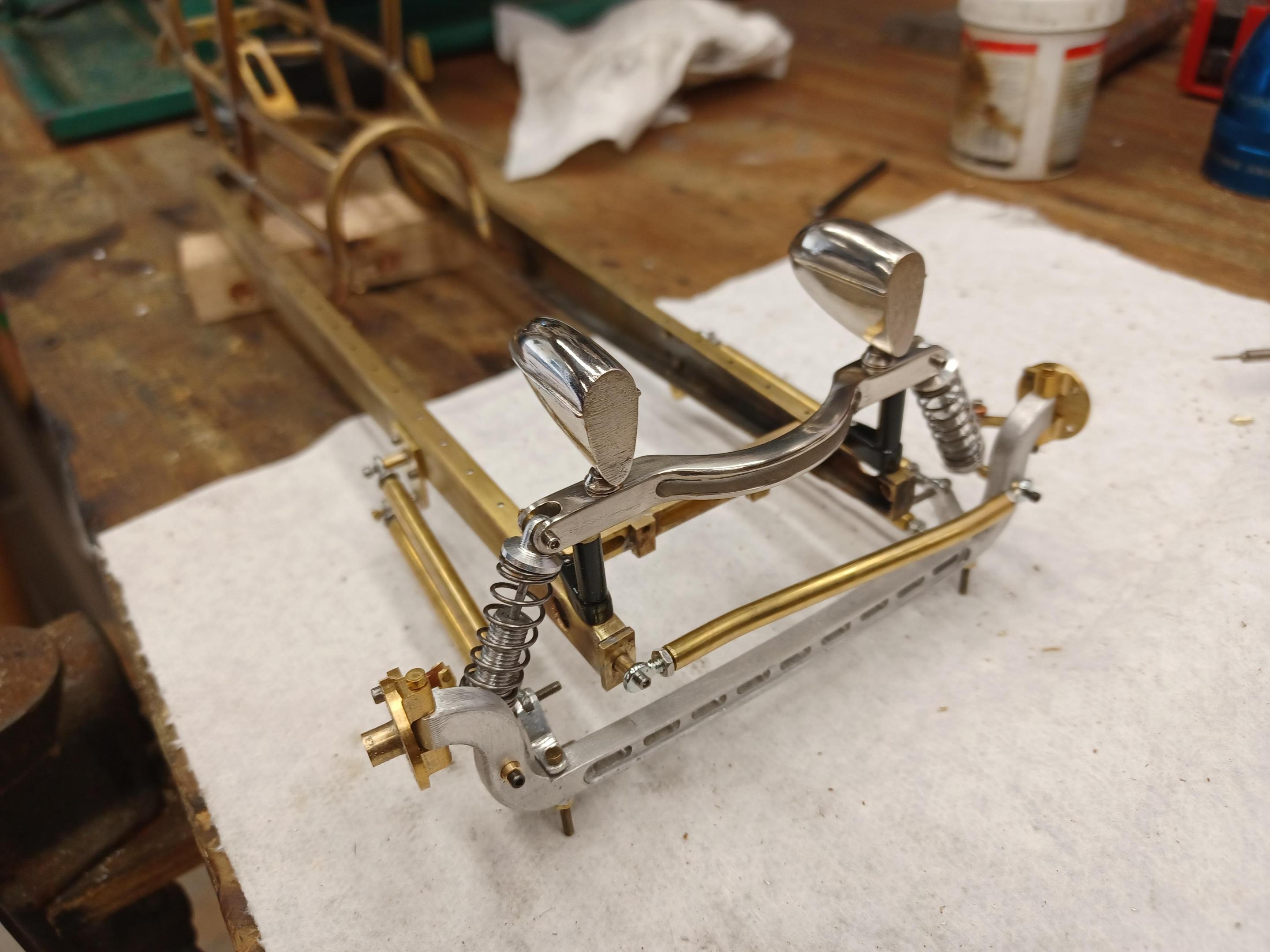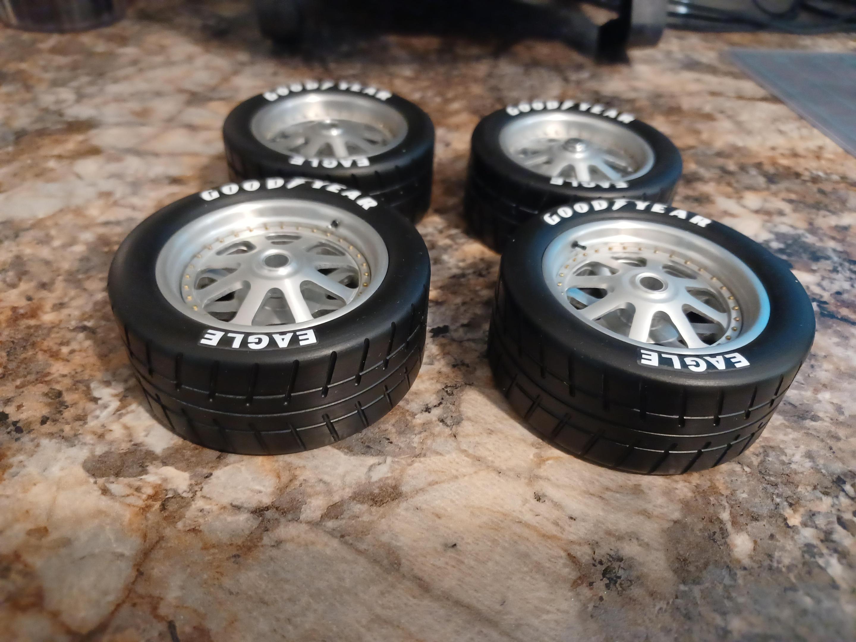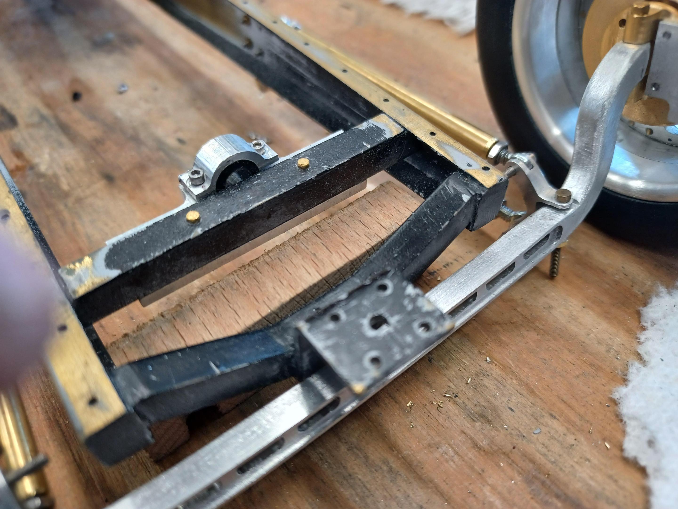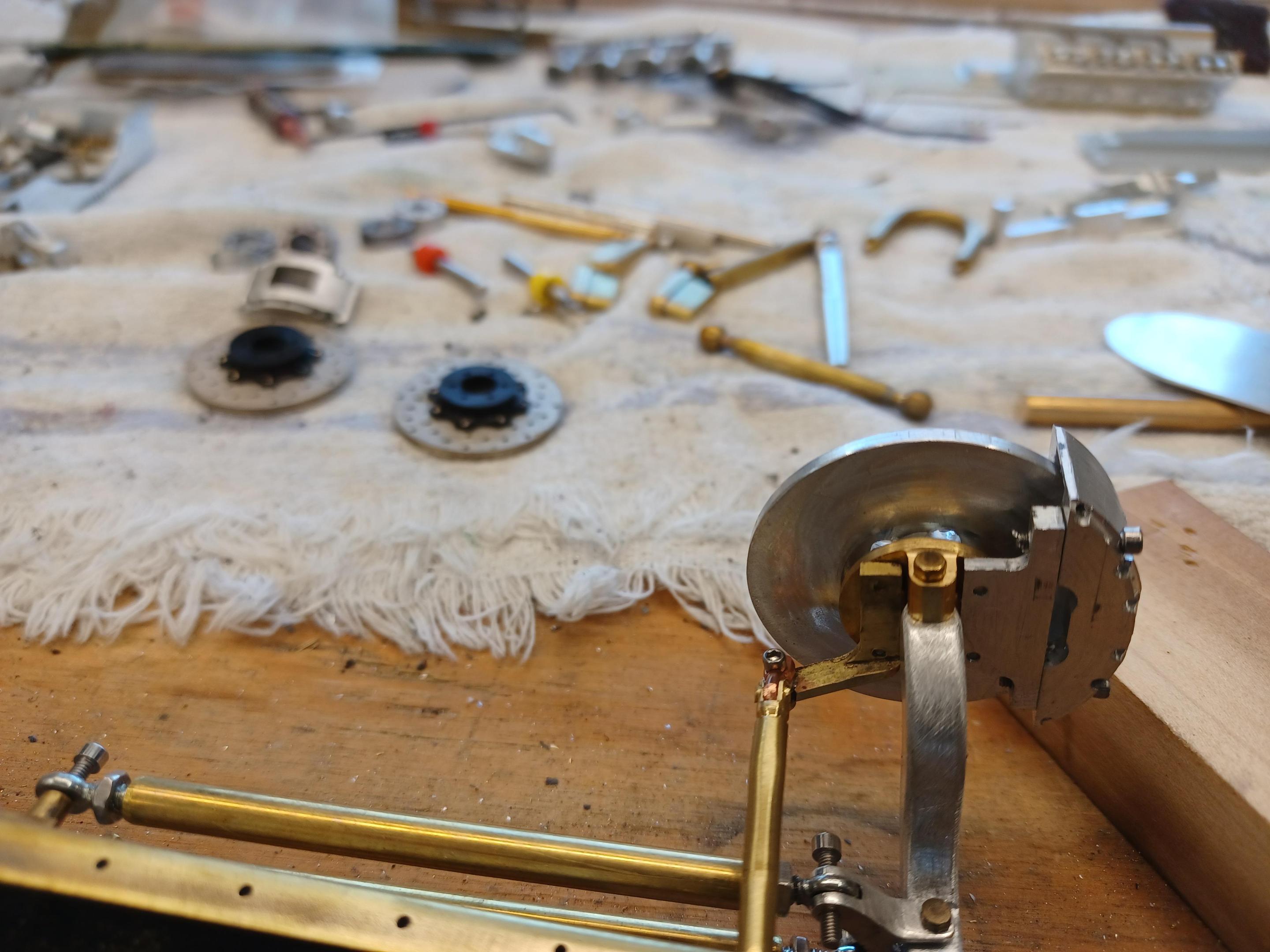 i have finished the tires and wheels. i think they look pretty good. i am working on the steering and i have to finish the front rotors. i cast the tires over size and machined them to size. i used ziploc disposable bowls to make the rough casting.i got a good start on the front end . got the 4 bars end mounts made and now the coilovers and steering. i have to remove the crossmember in the front. hope you all have a nice holiday.