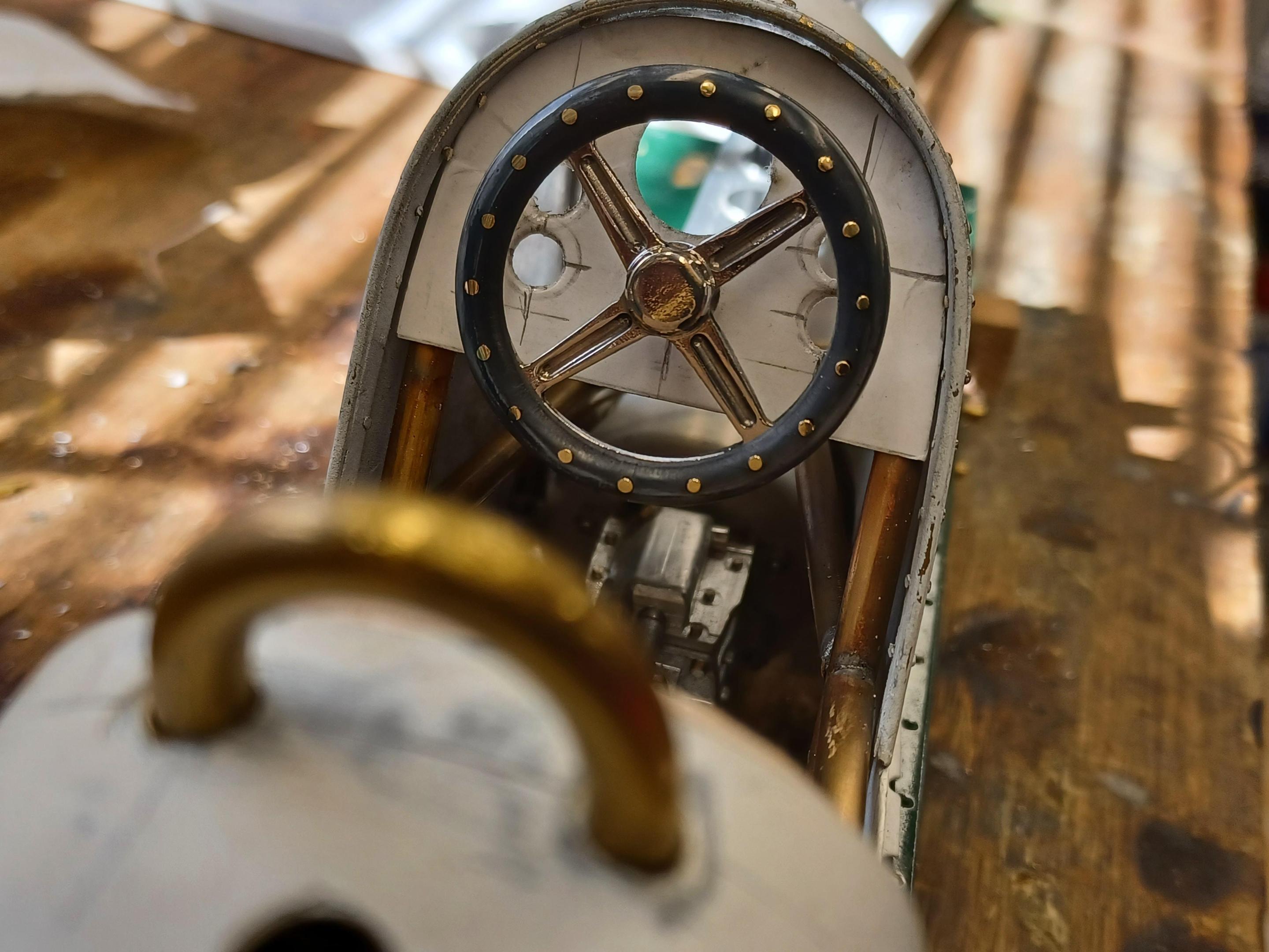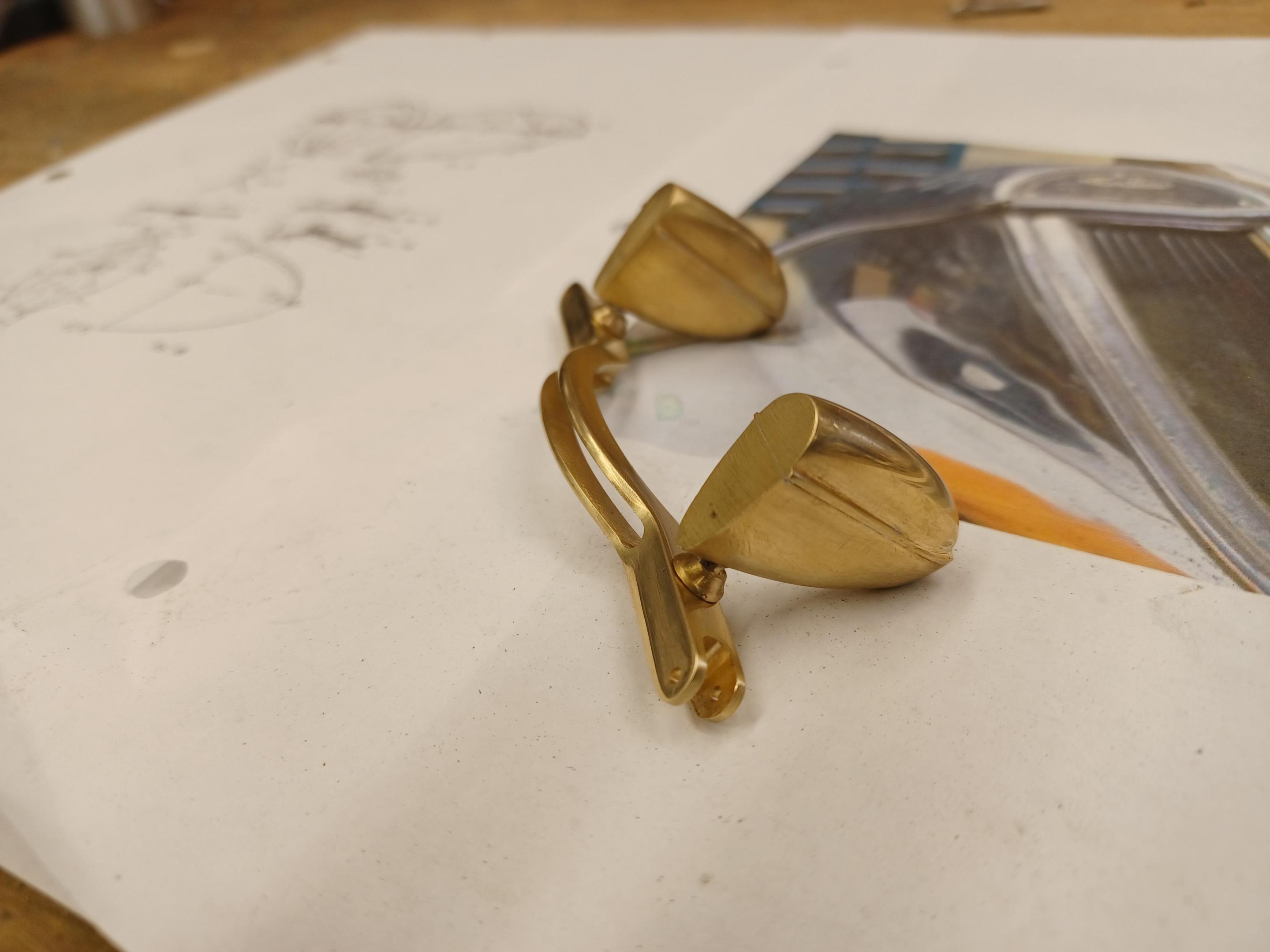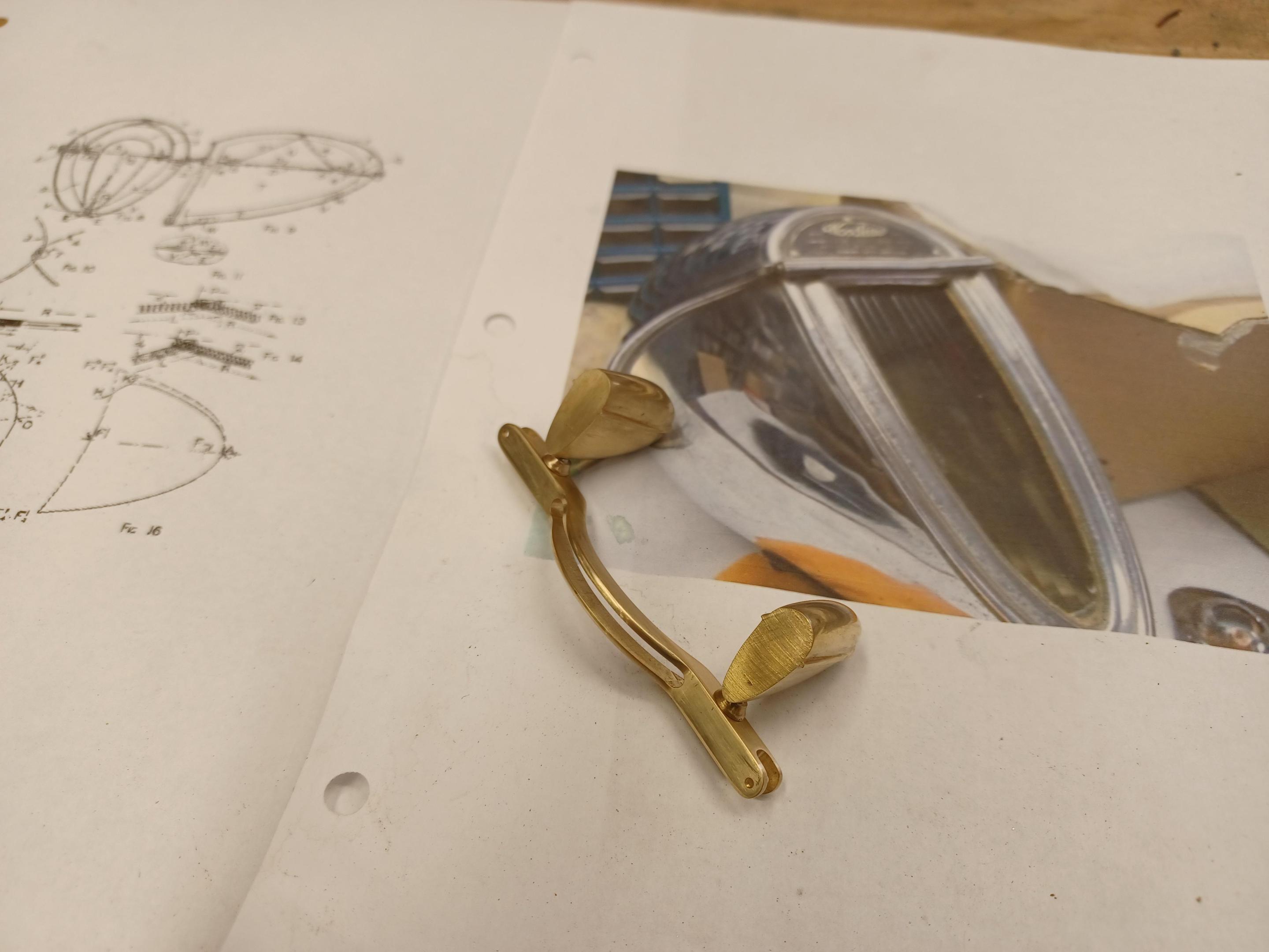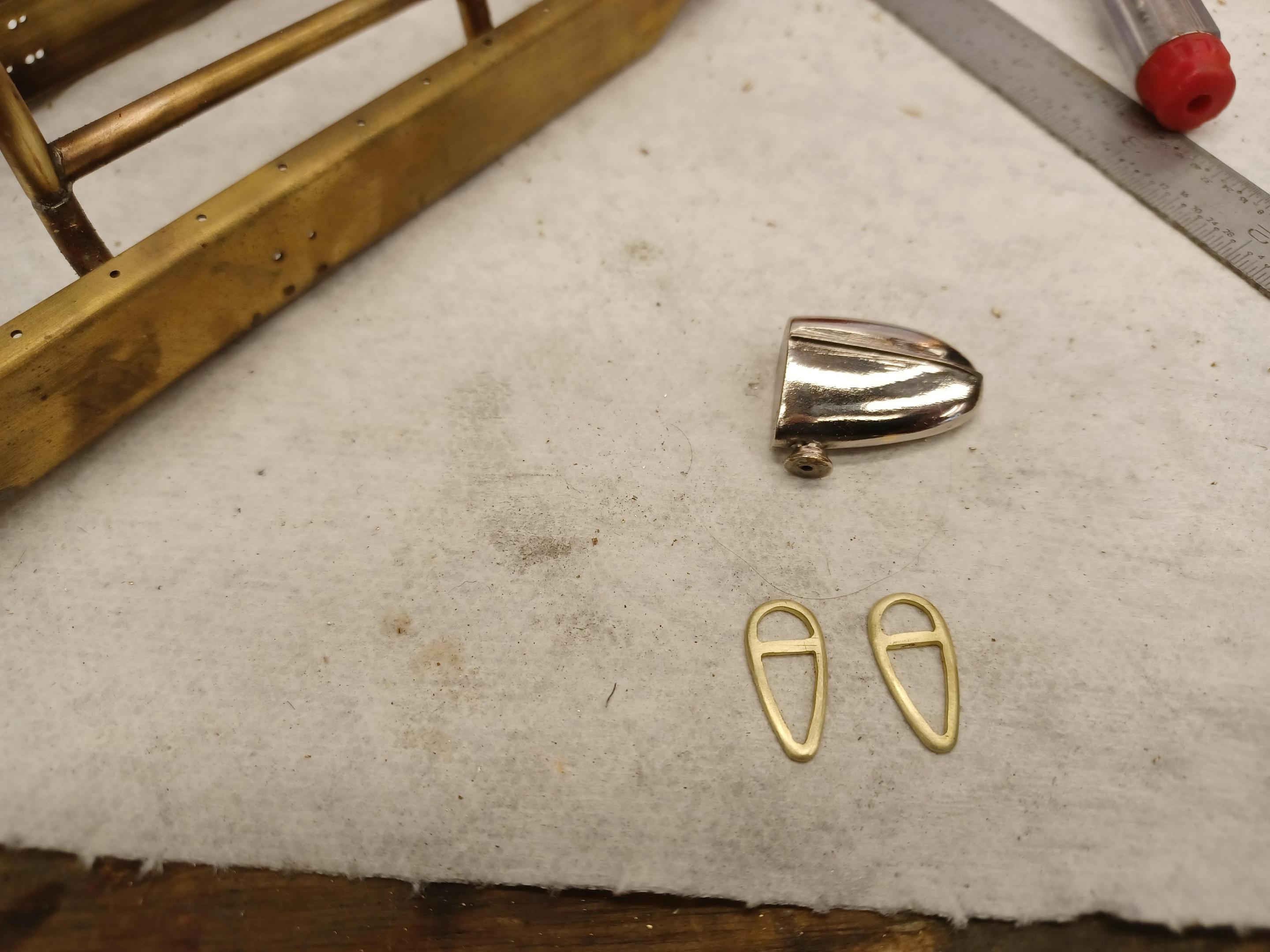 made the lenses for the woolitre headlites.put a yellow lense in top for turn signals.there is a name plate there in the originals.also this week i made a teering wheel. 3 attempts. i nickel plated and polshed the spokesmade 2 molds for the 2 rim pieces and riveted them together. pedas and rear lites are next.then the radiator. hope your new year is going well.
