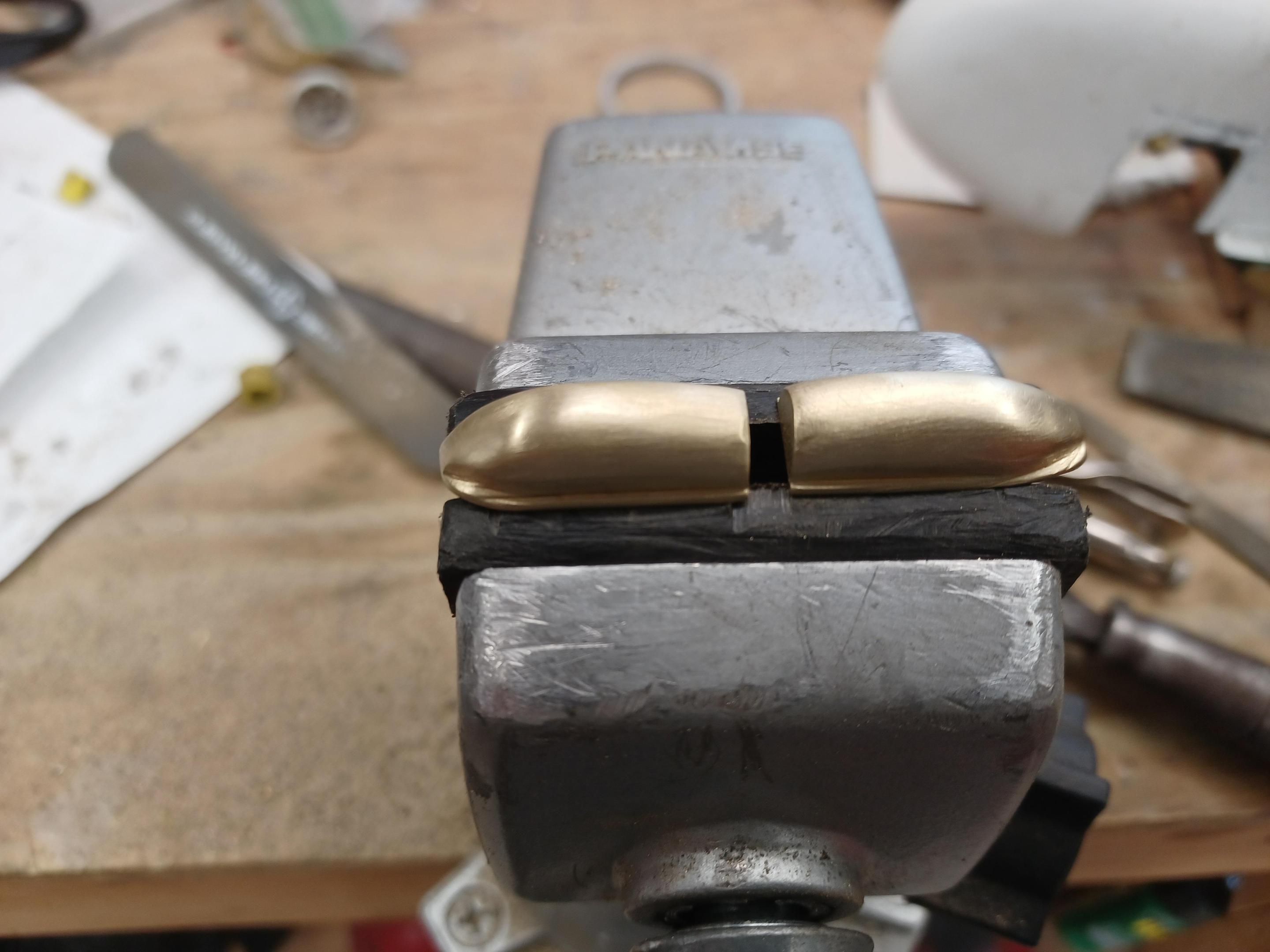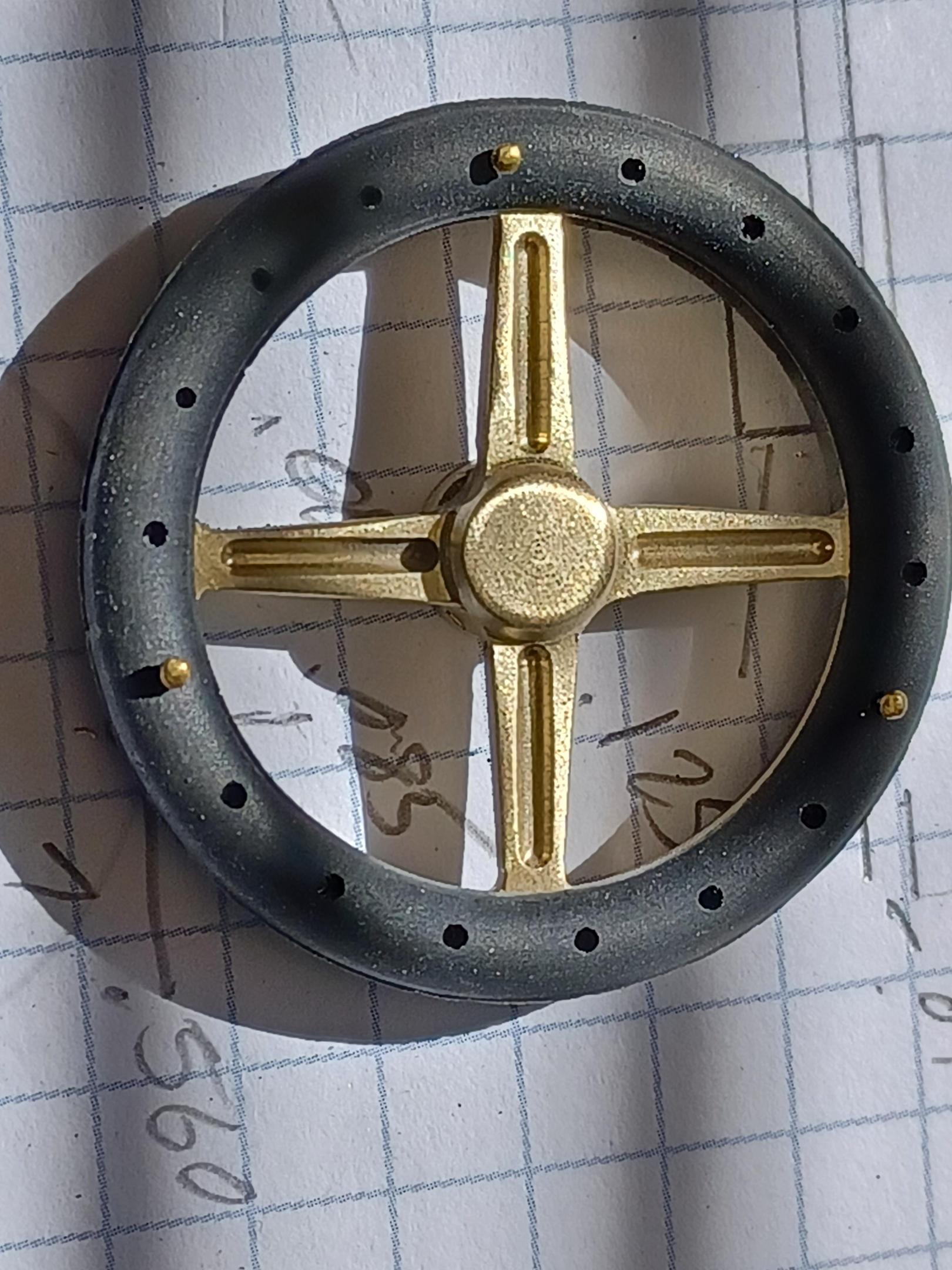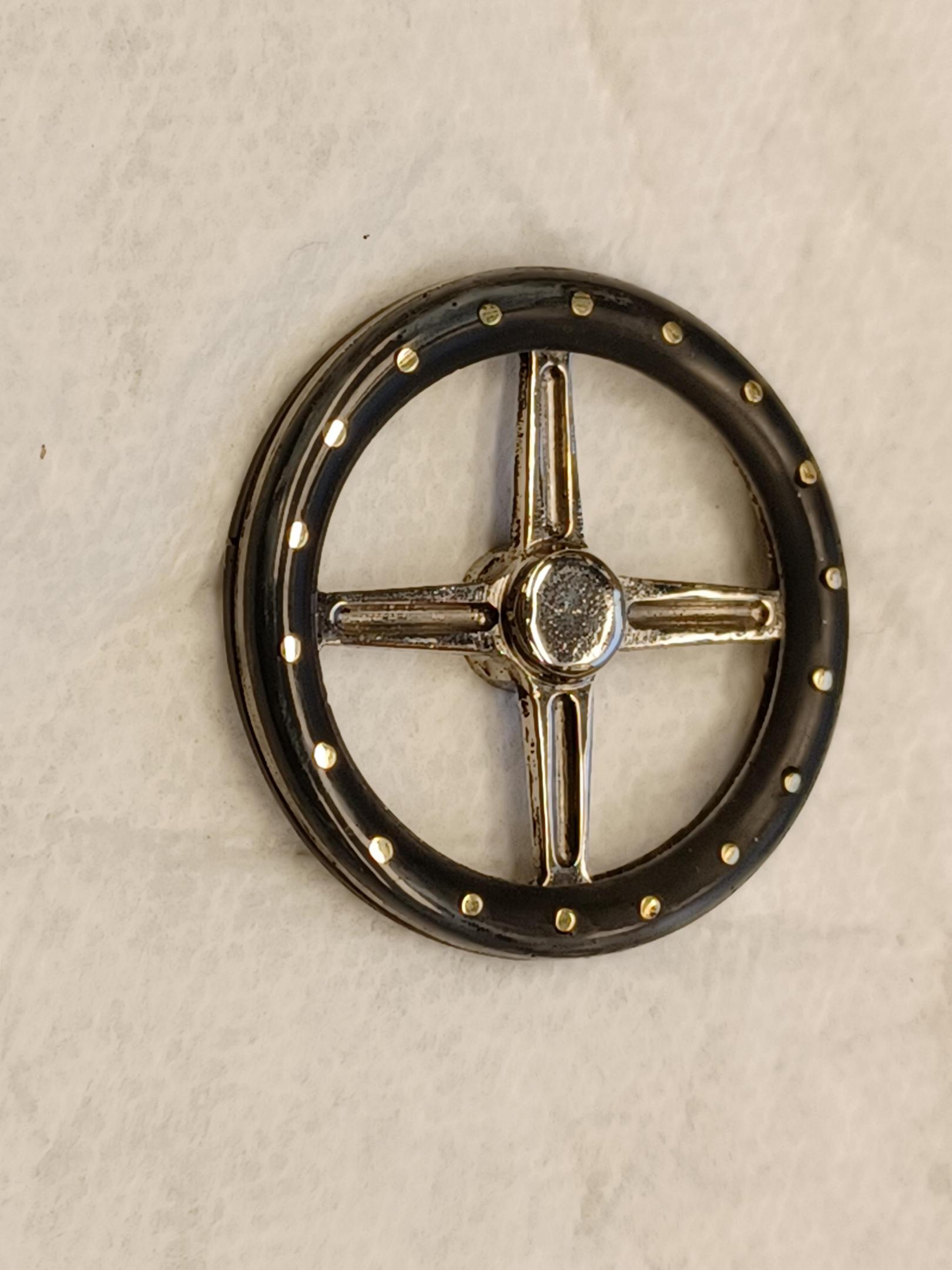 made the lenses for the woolitre headlites.put a yellow lense in top for turn signals.there is a name plate there in the originals.also this week i made a teering wheel. 3 attempts. i nickel plated and polshed the spokesmade 2 molds for the 2 rim pieces and riveted them together. pedas and rear lites are next.then the radiator. hope your new year is going well.