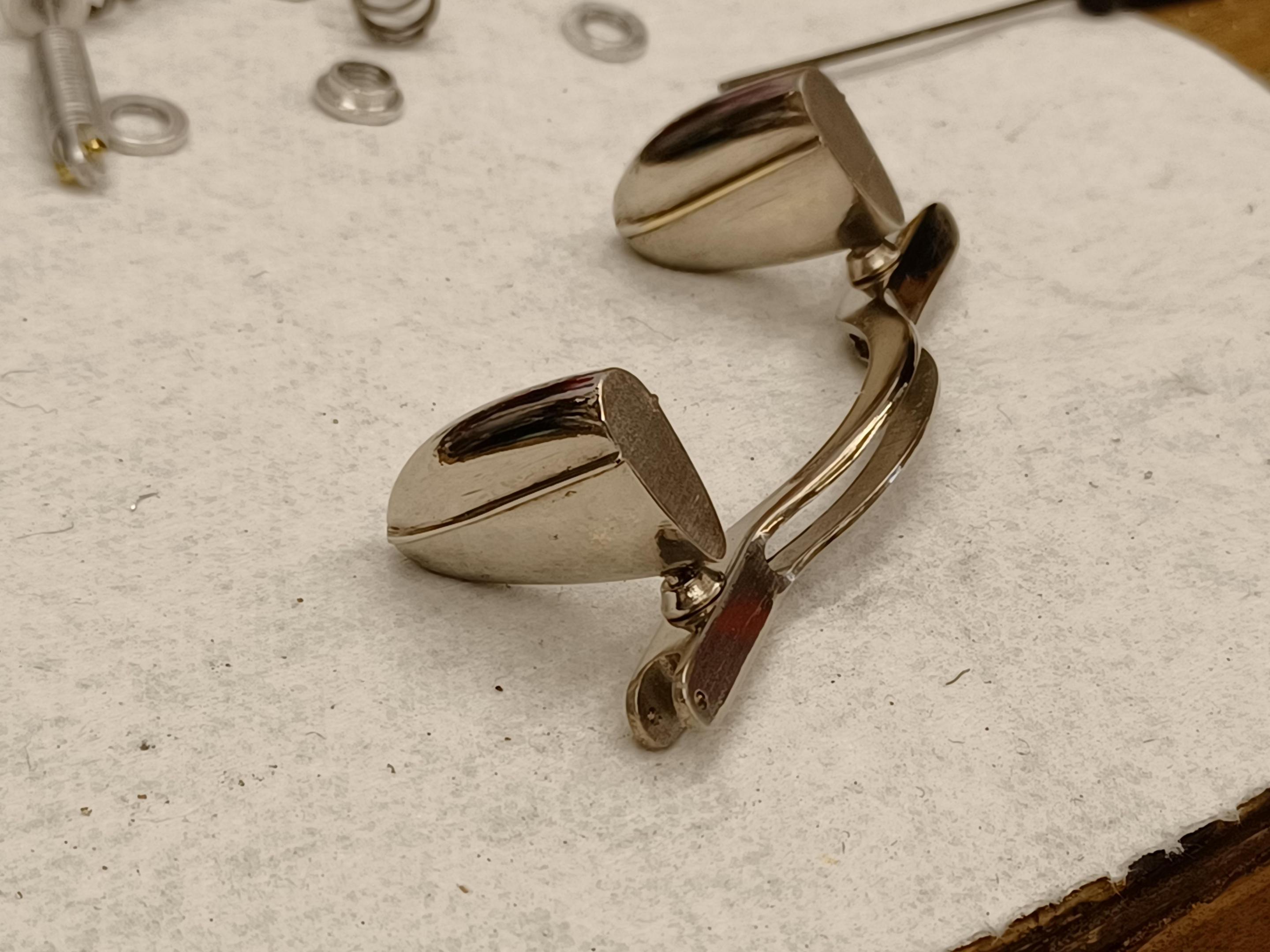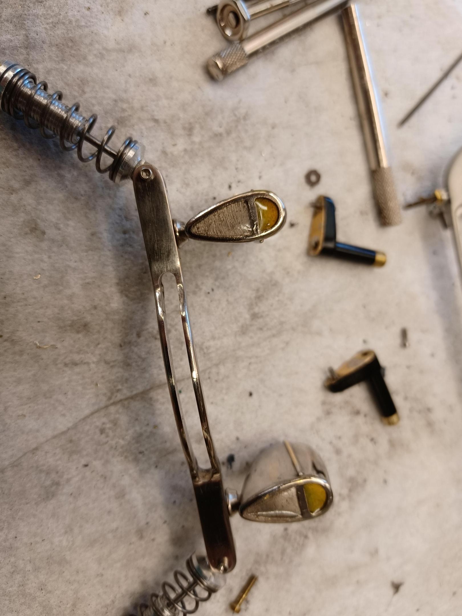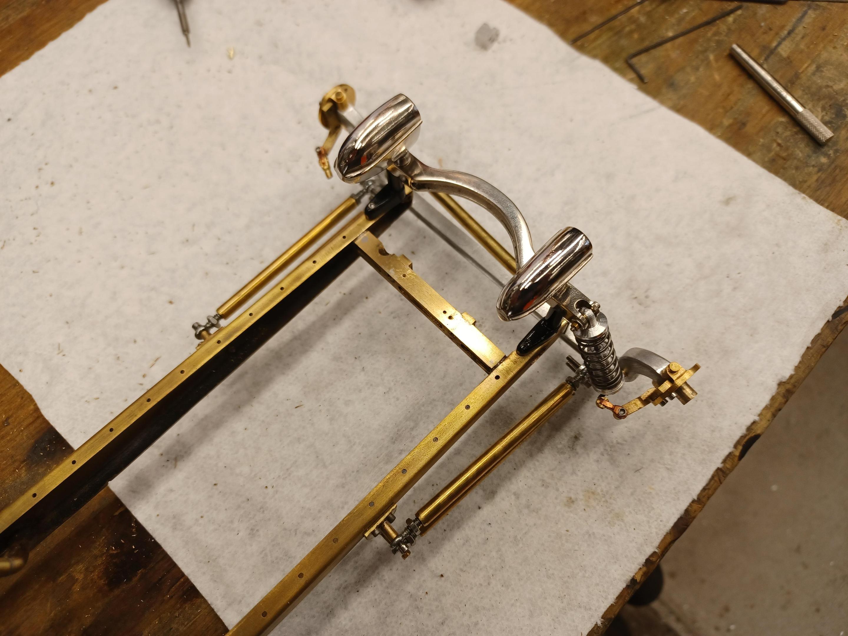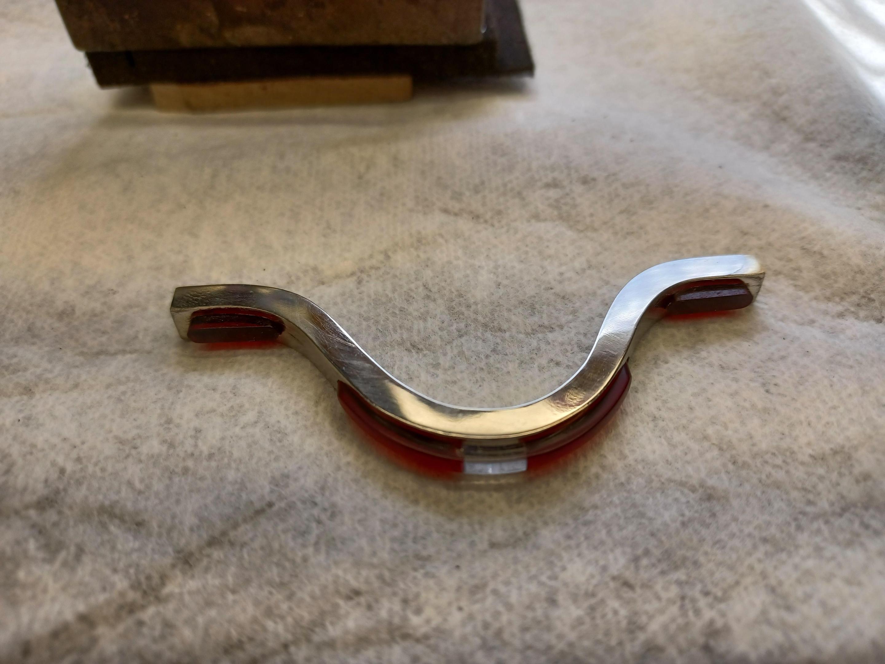 made the lenses for the woolitre headlites.put a yellow lense in top for turn signals.there is a name plate there in the originals.also this week i made a teering wheel. 3 attempts. i nickel plated and polshed the spokesmade 2 molds for the 2 rim pieces and riveted them together. pedas and rear lites are next.then the radiator. hope your new year is going well.