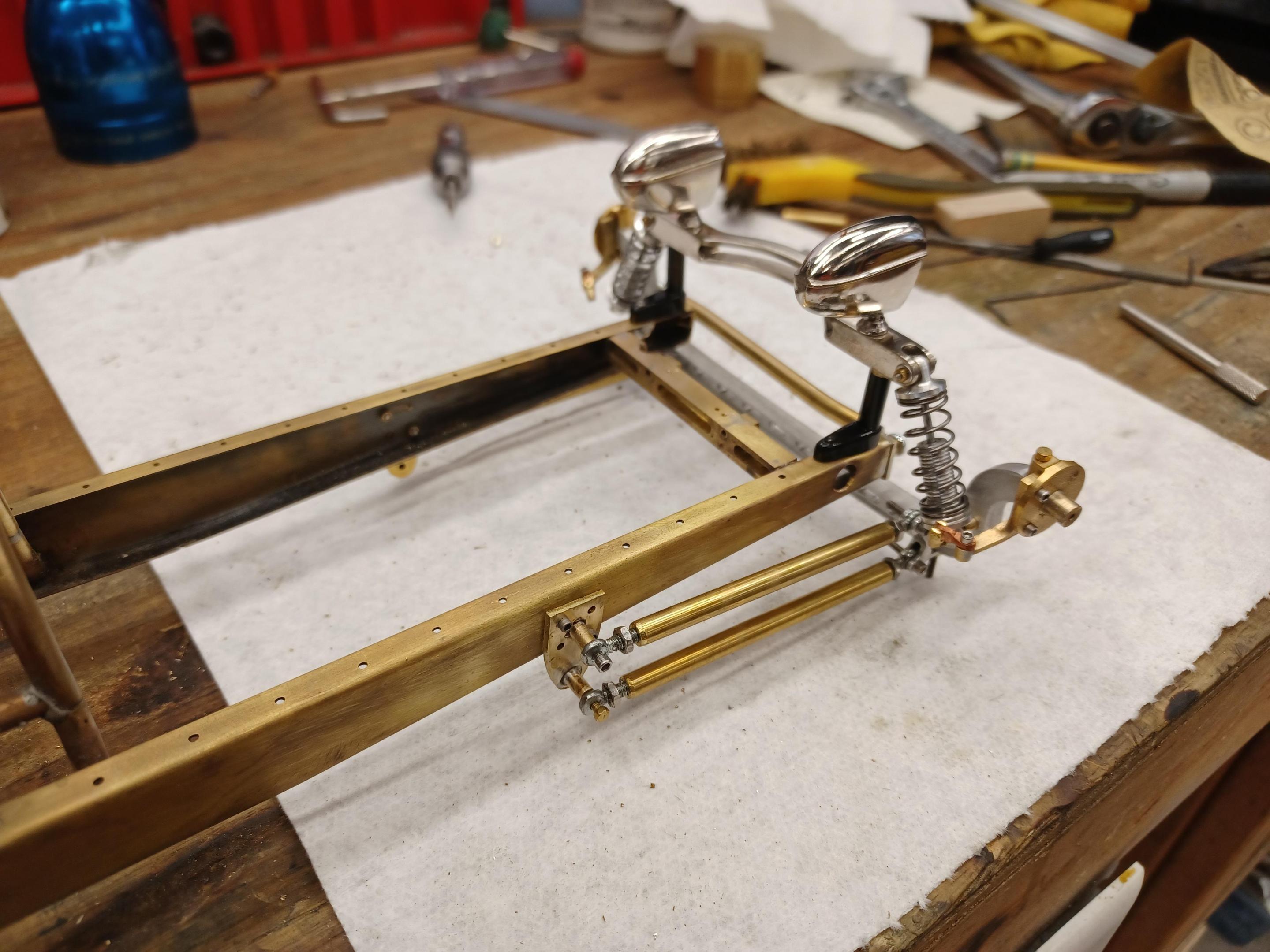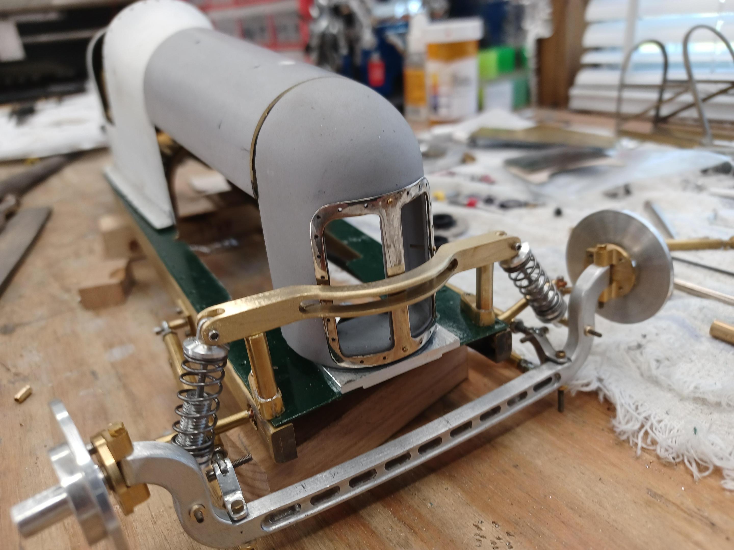 hi noel, he has not had time to finish the car. he owns 2 autobody shops and has been very busy. got some new shocks made for the front and threaded them to make them adjustable. i don't know if any of you has heard of a 1930's aftermarket headlite called woolite headlites. i have allways thought they were very cool and unique so i decide to carve them for this car. the front covers that hold the lenses i have not figured out how to make them yet . the originals have no lite in the top 1/3 but i am going to put the directional in there. i machined a front shock mount and headlite bar.could also be a bumper. am going to nickel plate an polish the bar and the lites. have a happy and prosperous new year.