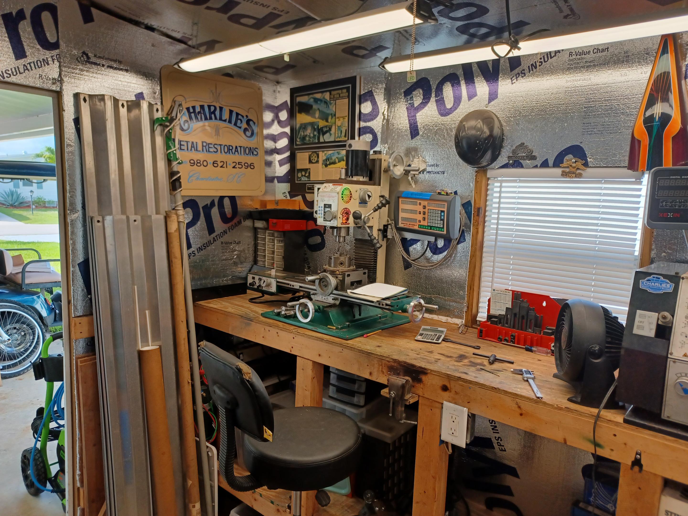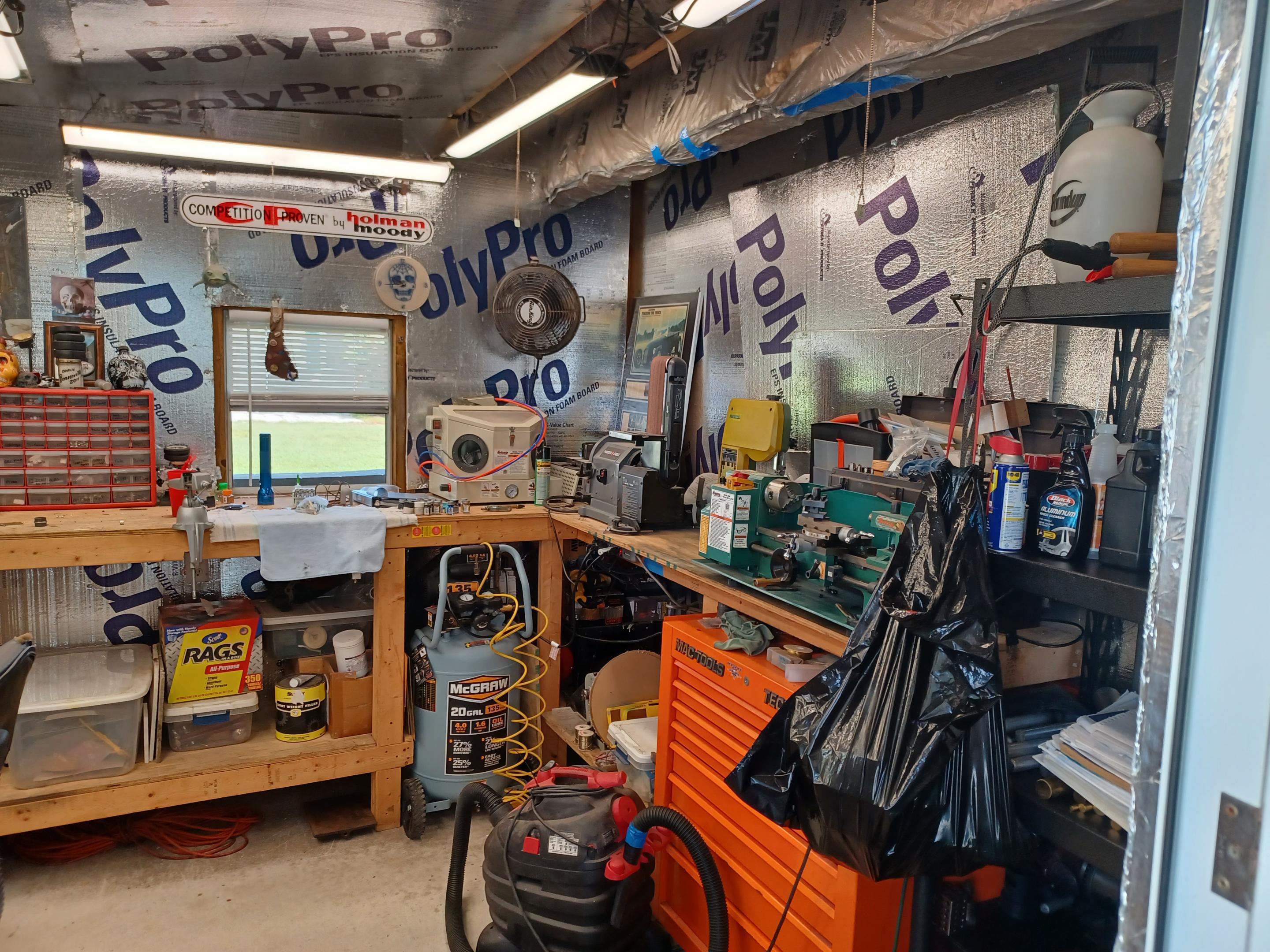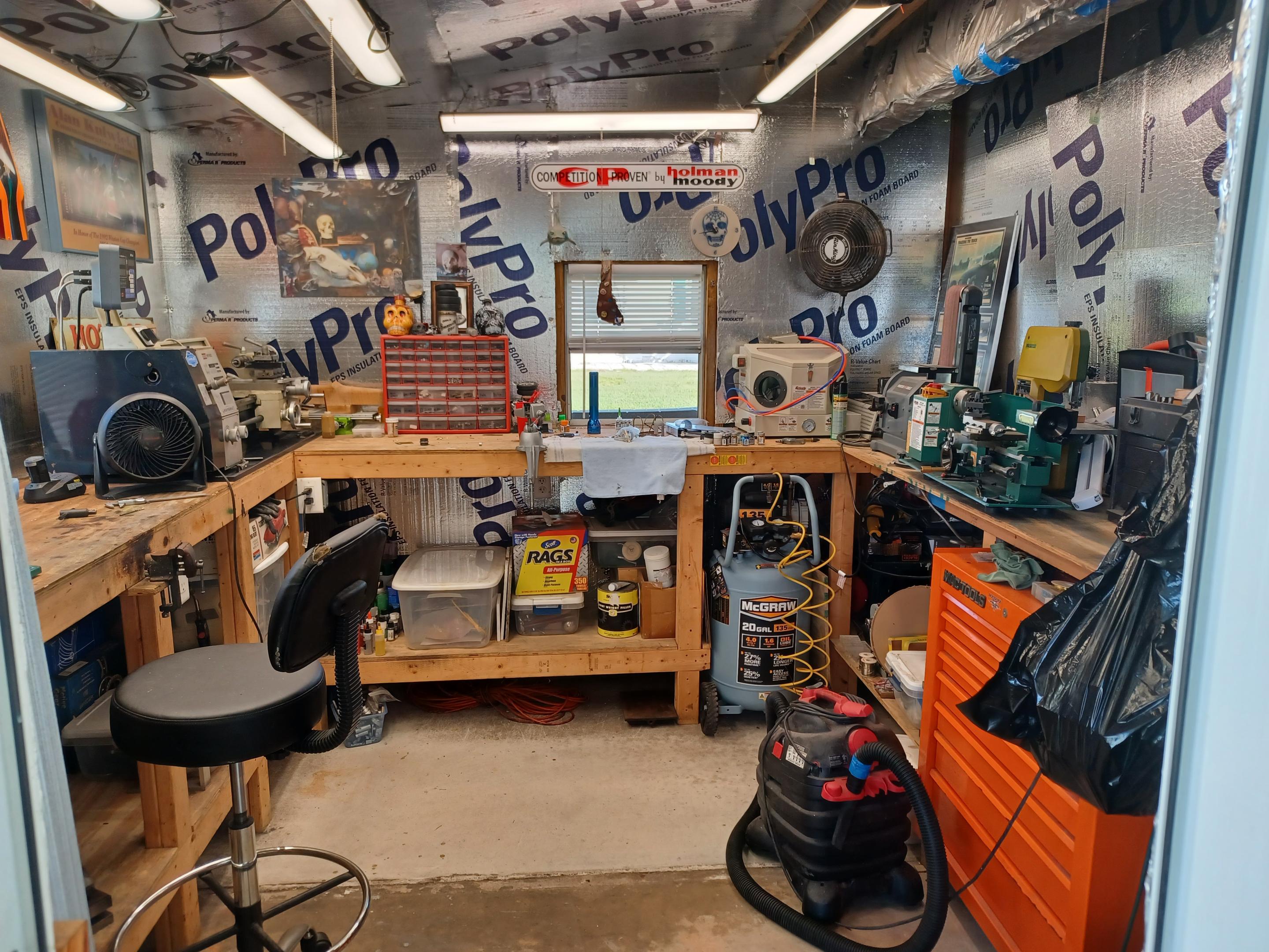 it was 87 here and i wish i had a garage. i work in a 12 by 12 shed atached to my house with no air conditioner. i dont have a thermometer in my shed ,it would make it feel even hotter to know.by 2 or 3 in the afternoon thats about it for the day its pretty hot by then. i really don't mind the heat but cant survive without fans. got the upper water line done toay.it bolts on to the top of the head. nice to hear from you andrew if you are up this way please contact me and stop by to visit. i am thinking about a wall mount ac unit. as you can see the shop is well insulated.thank you for looking