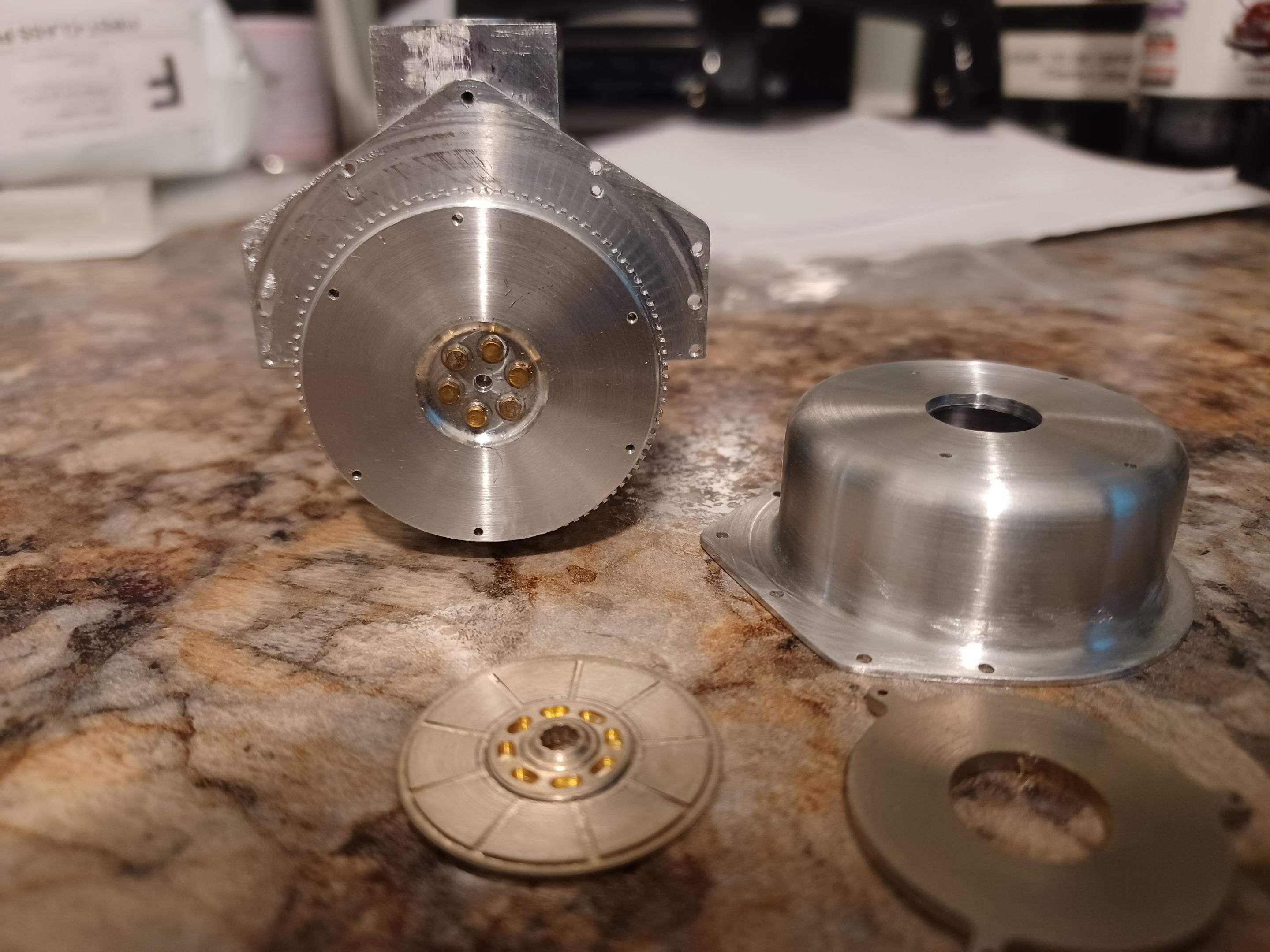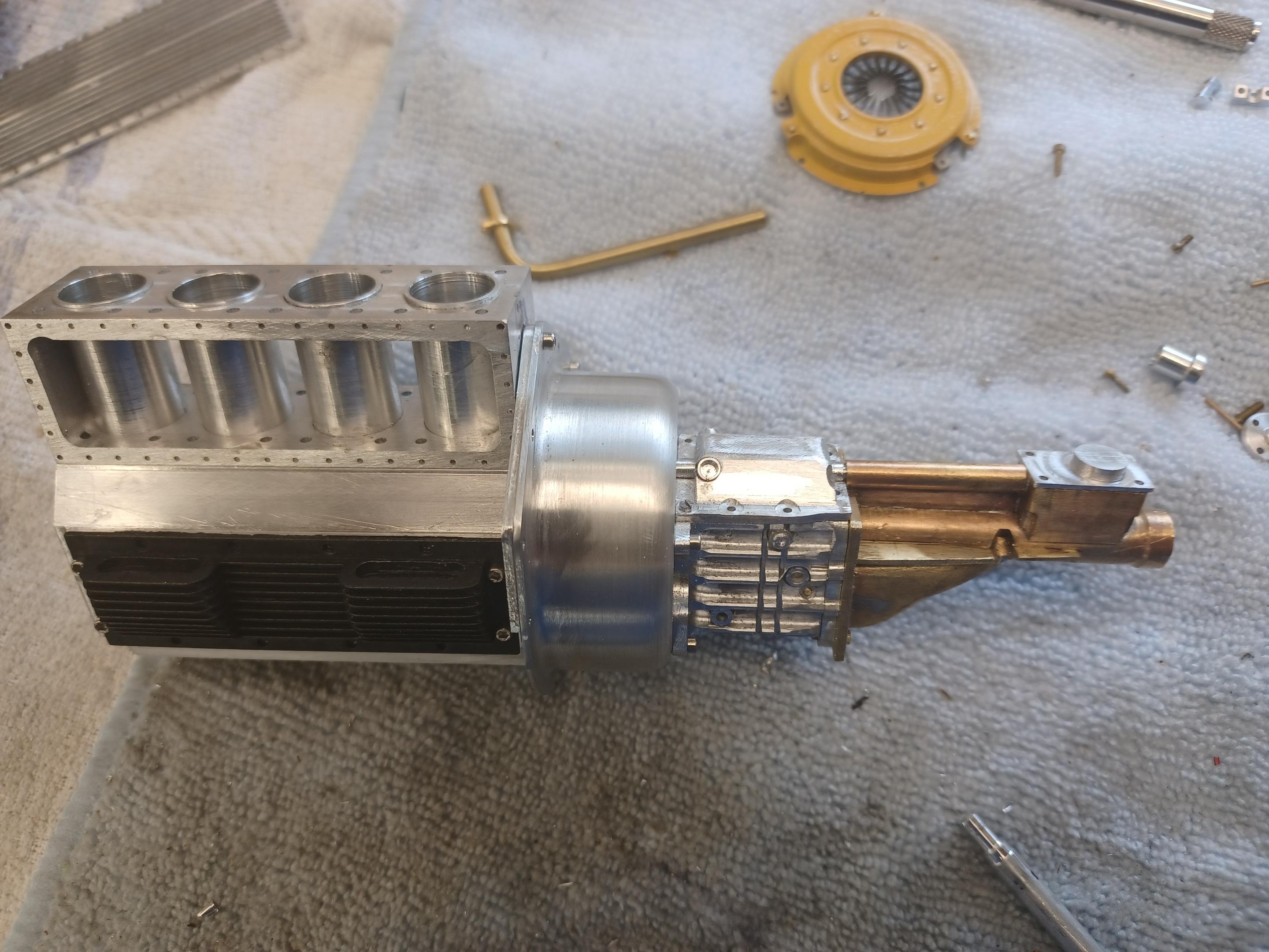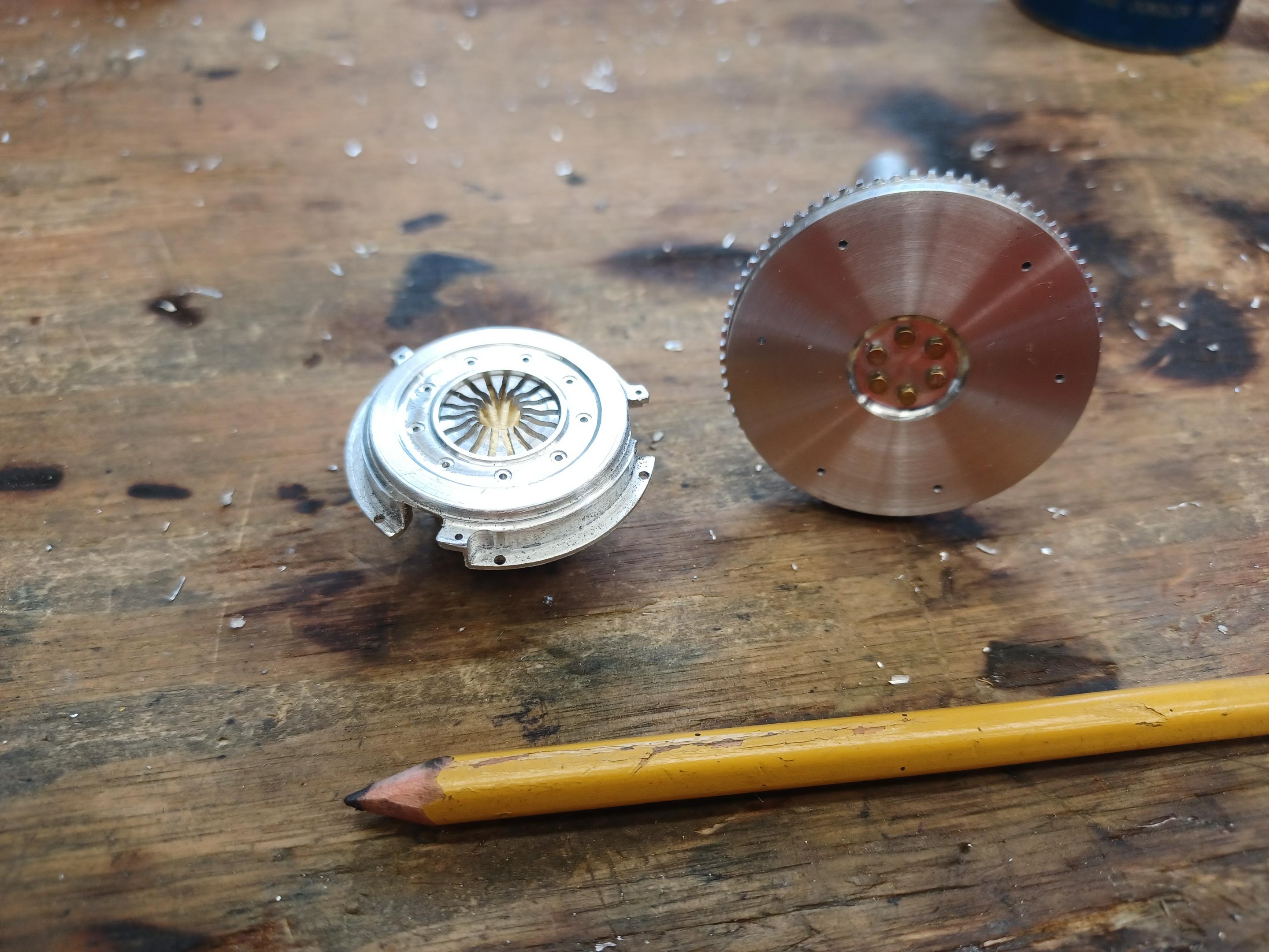 got the clutch finished and most of the bell housing .have to locate and machine for the starter and make the starter. transmission is coming along. had to ues brass for the back half so i could solder all the pieces. not quite done. maybe 2 more days. when the tans is done i will final finish all the parts and assemble it all to make sure it all fits together.