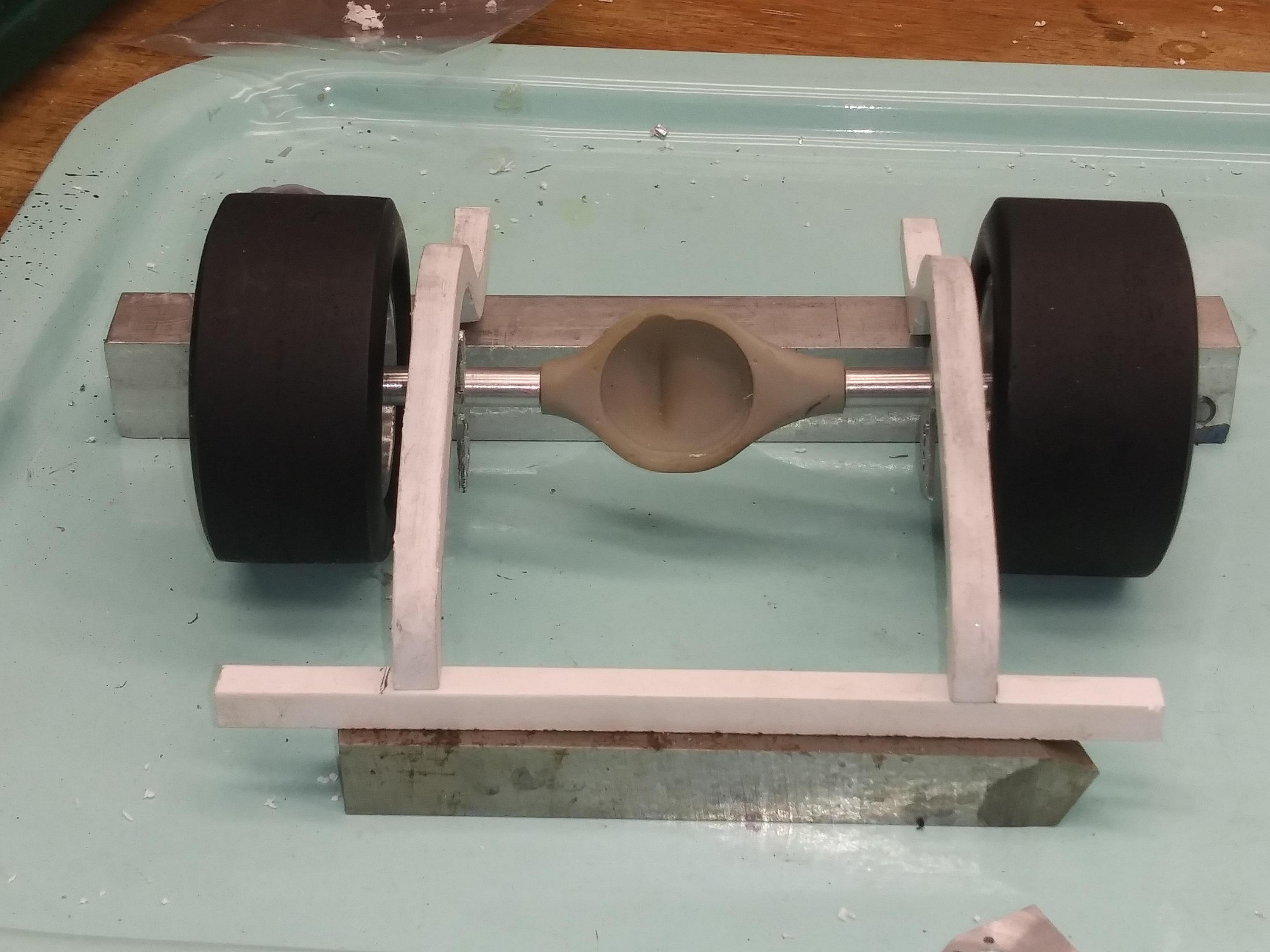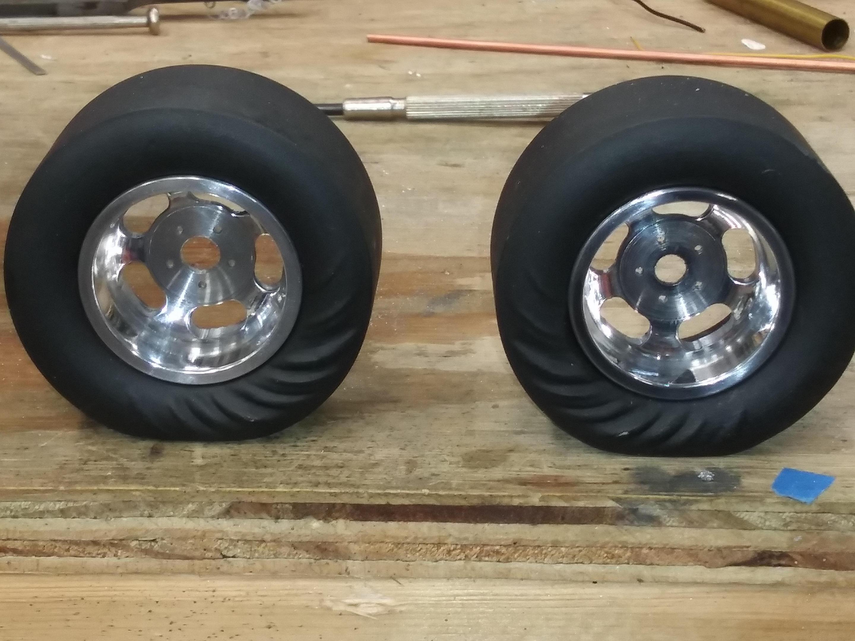 having to much fun with this mustang,got to get back onthe corvette.metal foil on the trim and glass is about it.could not find what i wanted for front tires so i machined a pair .i hope they look ok .now the wheels.going to be the same as the rears only alot skinnier.i used delrin plastic for the tires ,delrin machines so nice. -