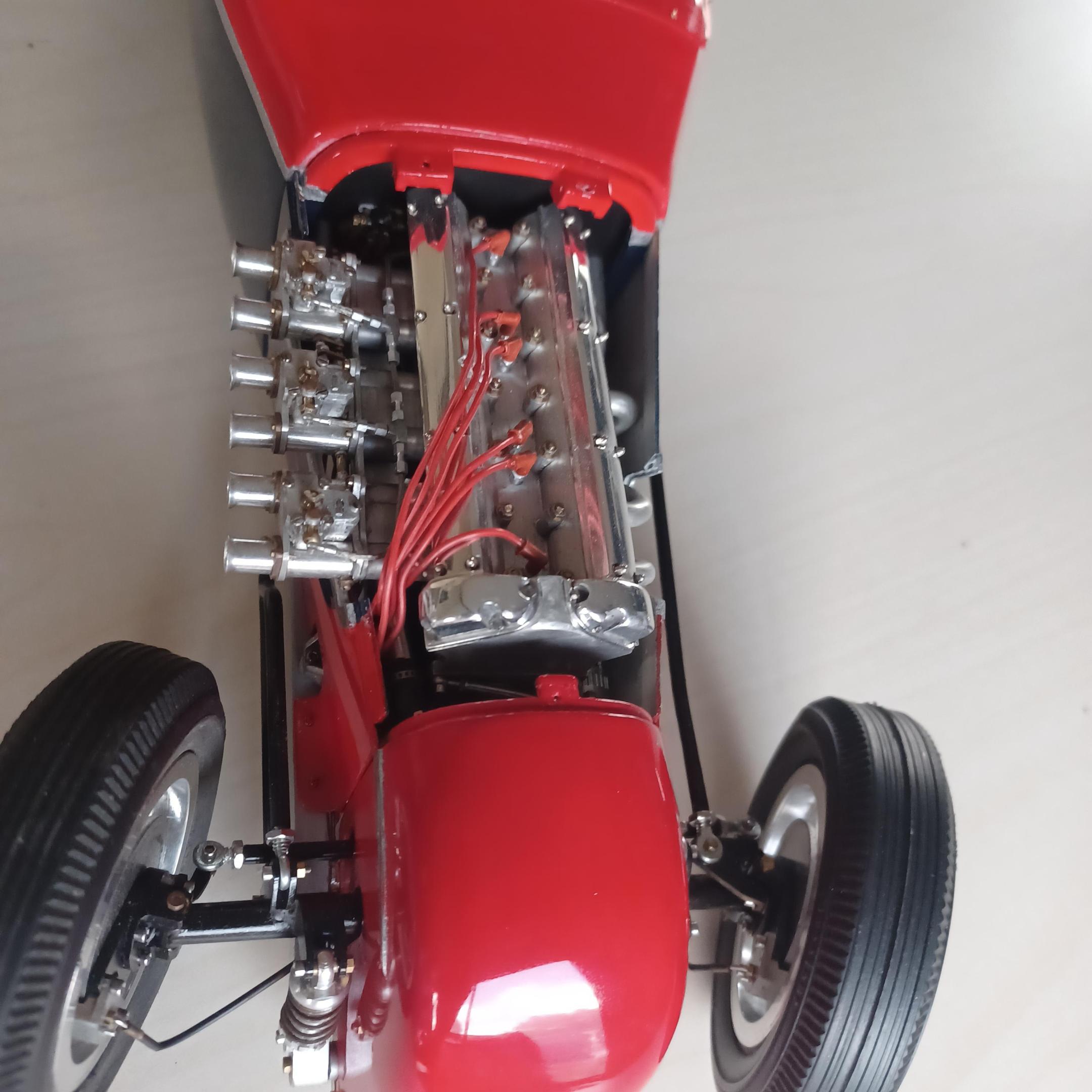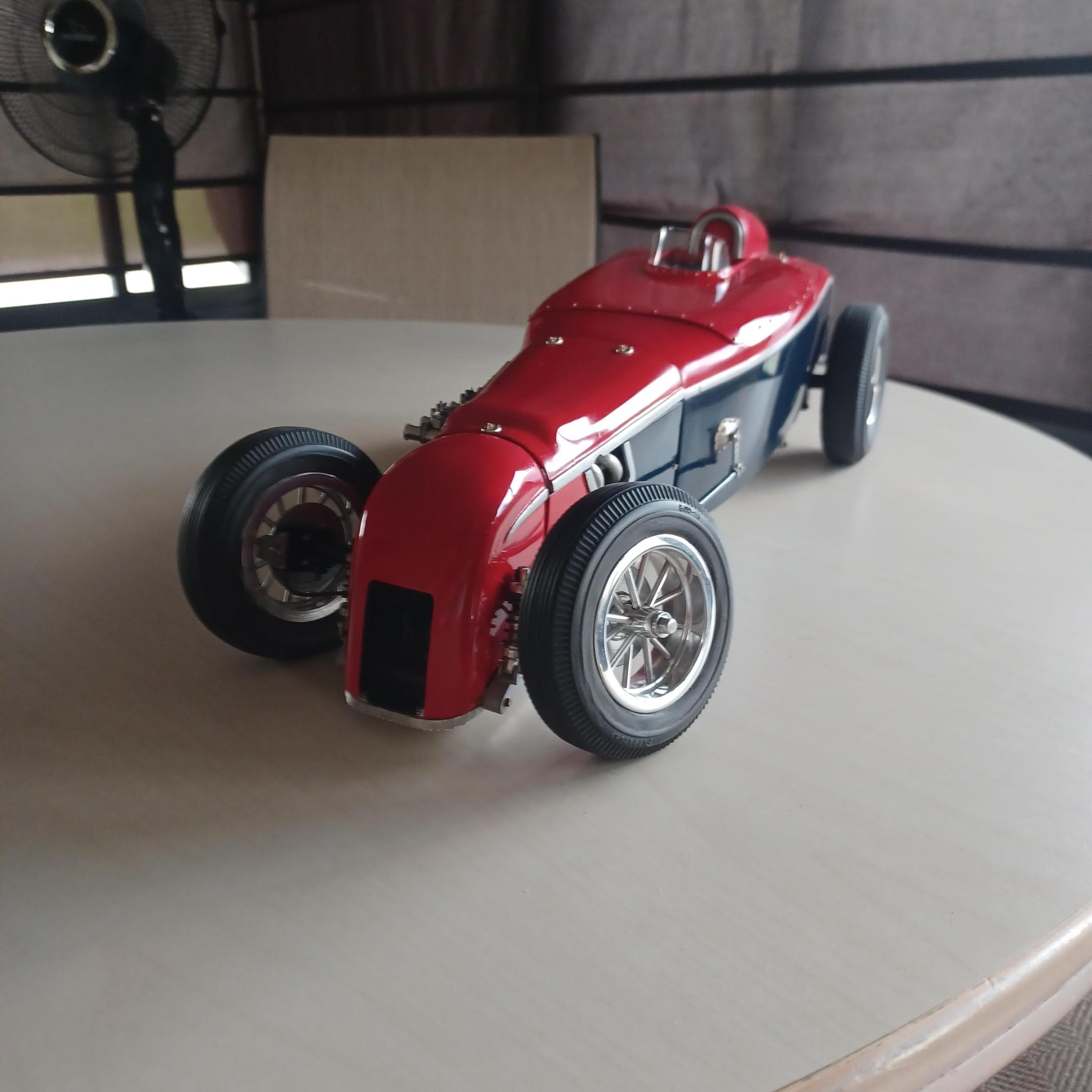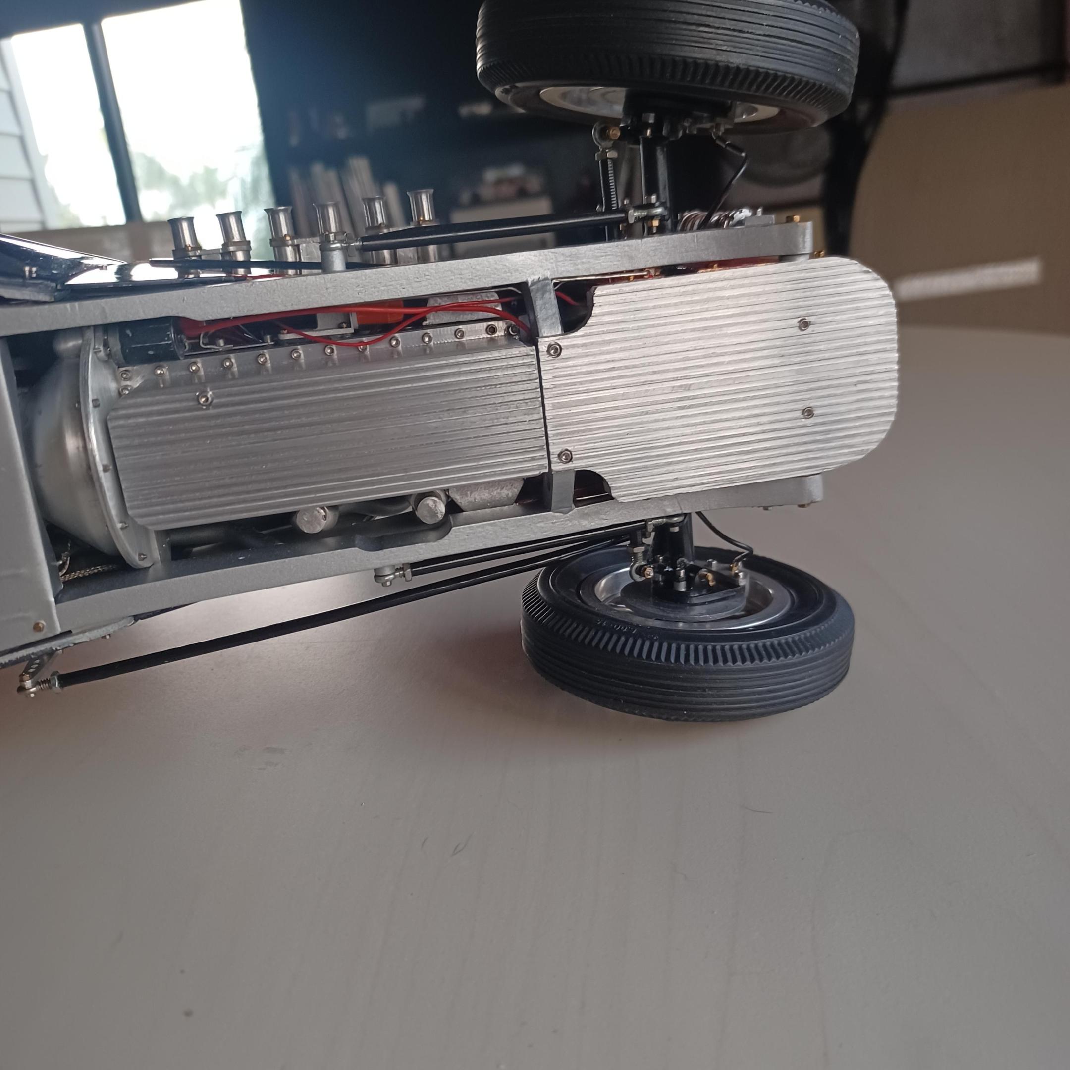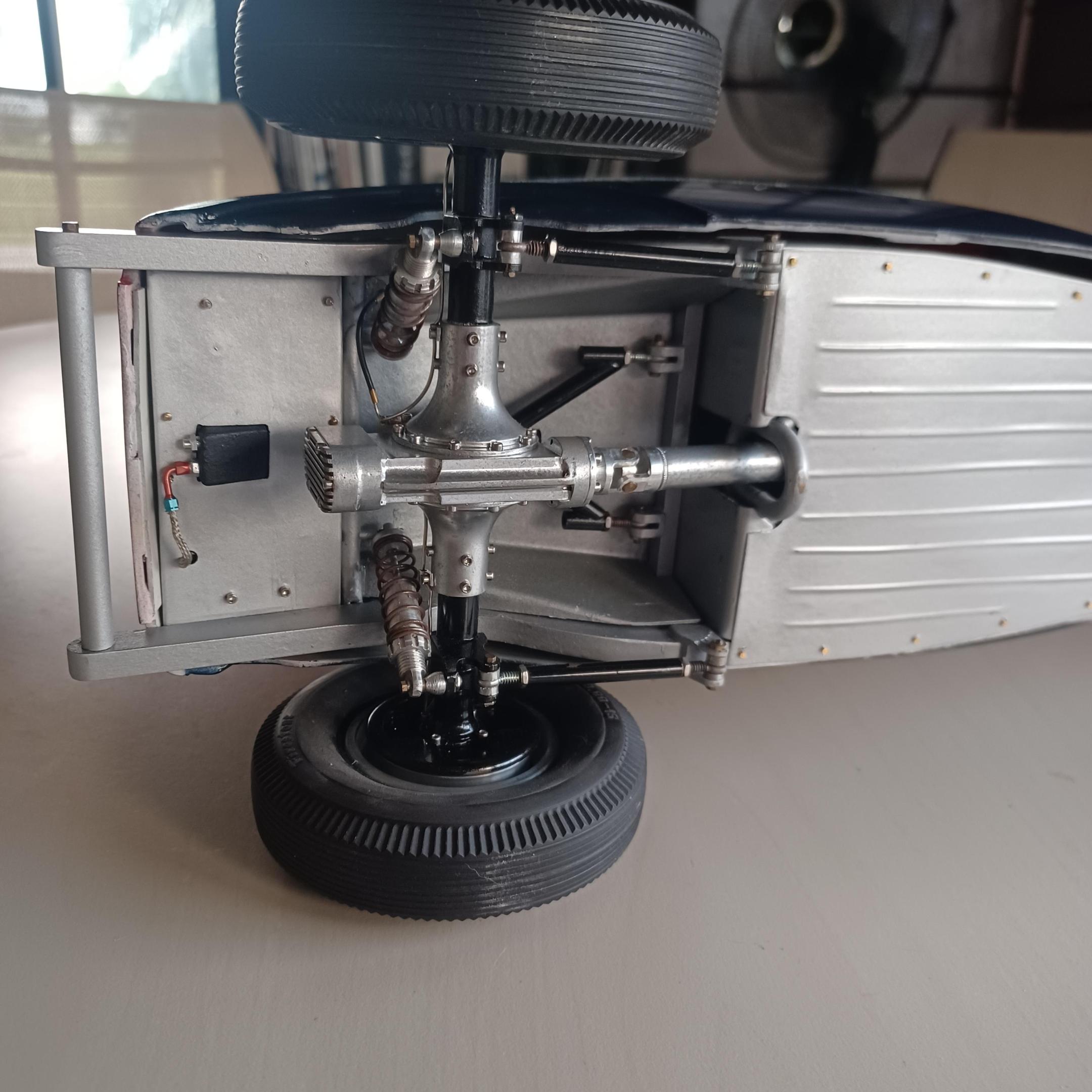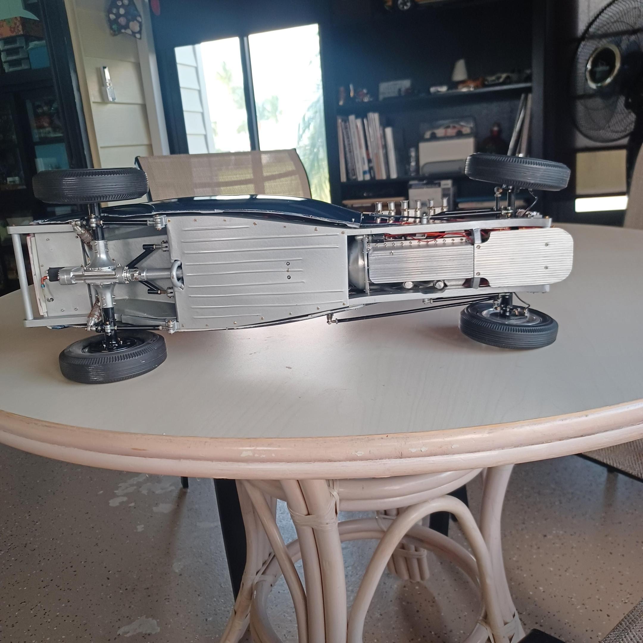 here is a couple of pictures of the offy i did two projects ago. i thought maybe the supercharge engine. the miller 91 scales to 6.25 inches not including the supercharger on the back or the distributer on the front. dont have enough room. since this has never been a real car how abought a six cyl. supercharged offy or miller, same thing? got the 2 front wheels assembled. got to anodize them tomorrow, and install the wires. andrew allan and john,thanks for your inout,greatly appreciated. also working on the front suspension as well -