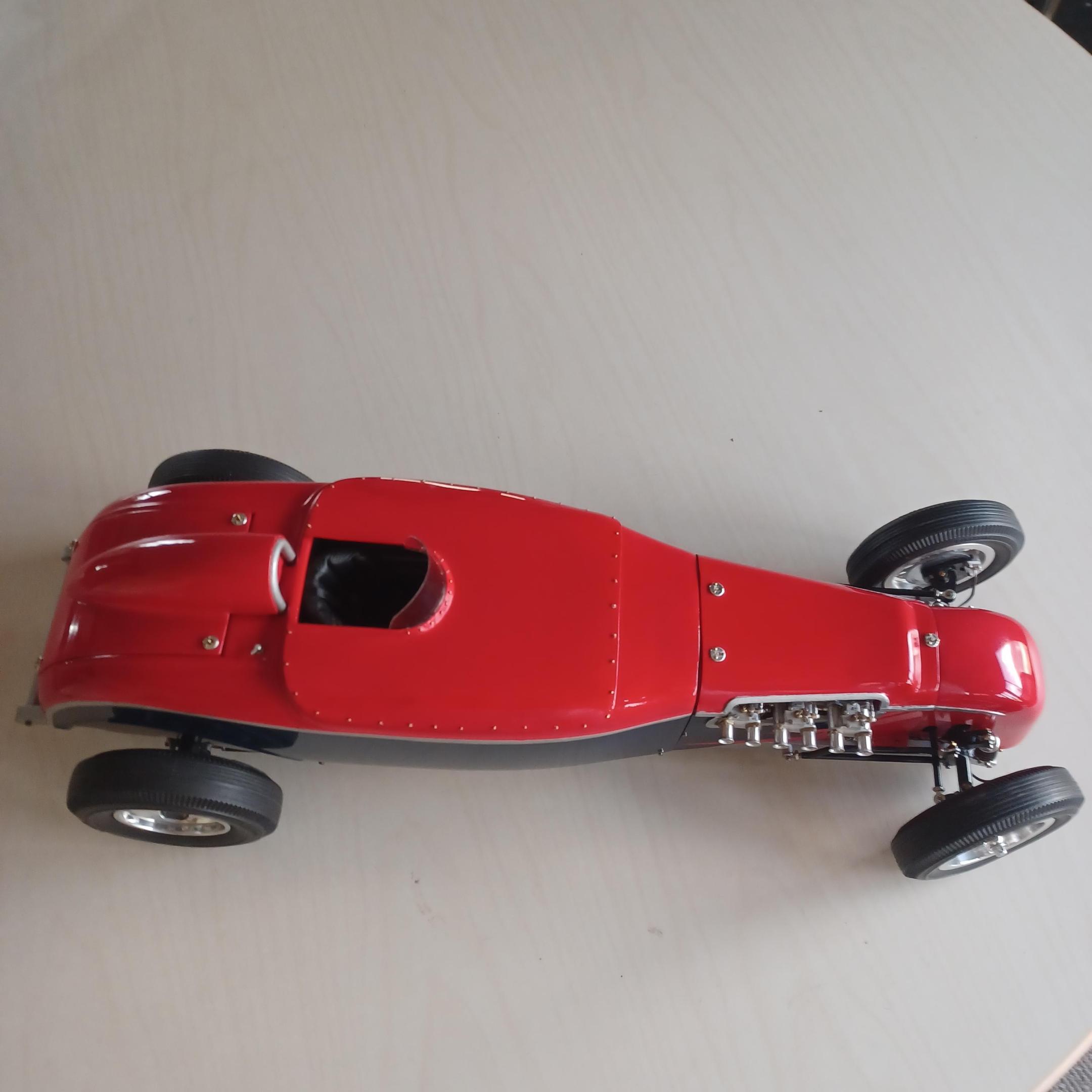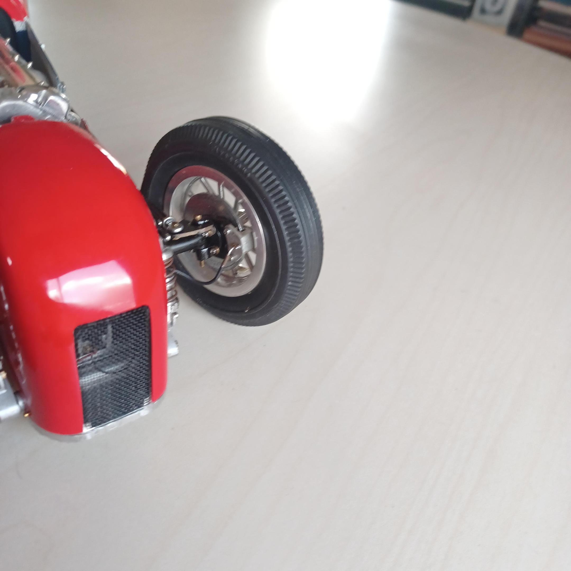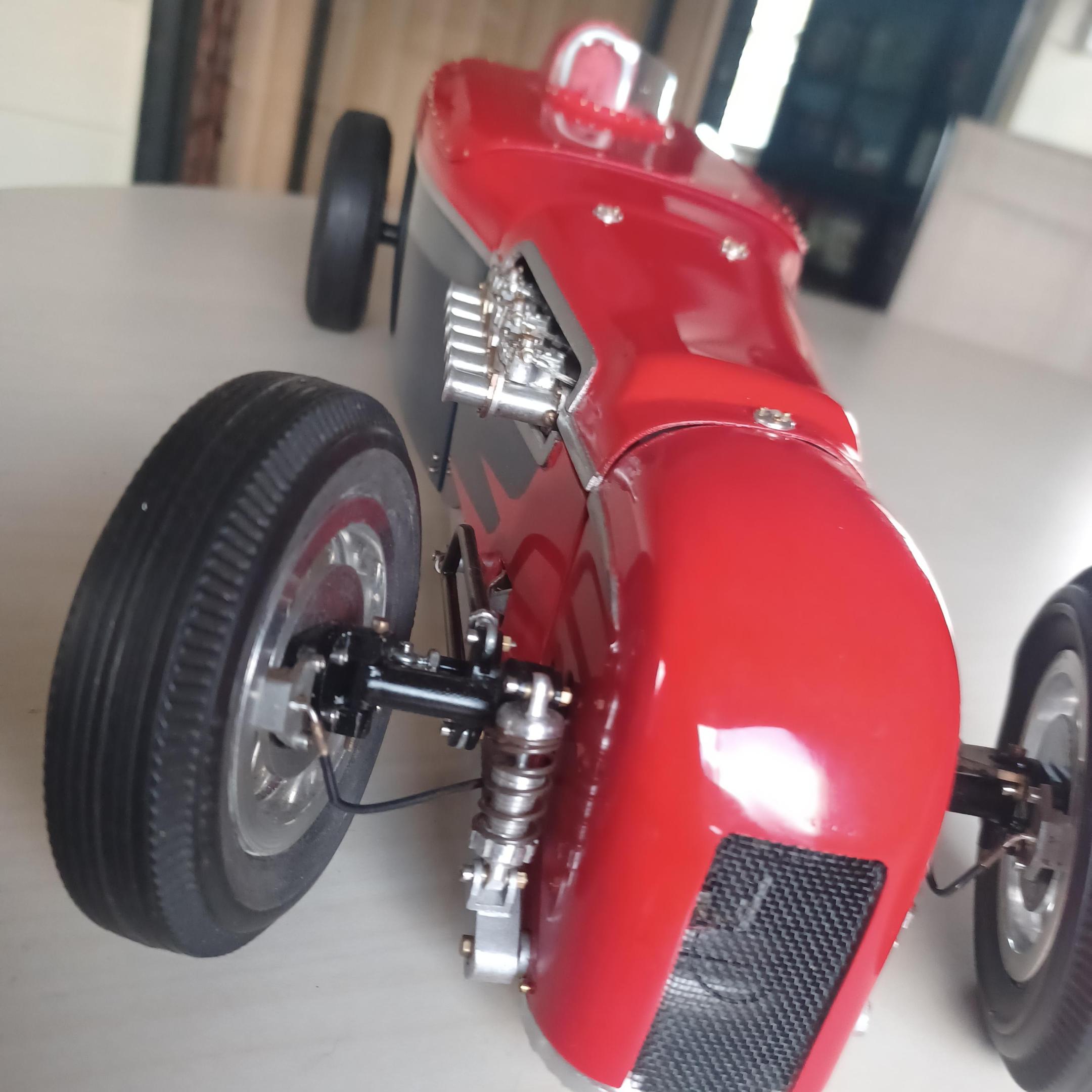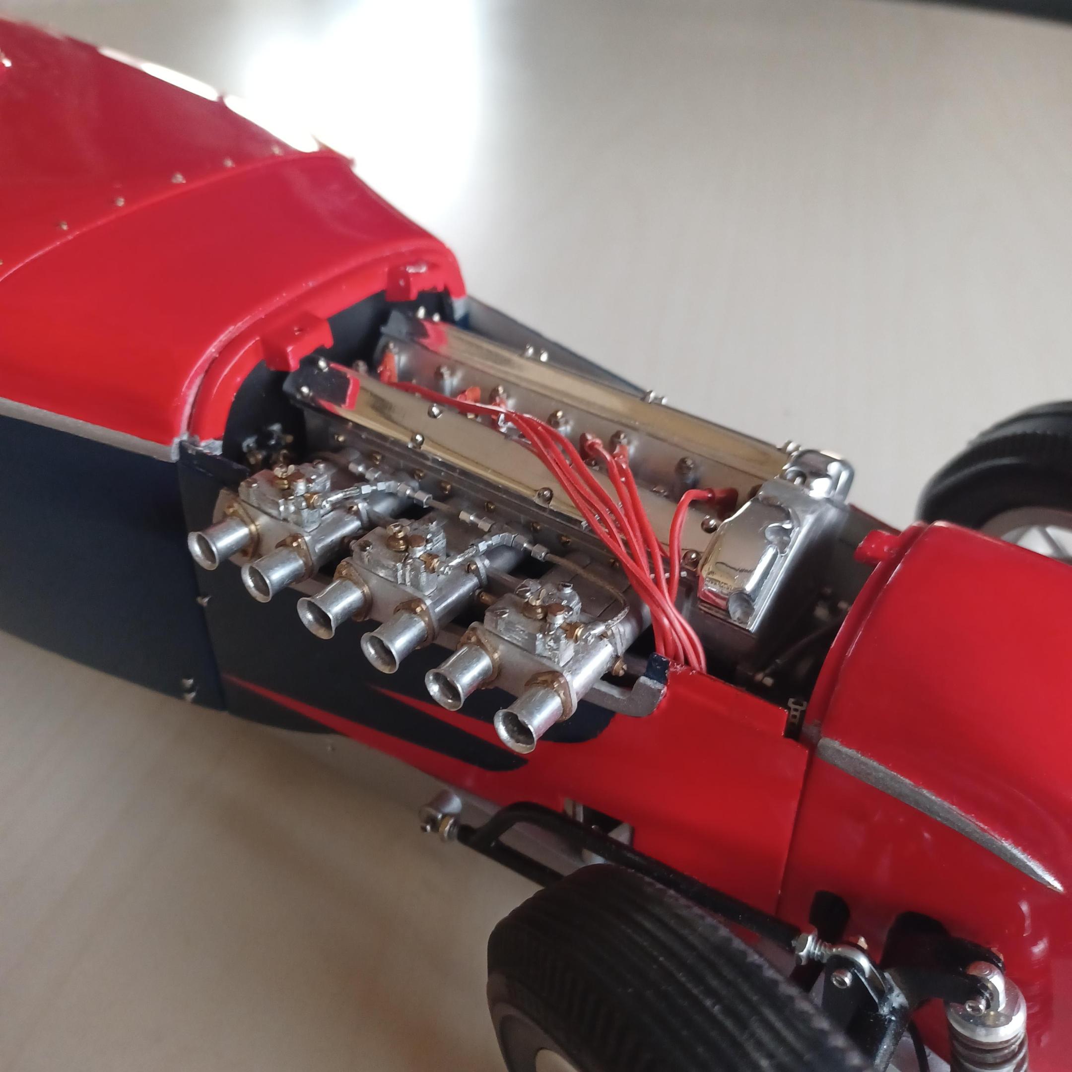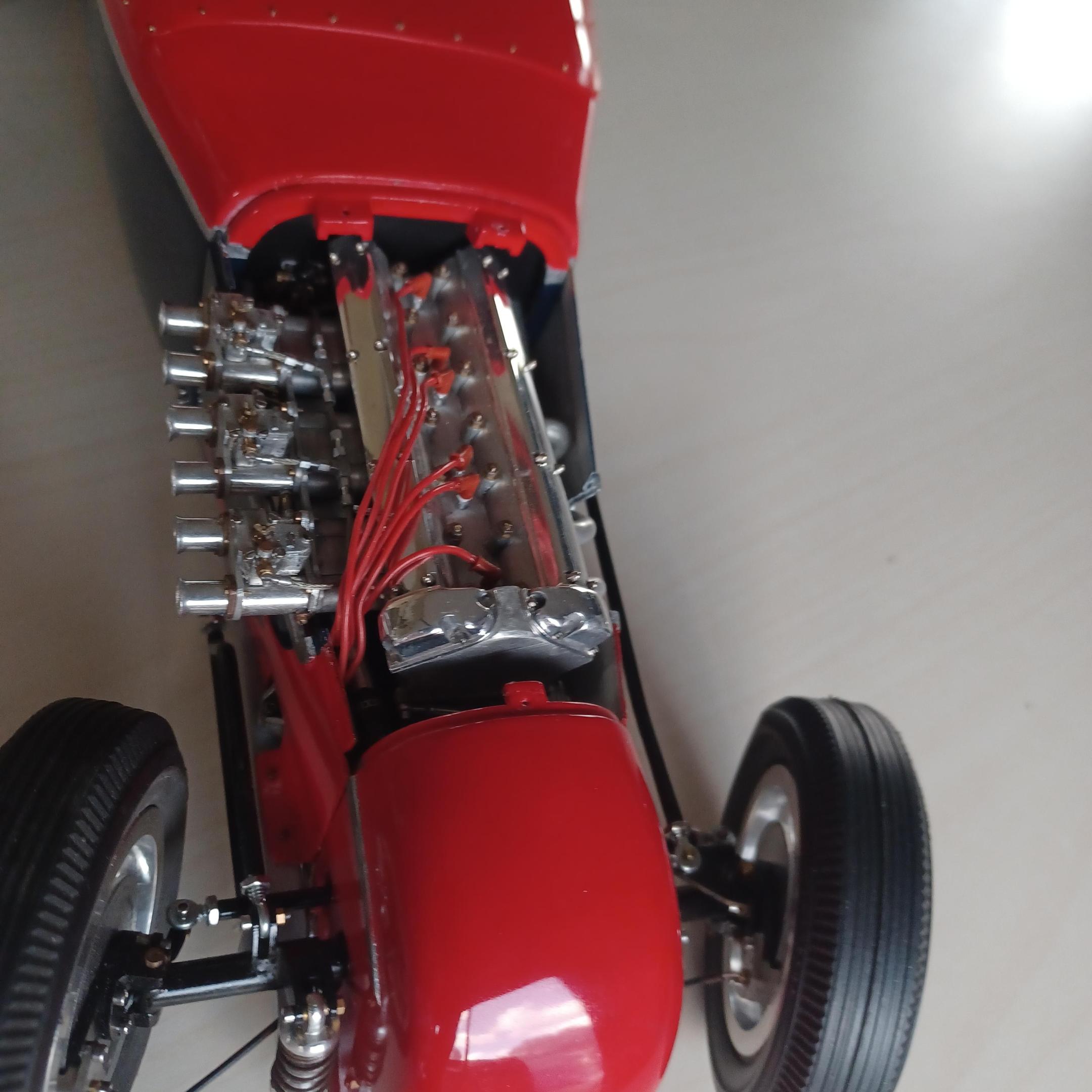 here is a couple of pictures of the offy i did two projects ago. i thought maybe the supercharge engine. the miller 91 scales to 6.25 inches not including the supercharger on the back or the distributer on the front. dont have enough room. since this has never been a real car how abought a six cyl. supercharged offy or miller, same thing? got the 2 front wheels assembled. got to anodize them tomorrow, and install the wires. andrew allan and john,thanks for your inout,greatly appreciated. also working on the front suspension as well -