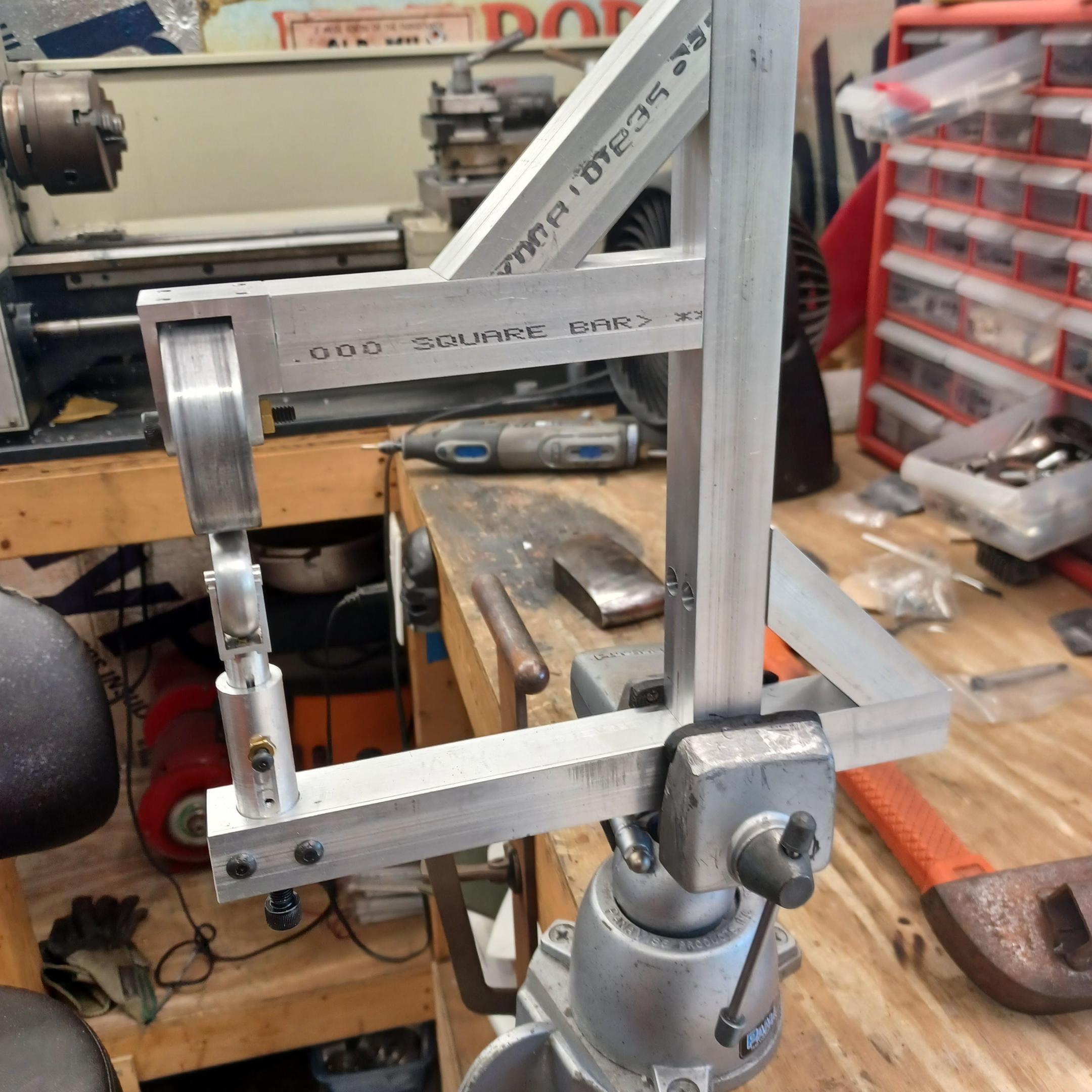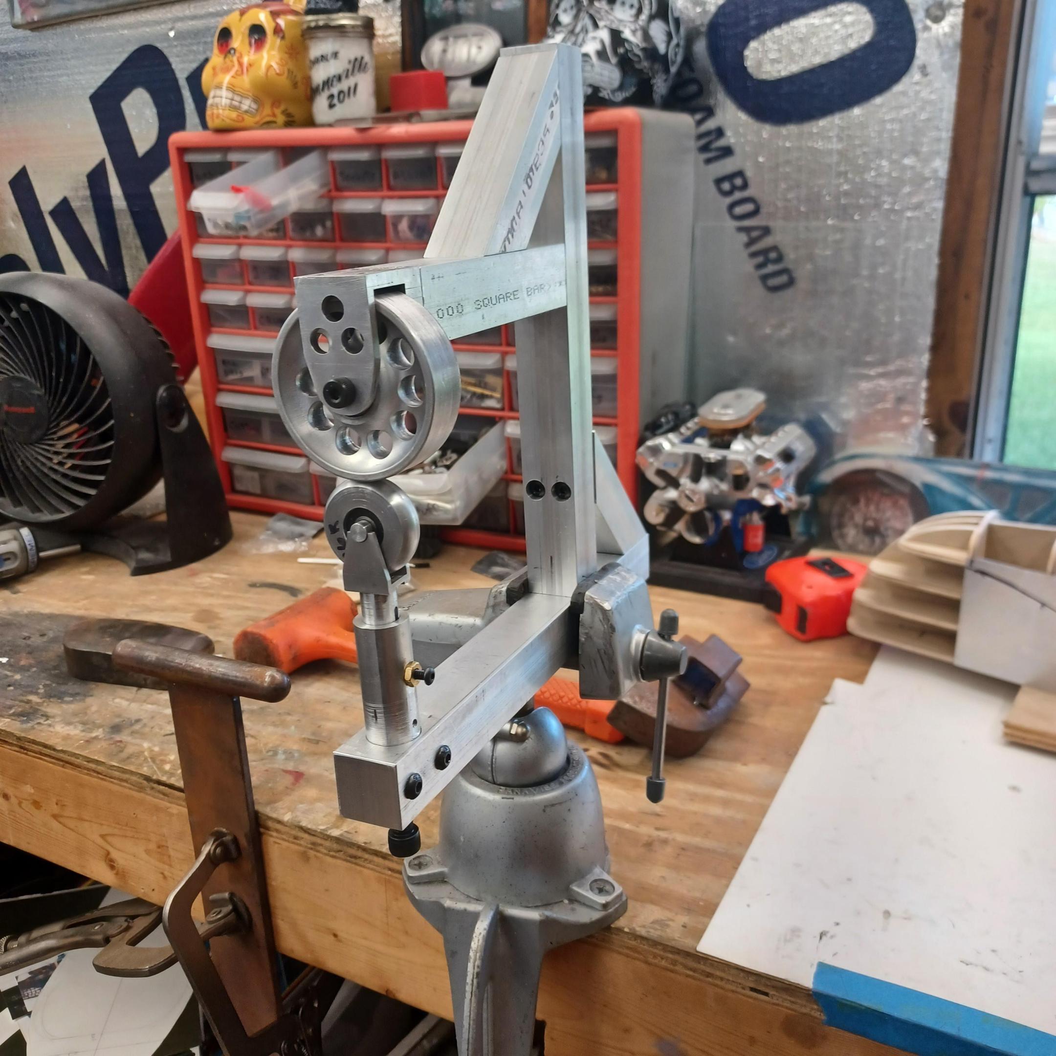 got the English wheel up and working i might make a minor design change but i used it quite alot today and it seems to work quite well. better than expected. got the main part of the body buck complete and started on the rear portion of the car. i will do the bottom of the rear and then the sides. the aluminum side was just to try the wheel. i am going to try the back section in aluminum to see if i can solder with out destruction. -
