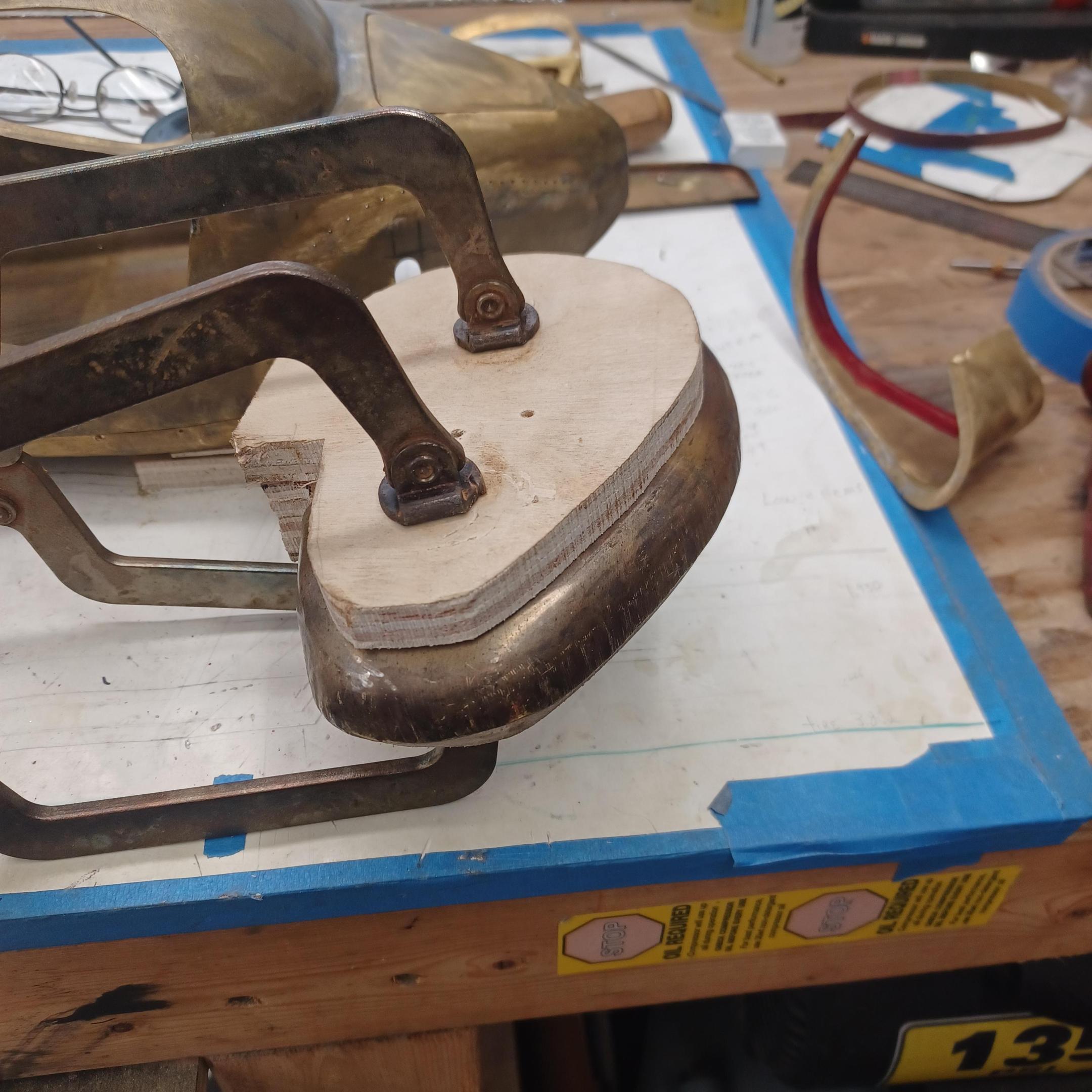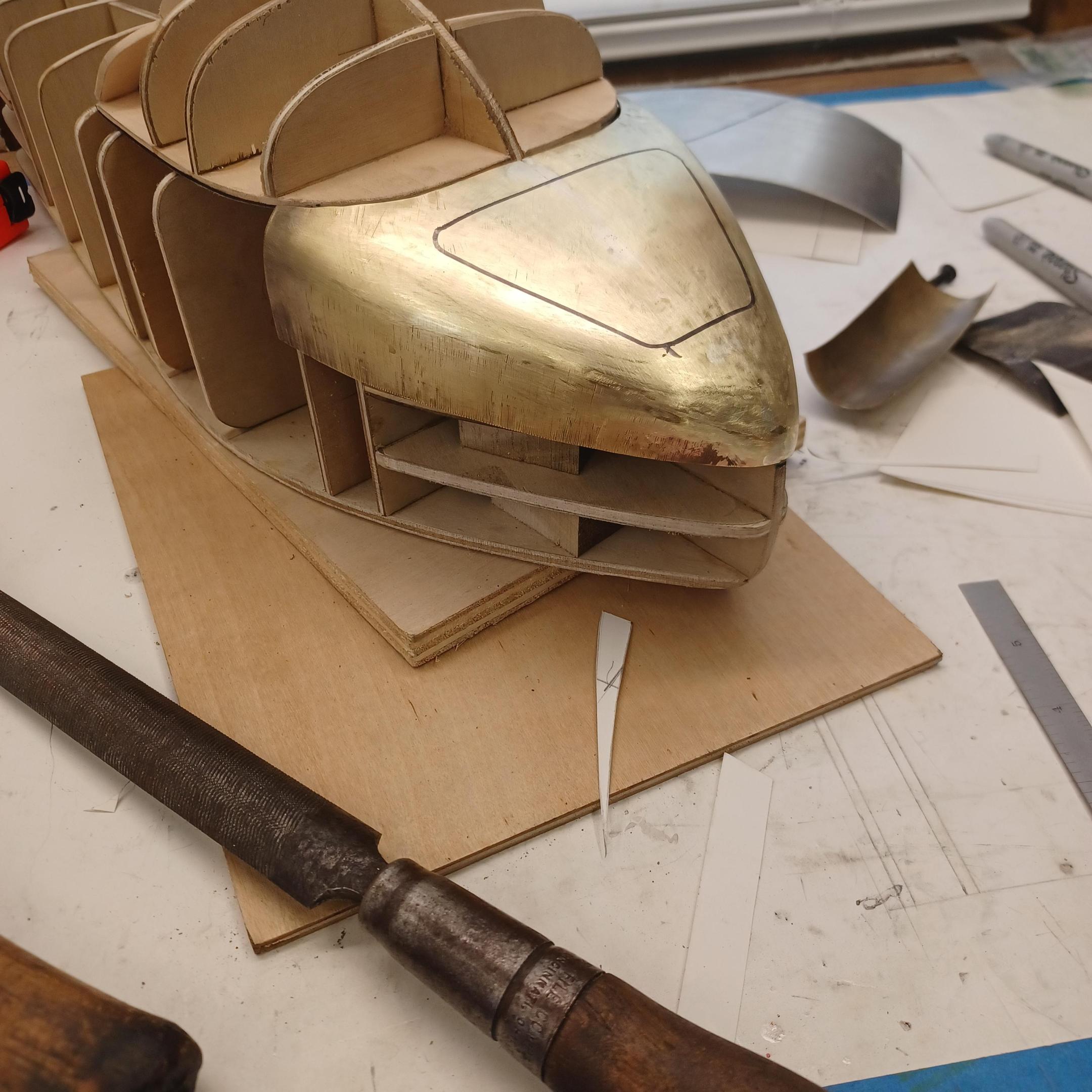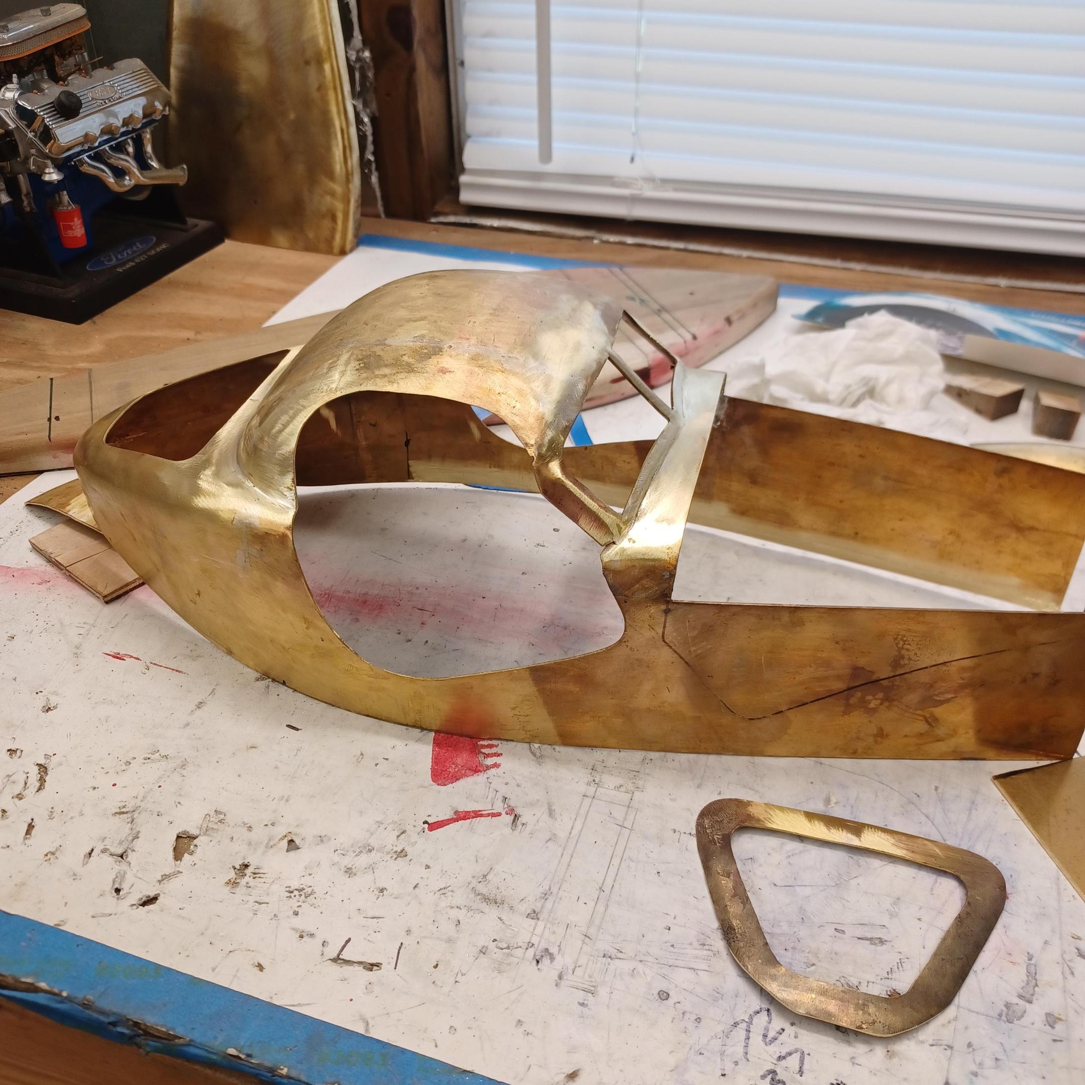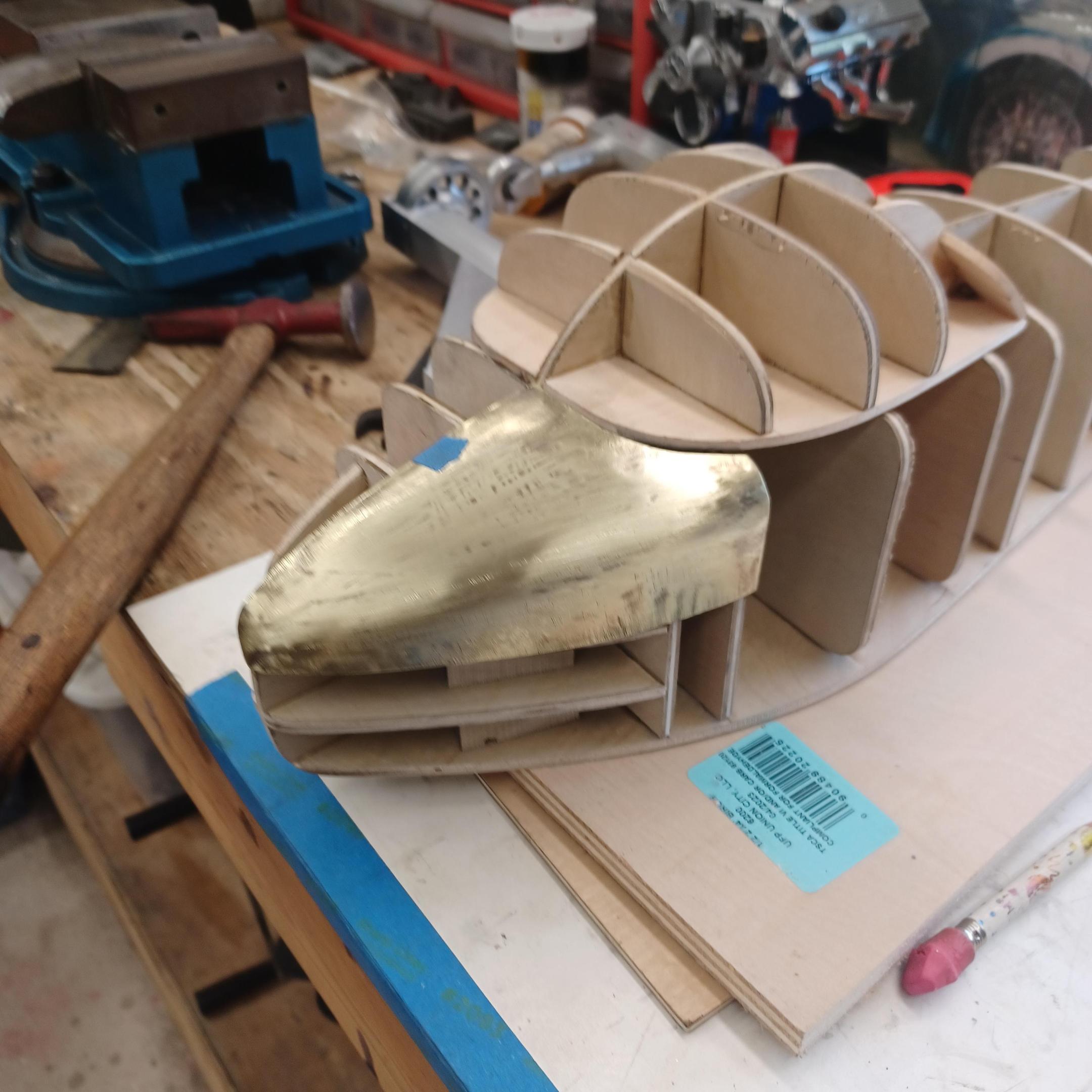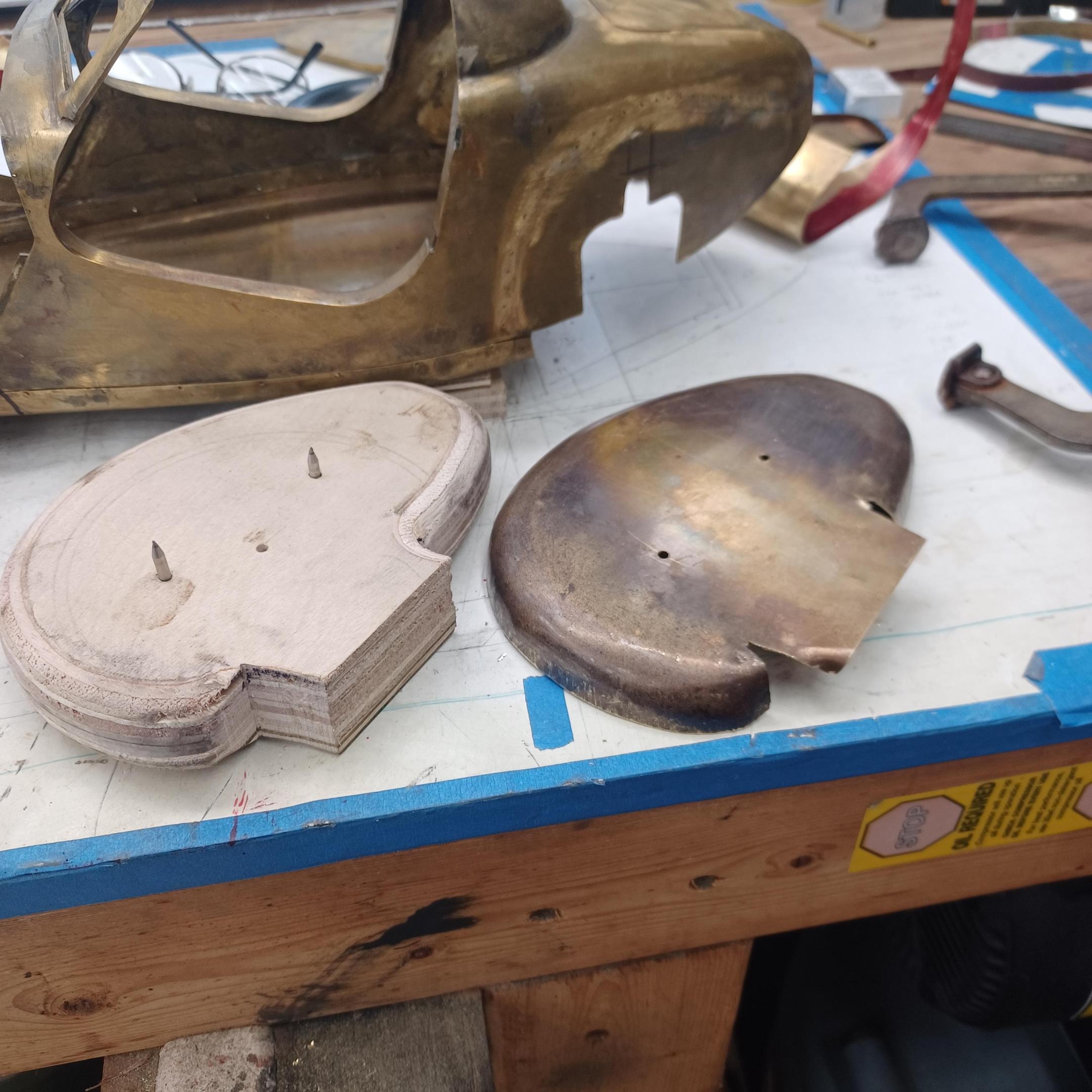hi mark , i have made spoke wheels before but these will be difficult. machining the angles for the spokes will be the tough part. i went to work on the rear fender today. as you can see i completed wooden buck and it looked about right. i started one half of the left rear and i think it came out pretty good so far. i did not notice that i was almost out of brass Sheetmetal so i ordered more today. this is going to take a large amount of brass to finish. here is a few pictures of the hammerform and the fender half . when i do the other half they will be silver soldered together. it took about 2 hours of hammering and had to be annealed 3 times. -
