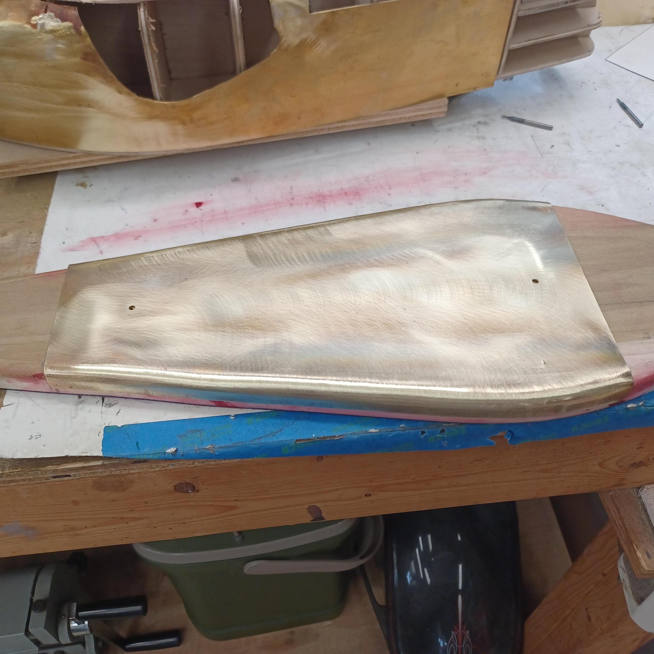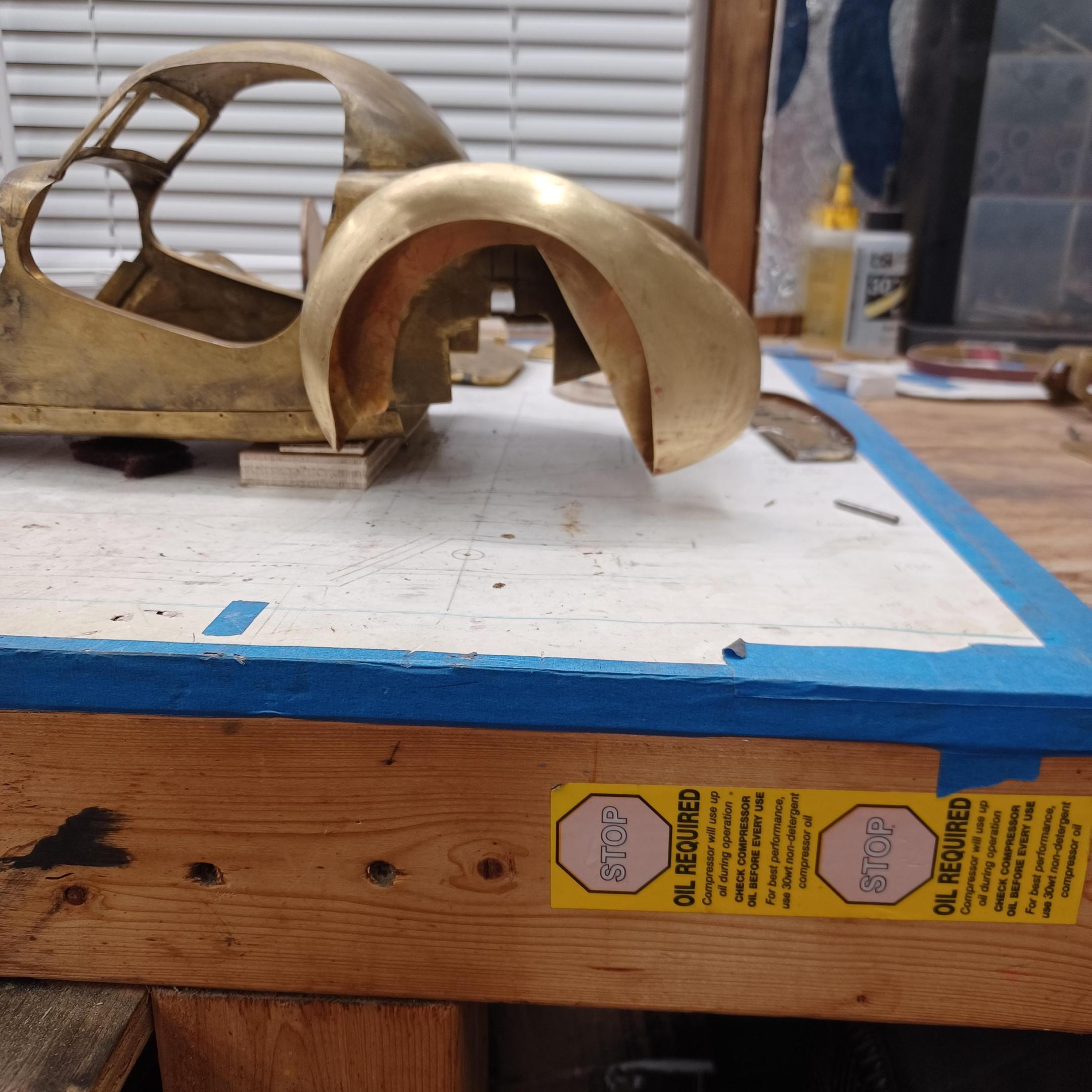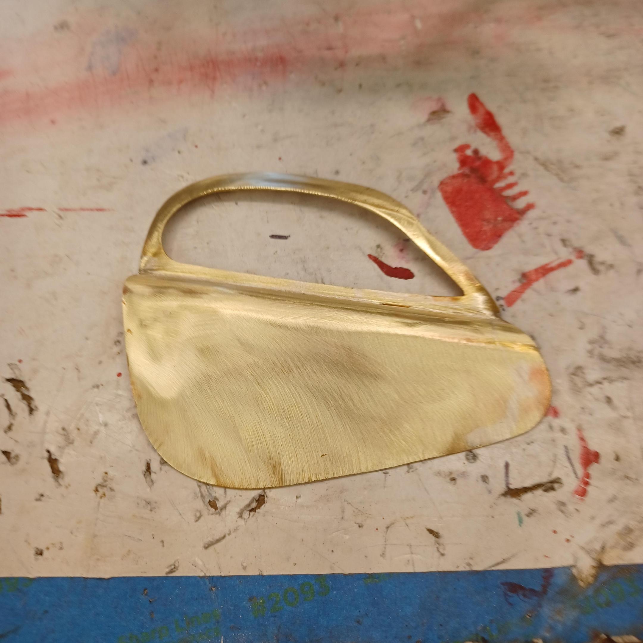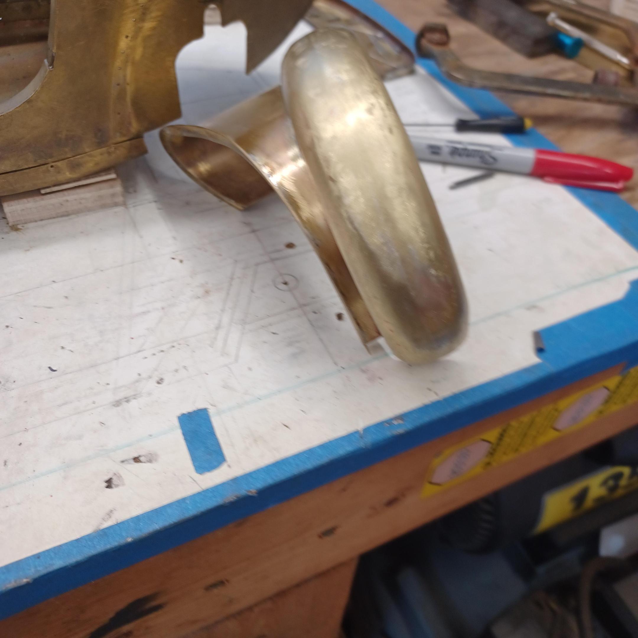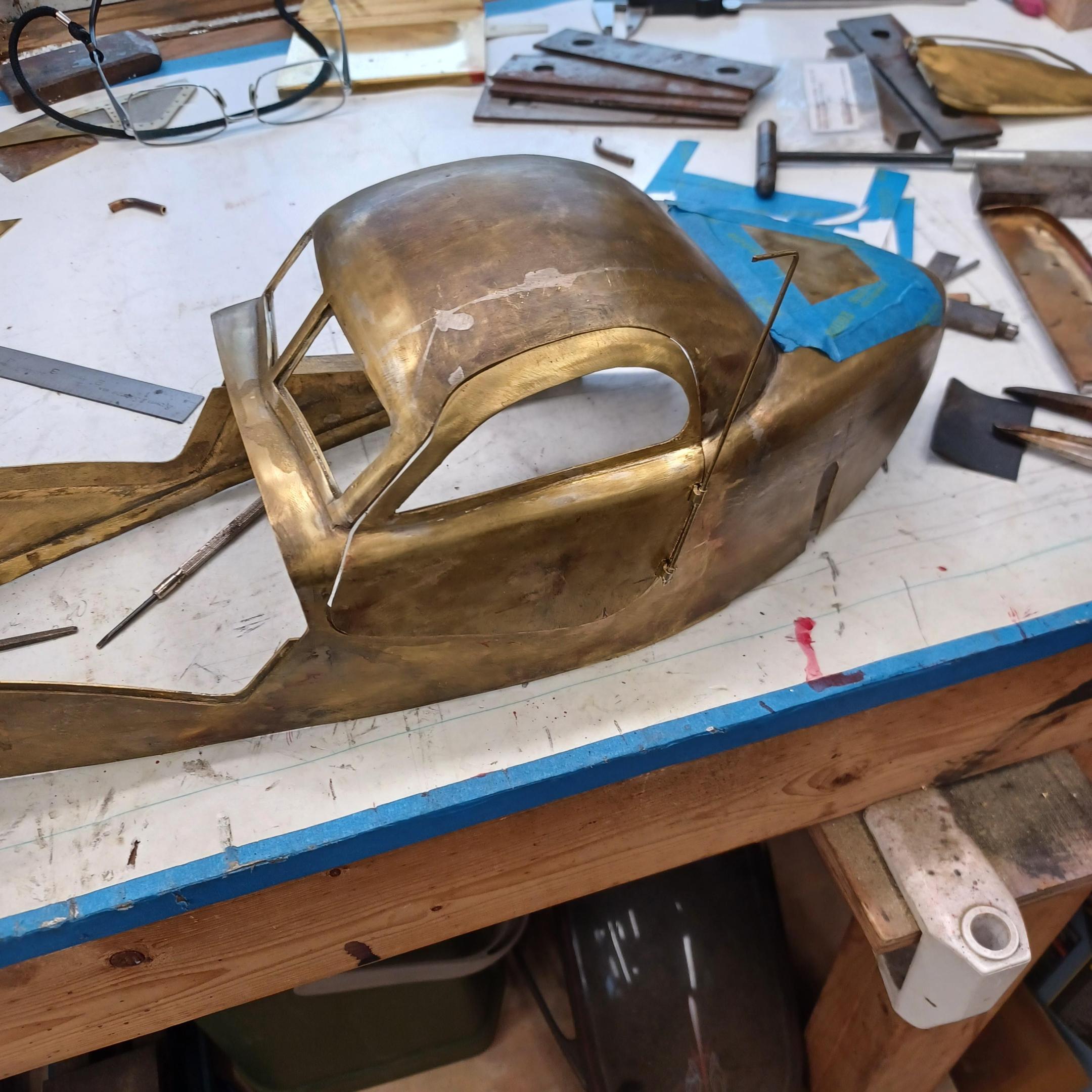 hi mark , i have made spoke wheels before but these will be difficult. machining the angles for the spokes will be the tough part. i went to work on the rear fender today. as you can see i completed wooden buck and it looked about right. i started one half of the left rear and i think it came out pretty good so far. i did not notice that i was almost out of brass Sheetmetal so i ordered more today. this is going to take a large amount of brass to finish. here is a few pictures of the hammerform and the fender half . when i do the other half they will be silver soldered together. it took about 2 hours of hammering and had to be annealed 3 times. -
