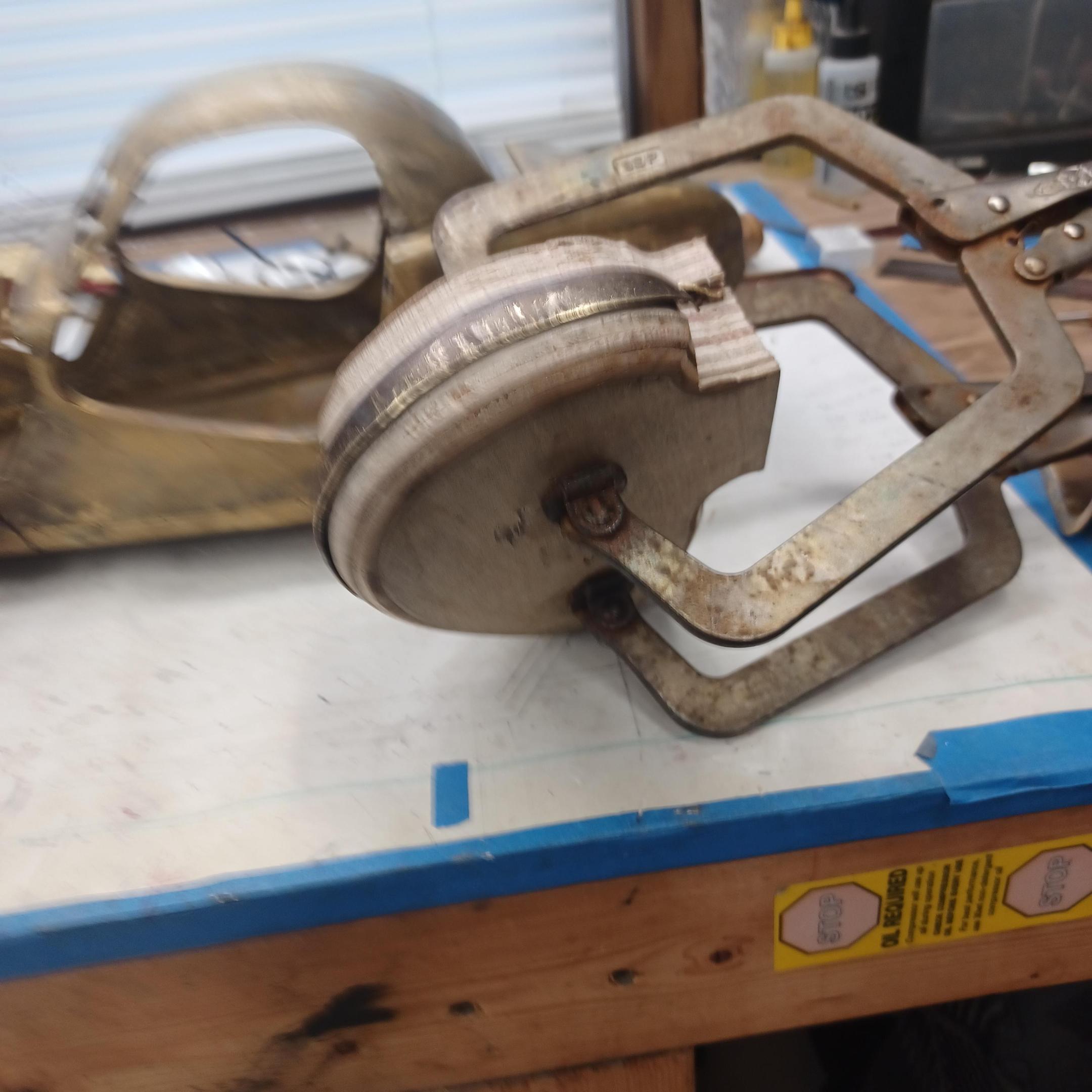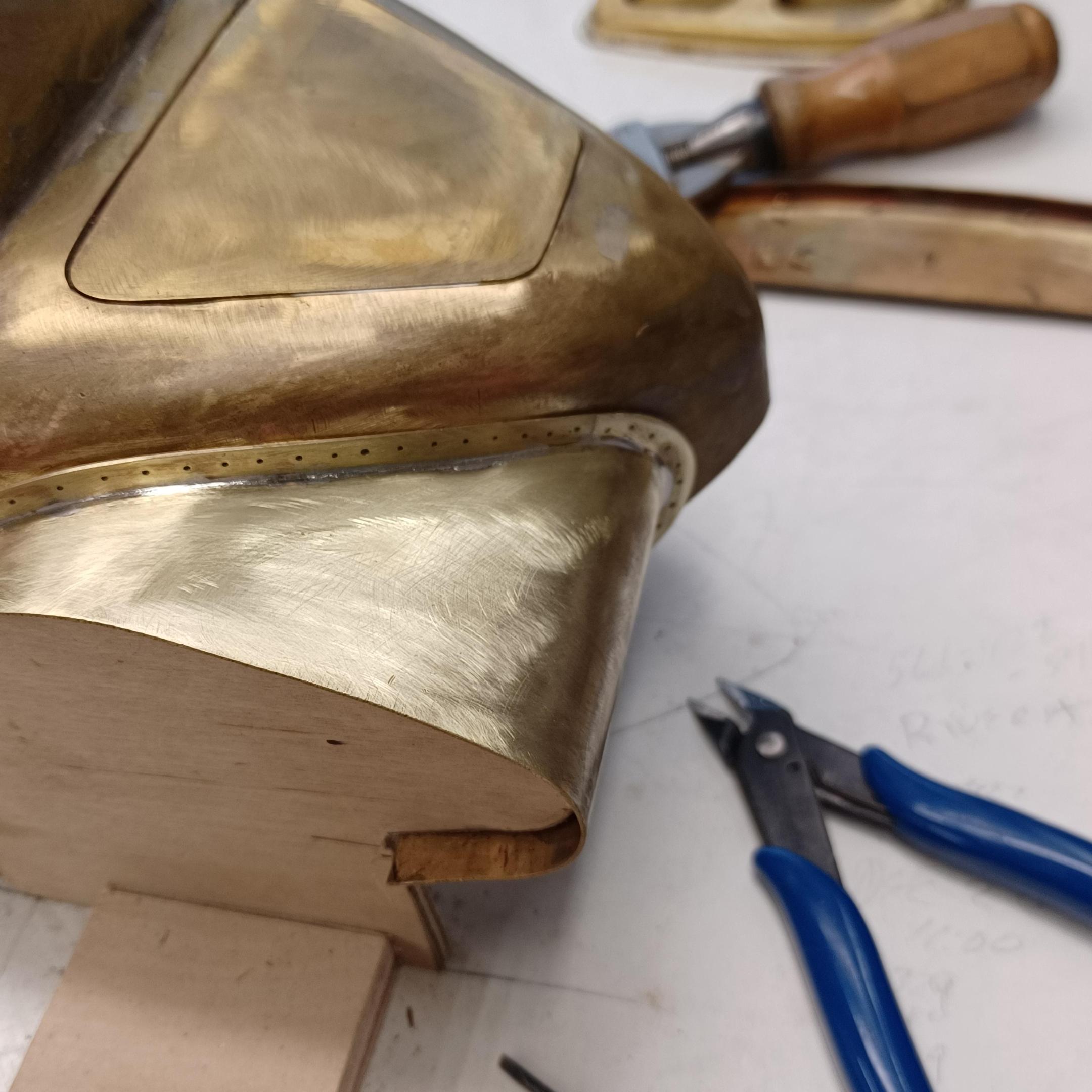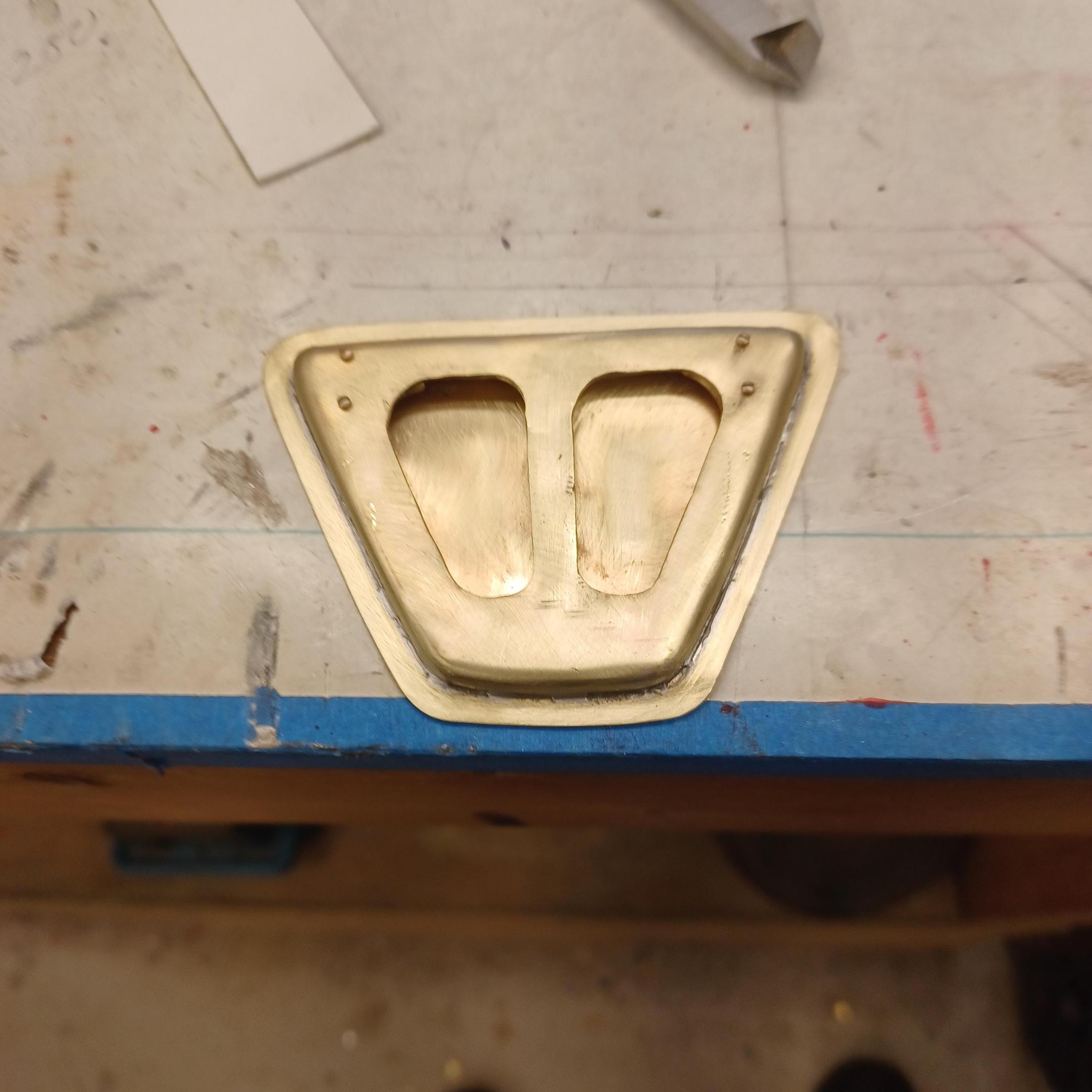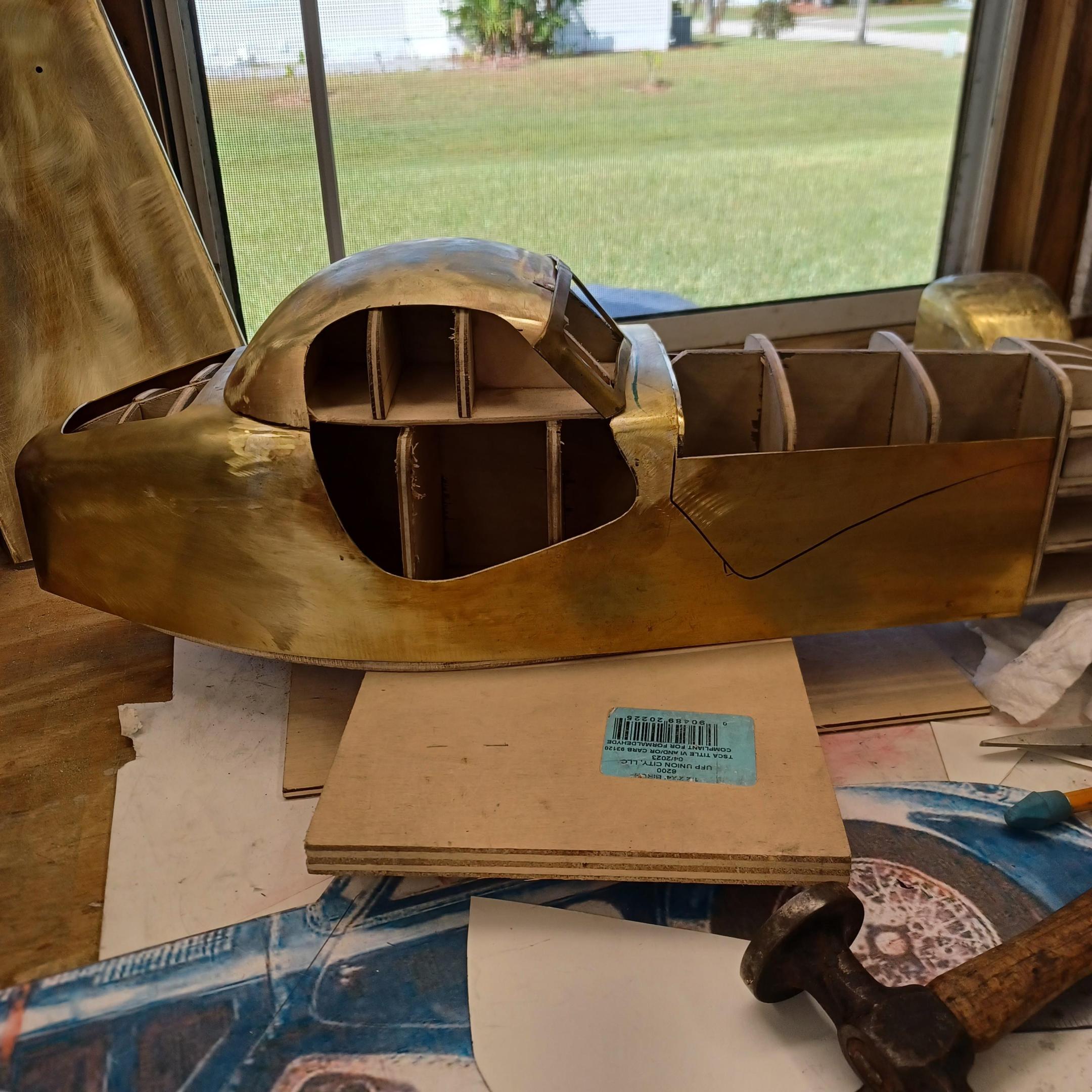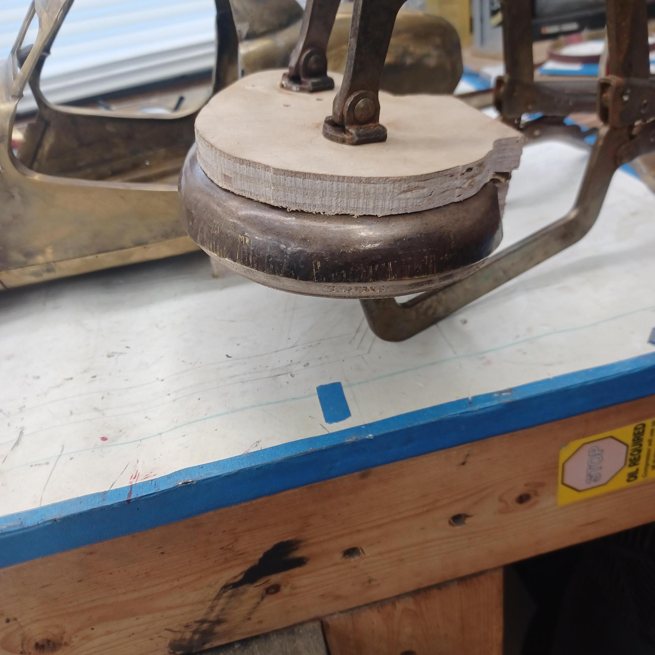 hi mark , i have made spoke wheels before but these will be difficult. machining the angles for the spokes will be the tough part. i went to work on the rear fender today. as you can see i completed wooden buck and it looked about right. i started one half of the left rear and i think it came out pretty good so far. i did not notice that i was almost out of brass Sheetmetal so i ordered more today. this is going to take a large amount of brass to finish. here is a few pictures of the hammerform and the fender half . when i do the other half they will be silver soldered together. it took about 2 hours of hammering and had to be annealed 3 times. -