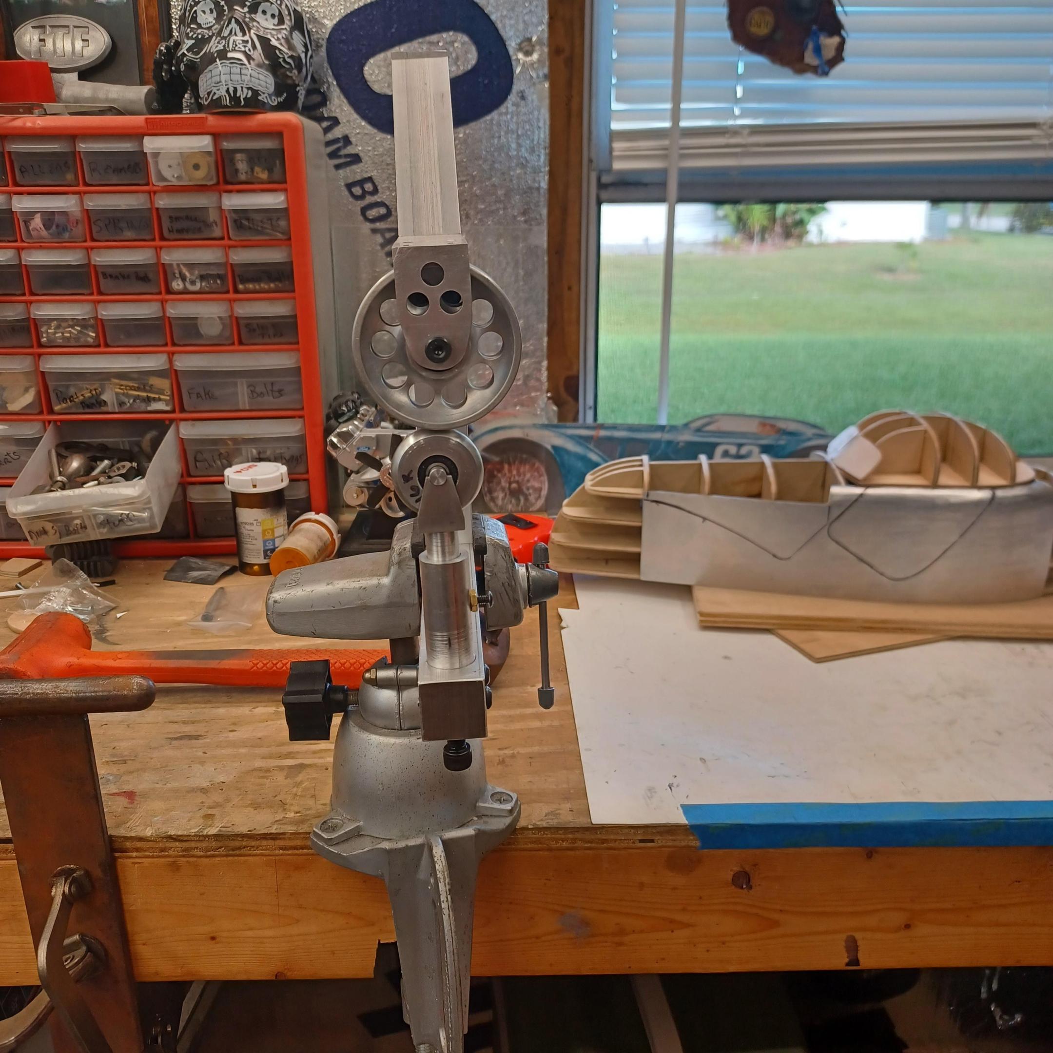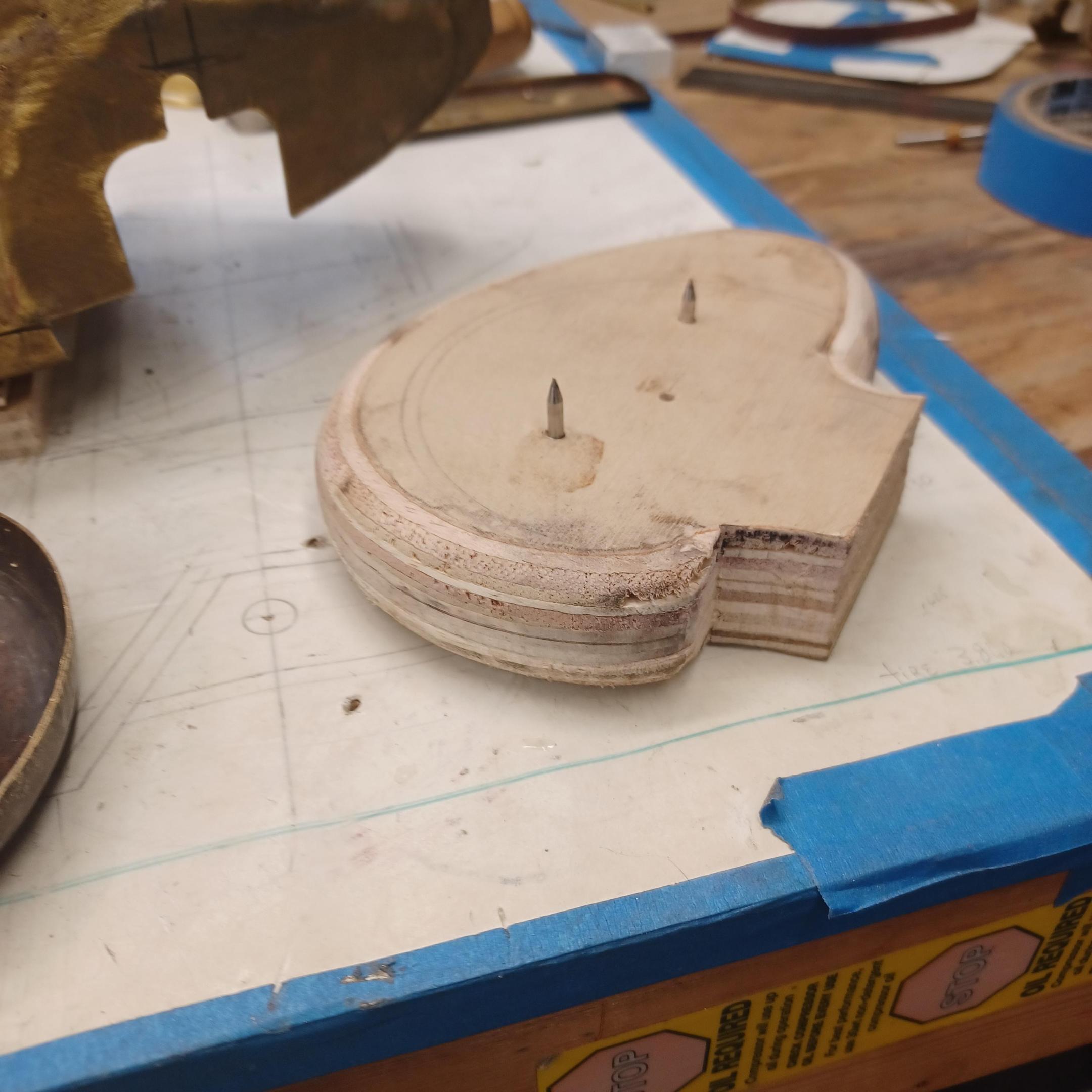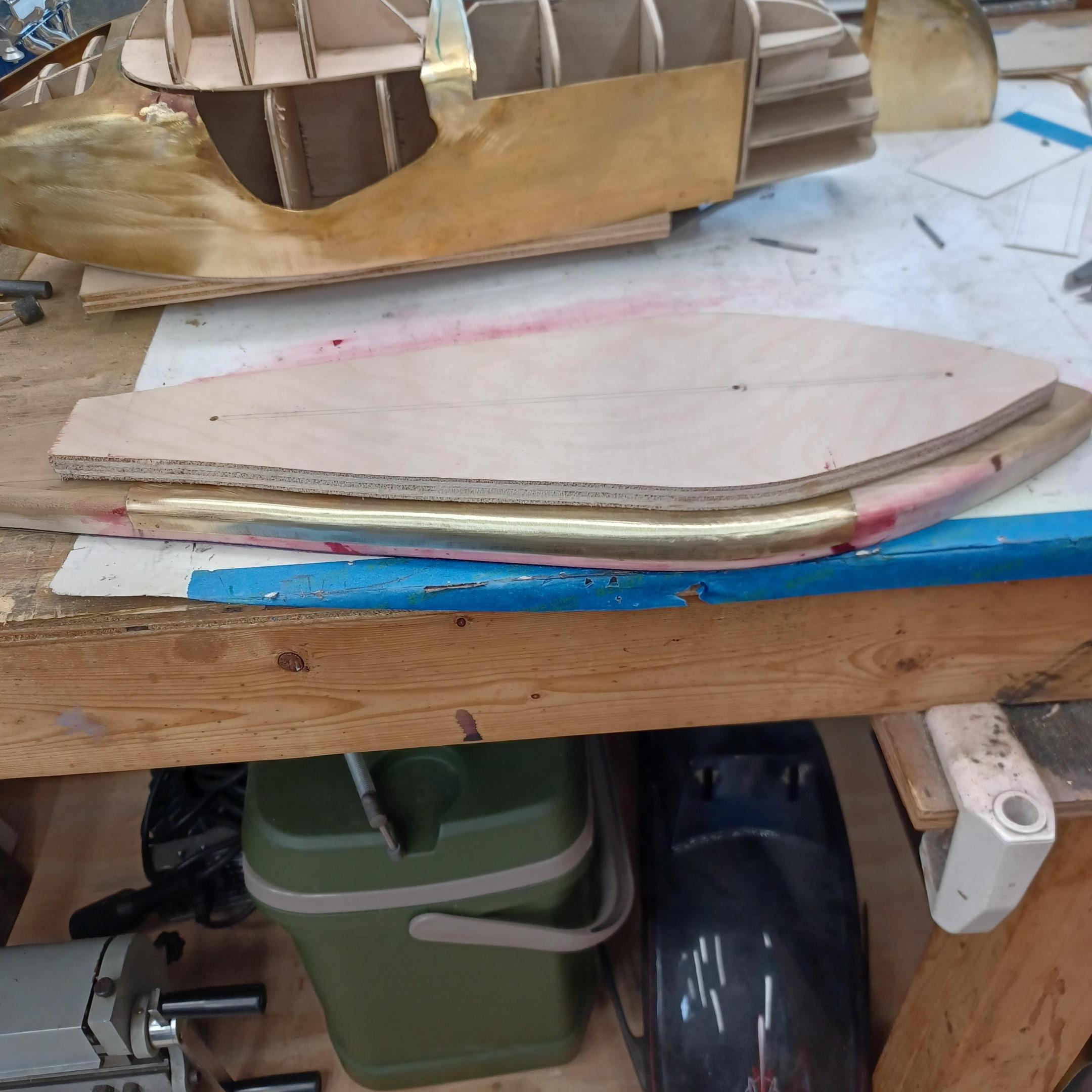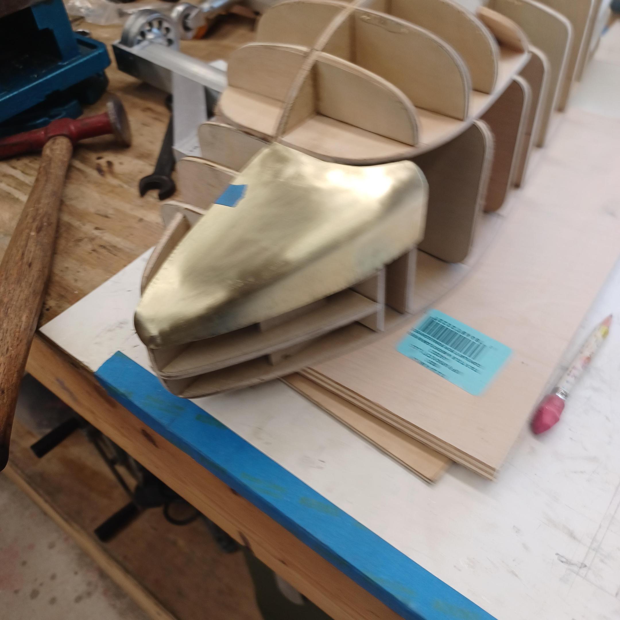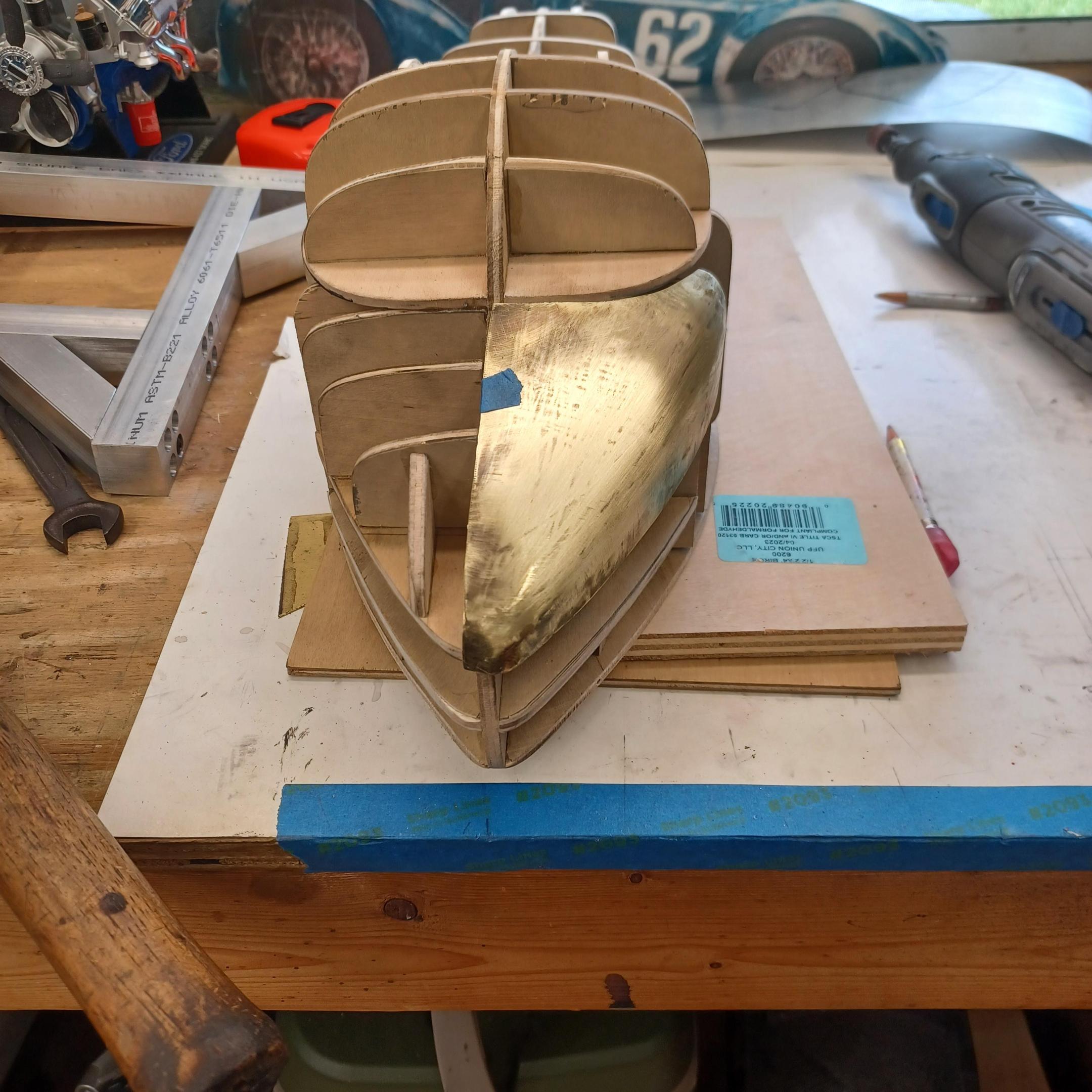 hi mark , i have made spoke wheels before but these will be difficult. machining the angles for the spokes will be the tough part. i went to work on the rear fender today. as you can see i completed wooden buck and it looked about right. i started one half of the left rear and i think it came out pretty good so far. i did not notice that i was almost out of brass Sheetmetal so i ordered more today. this is going to take a large amount of brass to finish. here is a few pictures of the hammerform and the fender half . when i do the other half they will be silver soldered together. it took about 2 hours of hammering and had to be annealed 3 times. -