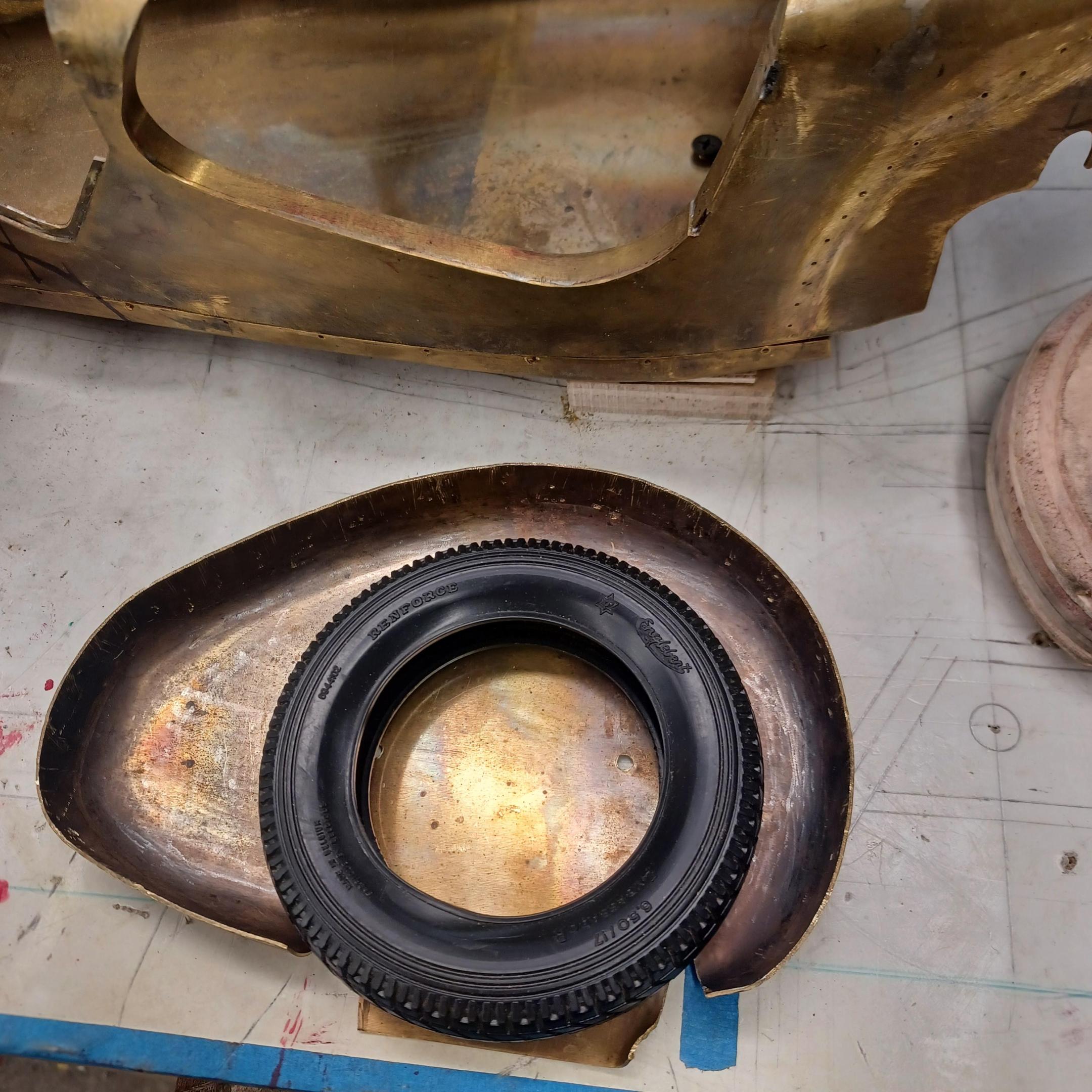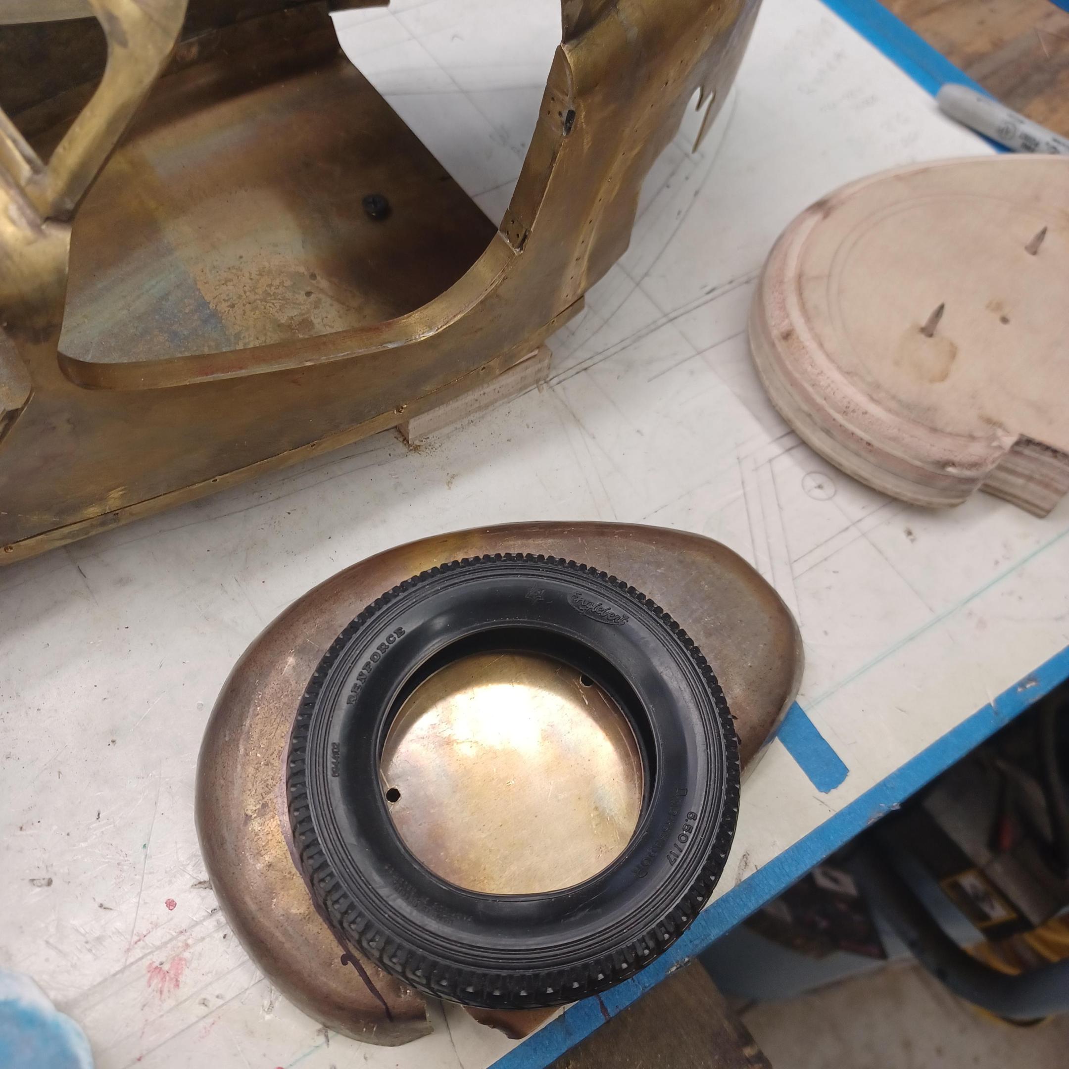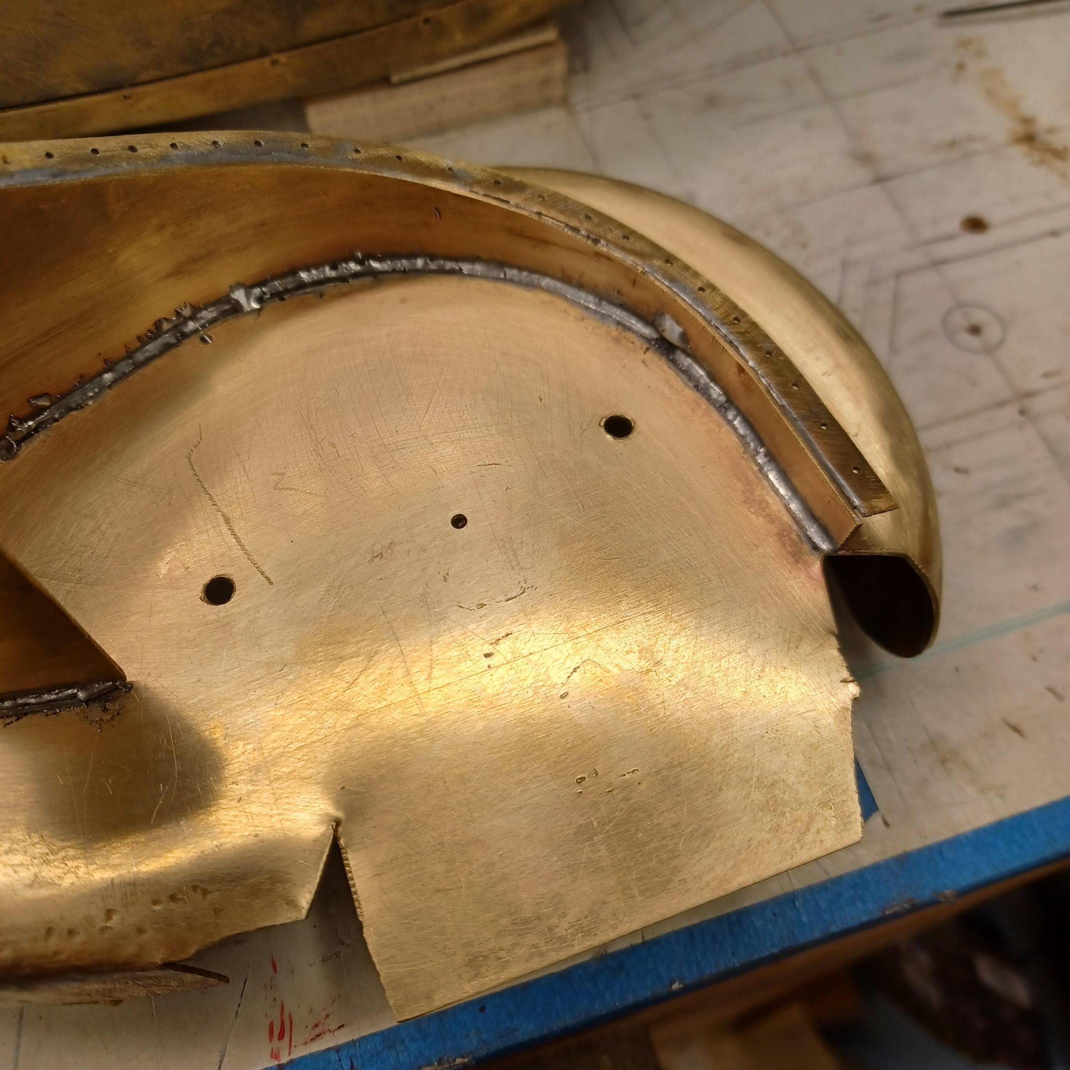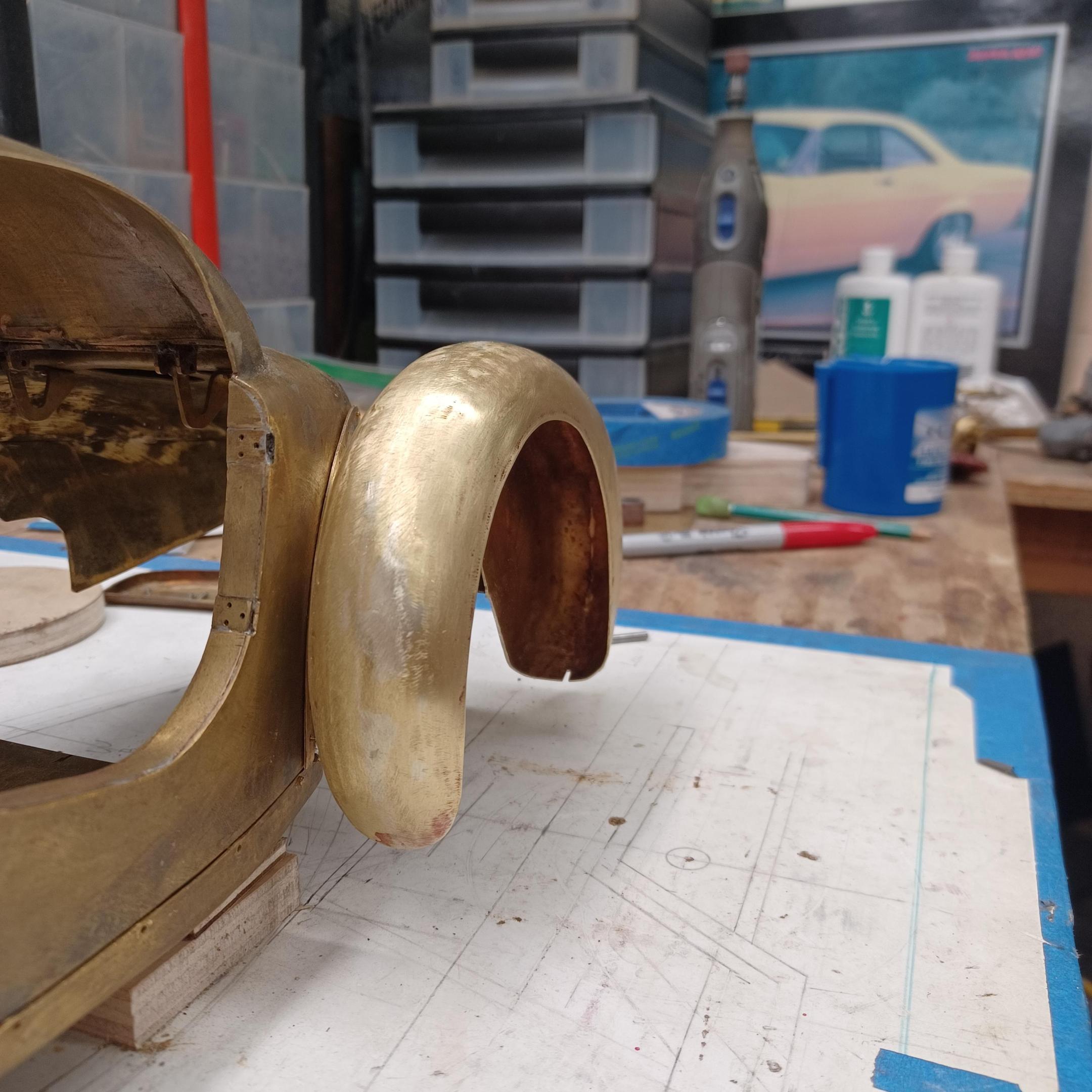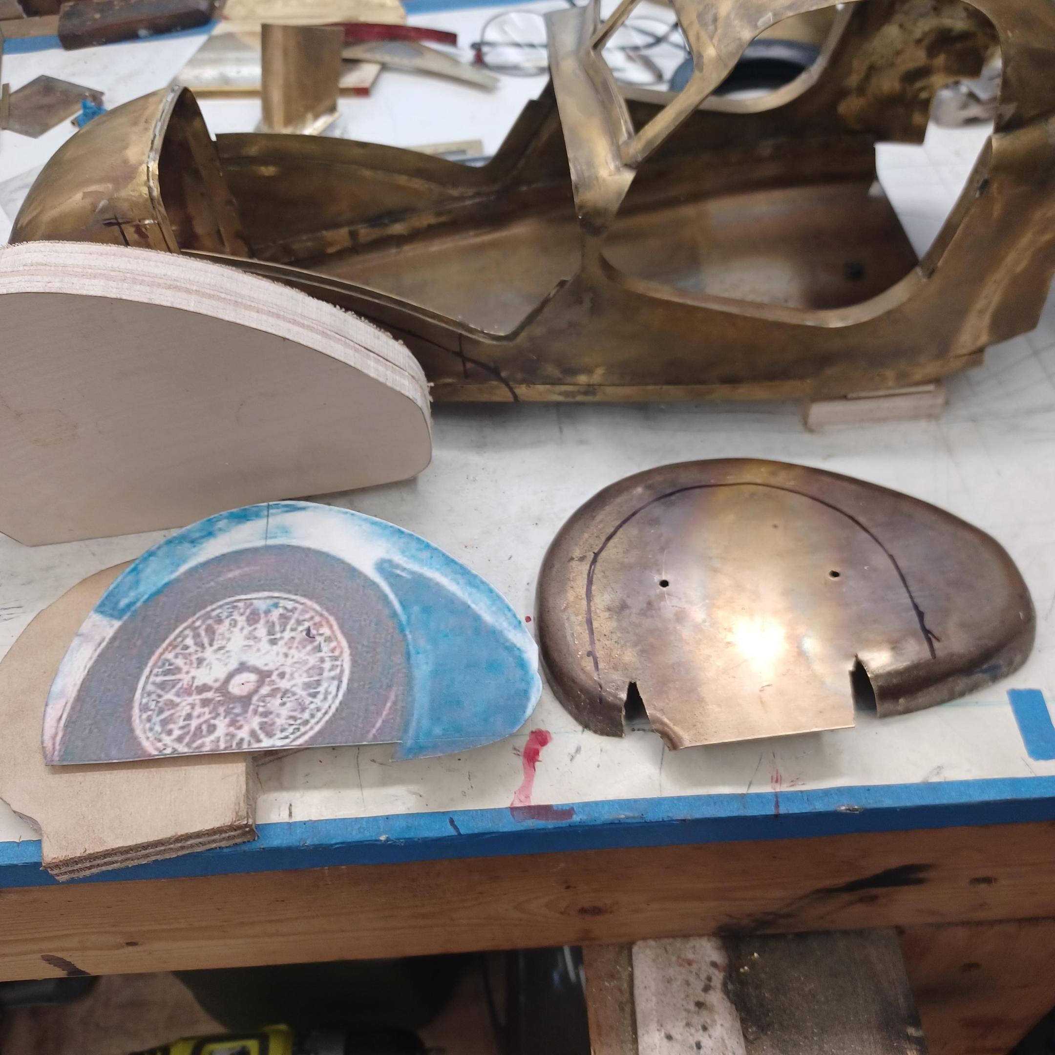 hi mark ,hammer forms have been around for along time. i have been using them 30 or 40 years. i don't know idea they were. hi francis your wheels look great. here are a few pictures of the 2 halves of the fenders soldered together. and the filler between the fender and the body. the inside of the fender in picture 2 shows the solder. this was done with my favorite solder tool the resistance solderer. great tool. the wheels are looking good. 128 holes in each wheel, not counting 80 spot faces on the center hub to give a flat spot for the .035 hole to be drilled. the center hub is bolted in from the backside. they have 4o spokes only half ,40 more to go in each. i dont know why they look twisted in the picture, they are just straight .035 stainless safety wire. i have about 15 to 18 hours in each wheel and i have 2 more to go. i made the bore in the wheel .002 smaller than the wheel center then heated the rim so it would expand and dropped the center in on a spacer for the back space and let them cool. no glue needed. -
