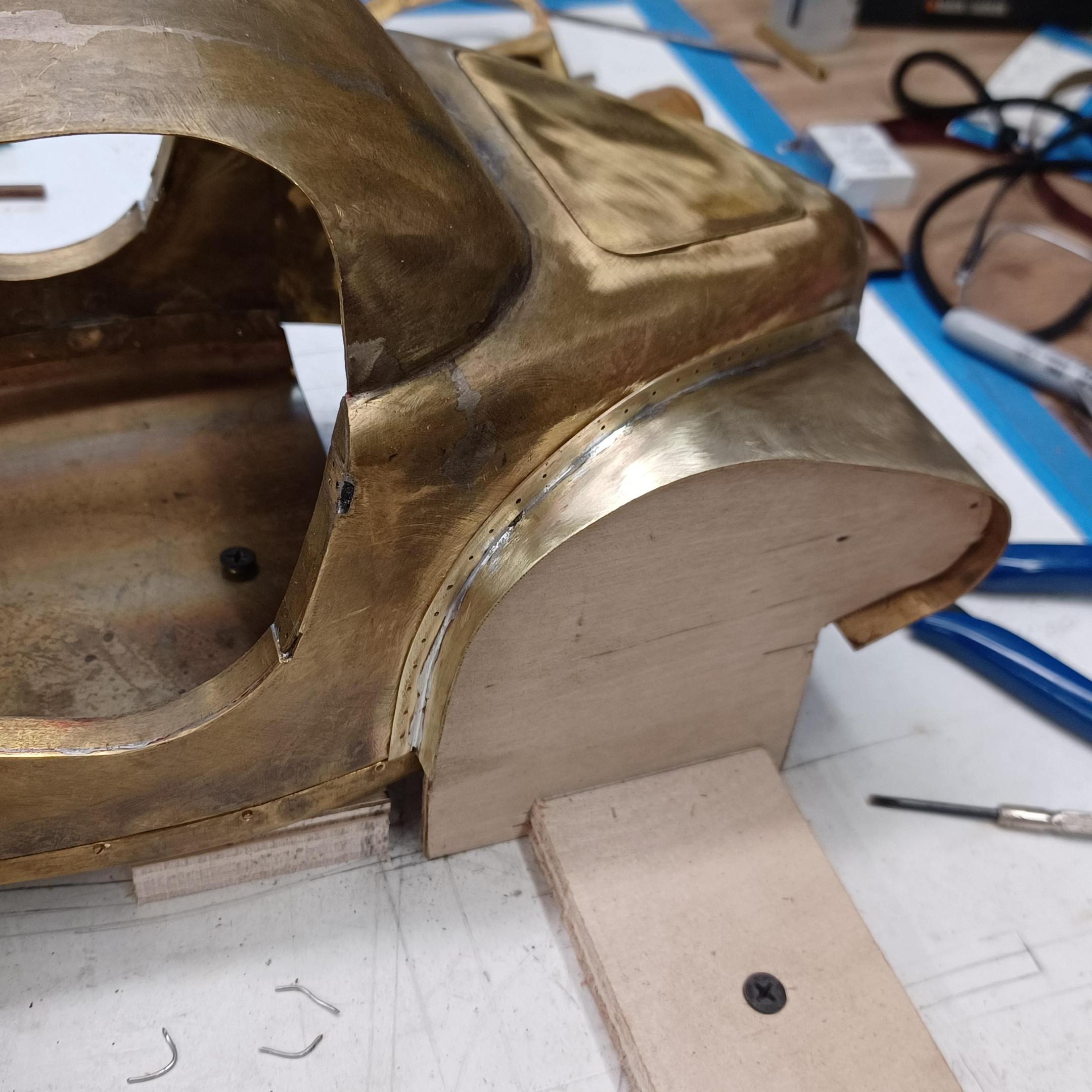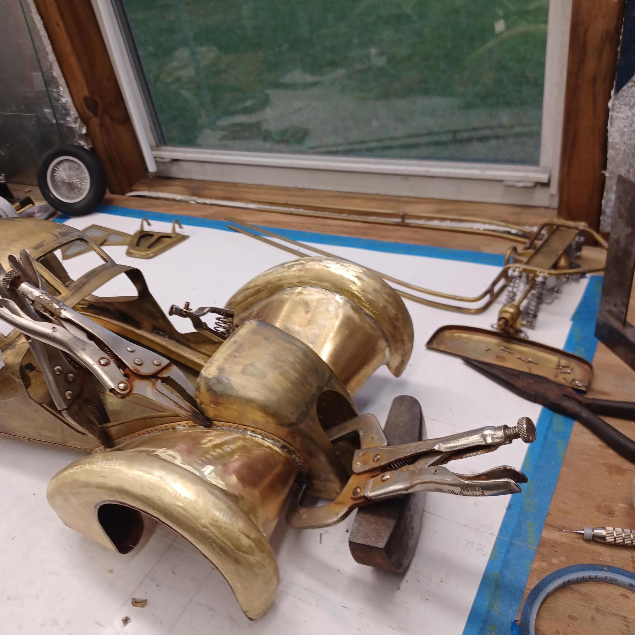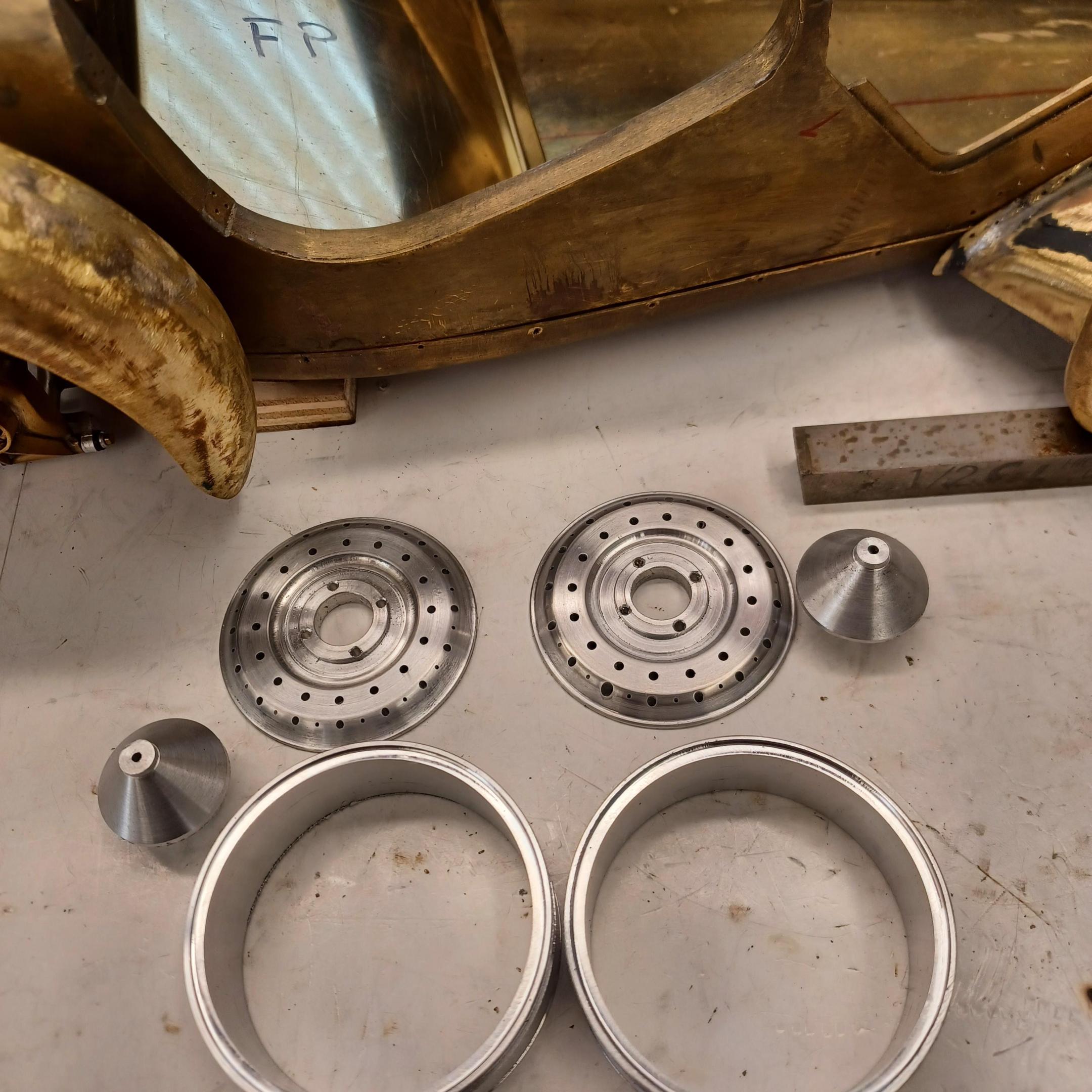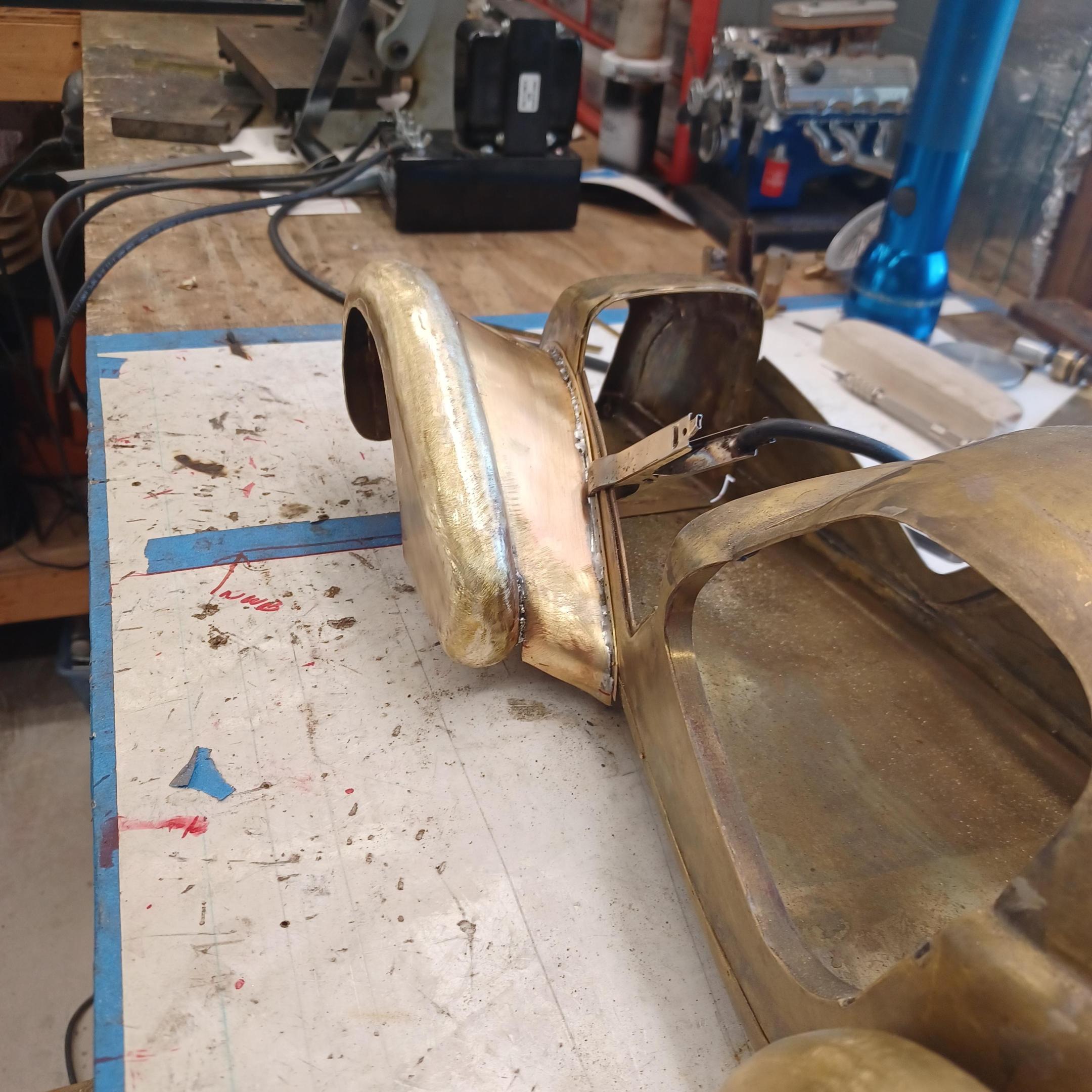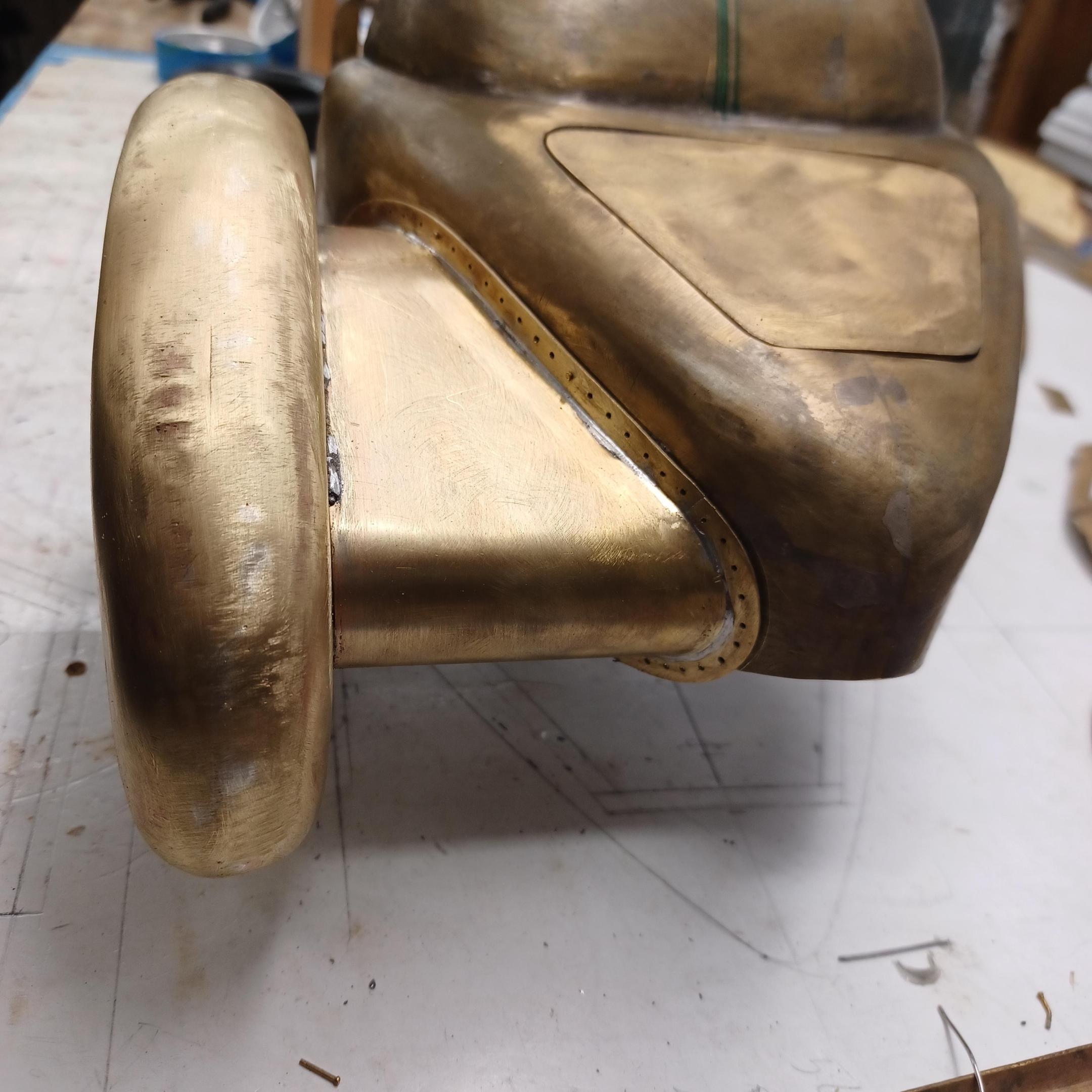hi mark ,hammer forms have been around for along time. i have been using them 30 or 40 years. i don't know idea they were. hi francis your wheels look great. here are a few pictures of the 2 halves of the fenders soldered together. and the filler between the fender and the body. the inside of the fender in picture 2 shows the solder. this was done with my favorite solder tool the resistance solderer. great tool. the wheels are looking good. 128 holes in each wheel, not counting 80 spot faces on the center hub to give a flat spot for the .035 hole to be drilled. the center hub is bolted in from the backside. they have 4o spokes only half ,40 more to go in each. i dont know why they look twisted in the picture, they are just straight .035 stainless safety wire. i have about 15 to 18 hours in each wheel and i have 2 more to go. i made the bore in the wheel .002 smaller than the wheel center then heated the rim so it would expand and dropped the center in on a spacer for the back space and let them cool. no glue needed. -