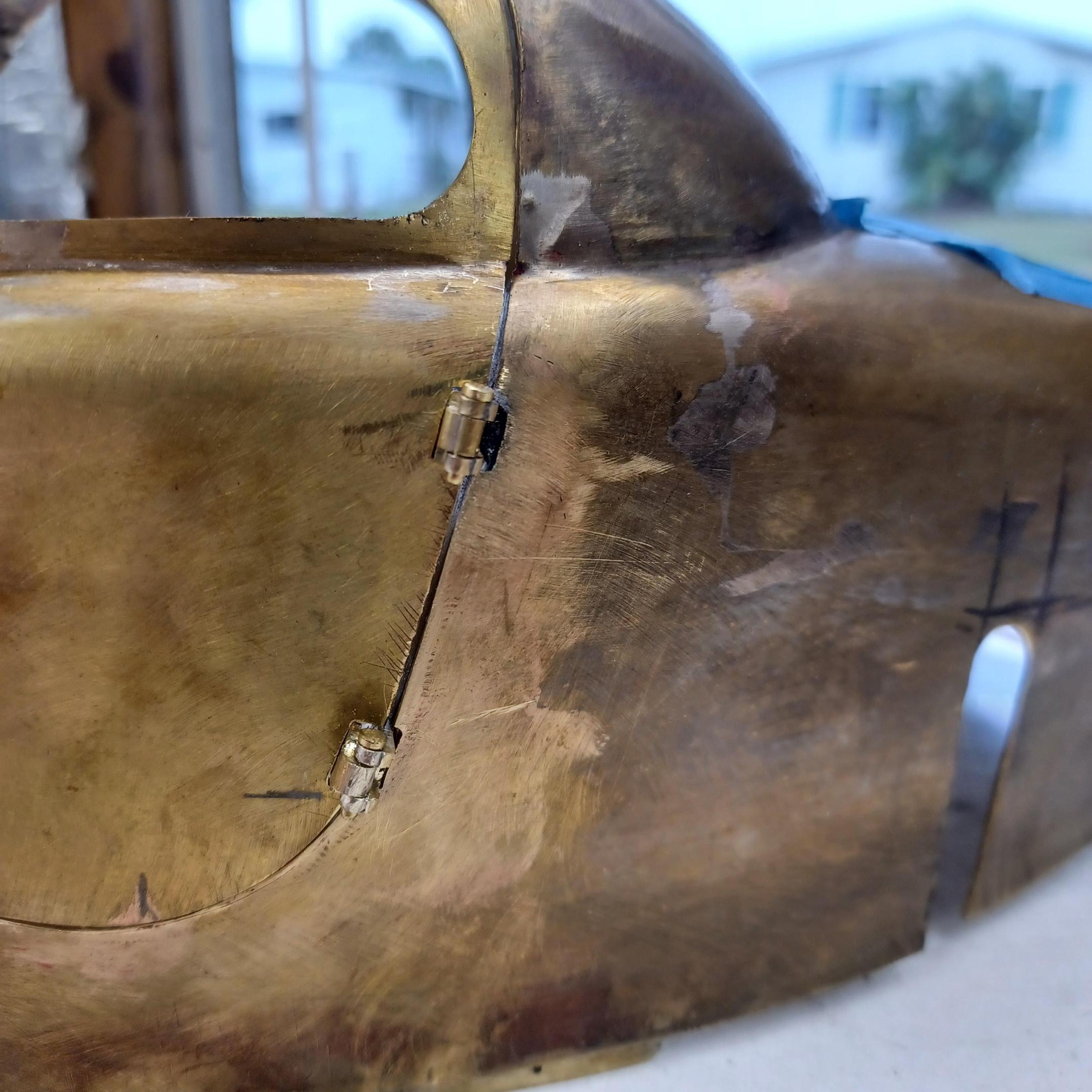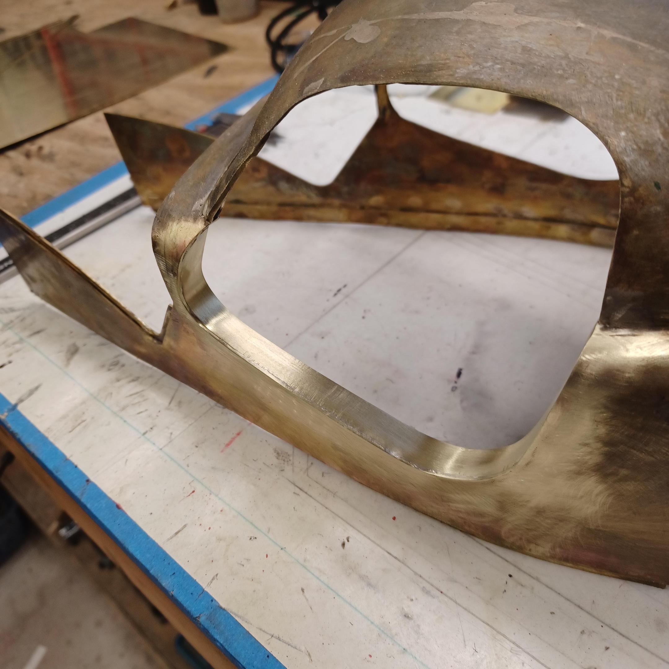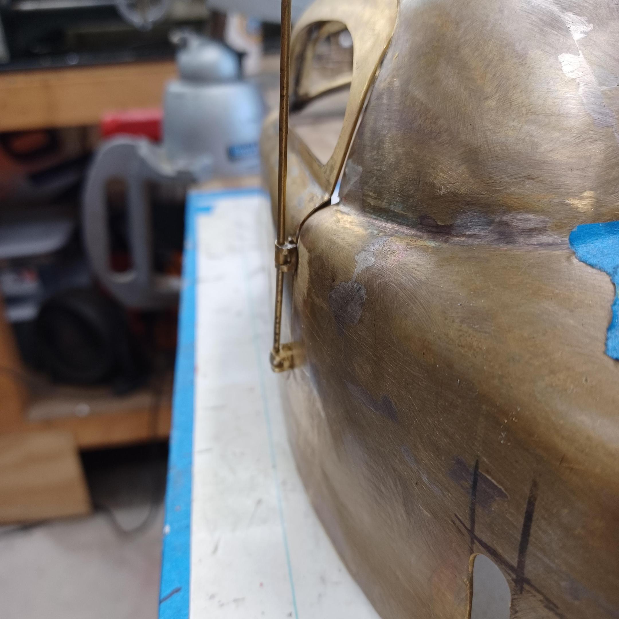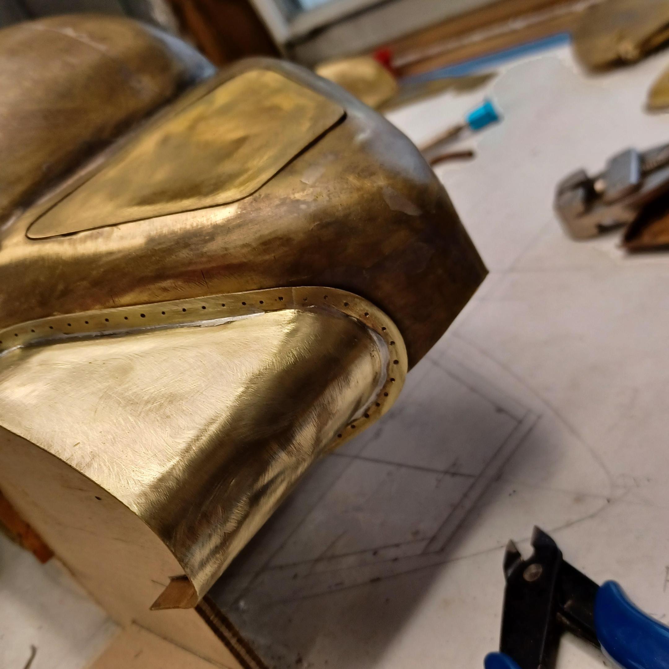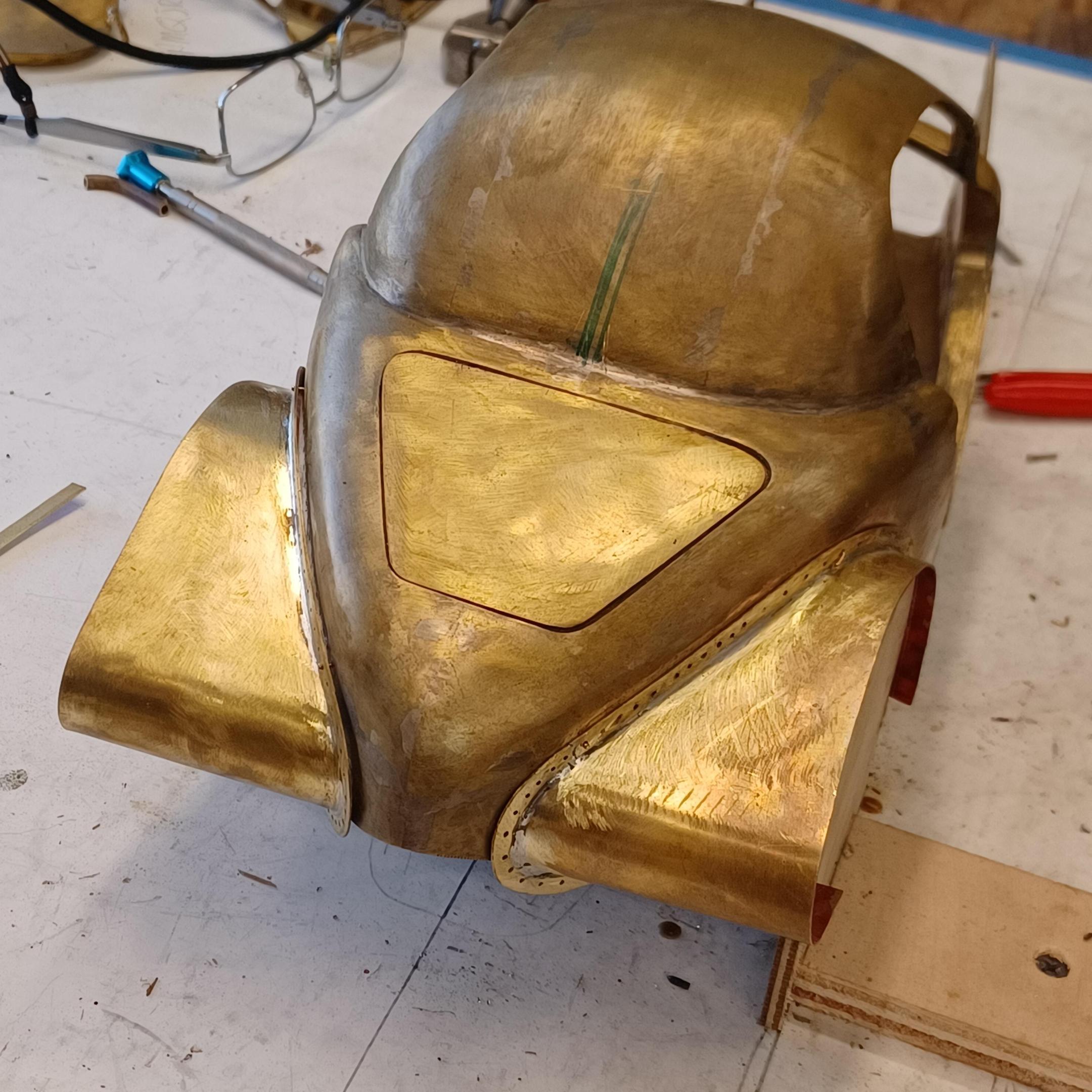 hi mark ,hammer forms have been around for along time. i have been using them 30 or 40 years. i don't know idea they were. hi francis your wheels look great. here are a few pictures of the 2 halves of the fenders soldered together. and the filler between the fender and the body. the inside of the fender in picture 2 shows the solder. this was done with my favorite solder tool the resistance solderer. great tool. the wheels are looking good. 128 holes in each wheel, not counting 80 spot faces on the center hub to give a flat spot for the .035 hole to be drilled. the center hub is bolted in from the backside. they have 4o spokes only half ,40 more to go in each. i dont know why they look twisted in the picture, they are just straight .035 stainless safety wire. i have about 15 to 18 hours in each wheel and i have 2 more to go. i made the bore in the wheel .002 smaller than the wheel center then heated the rim so it would expand and dropped the center in on a spacer for the back space and let them cool. no glue needed. -