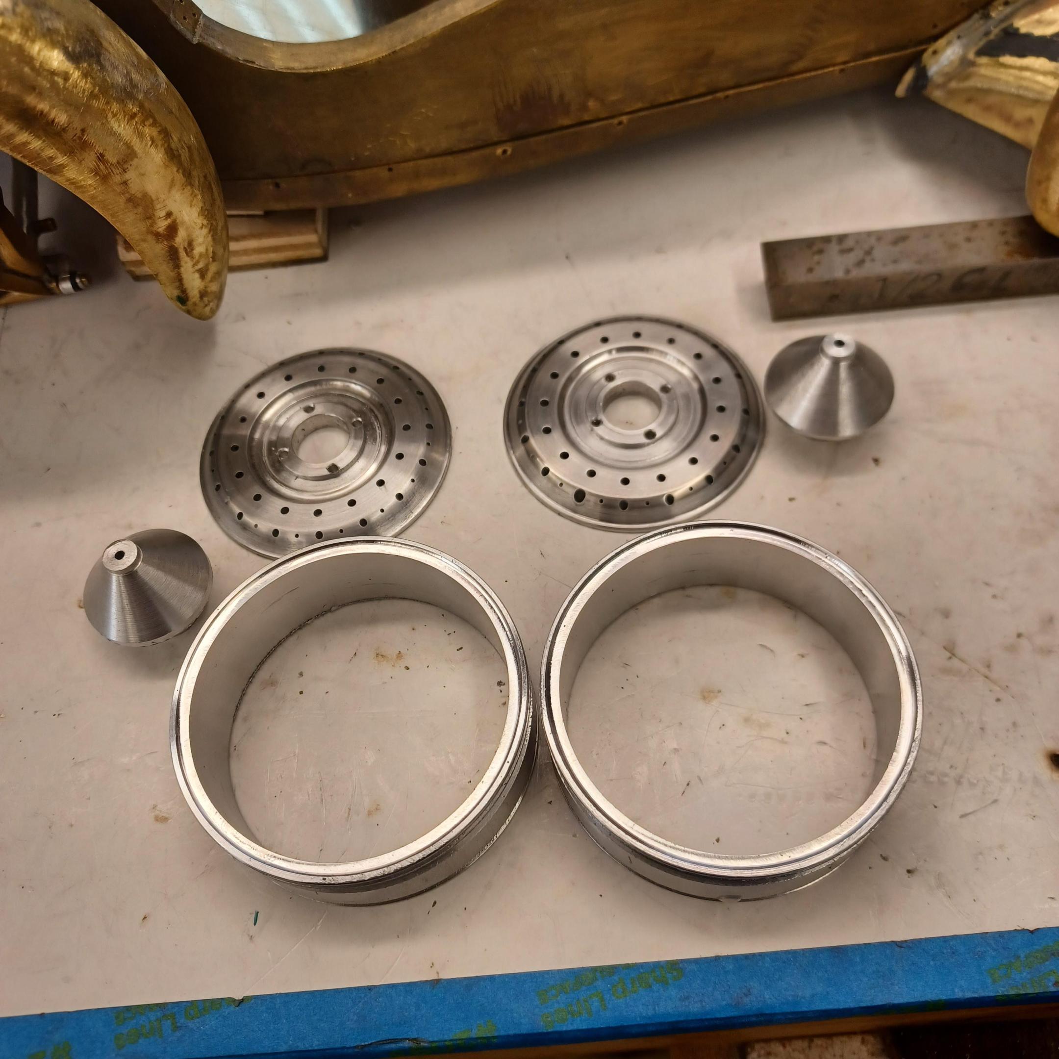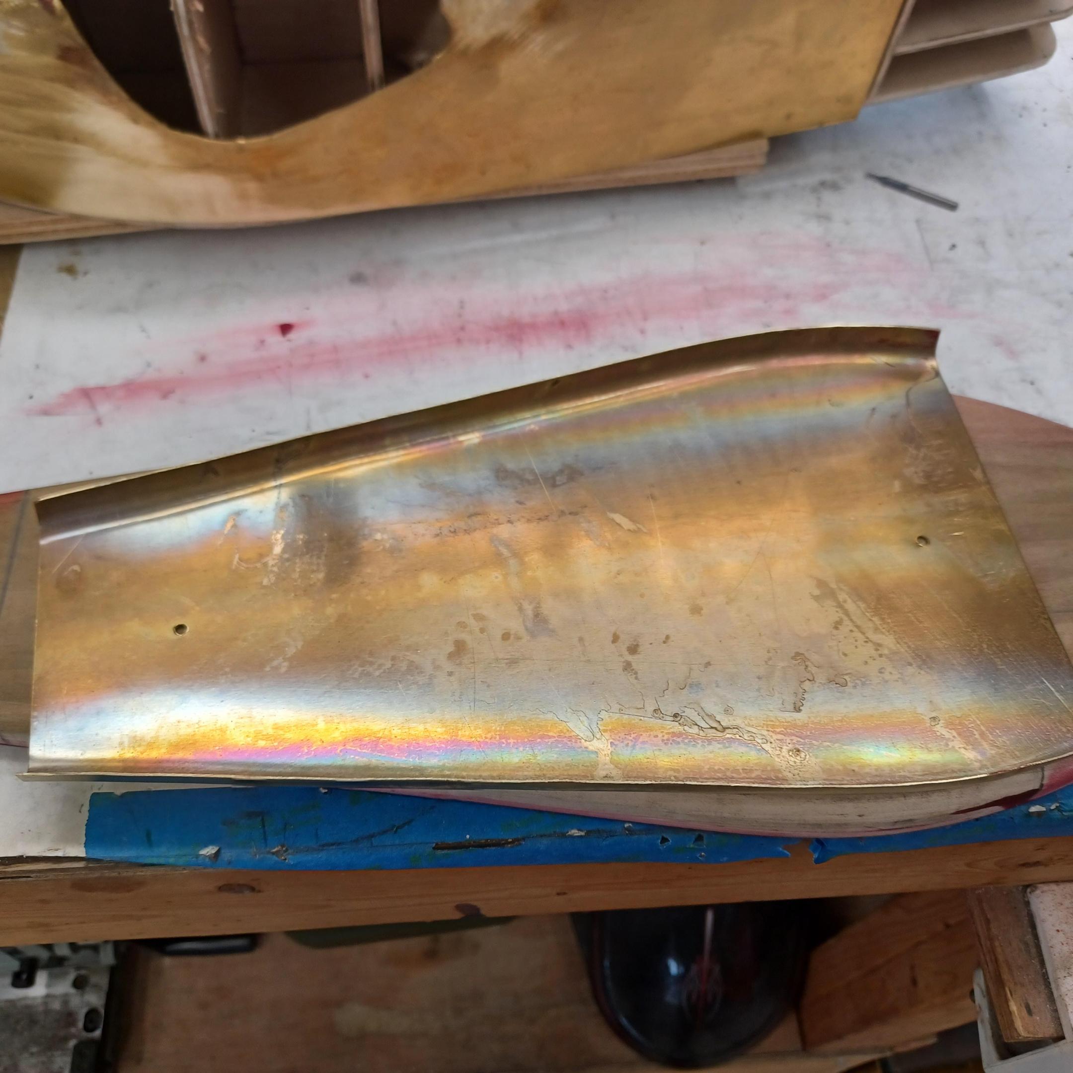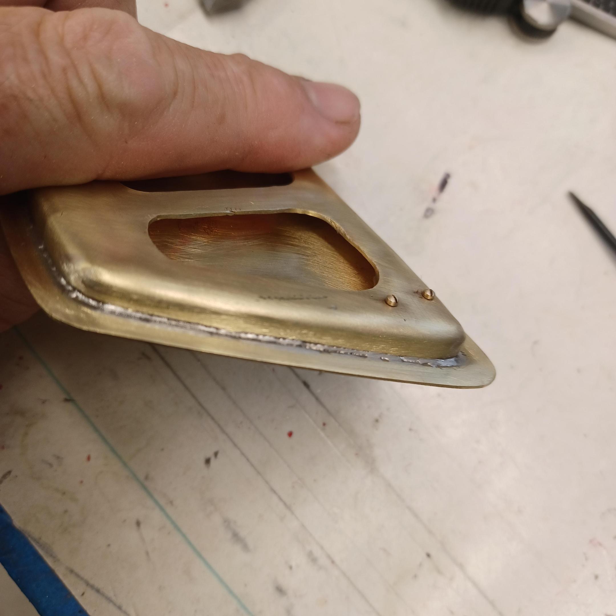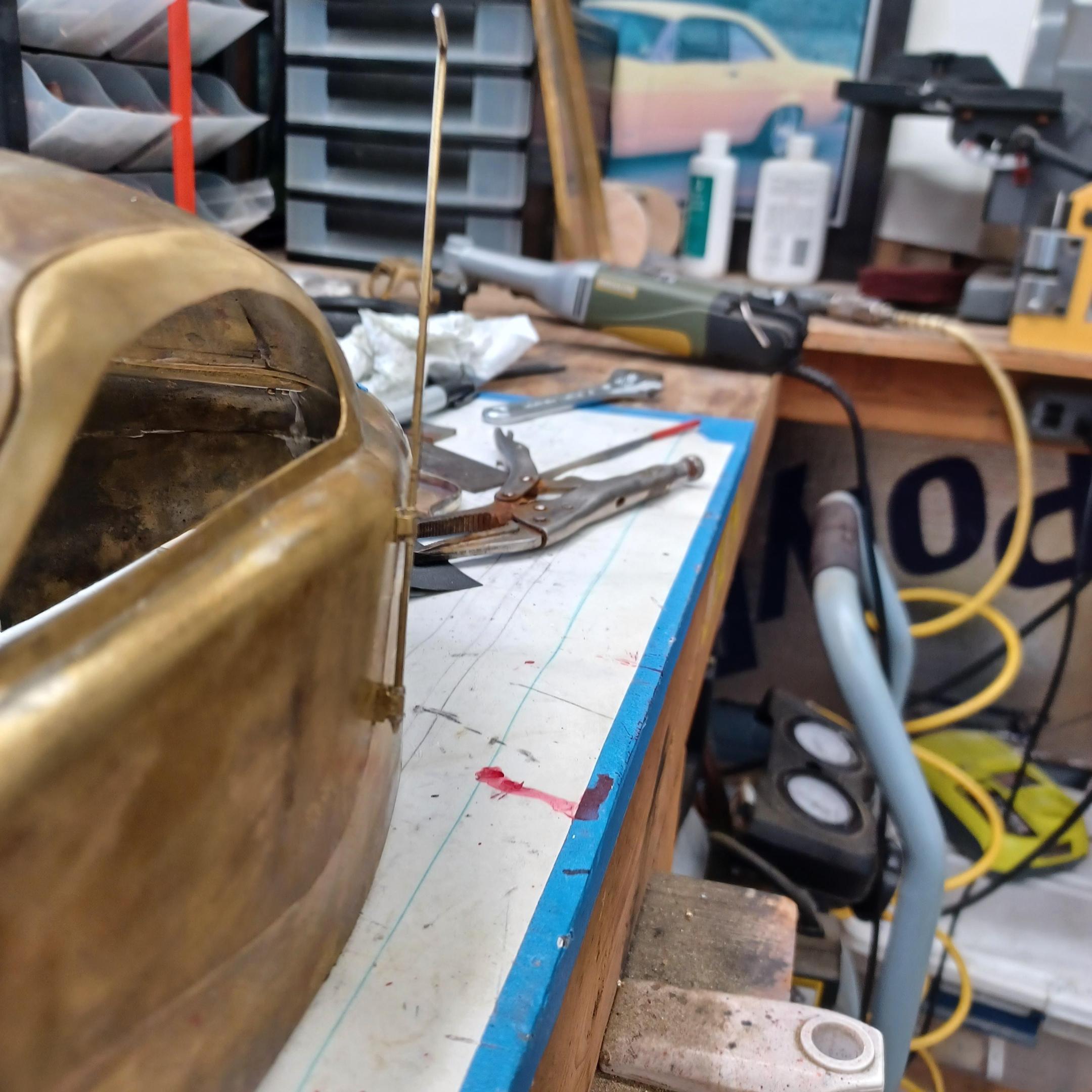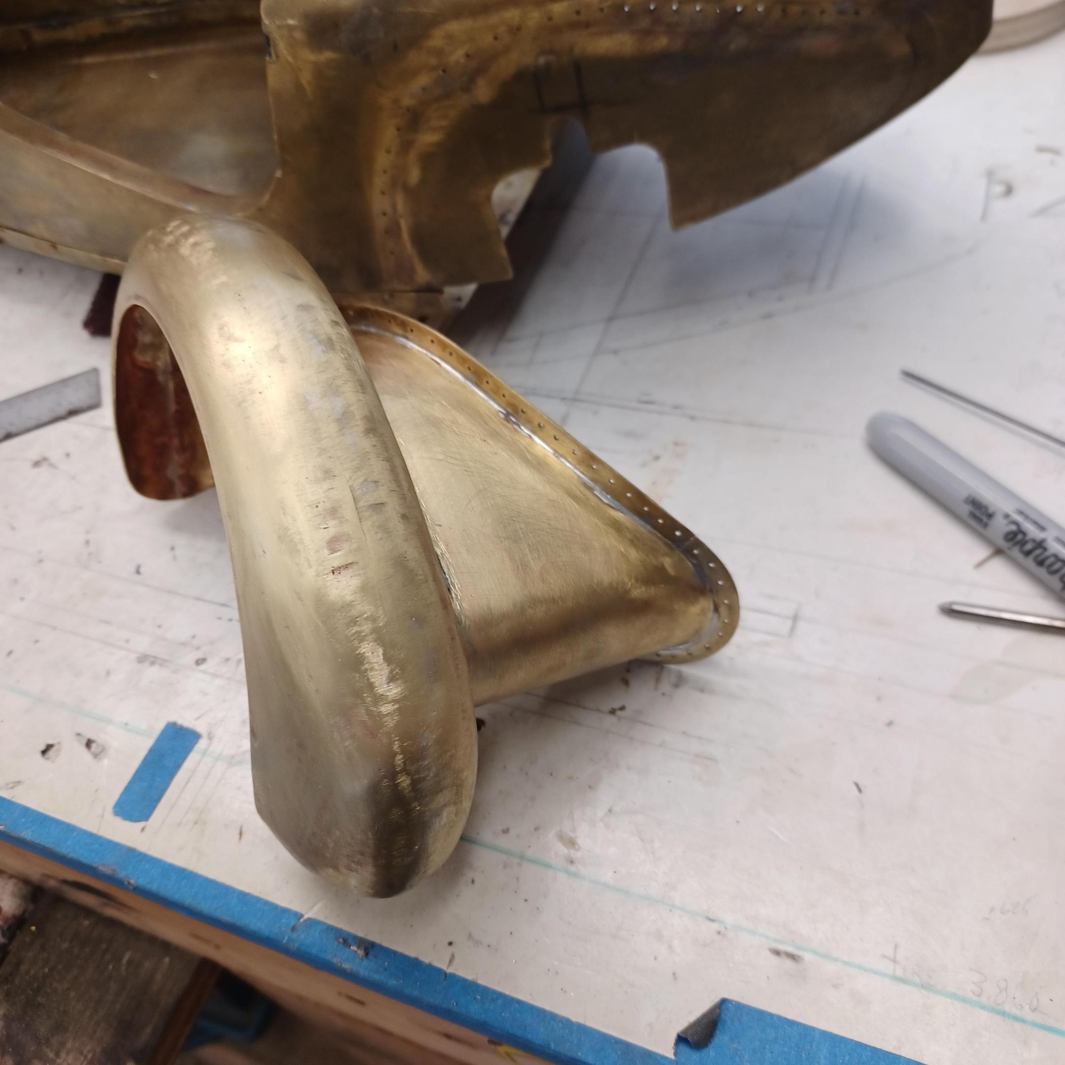 hi mark ,hammer forms have been around for along time. i have been using them 30 or 40 years. i don't know idea they were. hi francis your wheels look great. here are a few pictures of the 2 halves of the fenders soldered together. and the filler between the fender and the body. the inside of the fender in picture 2 shows the solder. this was done with my favorite solder tool the resistance solderer. great tool. the wheels are looking good. 128 holes in each wheel, not counting 80 spot faces on the center hub to give a flat spot for the .035 hole to be drilled. the center hub is bolted in from the backside. they have 4o spokes only half ,40 more to go in each. i dont know why they look twisted in the picture, they are just straight .035 stainless safety wire. i have about 15 to 18 hours in each wheel and i have 2 more to go. i made the bore in the wheel .002 smaller than the wheel center then heated the rim so it would expand and dropped the center in on a spacer for the back space and let them cool. no glue needed. -