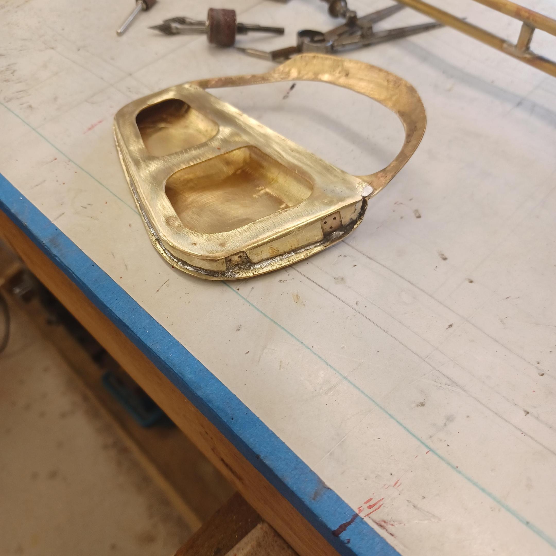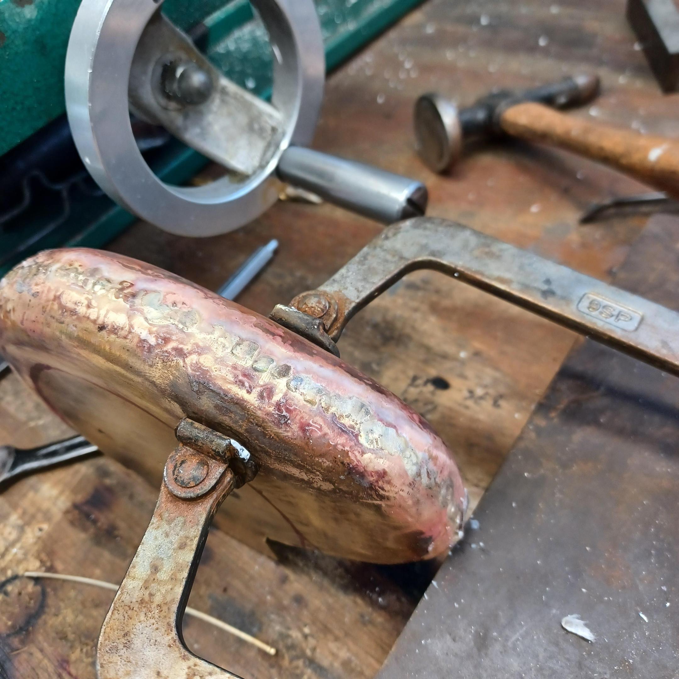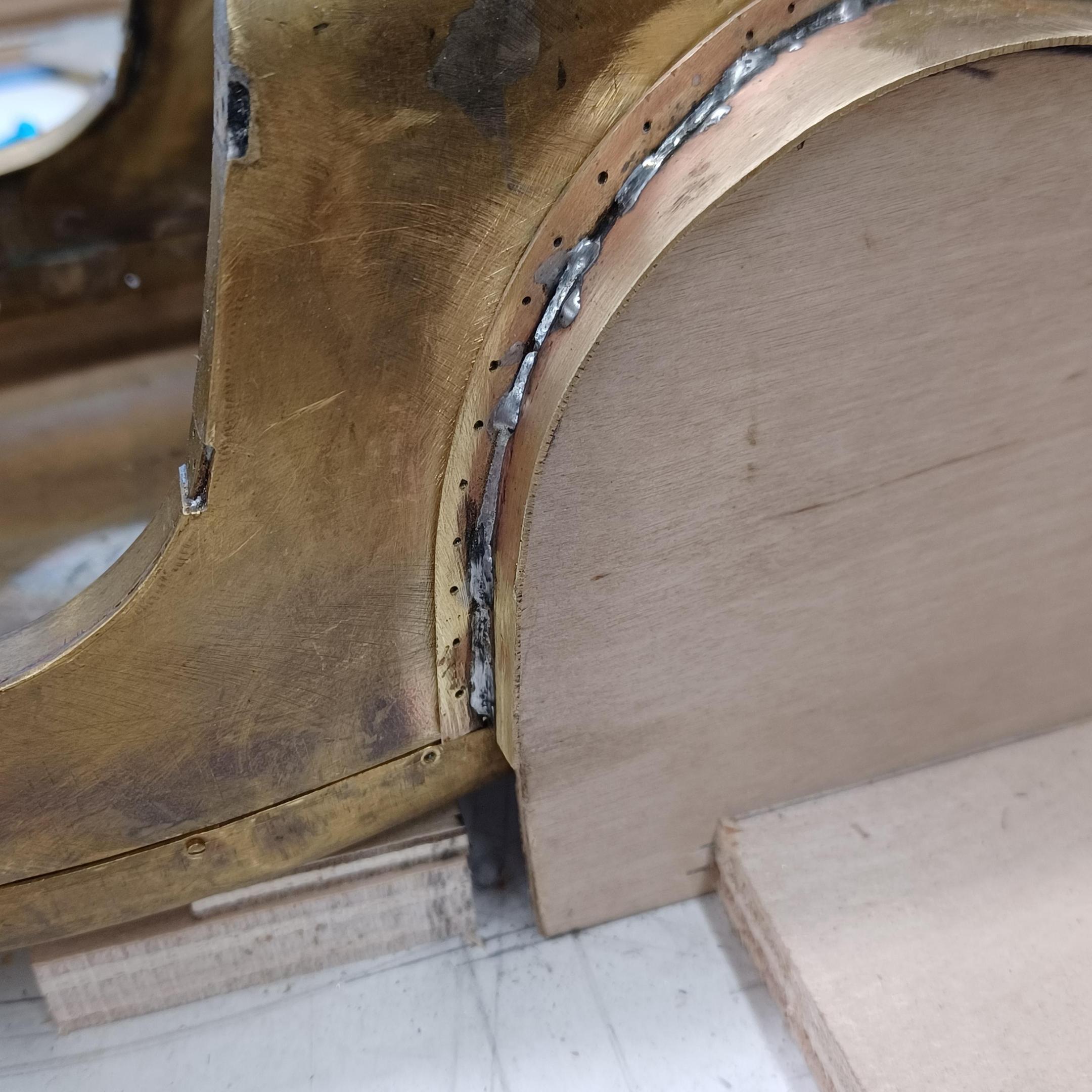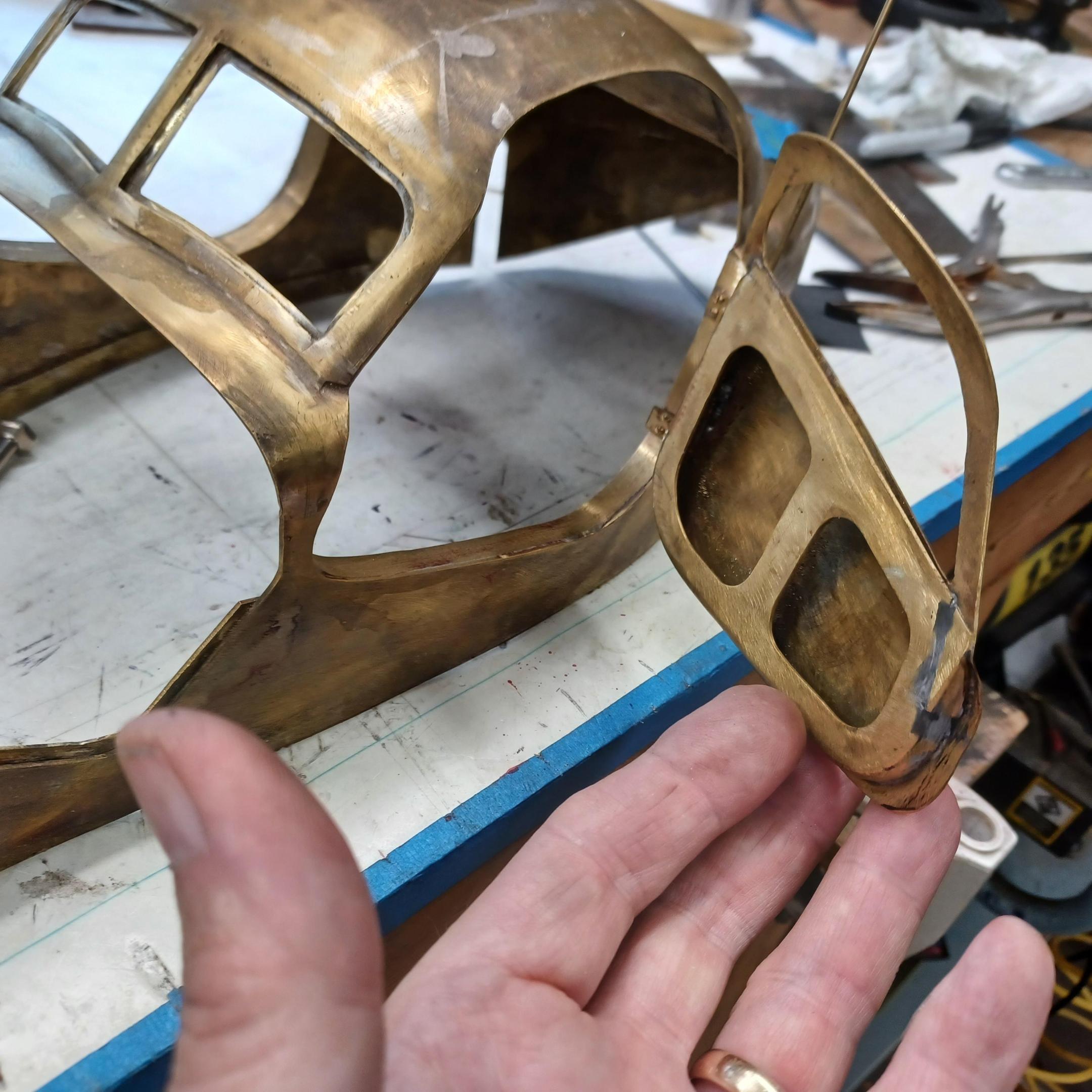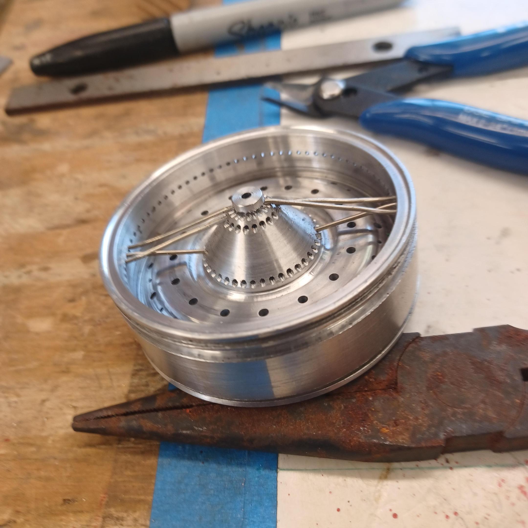 hi mark ,hammer forms have been around for along time. i have been using them 30 or 40 years. i don't know idea they were. hi francis your wheels look great. here are a few pictures of the 2 halves of the fenders soldered together. and the filler between the fender and the body. the inside of the fender in picture 2 shows the solder. this was done with my favorite solder tool the resistance solderer. great tool. the wheels are looking good. 128 holes in each wheel, not counting 80 spot faces on the center hub to give a flat spot for the .035 hole to be drilled. the center hub is bolted in from the backside. they have 4o spokes only half ,40 more to go in each. i dont know why they look twisted in the picture, they are just straight .035 stainless safety wire. i have about 15 to 18 hours in each wheel and i have 2 more to go. i made the bore in the wheel .002 smaller than the wheel center then heated the rim so it would expand and dropped the center in on a spacer for the back space and let them cool. no glue needed. -