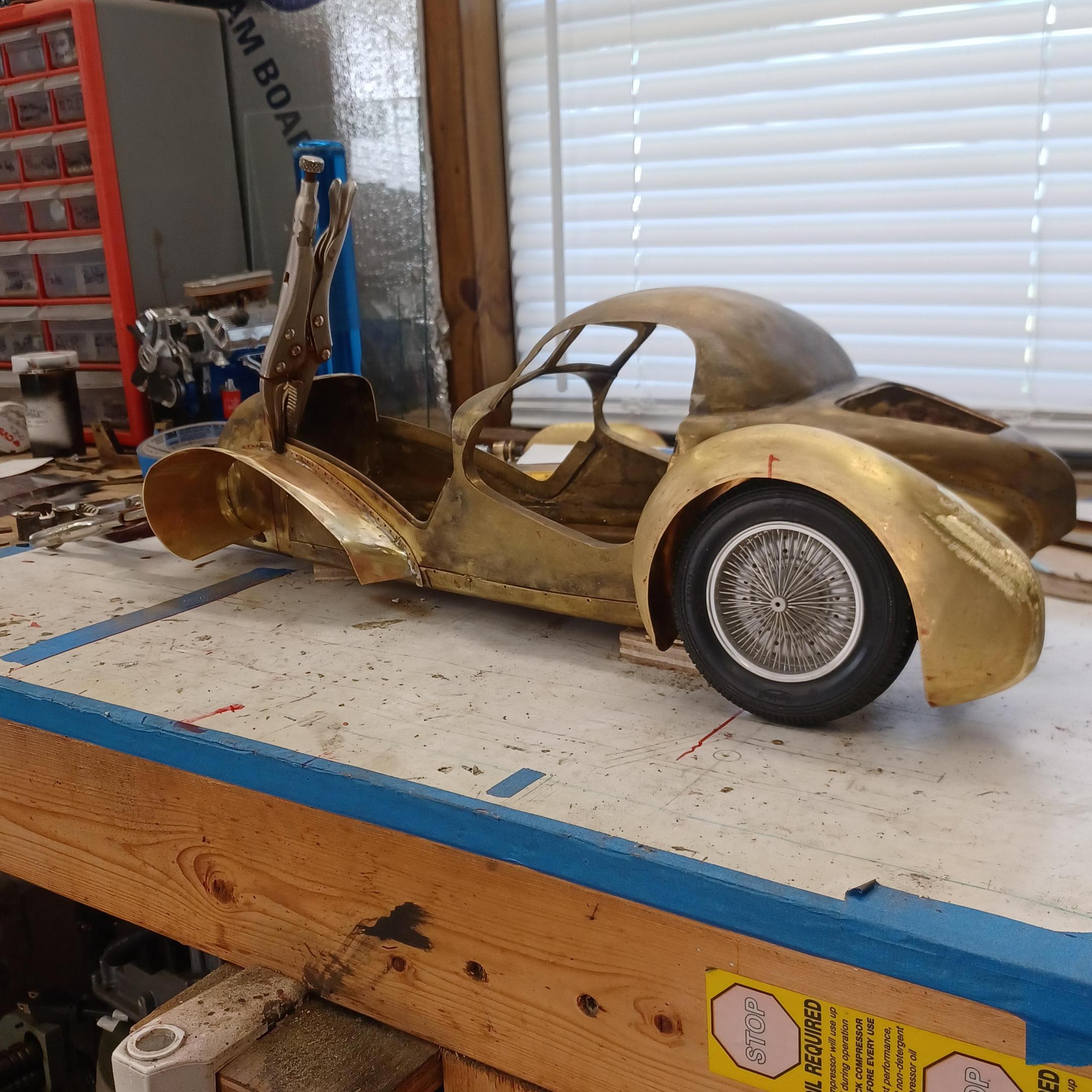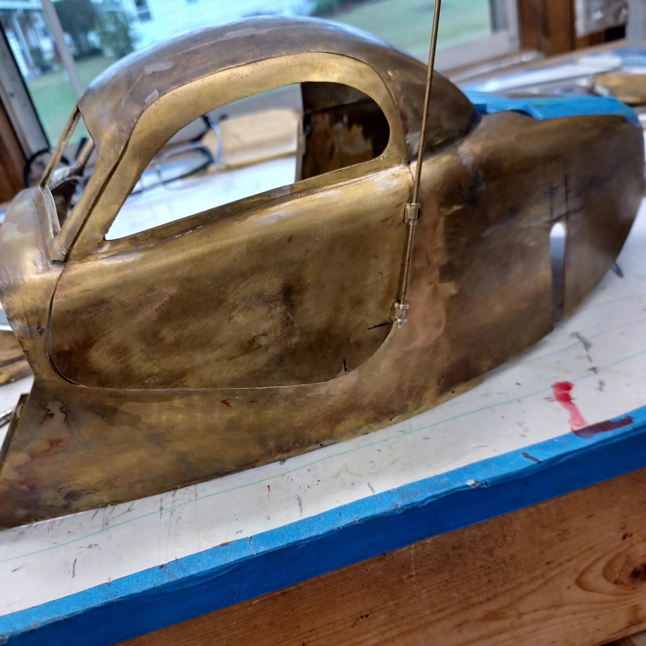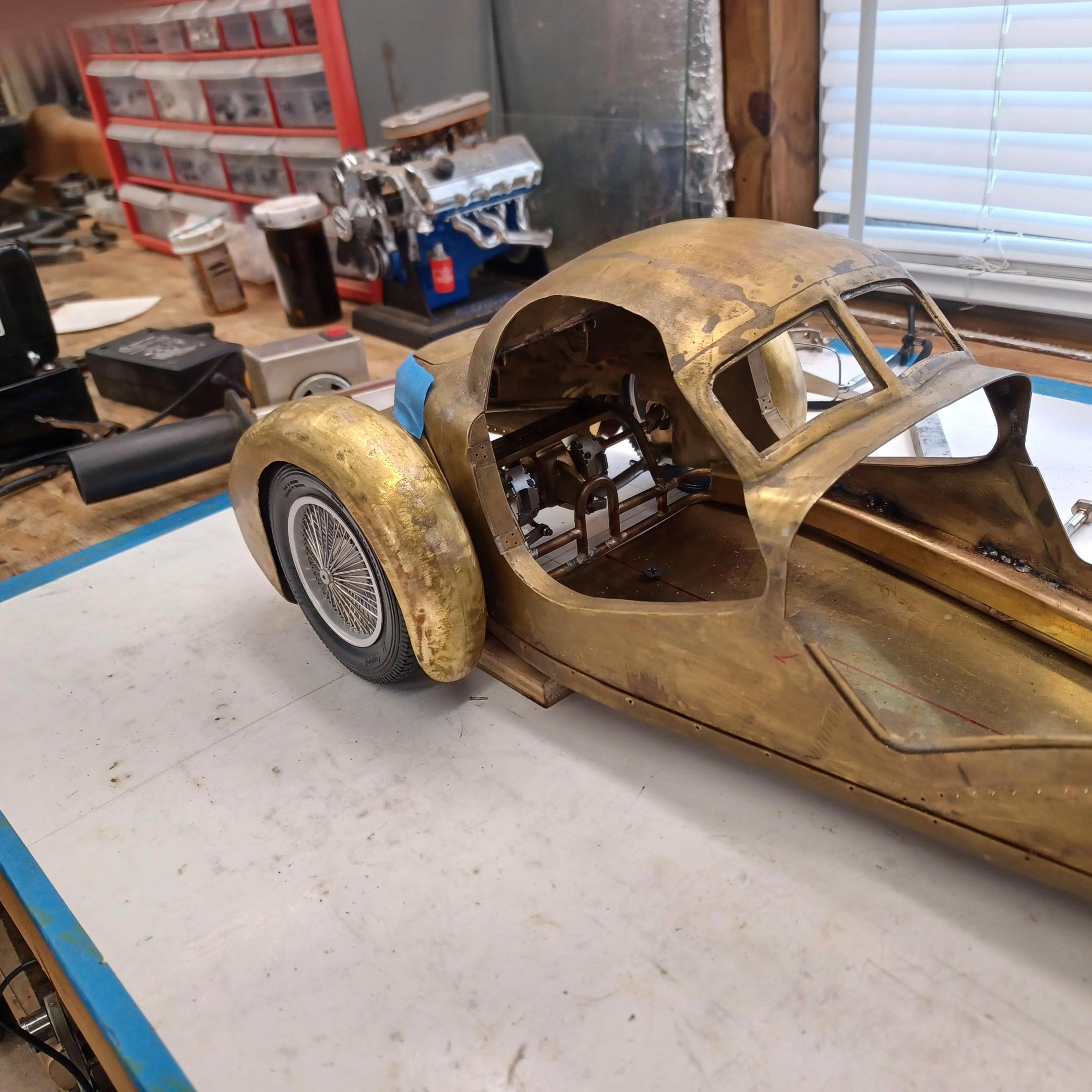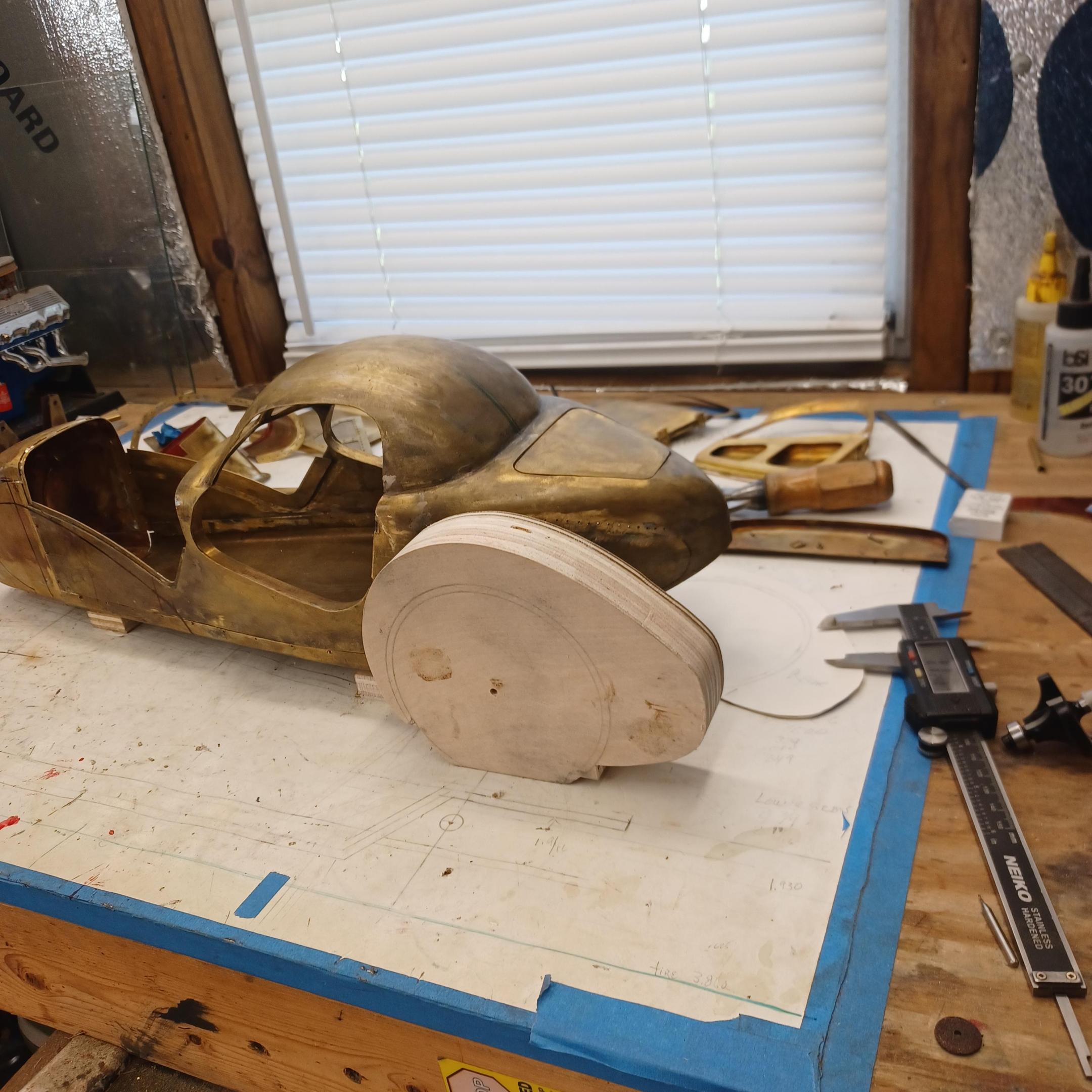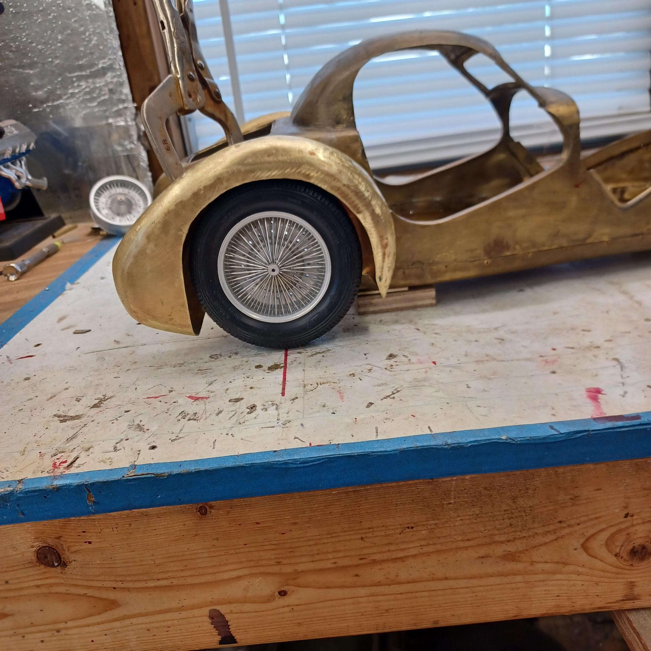 hello and thank you to all of you for taking the time to look. working away on the body. got the rear section between the body and the fenders complete . just getting started on the rear fenders. these 2 section are very time consuming to get right. very happy with doors and hinges , they fit and work well. i will finish the fender in wood to make sure i like the overall shape and size before i commit to brass. i think i found a wheel that i like . its on the 1936 bugatti 57G ,the tank. looks difficult but i am going to try one and see.make the rim and center in aluminum and the spokes german silver. i will finish the rear fenders and then attempt the wheel. still looking at and for engine pictures. since this car never existed i can use what ever.the 1 to 1 car i started was small block ford. but i want something European i would use the jag 6 if i had not just used it. the bogatti type 57 if i could find better pictures and just modernize it a little. I'll keep looking. maybe a modern BMW straight 6. -