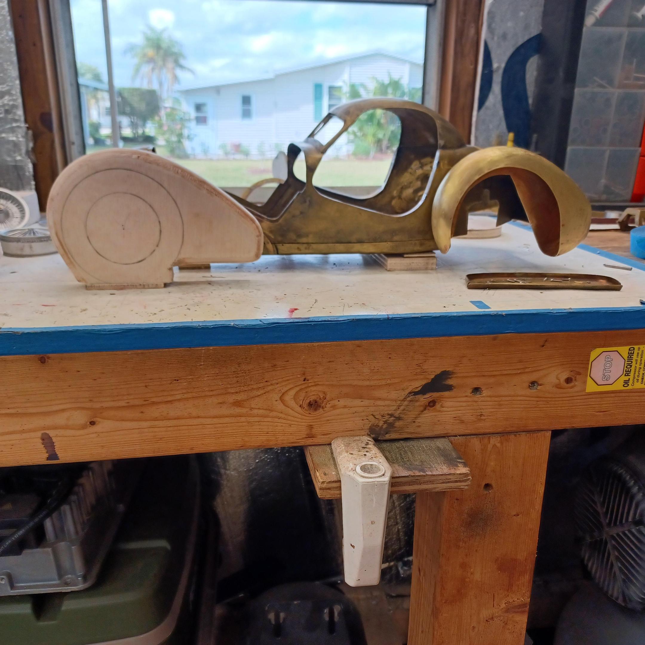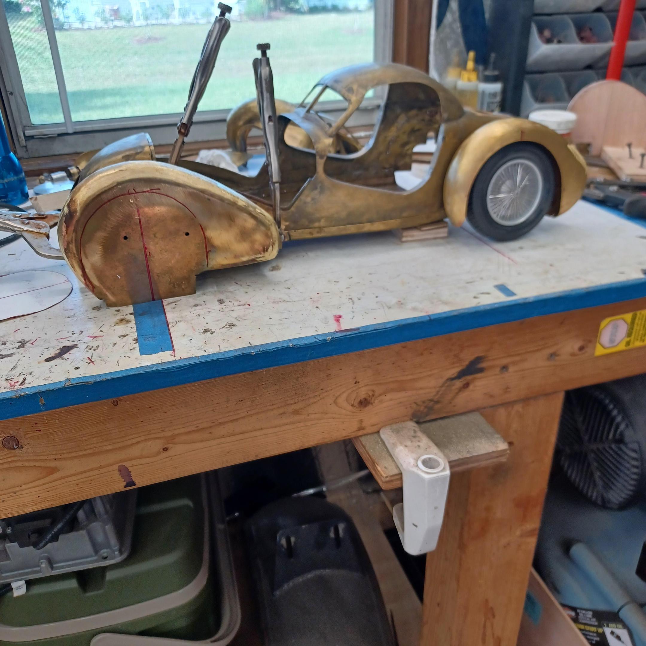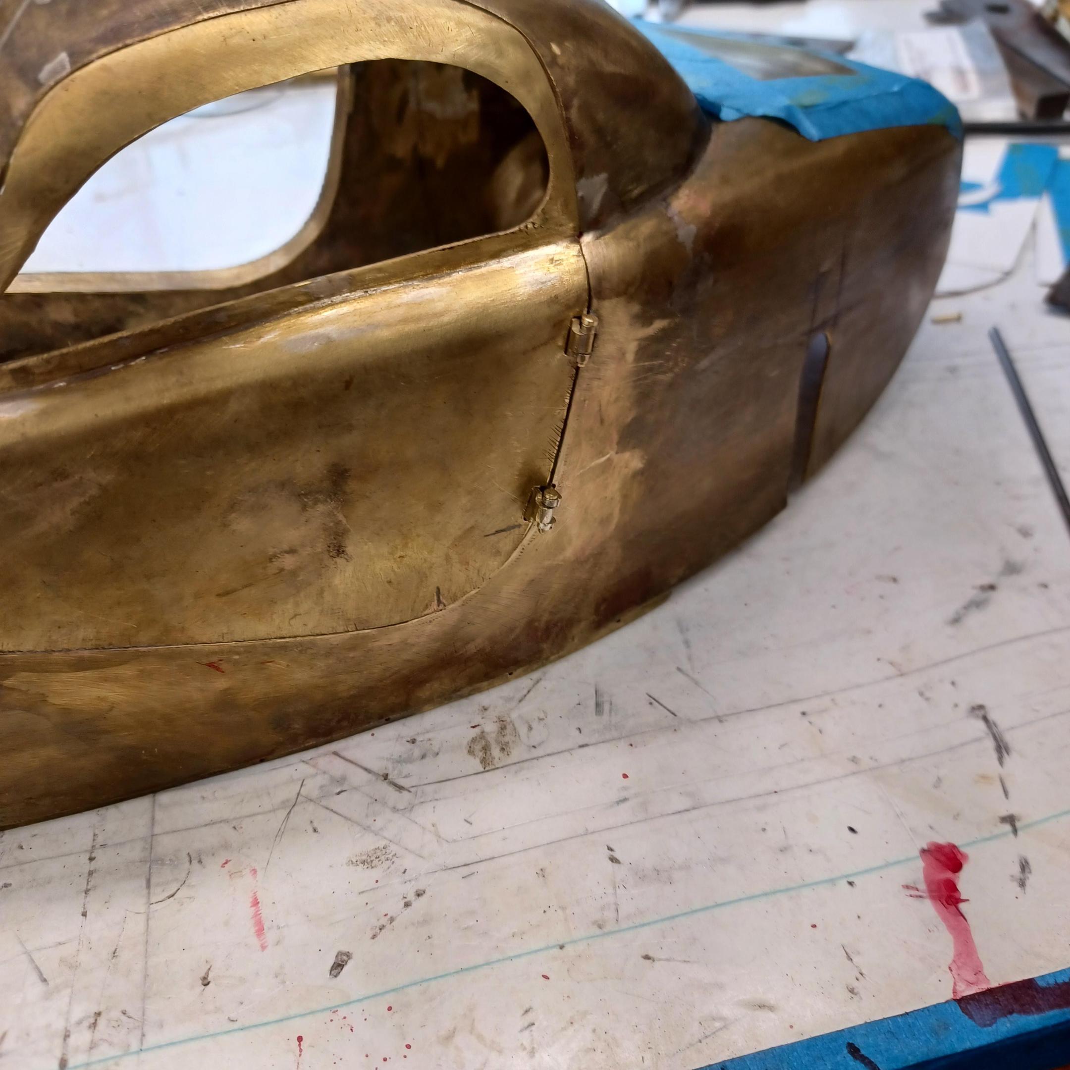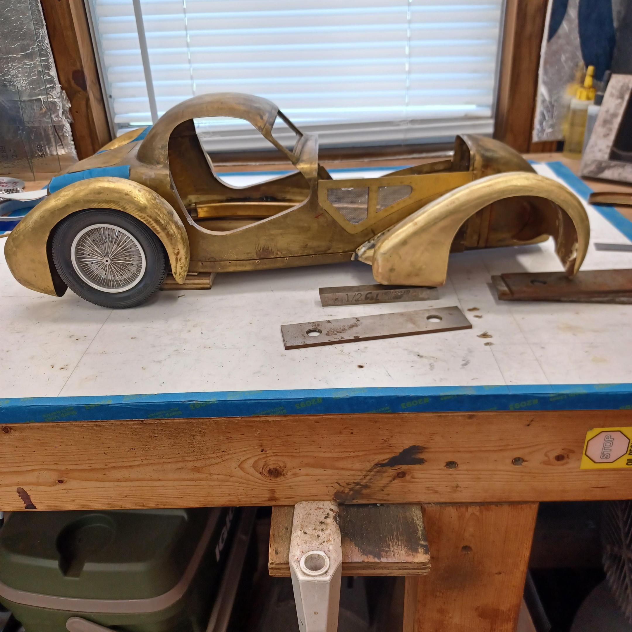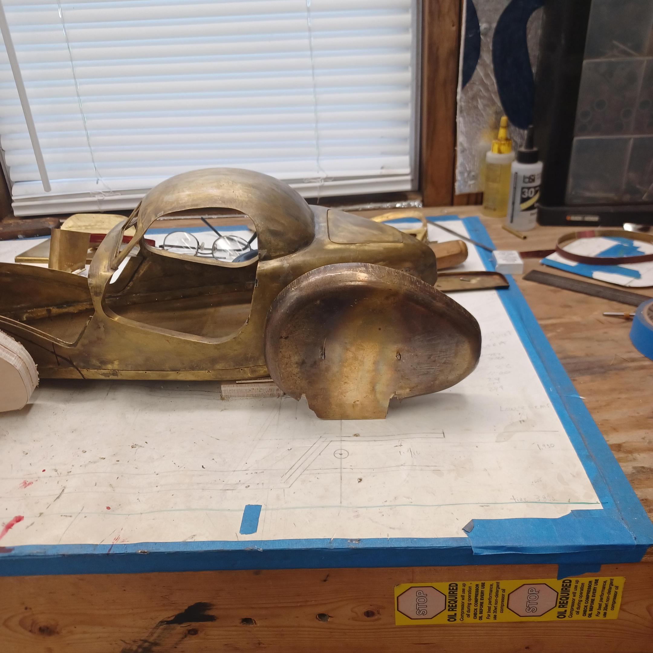 hello and thank you to all of you for taking the time to look. working away on the body. got the rear section between the body and the fenders complete . just getting started on the rear fenders. these 2 section are very time consuming to get right. very happy with doors and hinges , they fit and work well. i will finish the fender in wood to make sure i like the overall shape and size before i commit to brass. i think i found a wheel that i like . its on the 1936 bugatti 57G ,the tank. looks difficult but i am going to try one and see.make the rim and center in aluminum and the spokes german silver. i will finish the rear fenders and then attempt the wheel. still looking at and for engine pictures. since this car never existed i can use what ever.the 1 to 1 car i started was small block ford. but i want something European i would use the jag 6 if i had not just used it. the bogatti type 57 if i could find better pictures and just modernize it a little. I'll keep looking. maybe a modern BMW straight 6. -