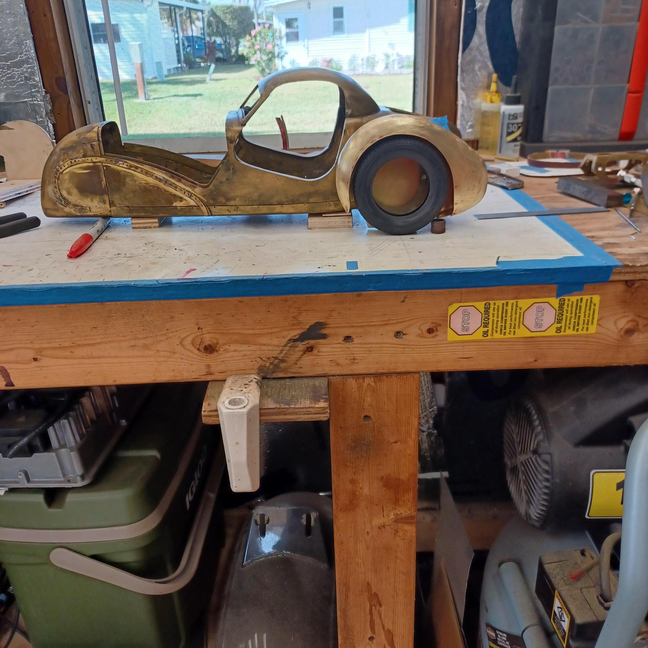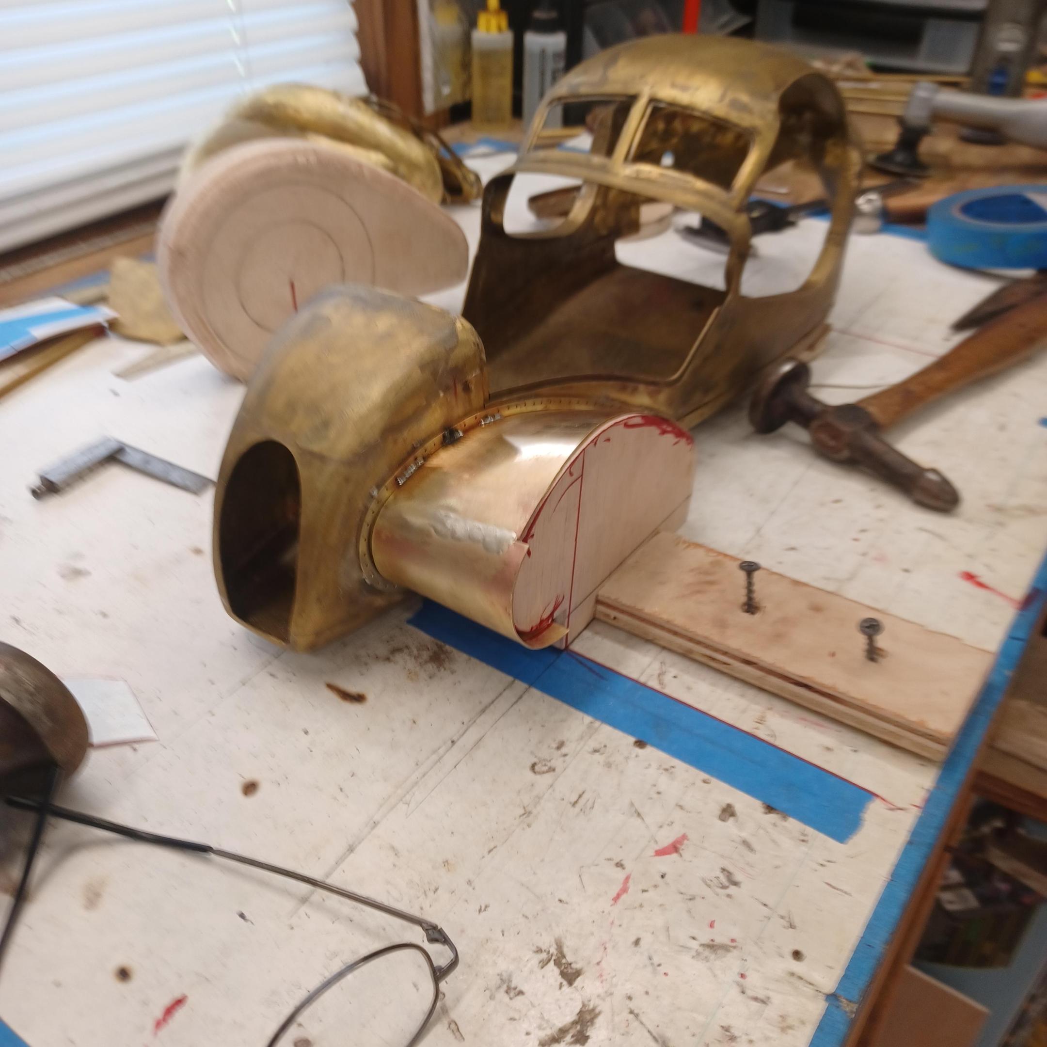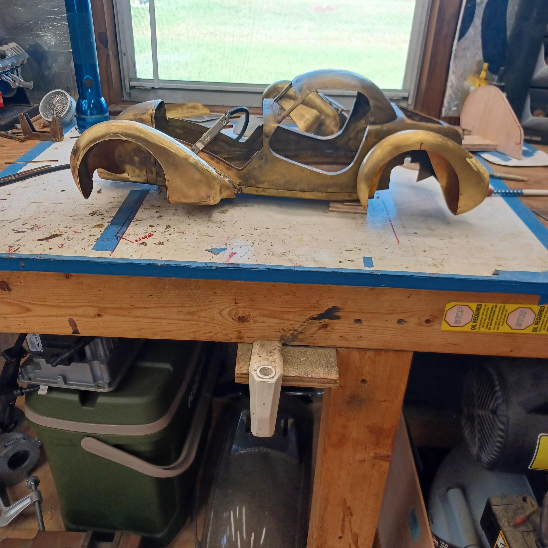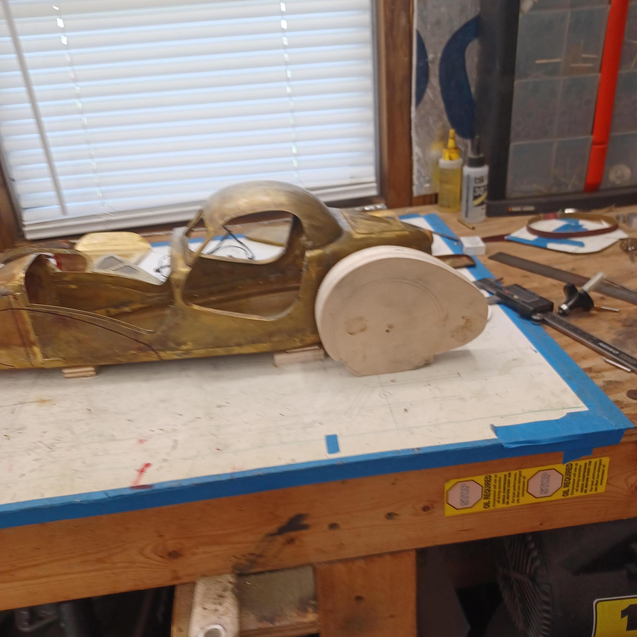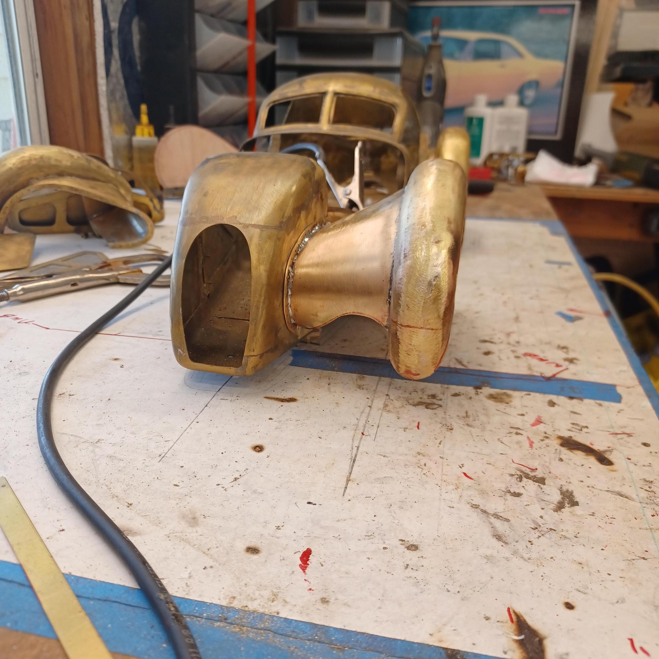 hello and thank you to all of you for taking the time to look. working away on the body. got the rear section between the body and the fenders complete . just getting started on the rear fenders. these 2 section are very time consuming to get right. very happy with doors and hinges , they fit and work well. i will finish the fender in wood to make sure i like the overall shape and size before i commit to brass. i think i found a wheel that i like . its on the 1936 bugatti 57G ,the tank. looks difficult but i am going to try one and see.make the rim and center in aluminum and the spokes german silver. i will finish the rear fenders and then attempt the wheel. still looking at and for engine pictures. since this car never existed i can use what ever.the 1 to 1 car i started was small block ford. but i want something European i would use the jag 6 if i had not just used it. the bogatti type 57 if i could find better pictures and just modernize it a little. I'll keep looking. maybe a modern BMW straight 6. -