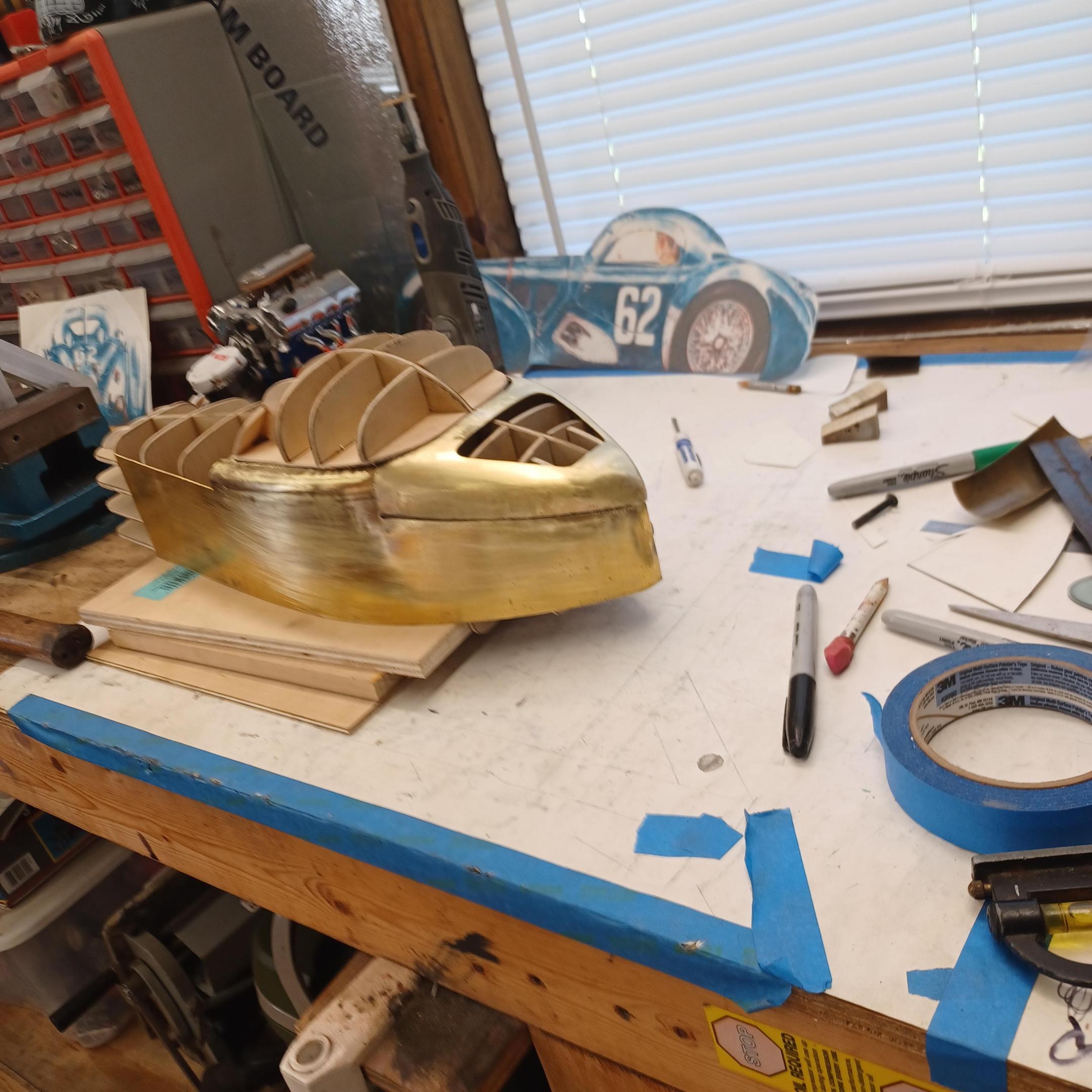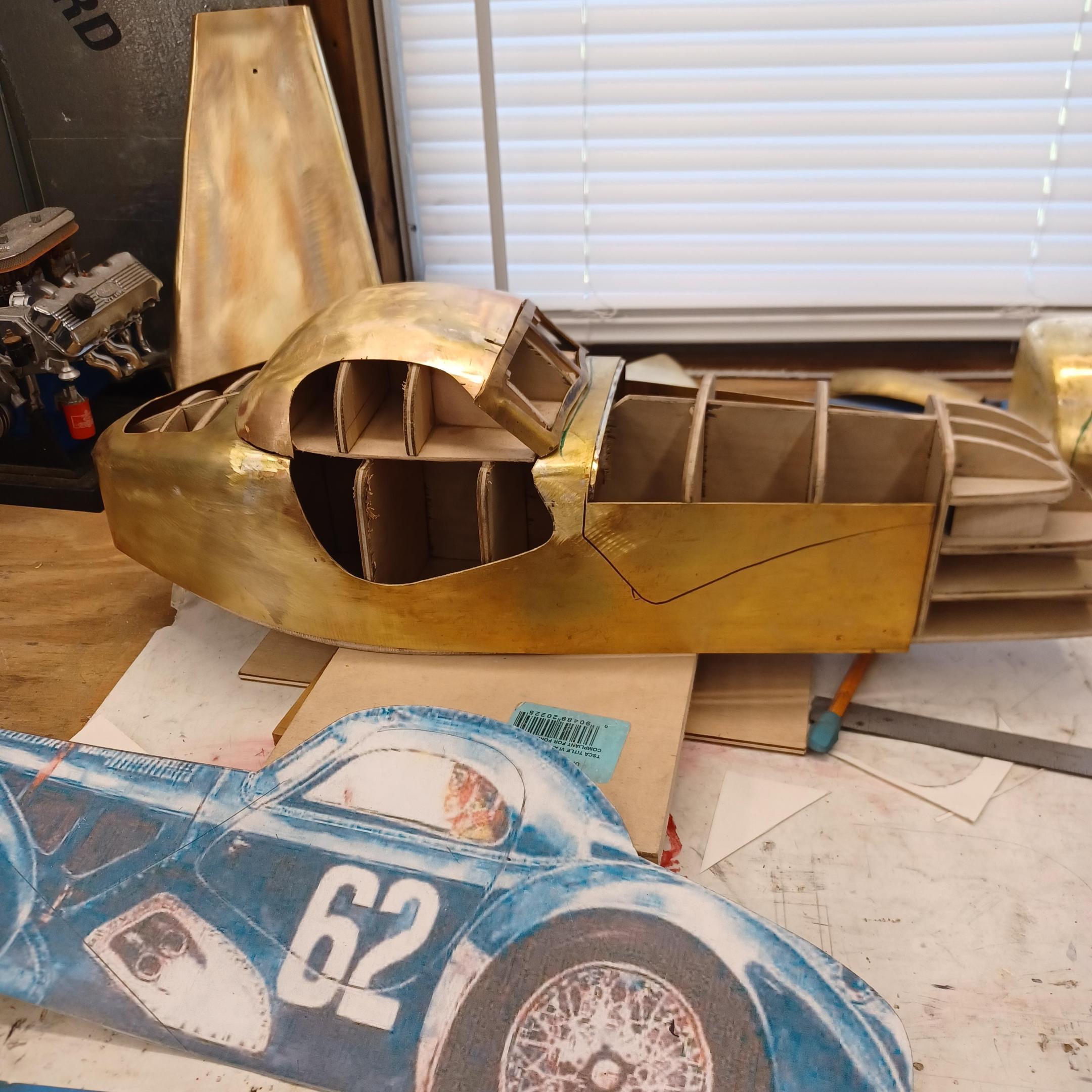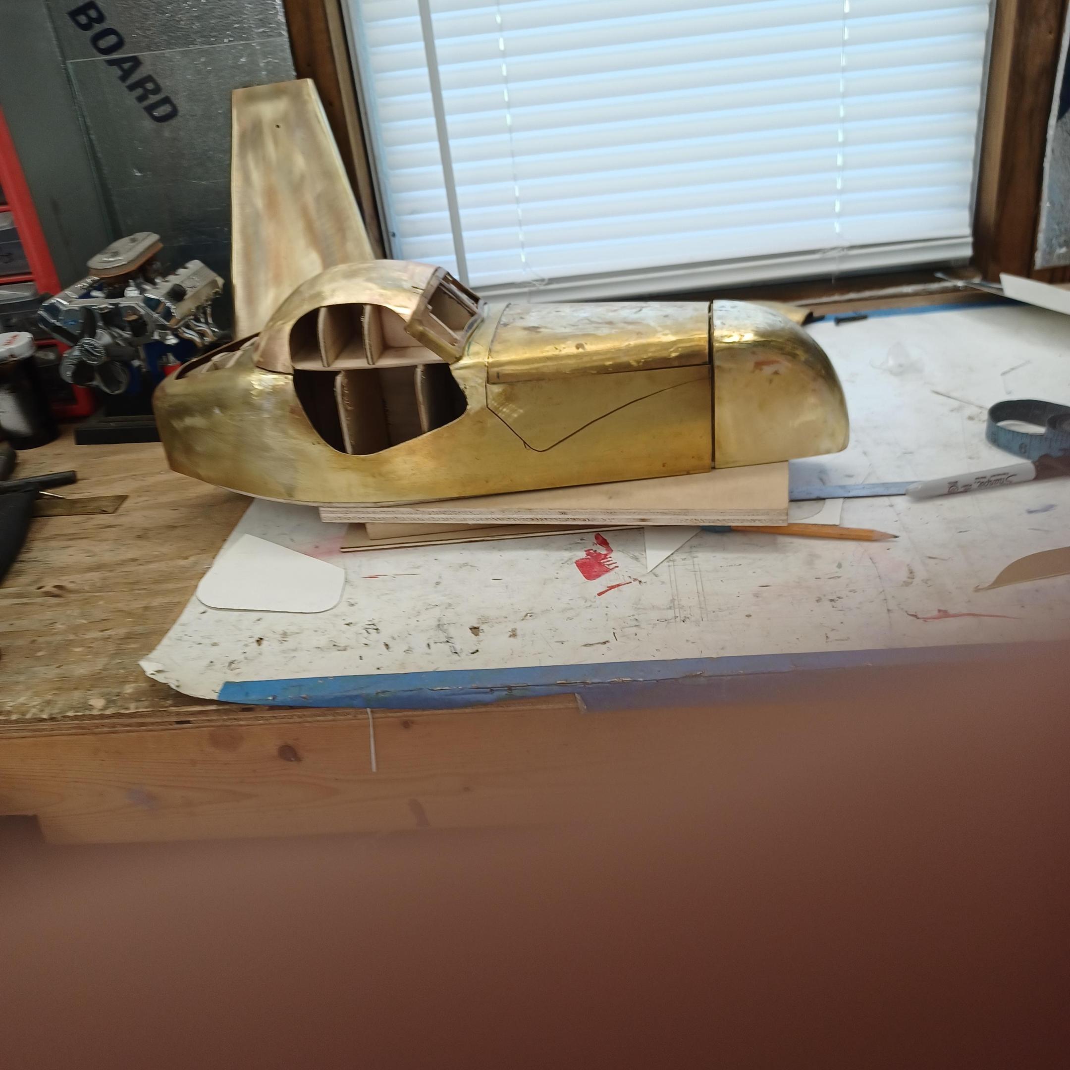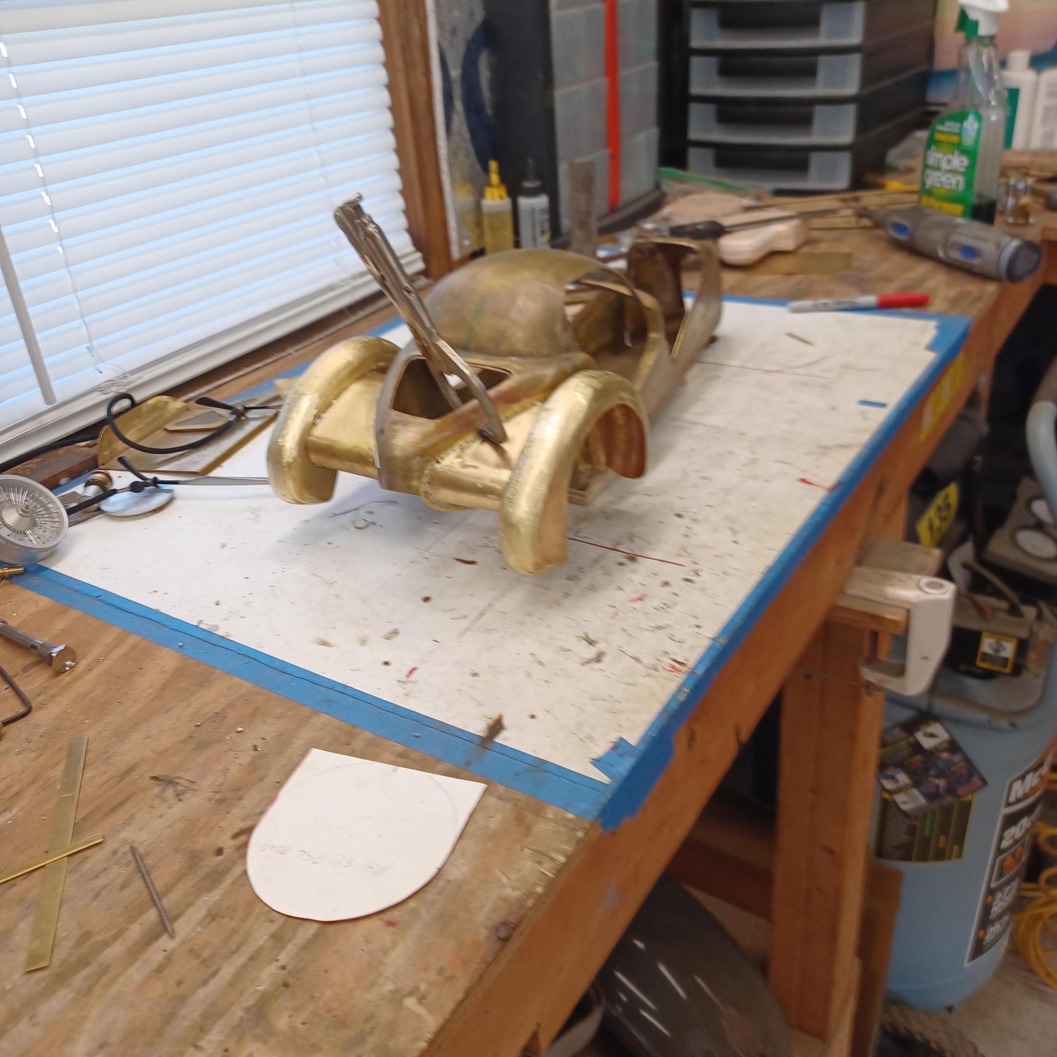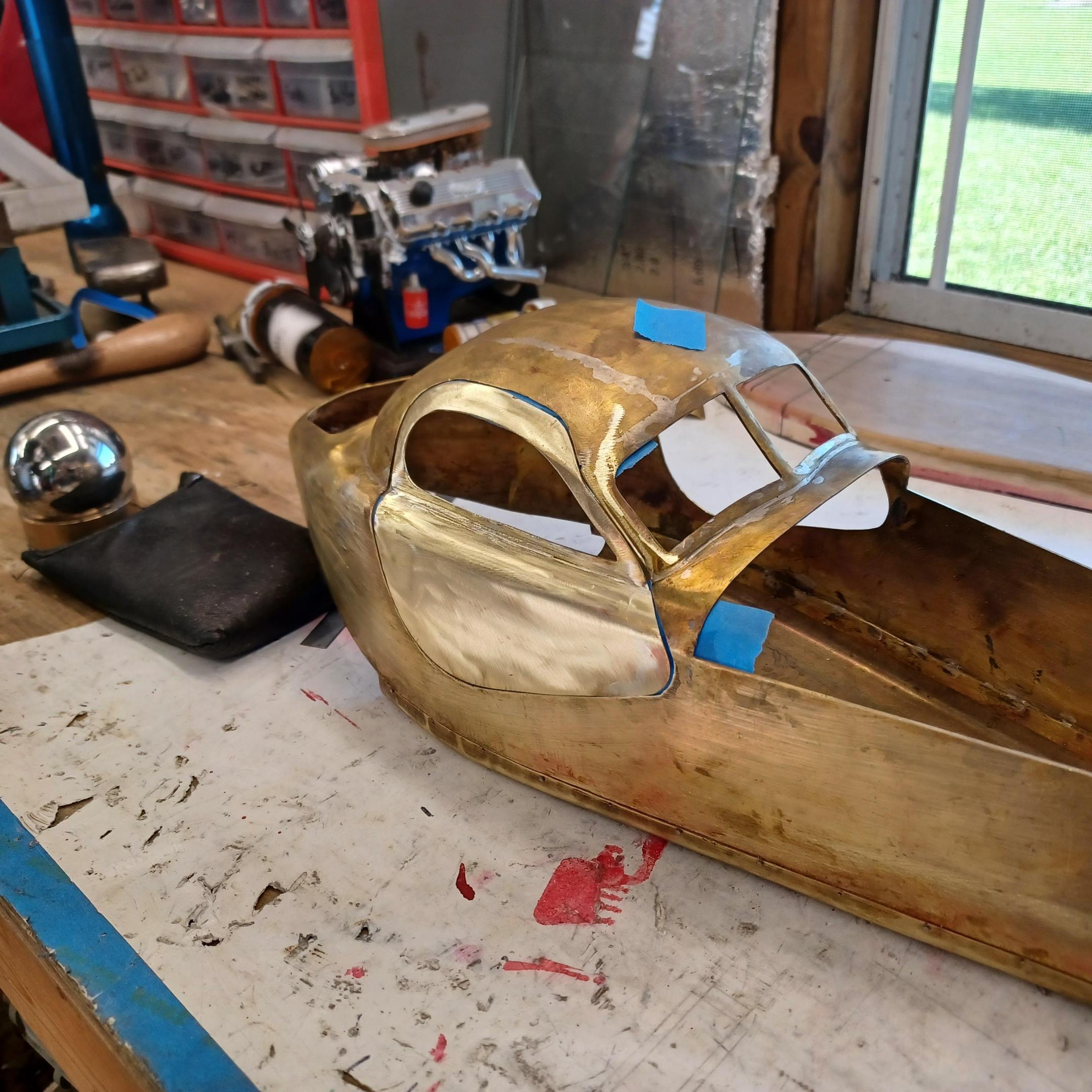 hello and thank you to all of you for taking the time to look. working away on the body. got the rear section between the body and the fenders complete . just getting started on the rear fenders. these 2 section are very time consuming to get right. very happy with doors and hinges , they fit and work well. i will finish the fender in wood to make sure i like the overall shape and size before i commit to brass. i think i found a wheel that i like . its on the 1936 bugatti 57G ,the tank. looks difficult but i am going to try one and see.make the rim and center in aluminum and the spokes german silver. i will finish the rear fenders and then attempt the wheel. still looking at and for engine pictures. since this car never existed i can use what ever.the 1 to 1 car i started was small block ford. but i want something European i would use the jag 6 if i had not just used it. the bogatti type 57 if i could find better pictures and just modernize it a little. I'll keep looking. maybe a modern BMW straight 6. -